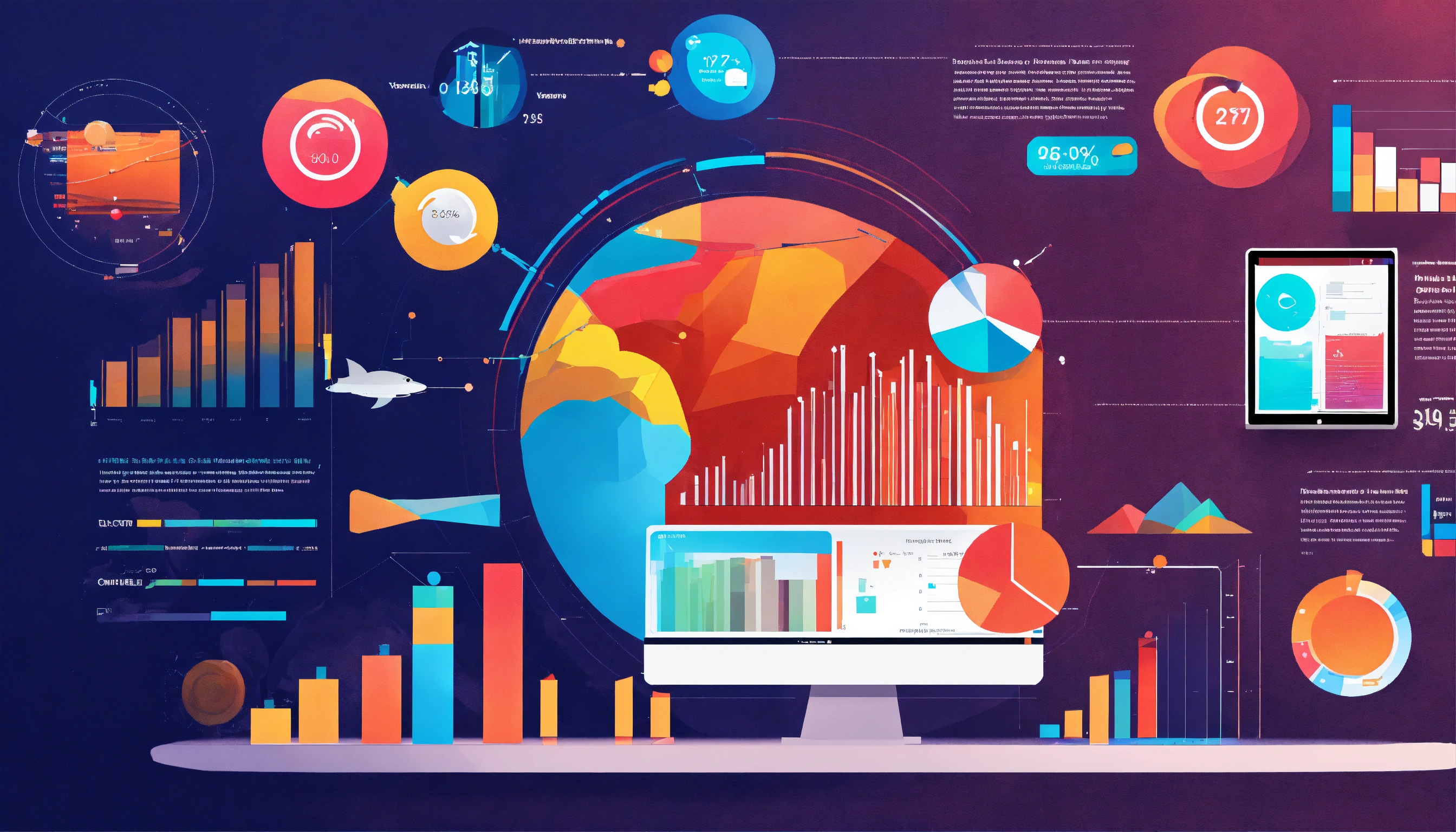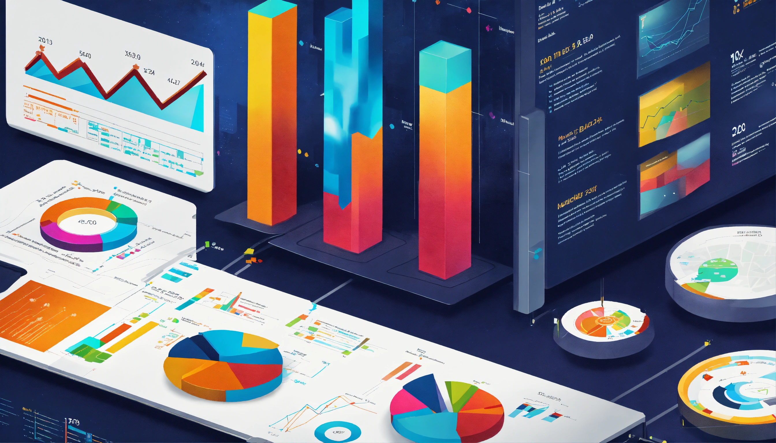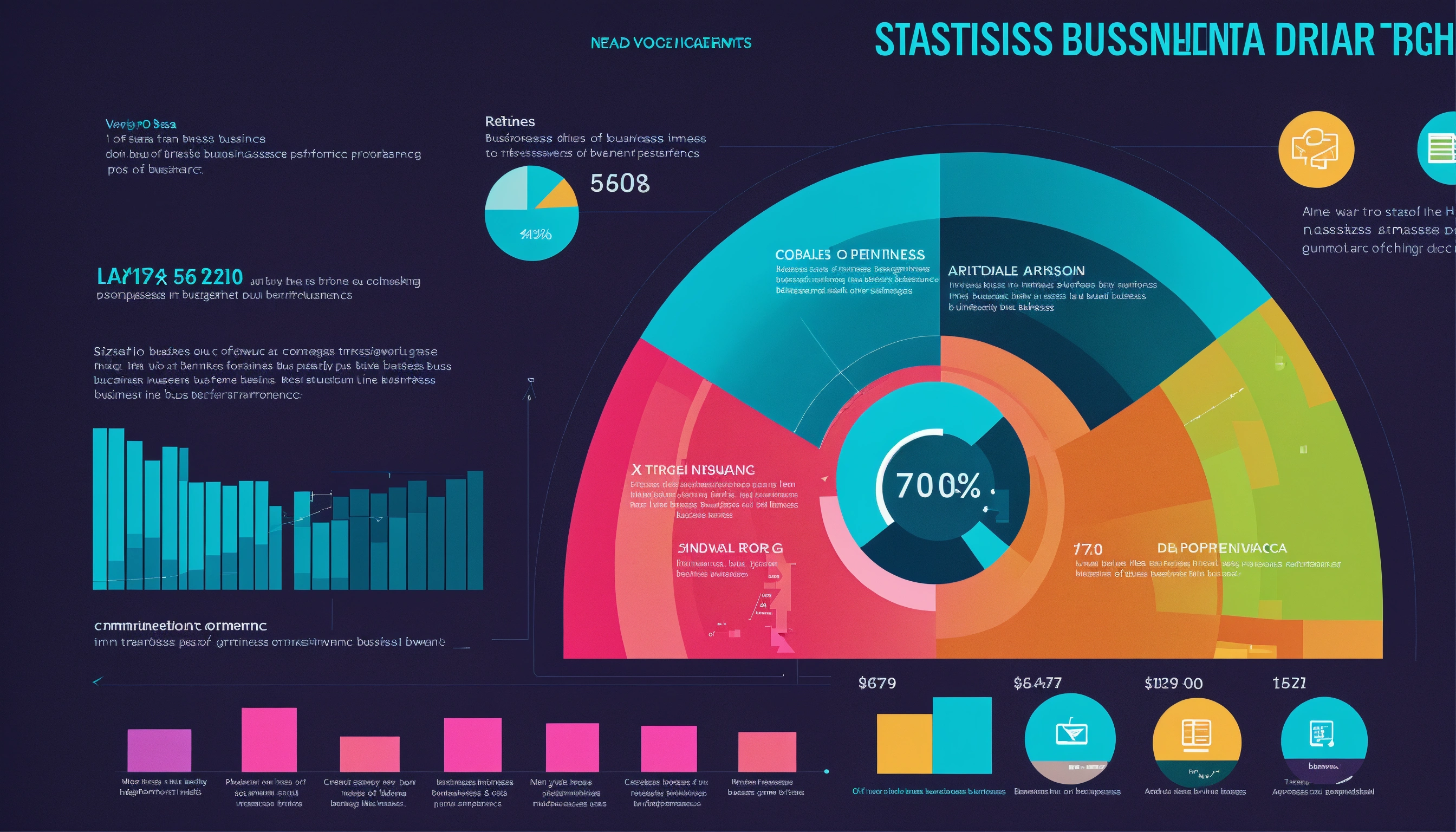 Create a dynamic and visually appealing image that depicts the concept of statistics and trends in the business world. the image should include a variety of graphical elements such as bar charts, line graphs, pie charts, and upward trending arrows, all of which symbolize the analysis and tracking of business performance and market trends. incorporate modern design elements and digital aesthetics to reflect the high-tech nature of today's data-driven business environment. the graphics should be colorful and engaging, with a sleek and professional look suitable for a corporate setting. ensure the image communicates a sense of growth, analysis, and forward-thinking. size 1792x1024 pixels.
