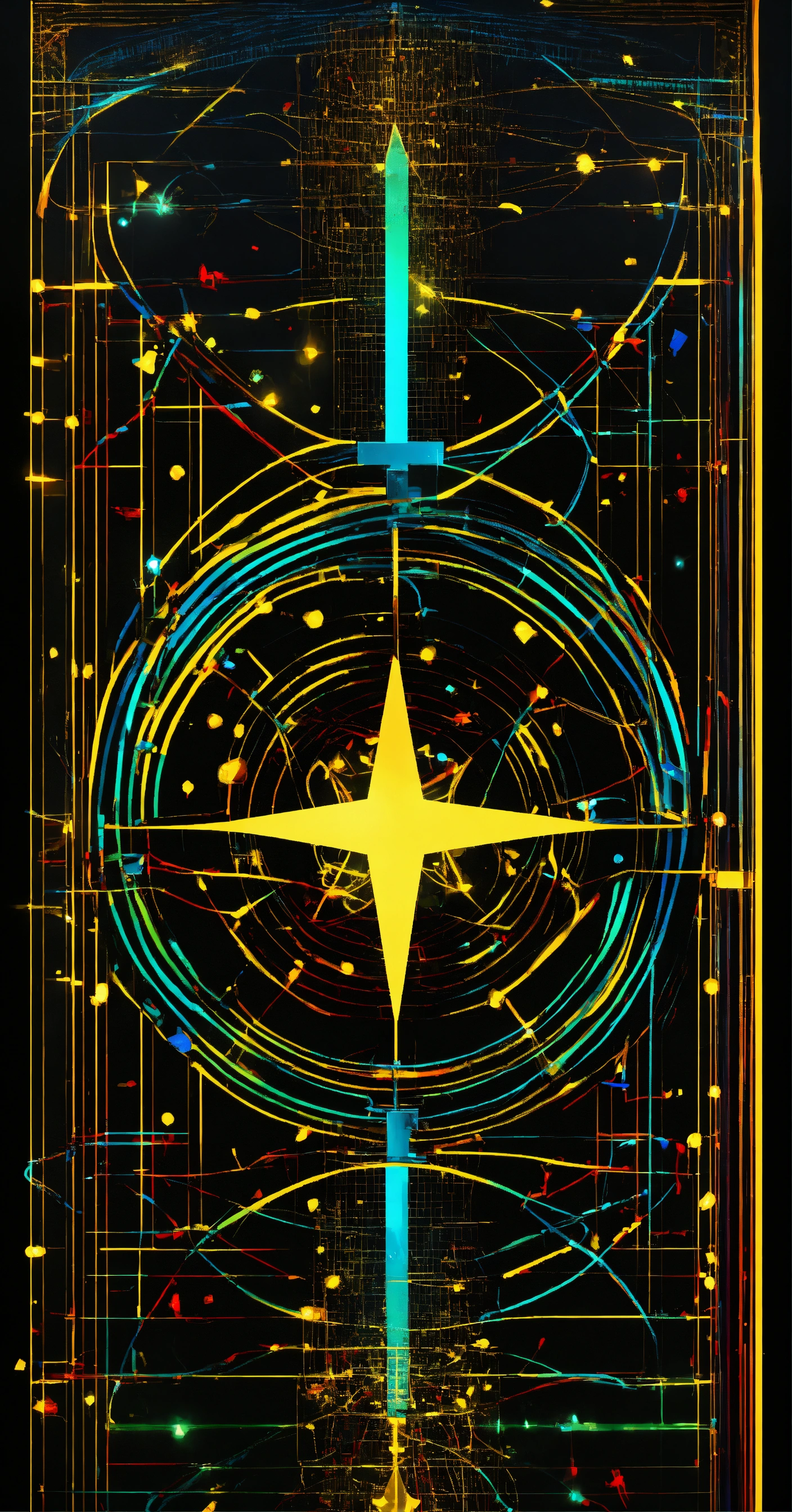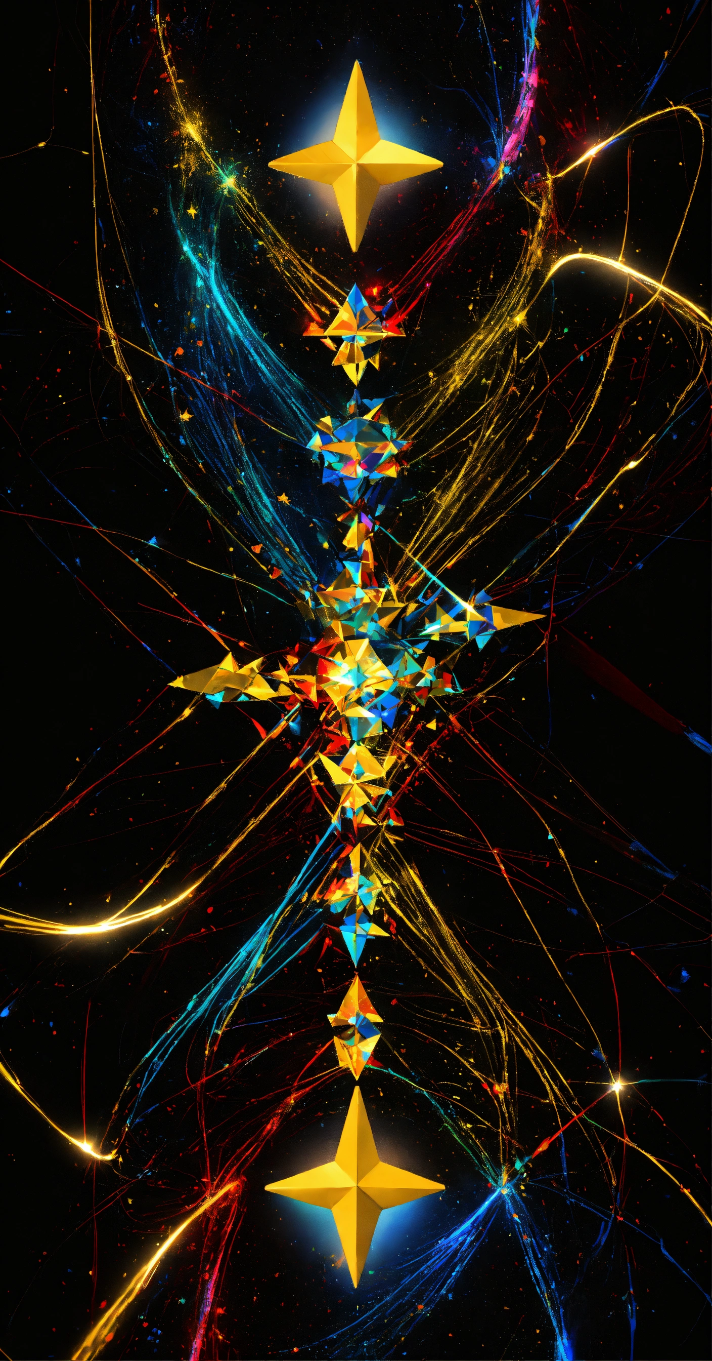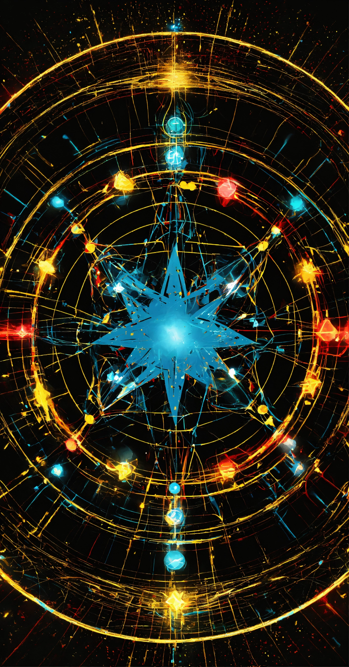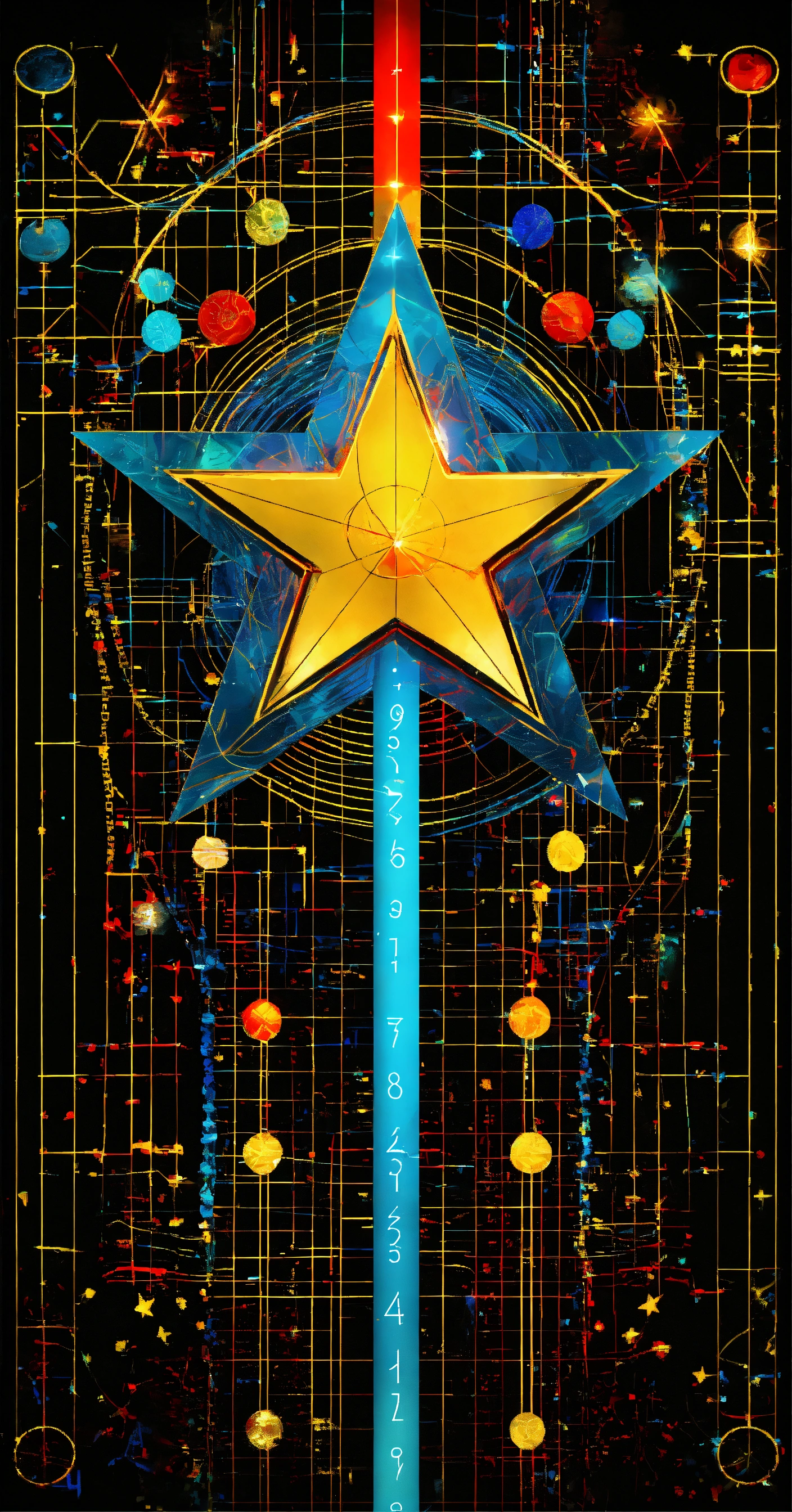 Numerology, neuro graphics, and transformation game - black background, gold star, blue, cyan, yellow red twisted lines