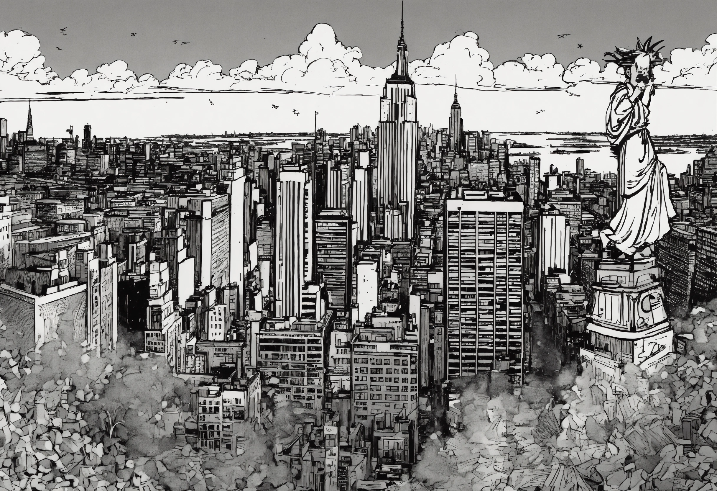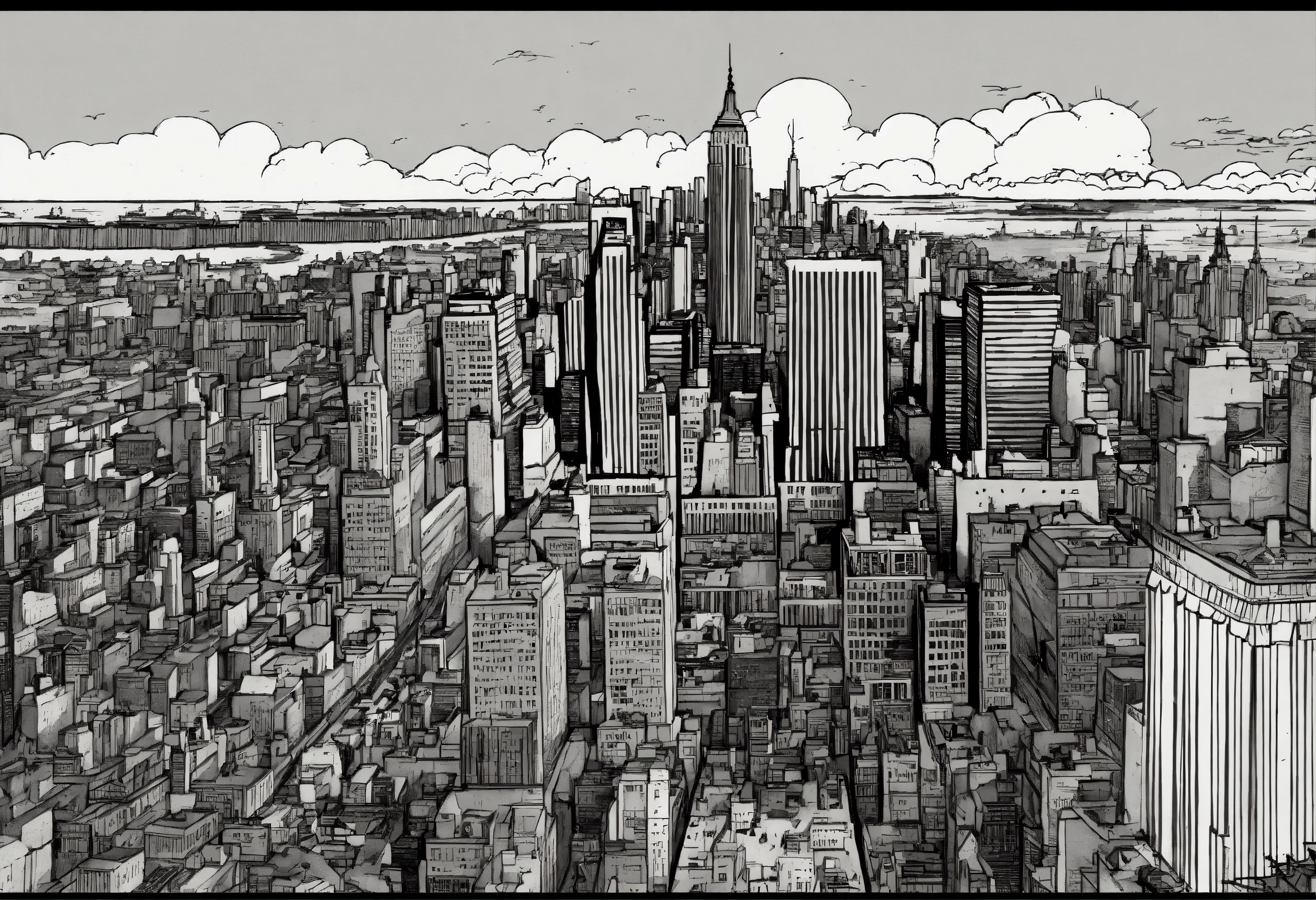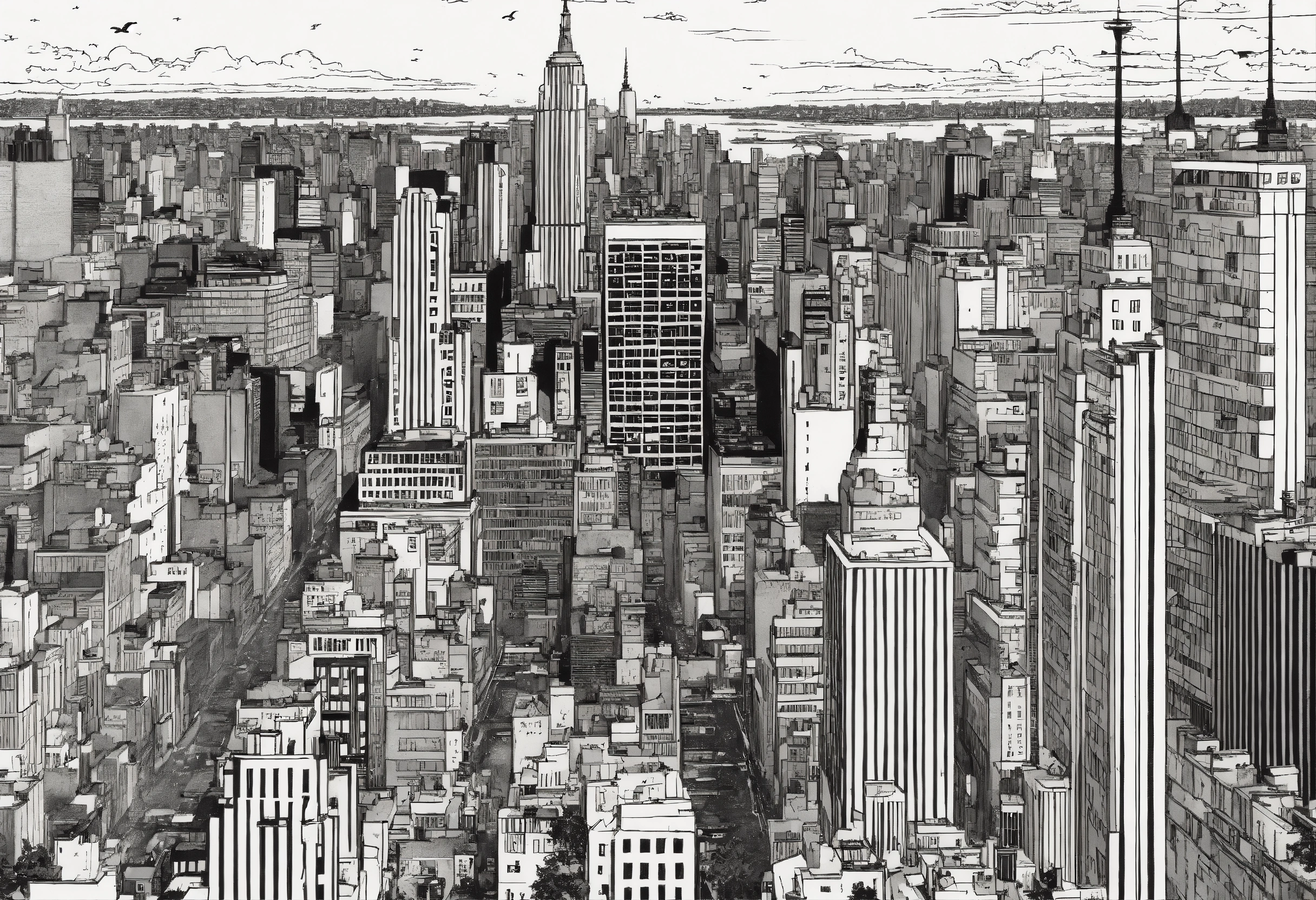 Chaotic stunning new york city, skyline, illustrated by hergé, style of tin tin comics, pen and ink. vintage 90's anime style, black and white. 8k