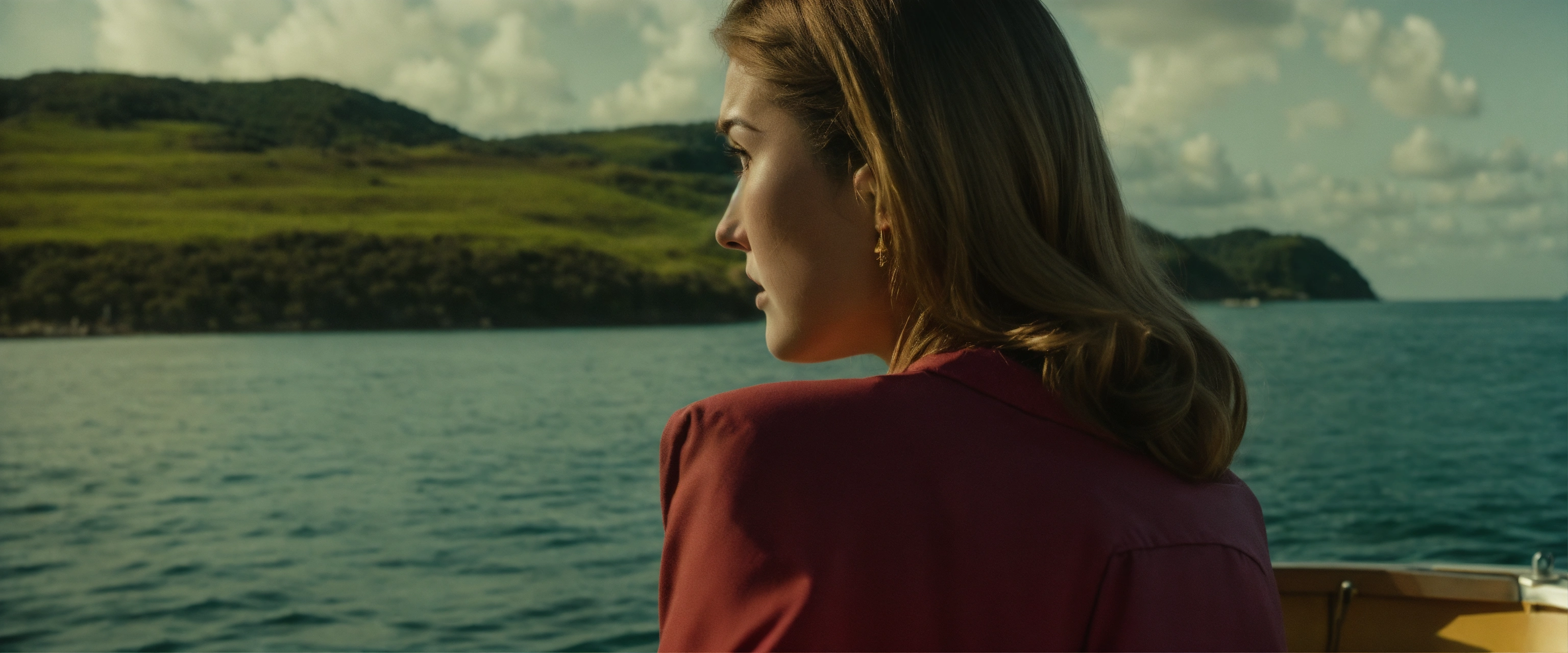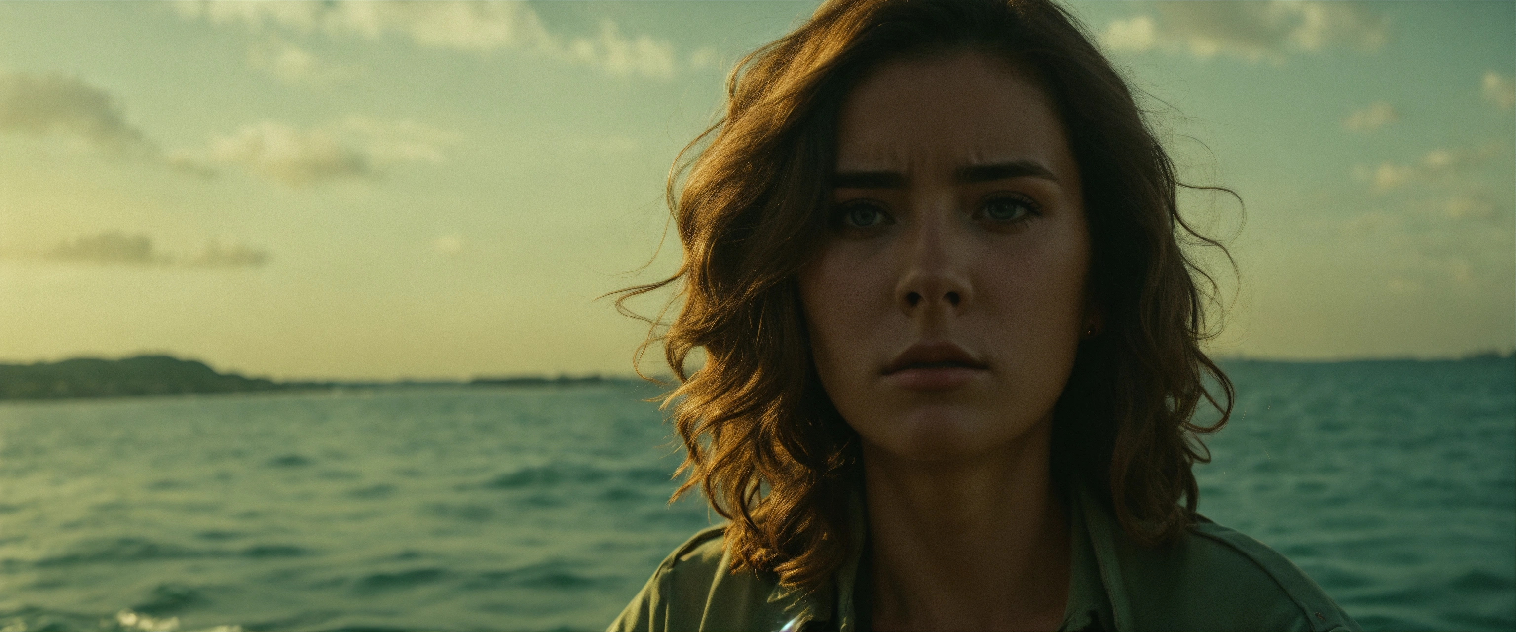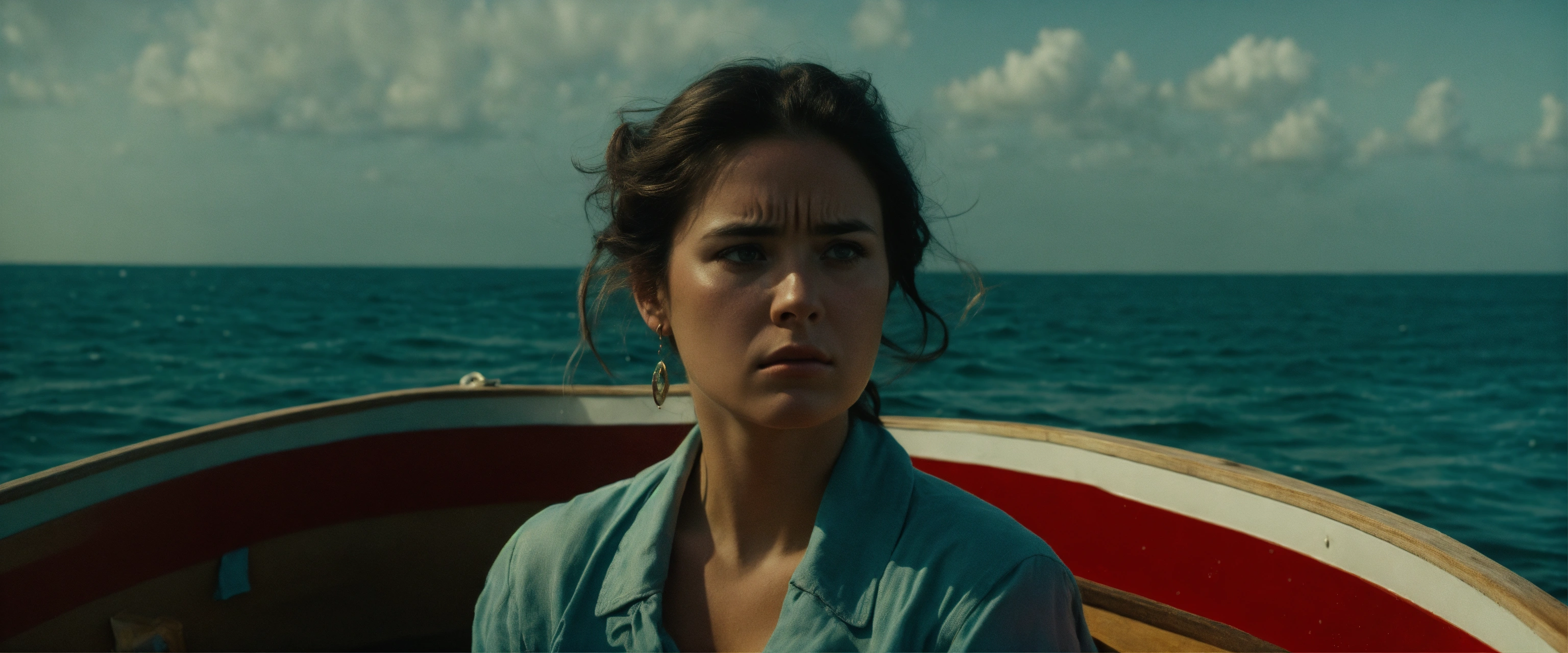 A epic scene of a portrait of a woman with sad face in a boat looking at the sea, 80's movie still dvd style, cinematic shot, cinematic, realistic, film grain, volumetric light, imax, photorealistic, hyperdetailed textures, sharp focus, studio photo, high quality photo