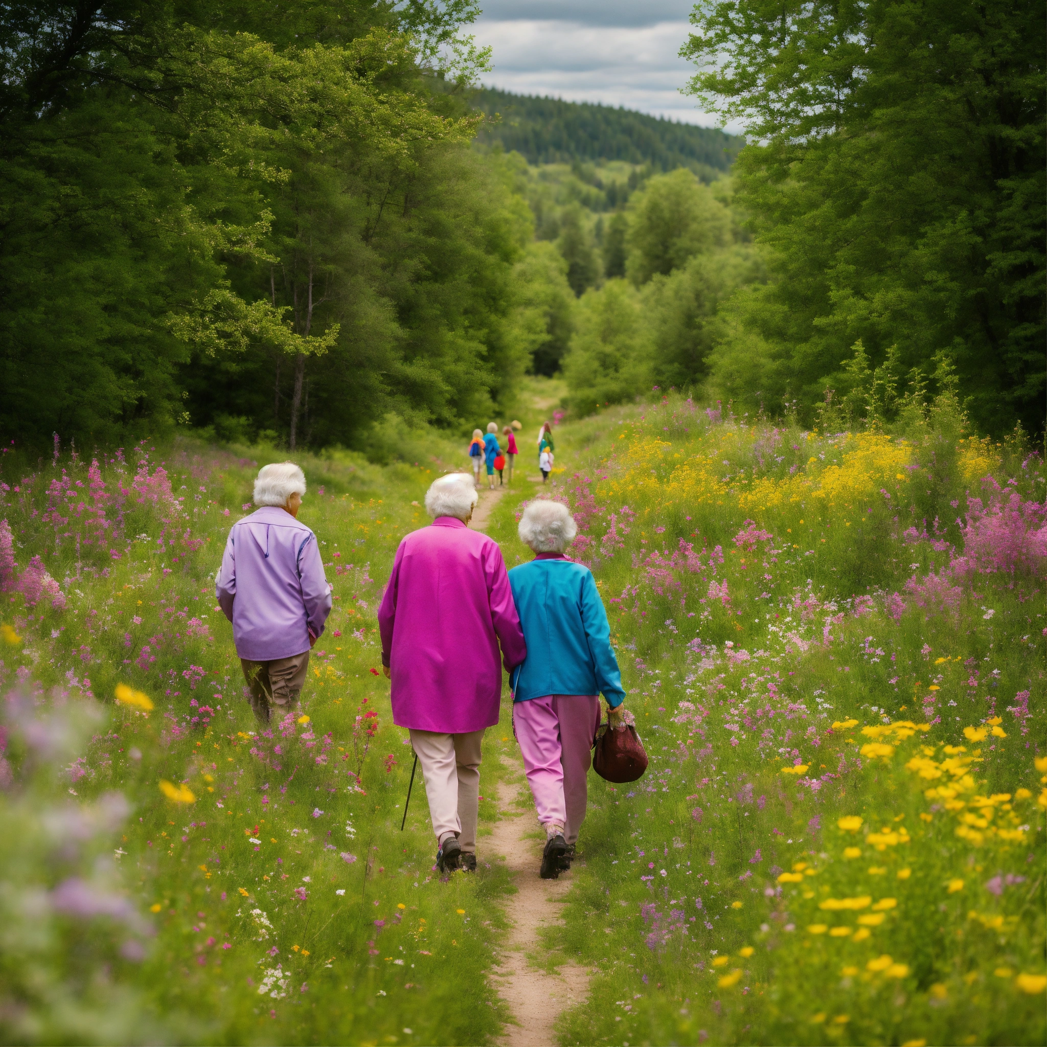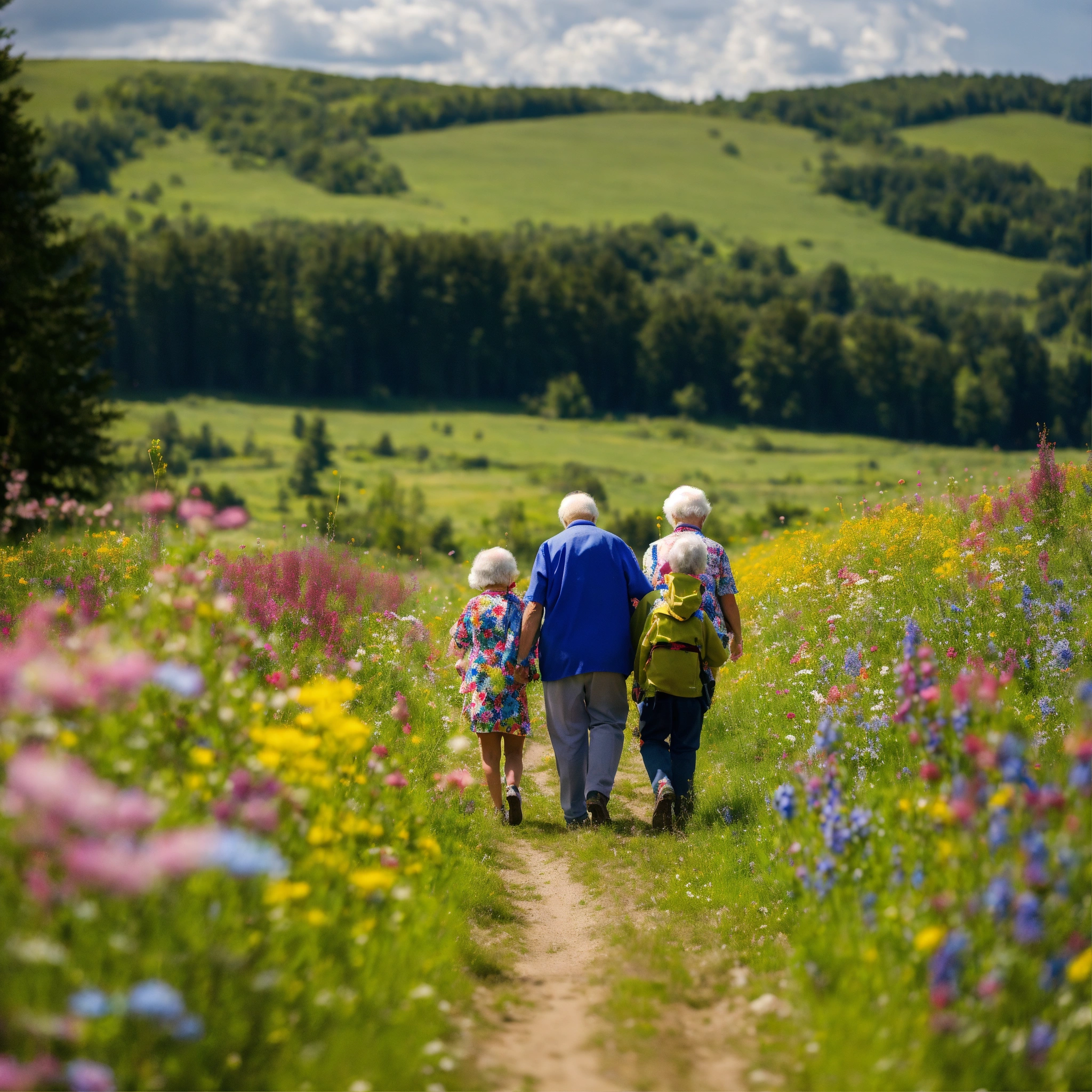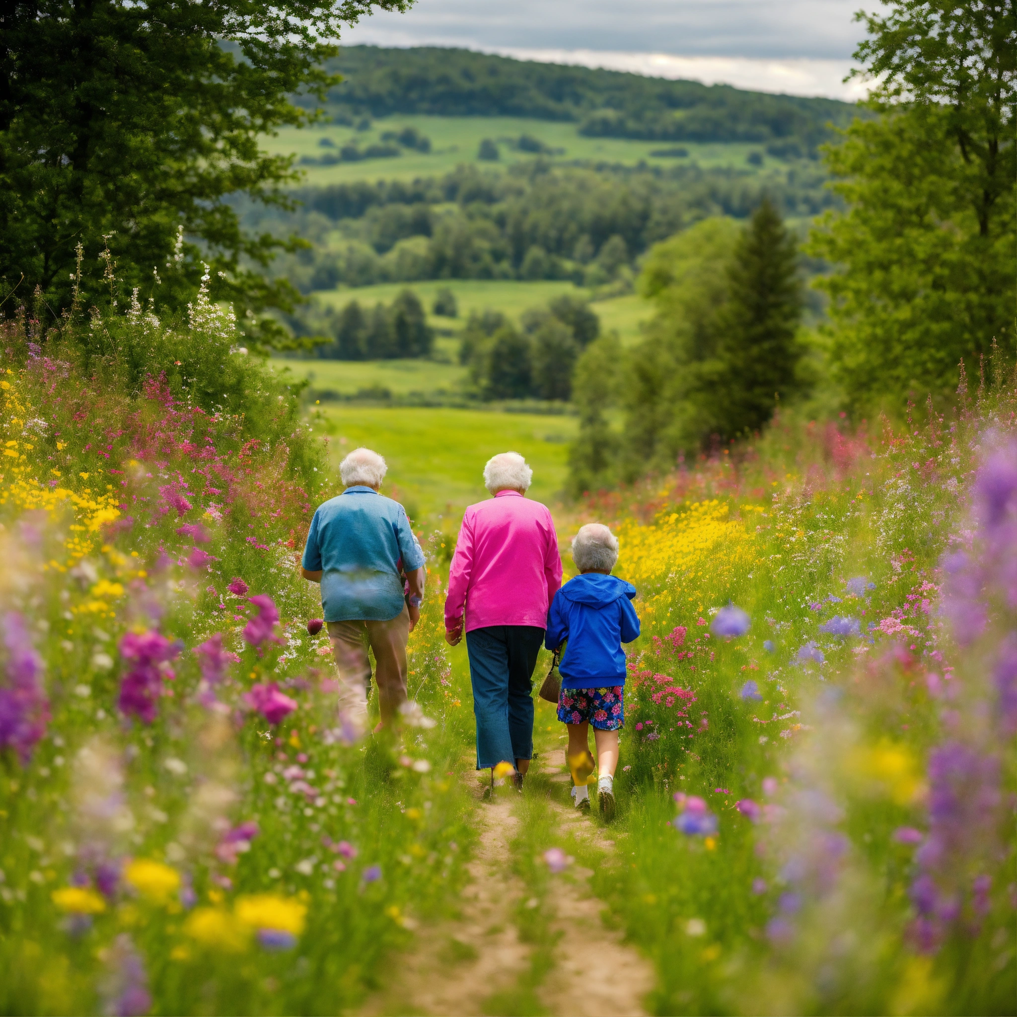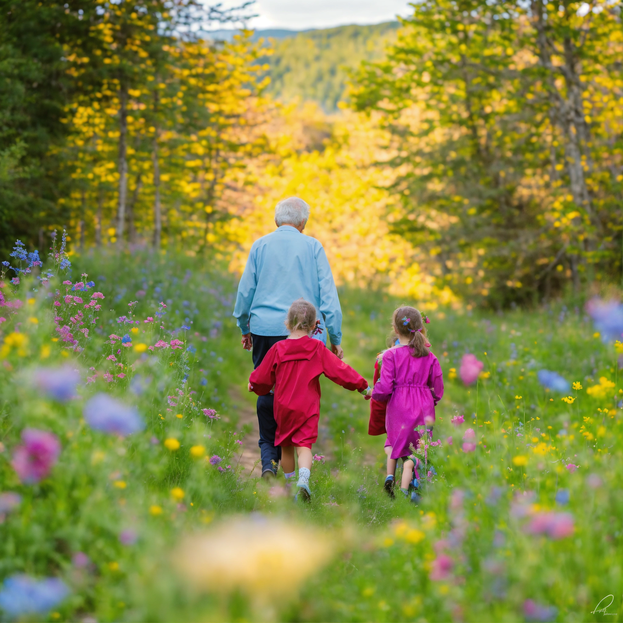 3 grandchildren walking with their grandparents backs to the camera, dressed in colourful clothing, through a meadow of wildflowers nearing a woodlot, at noon, 16k