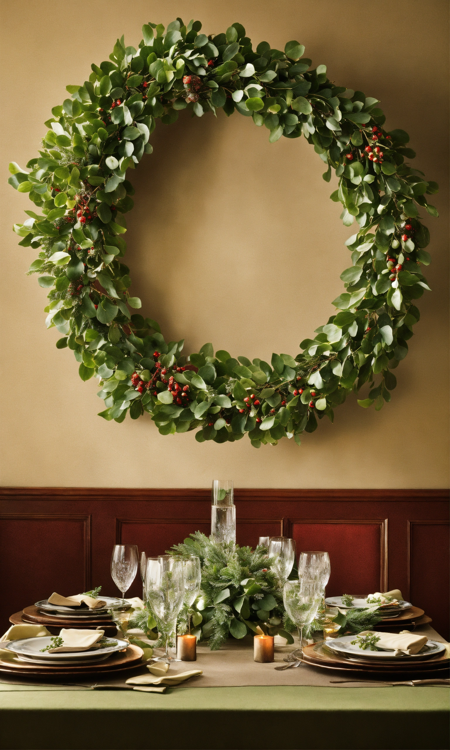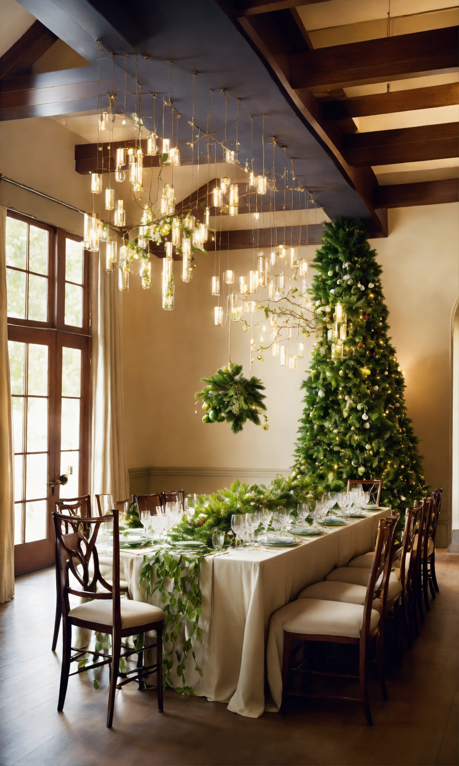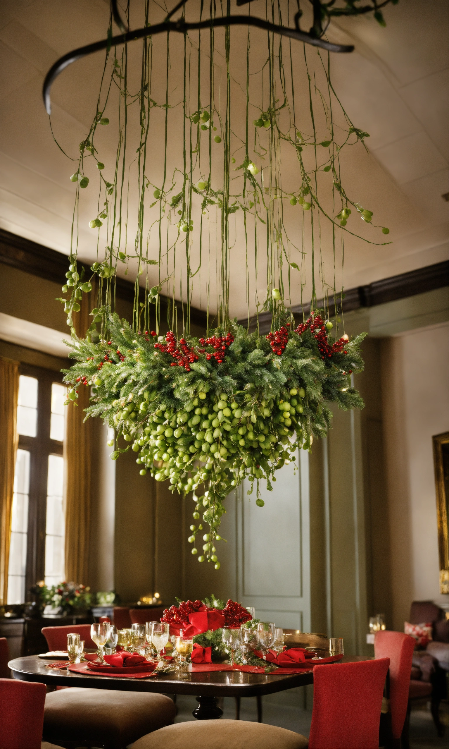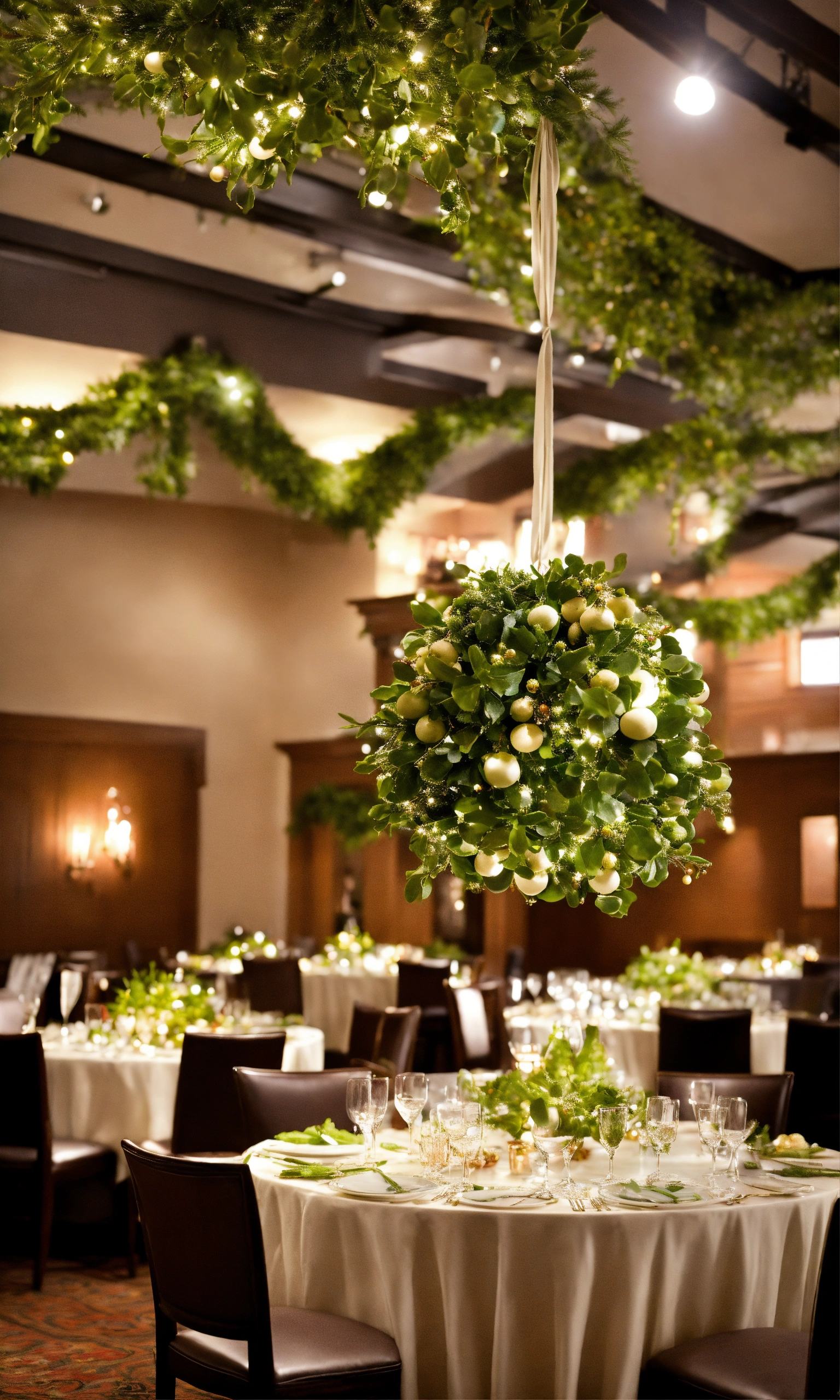 Mistletoe hangs from the ceiling in strategic locations, its vibrant green leaves and ivory berries serving as a symbol of love and togetherness. the room resonates with the merry chatter of people, the clinking of glasses, and the occasional burst of laughter, as loved ones exchange stories and embrace the joy of the season.
