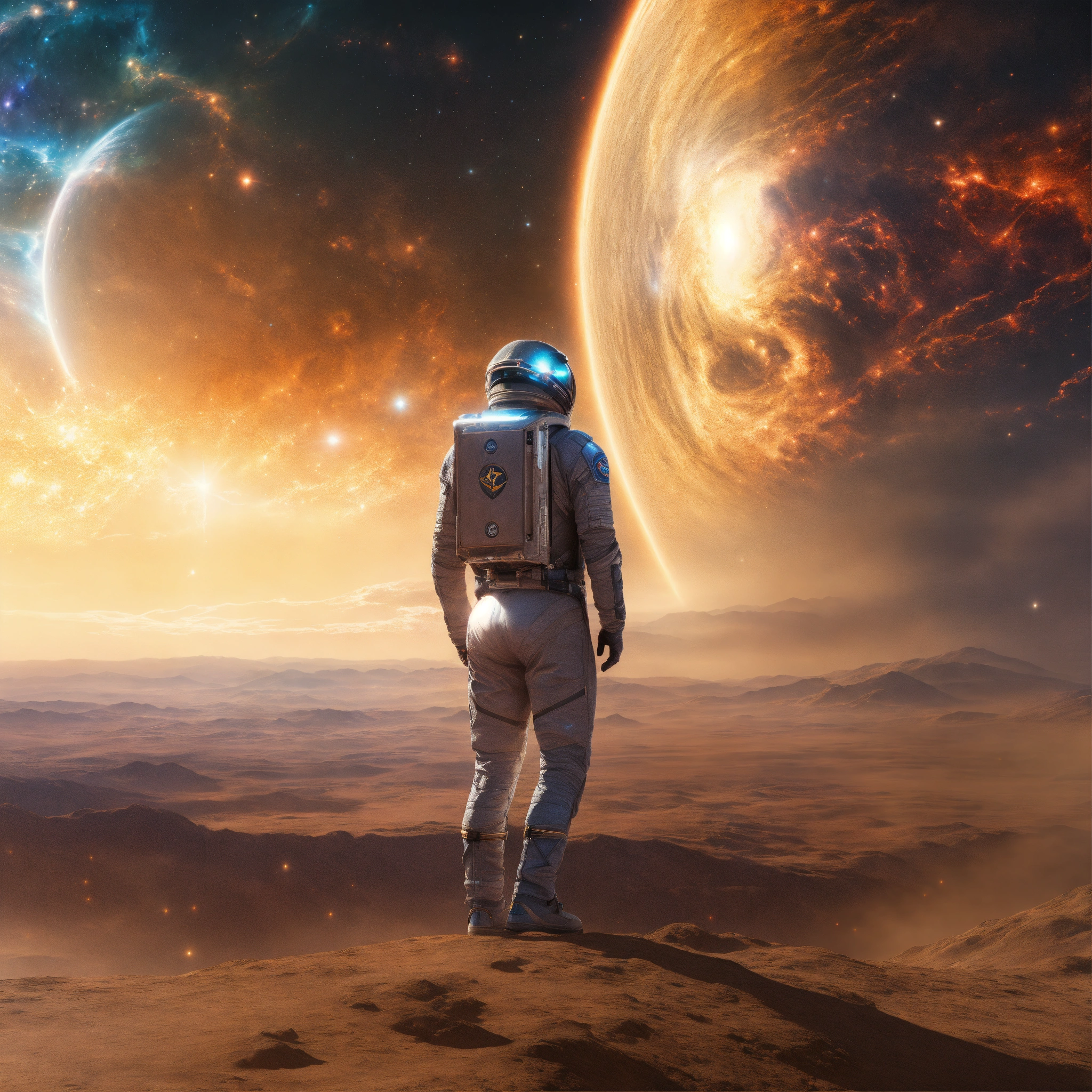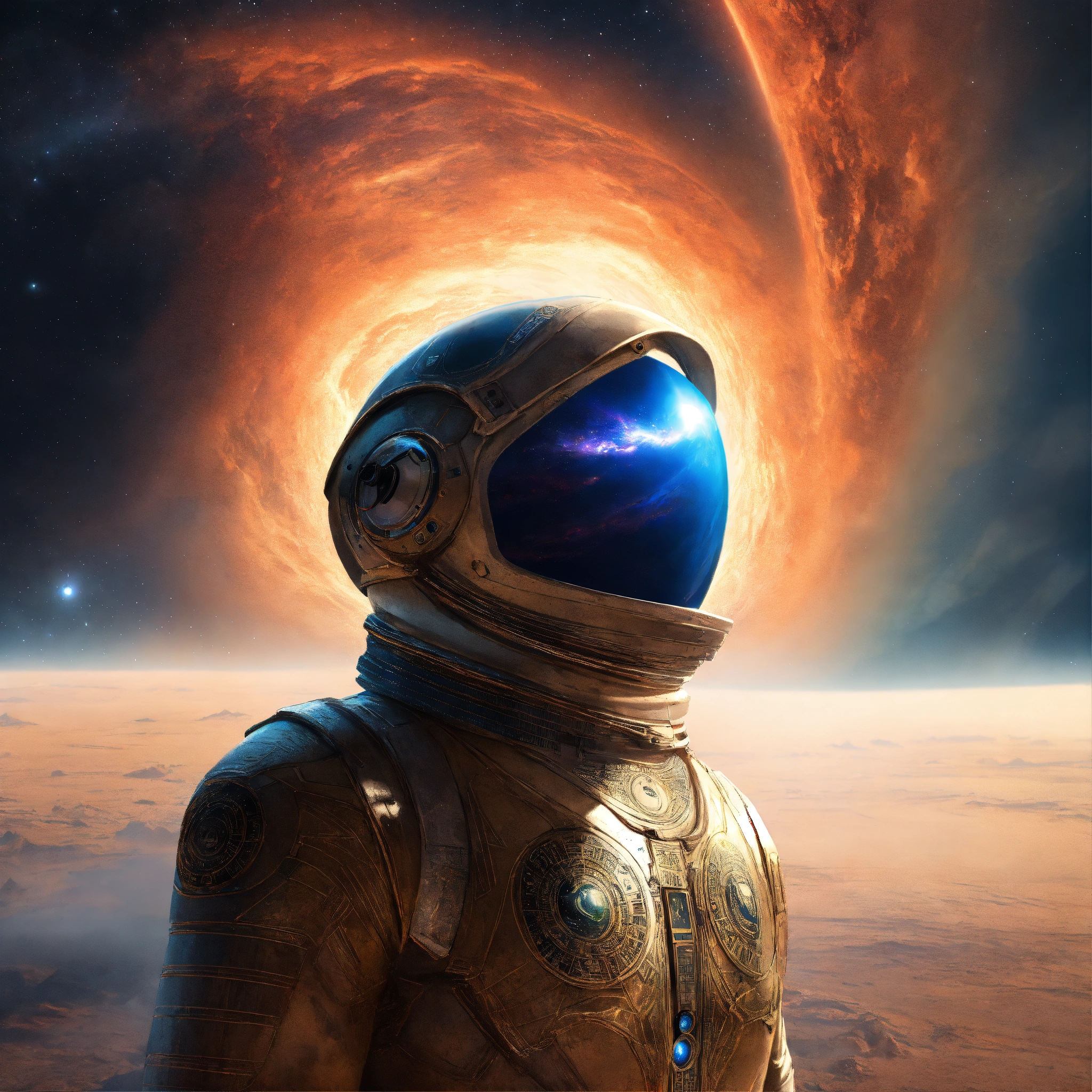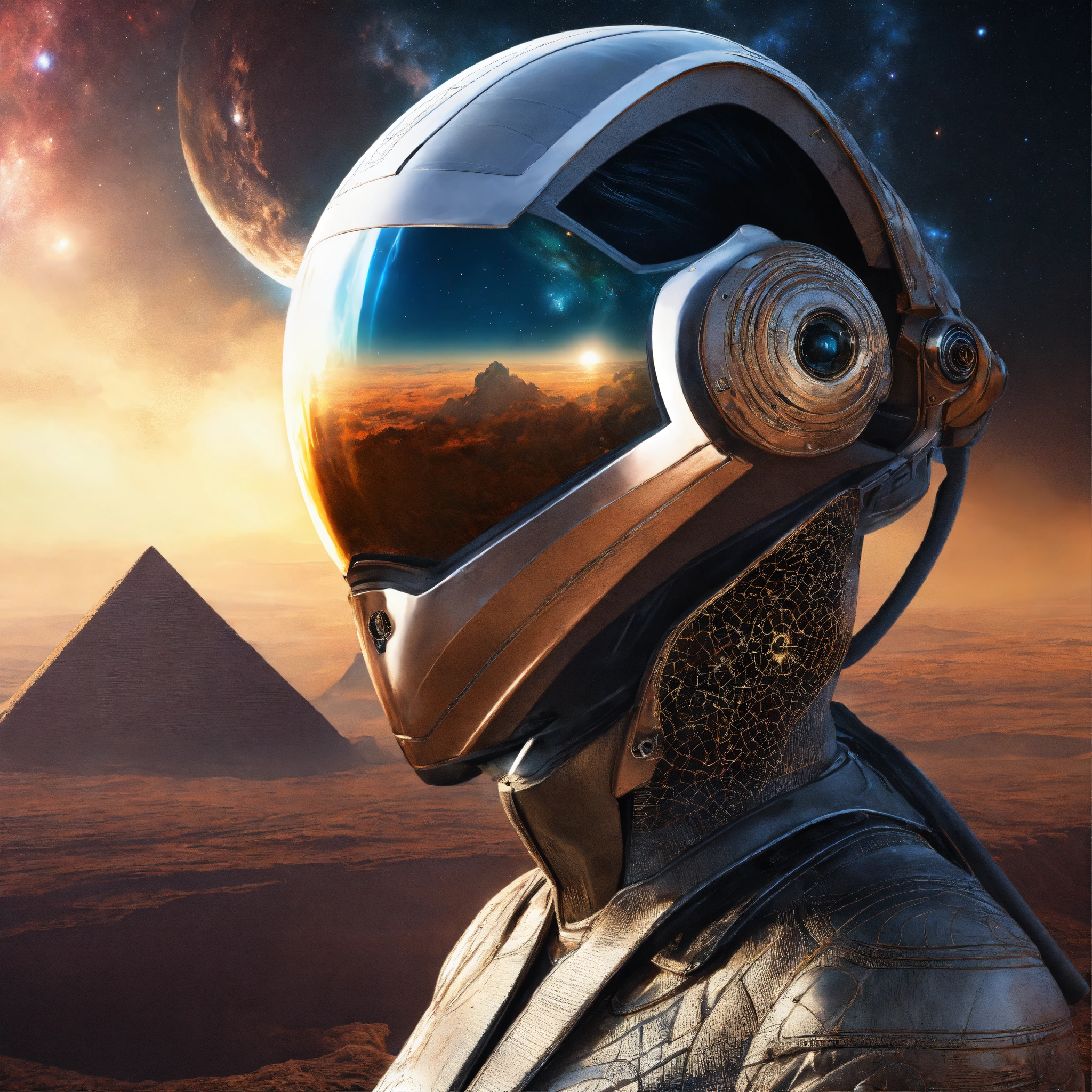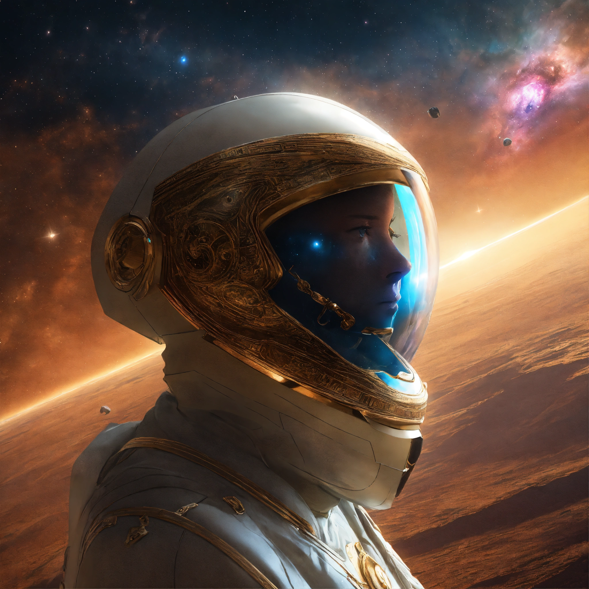 Face in the wind hiding the face, full body, frontside, the eye of horus in sky hyper realism, poetic, romantic, starship suit, realistic shading, realistic render, detailed textures, photorealistic, wide shot, space nebula landscape