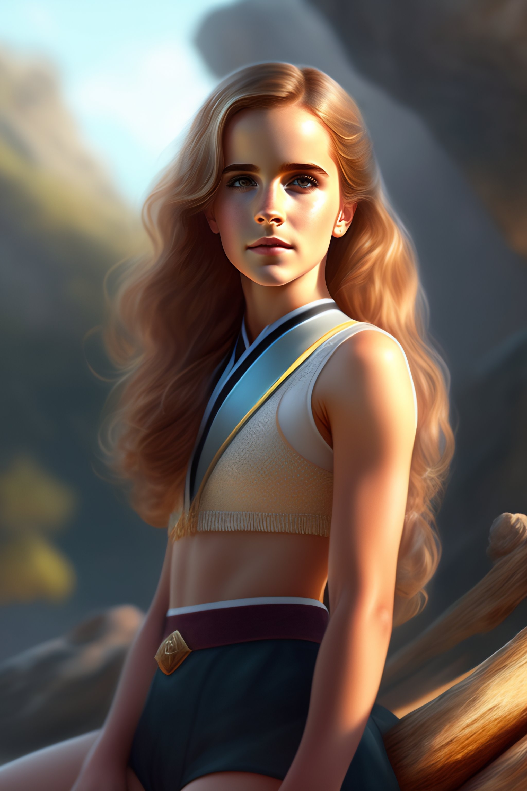 Mini-bikini, sitting on a stick, full length, legs, feet, young emma watson as hermione granger, anatomy, bathed in light, highly detailed, photorealistic, artstation, smooth, sharp focus, illustration, unreal engine 5, 8 k, art by artgerm and greg rutkowski and edgar maxence