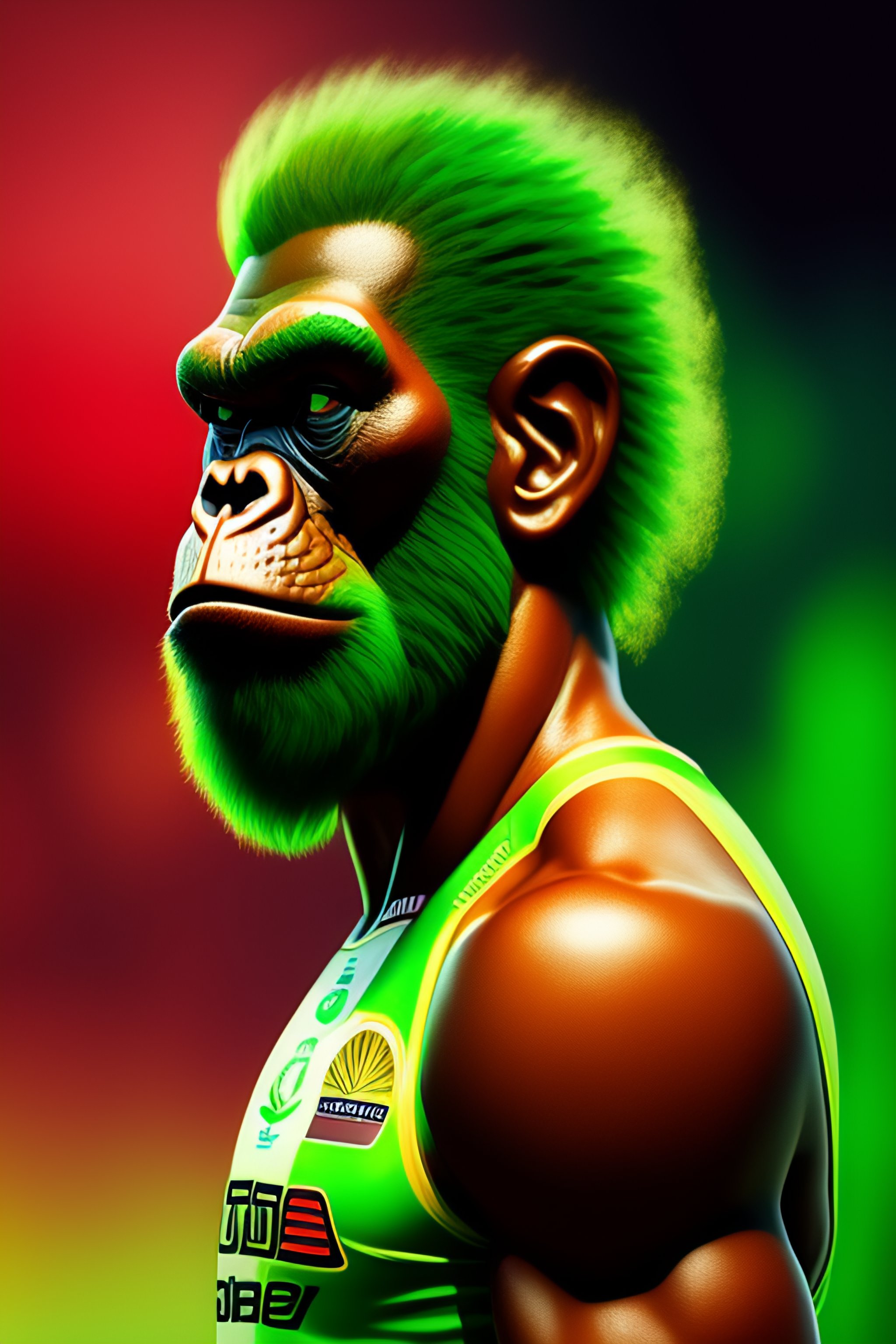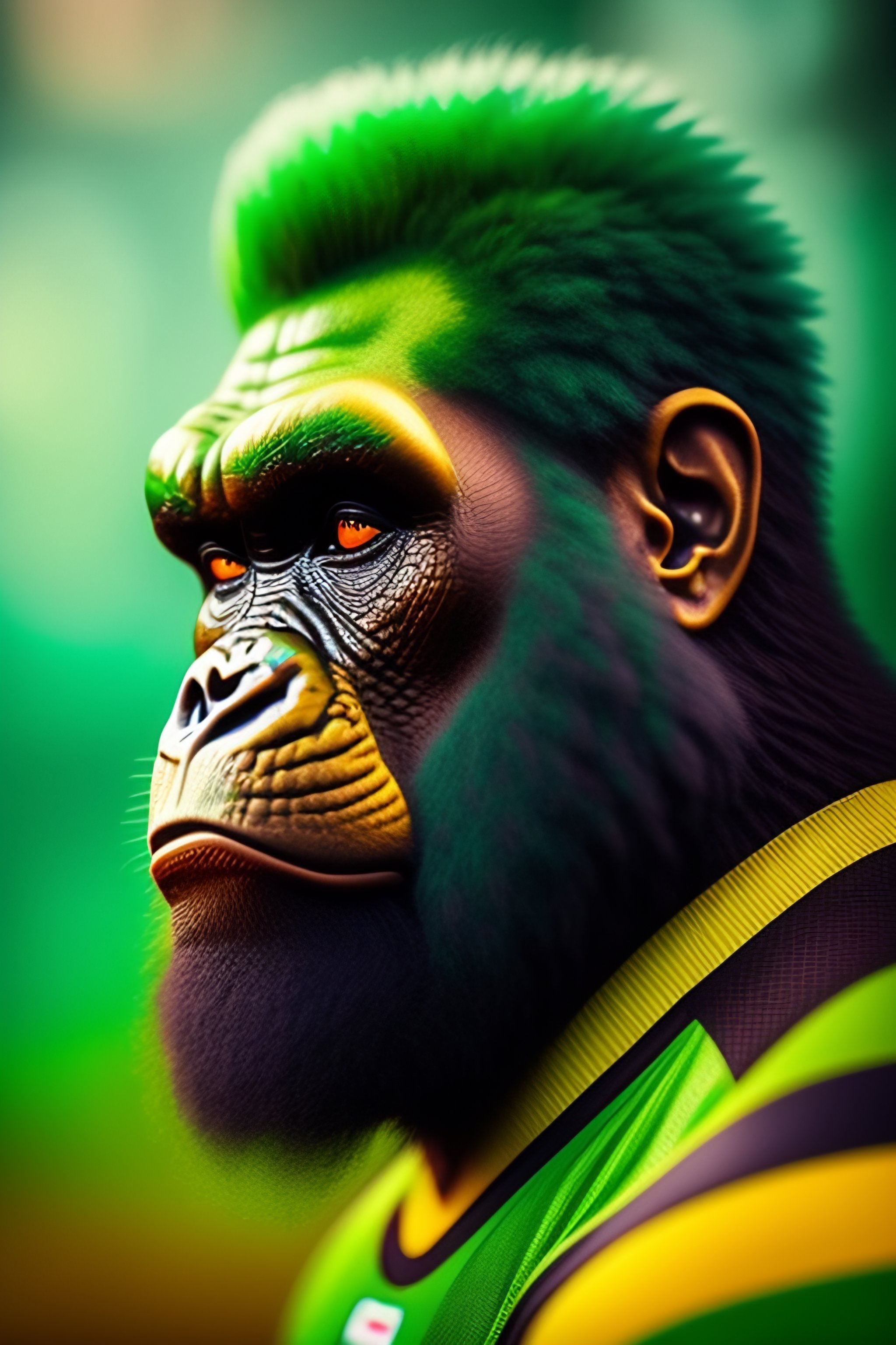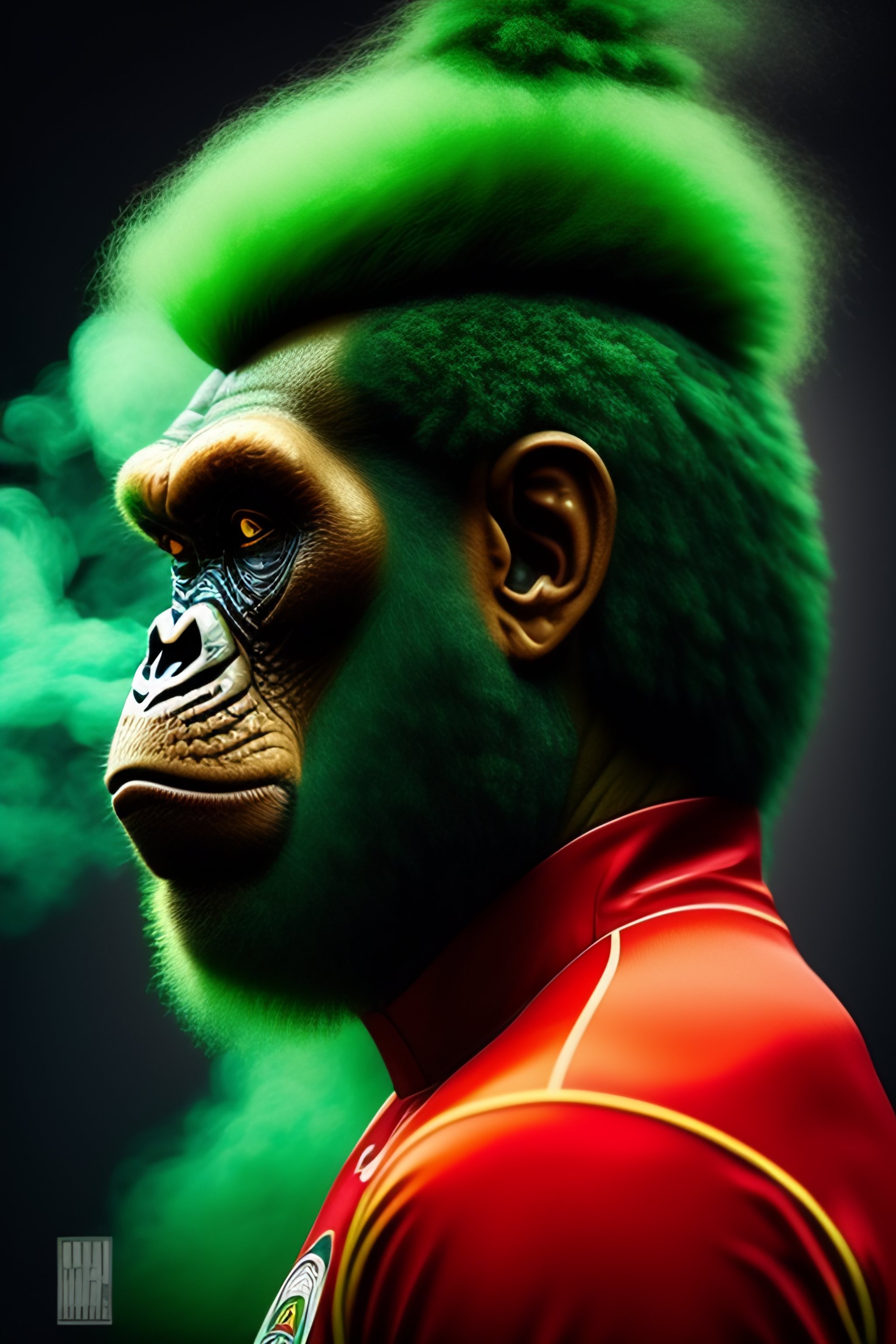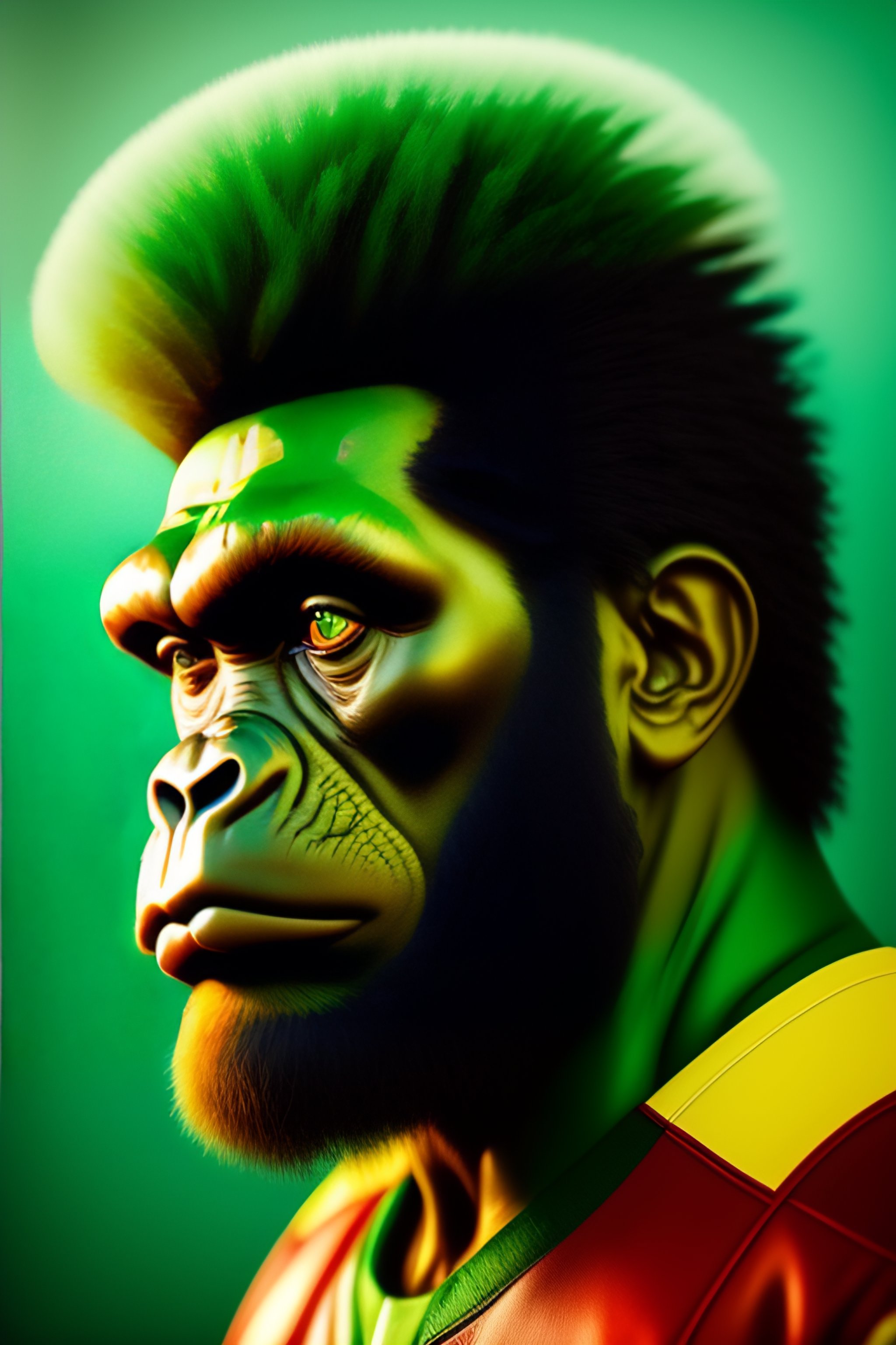 Foto de frente de un gorila de pelo verde claro con un smoking rojiblanco con un fondo estilo van gogh
