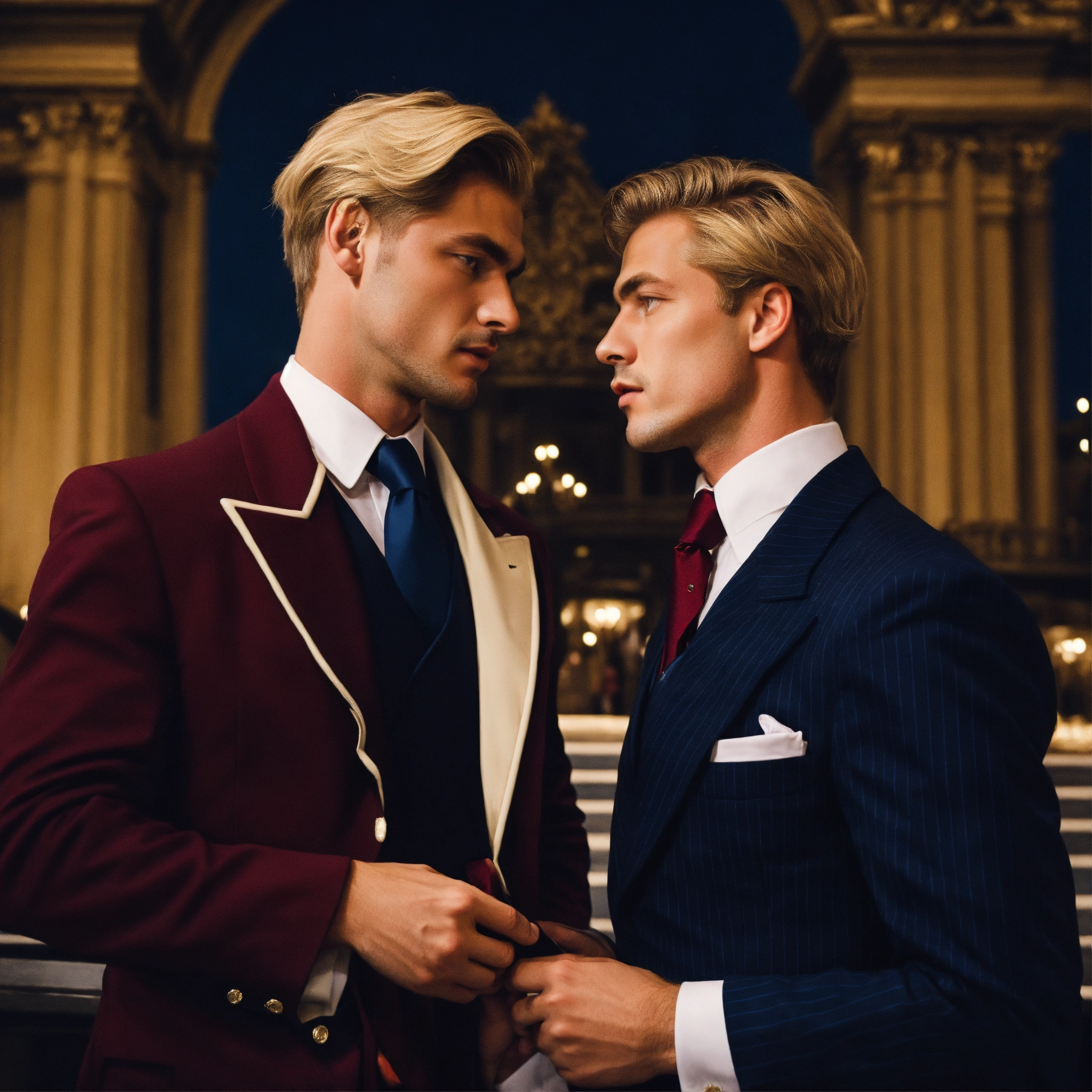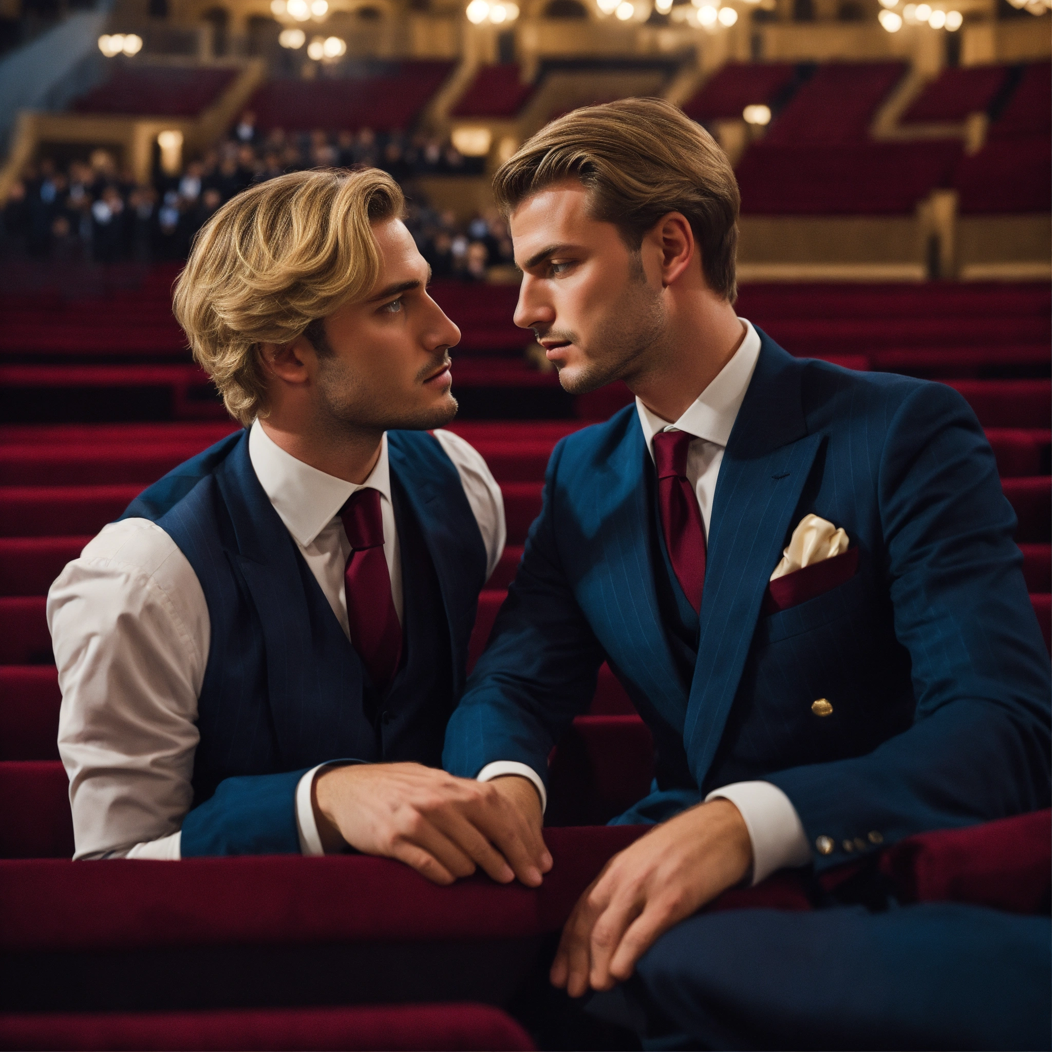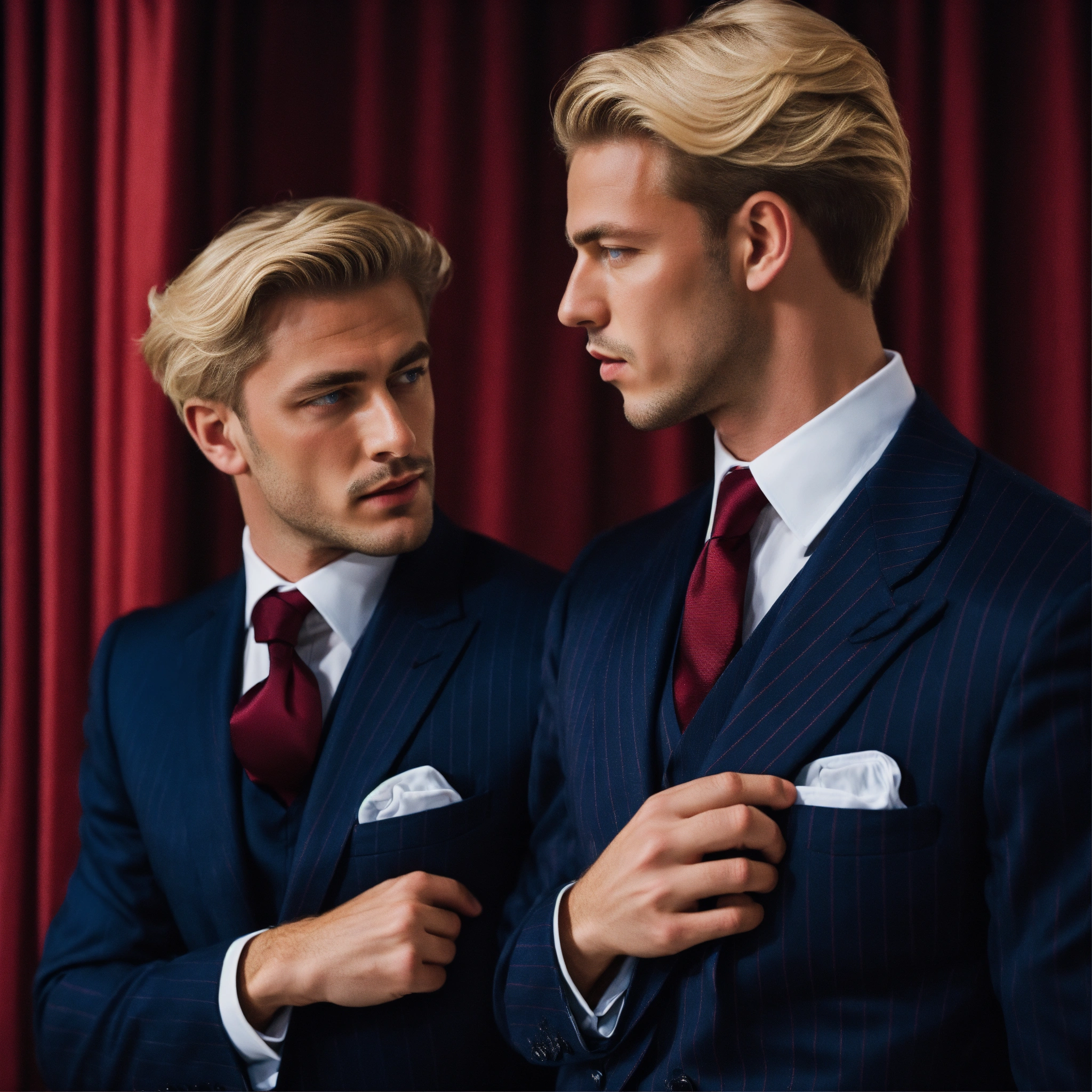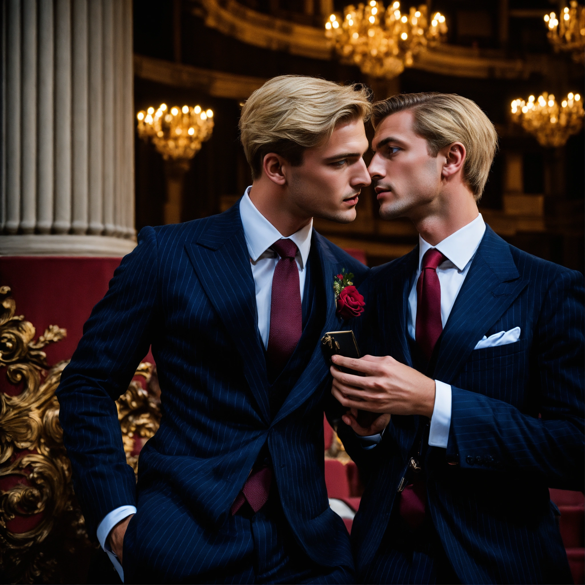 Two young blonde italian gentlemen in navy pinstripe suit, burgundy tie, blue eyes, caressing their cheek at the opera