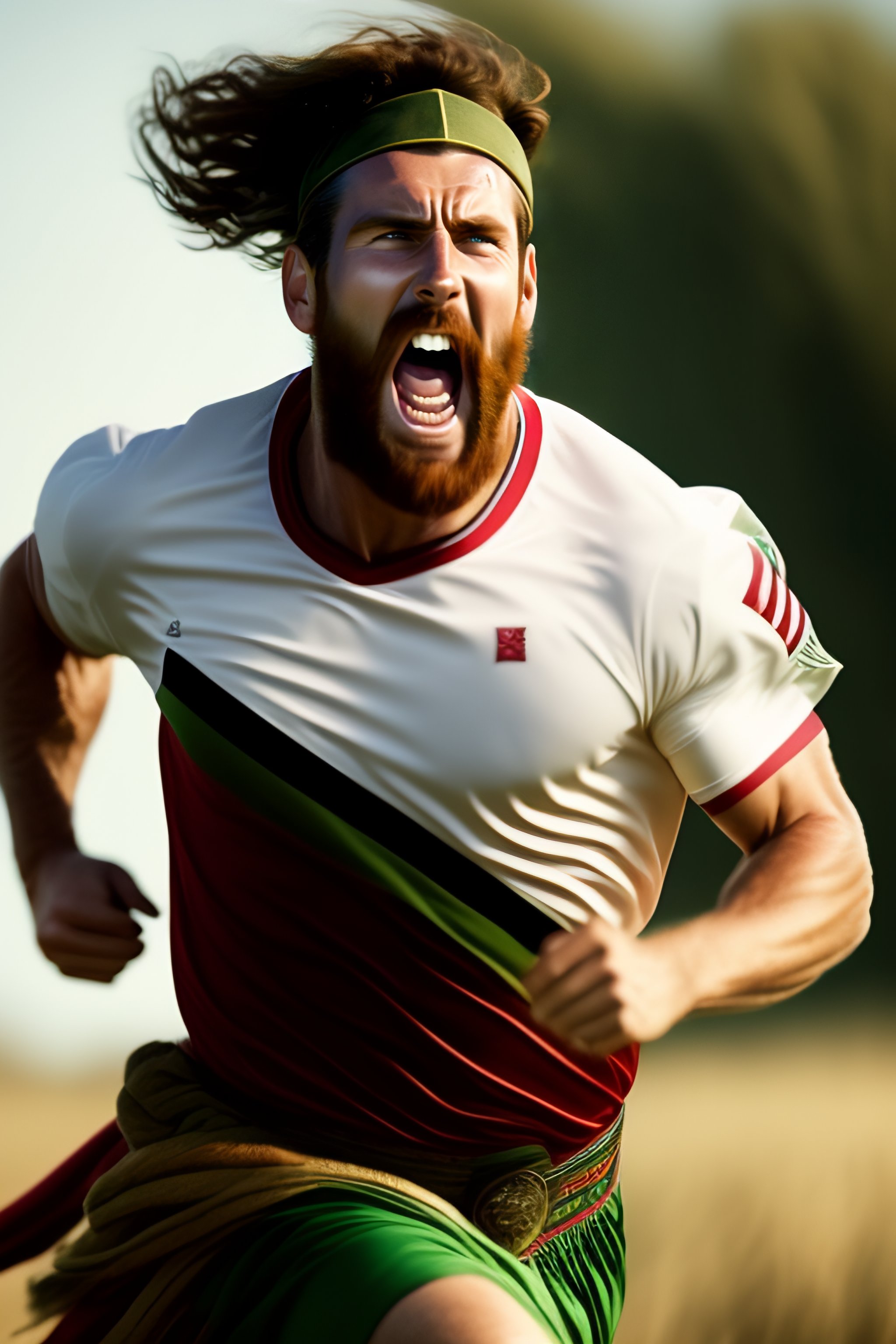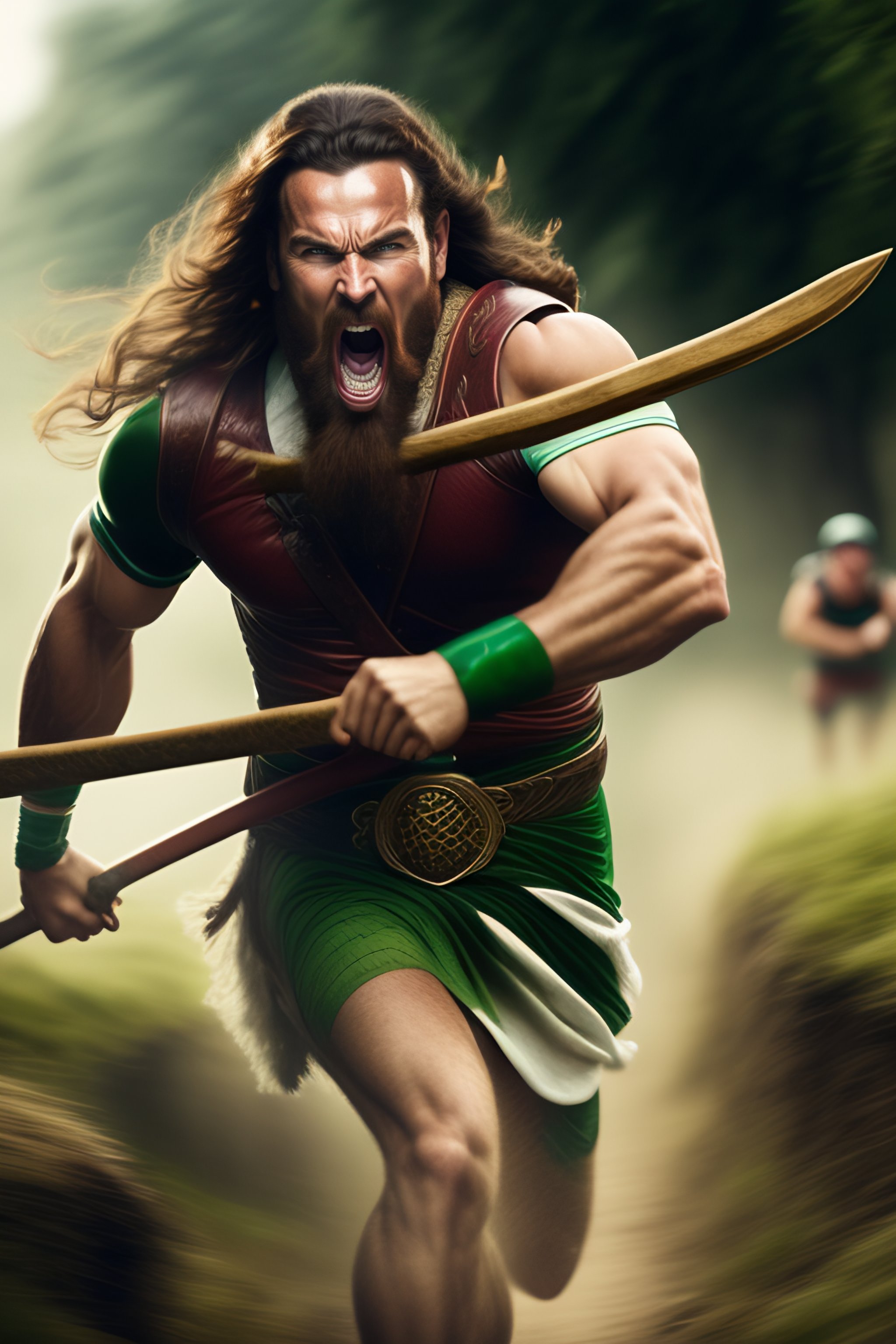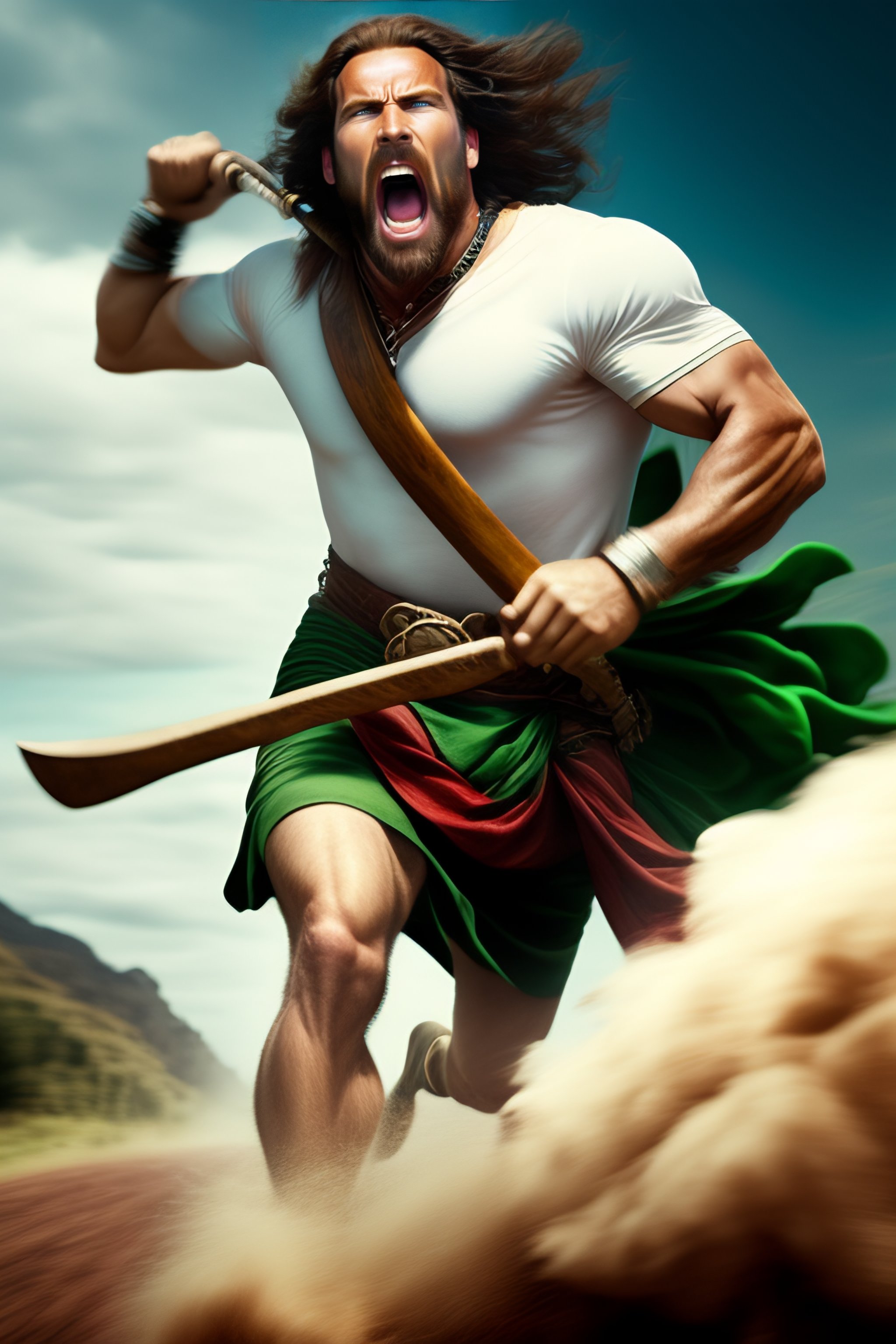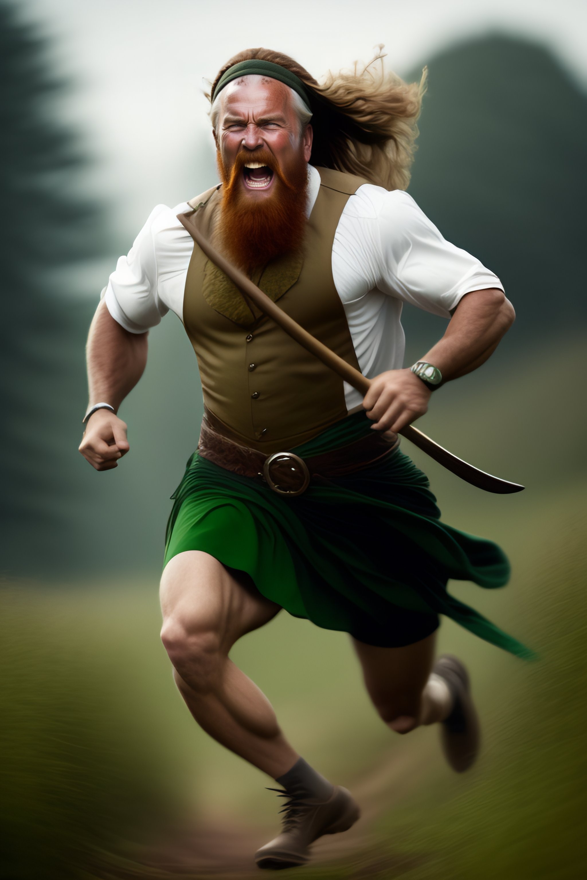 Ancient scotsman man screaming and running from the front, white t-shirt and green skirt, and an axe with two hands, brown hair