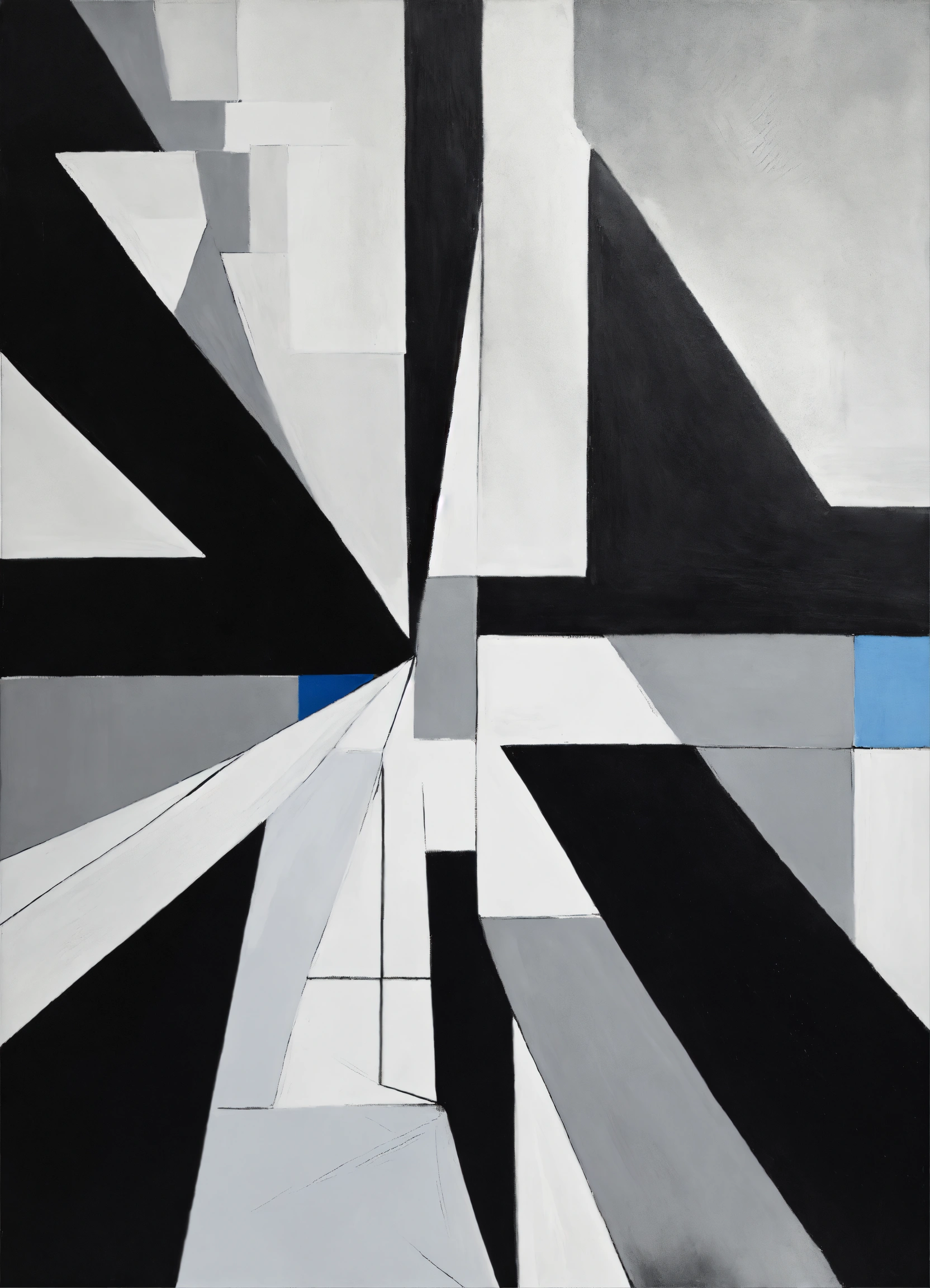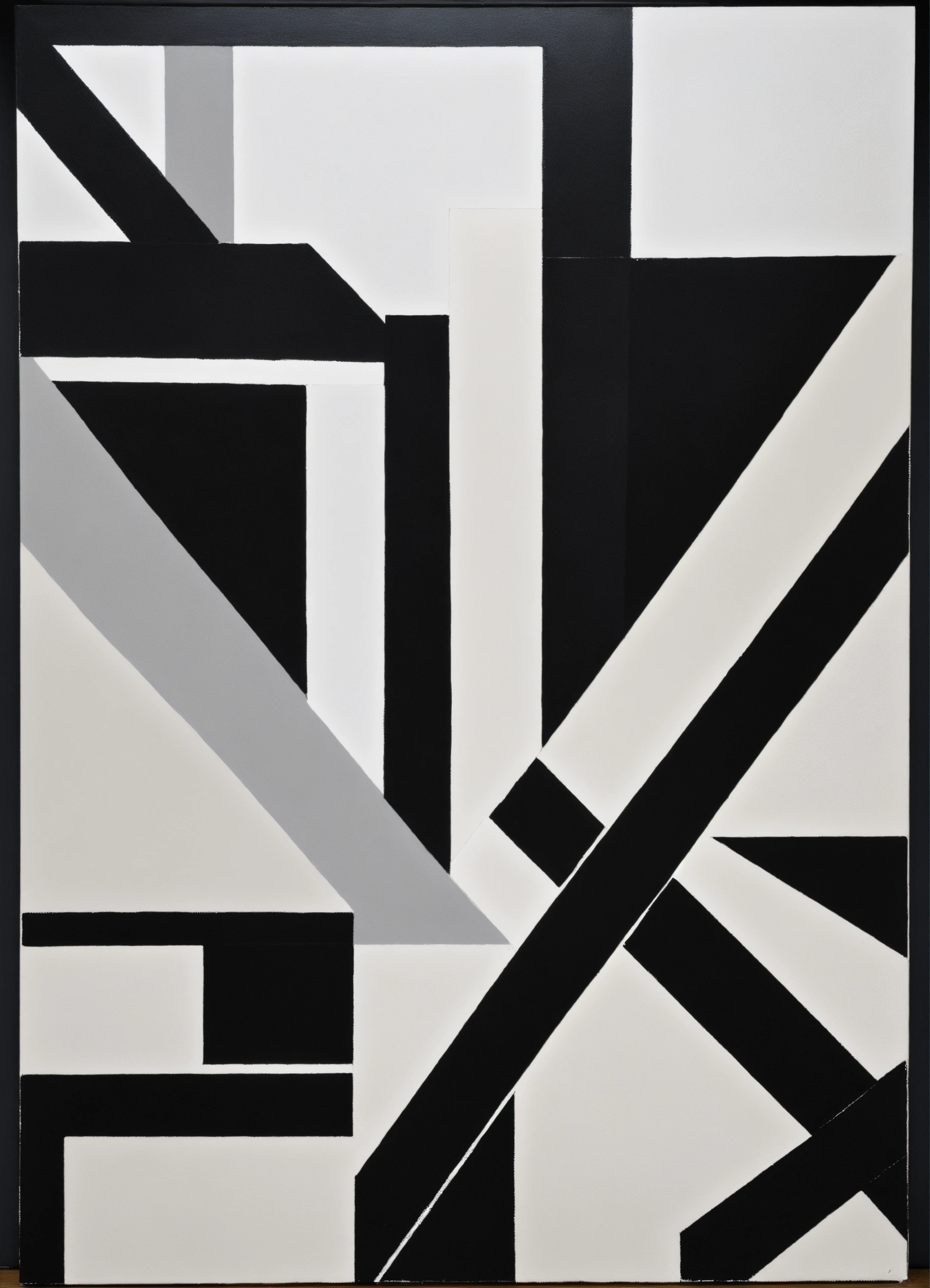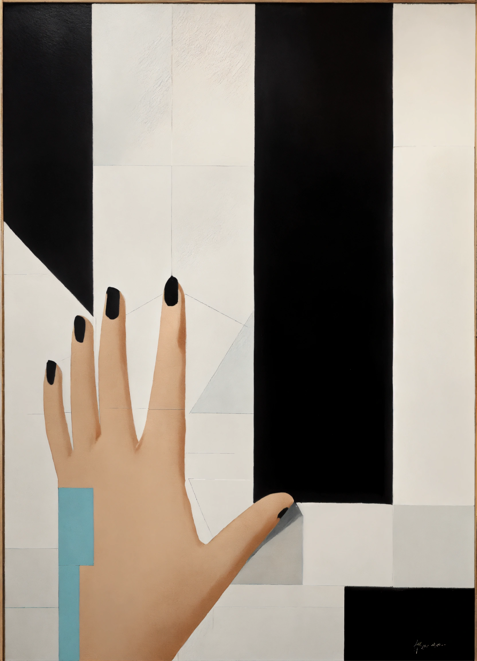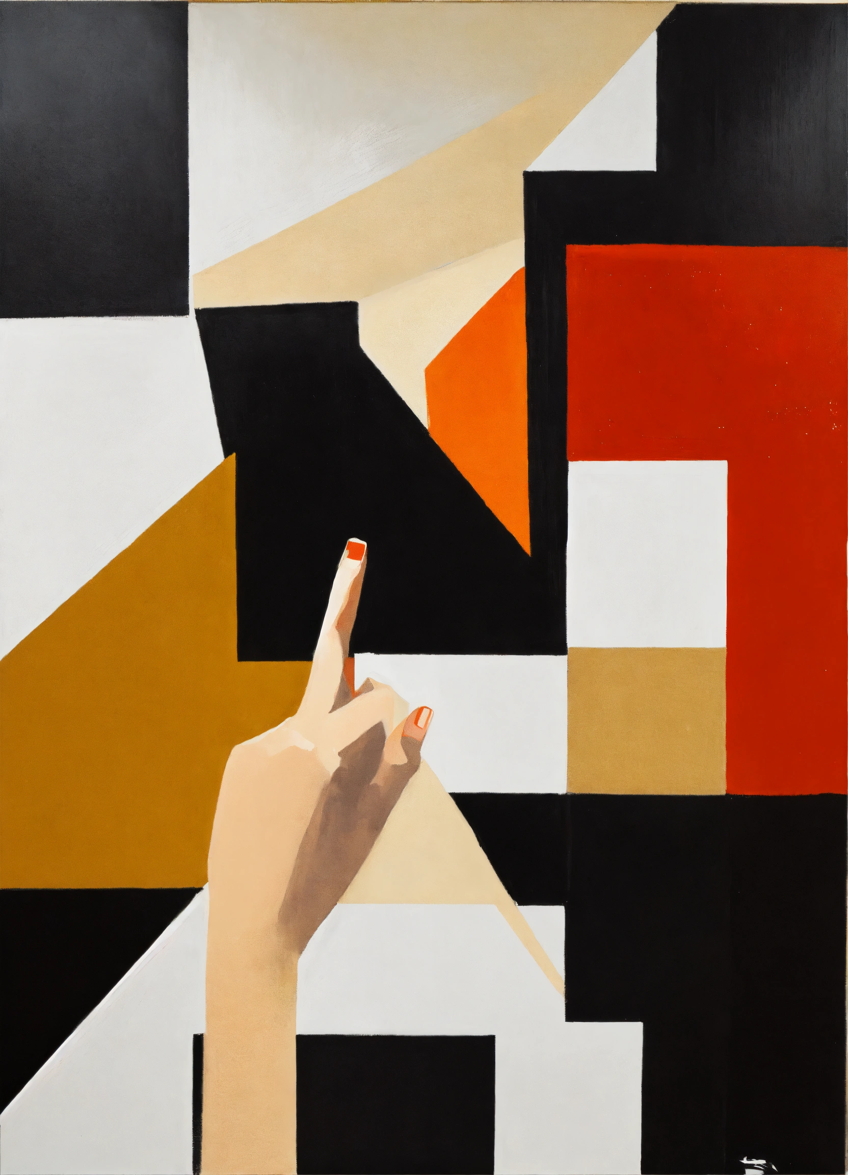 Create a captivating suprematist inspired acrylic painting of a two index fingers with 90 degrees to each other using only black and white, use geometric shapes and negative space to evoke a sense of emptiness or void