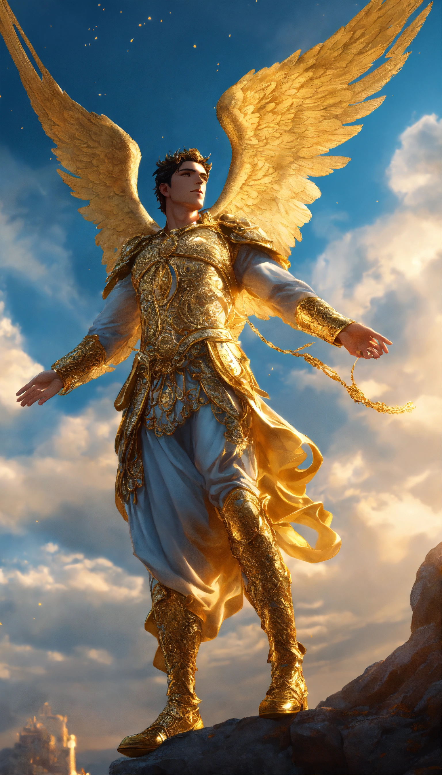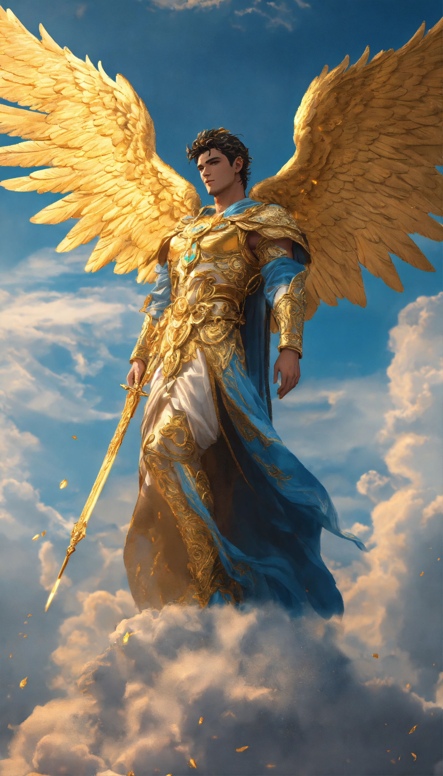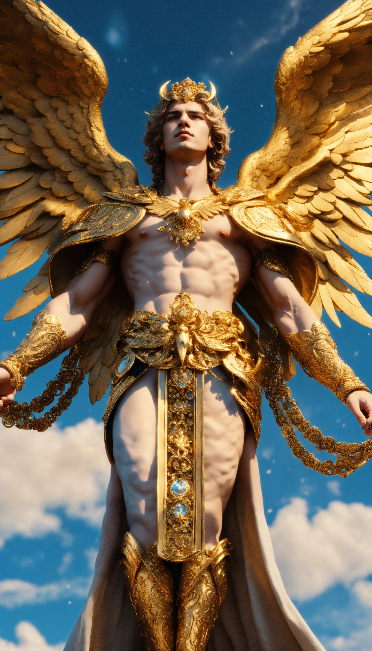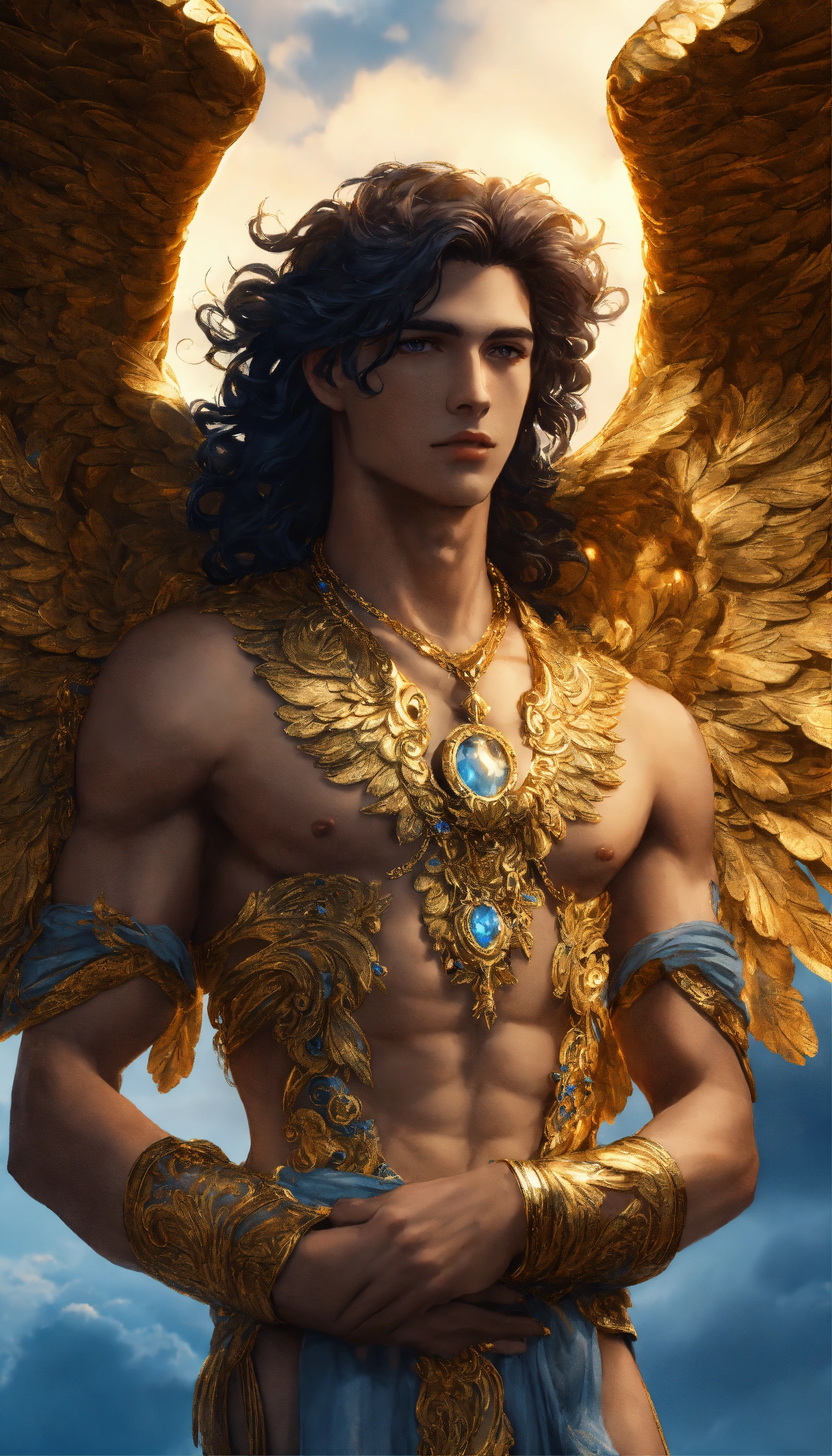 8k wallpaper of a beautiful male archangel wearing gold jewelry in a cloudy blue sky, intricate detail, trending on artstation, 8k, fluid motion, stunning shading
