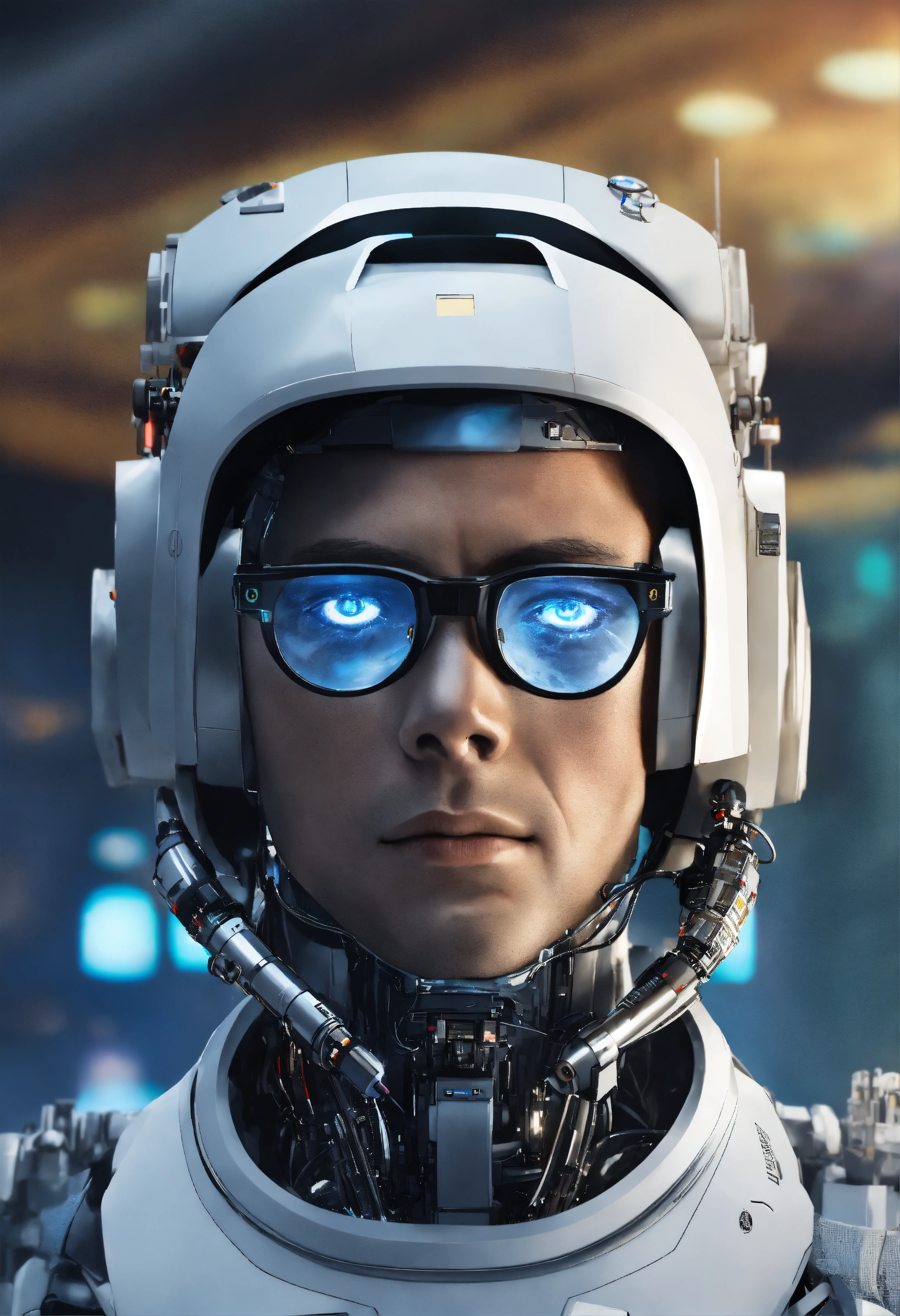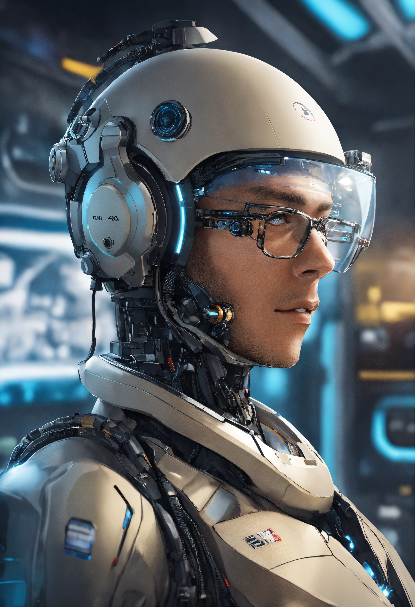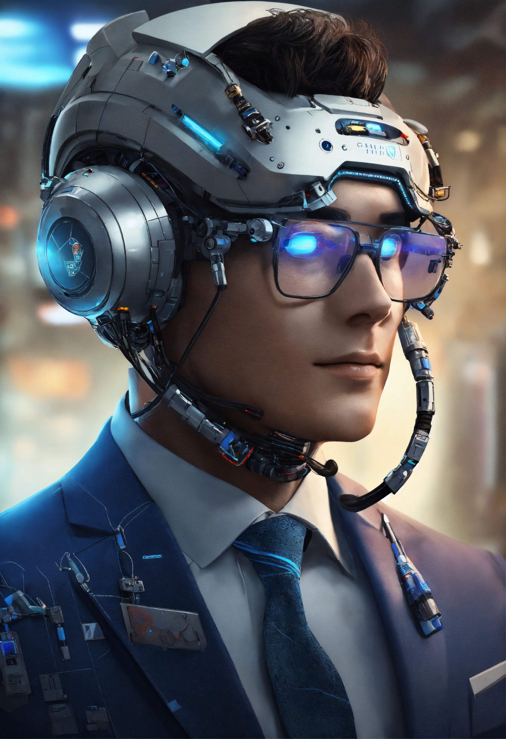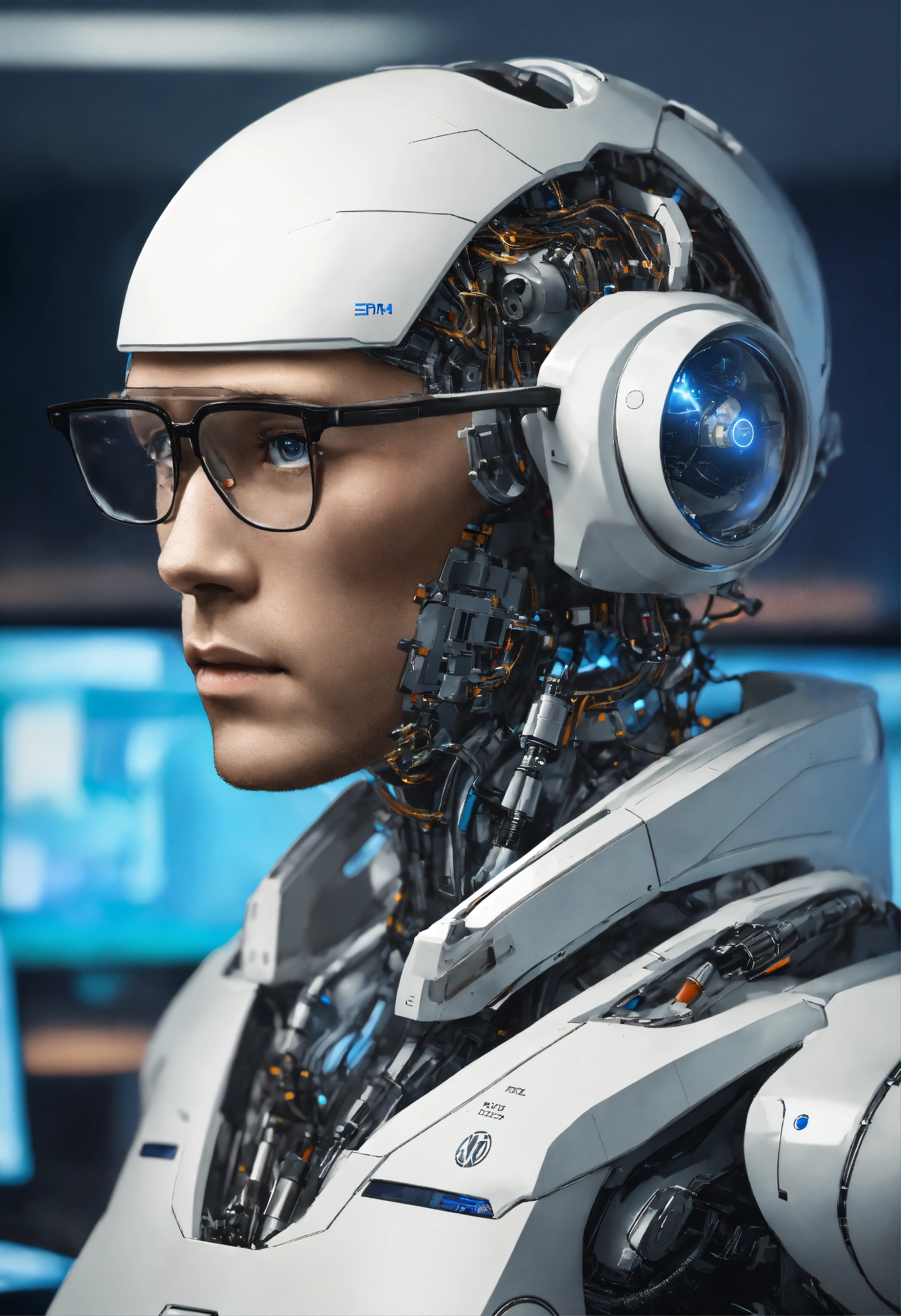 Futuristic space news anchor who is half-robot and half-human, with a face that closely resembles that of a typical human, wearing glasses. a professional news anchor working at a space station in the future. he has a unique appearance, has a robot part from the back of his head to his neck.