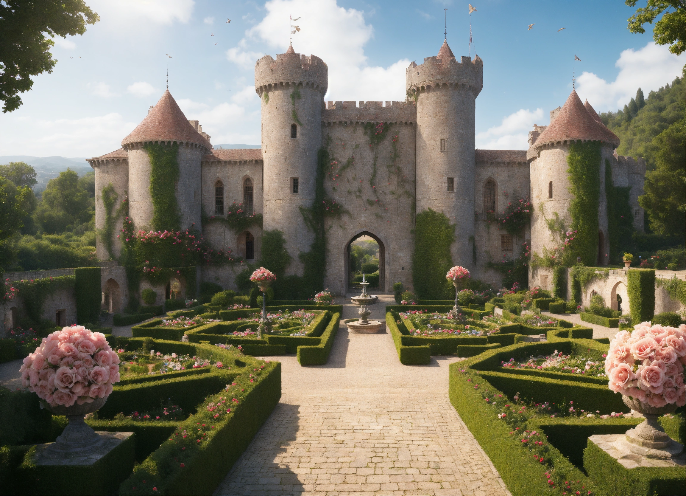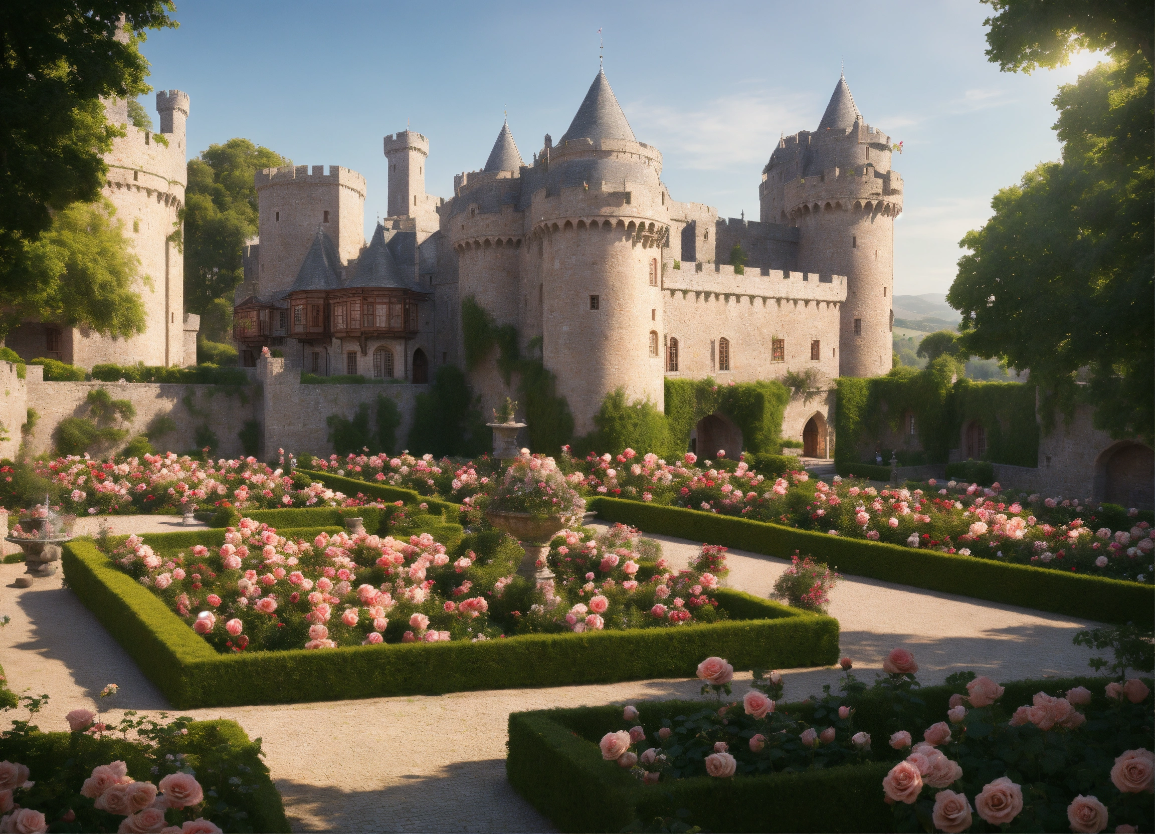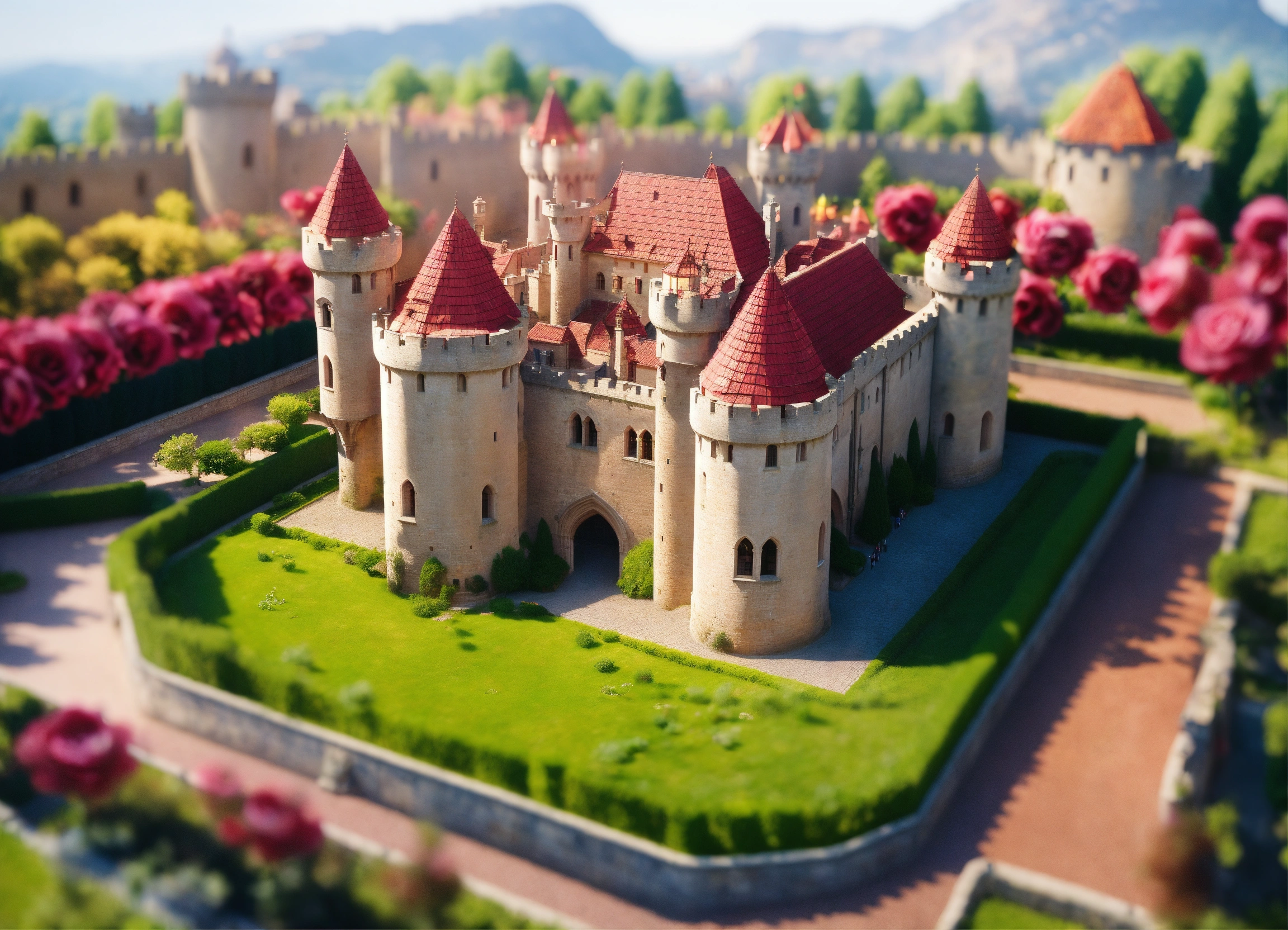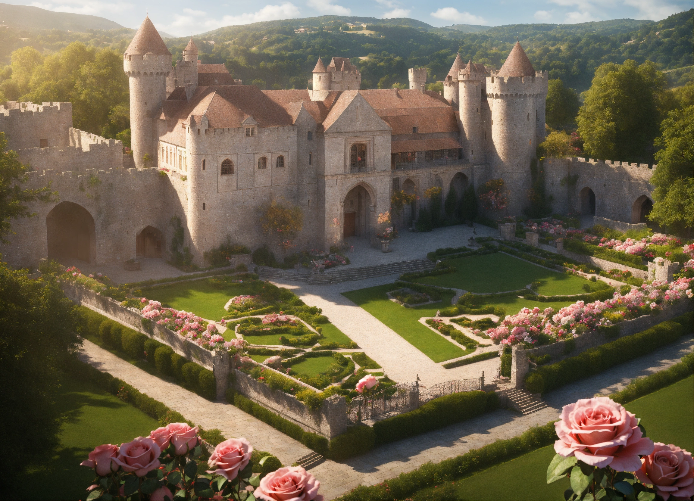Ultra realistic, photorealistic, bird's eye view of a medieval castle, palace of roses, rose bowers, magnificent rose garden and arcades, magnificent fountain, marble figures in the gardens, massive crenellated stone wall with a central wall gate and watchtowers surrounds the castle area, with a large inner courtyard and several servants quarters, extensive rose fields on hilly landscapes in the area around the castle, ultra detailled, focus on castle, sharp focus, sharp, ambient lighting