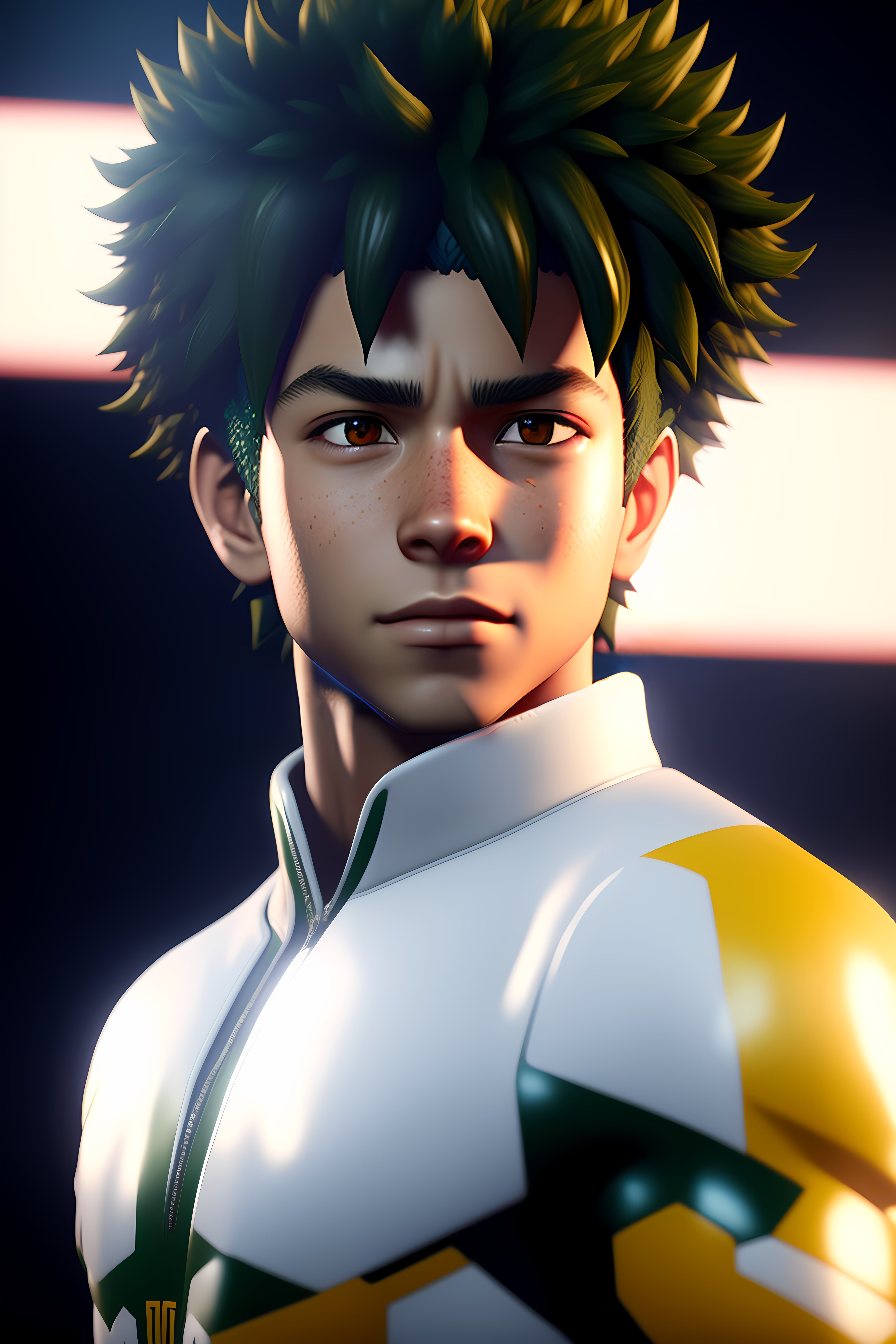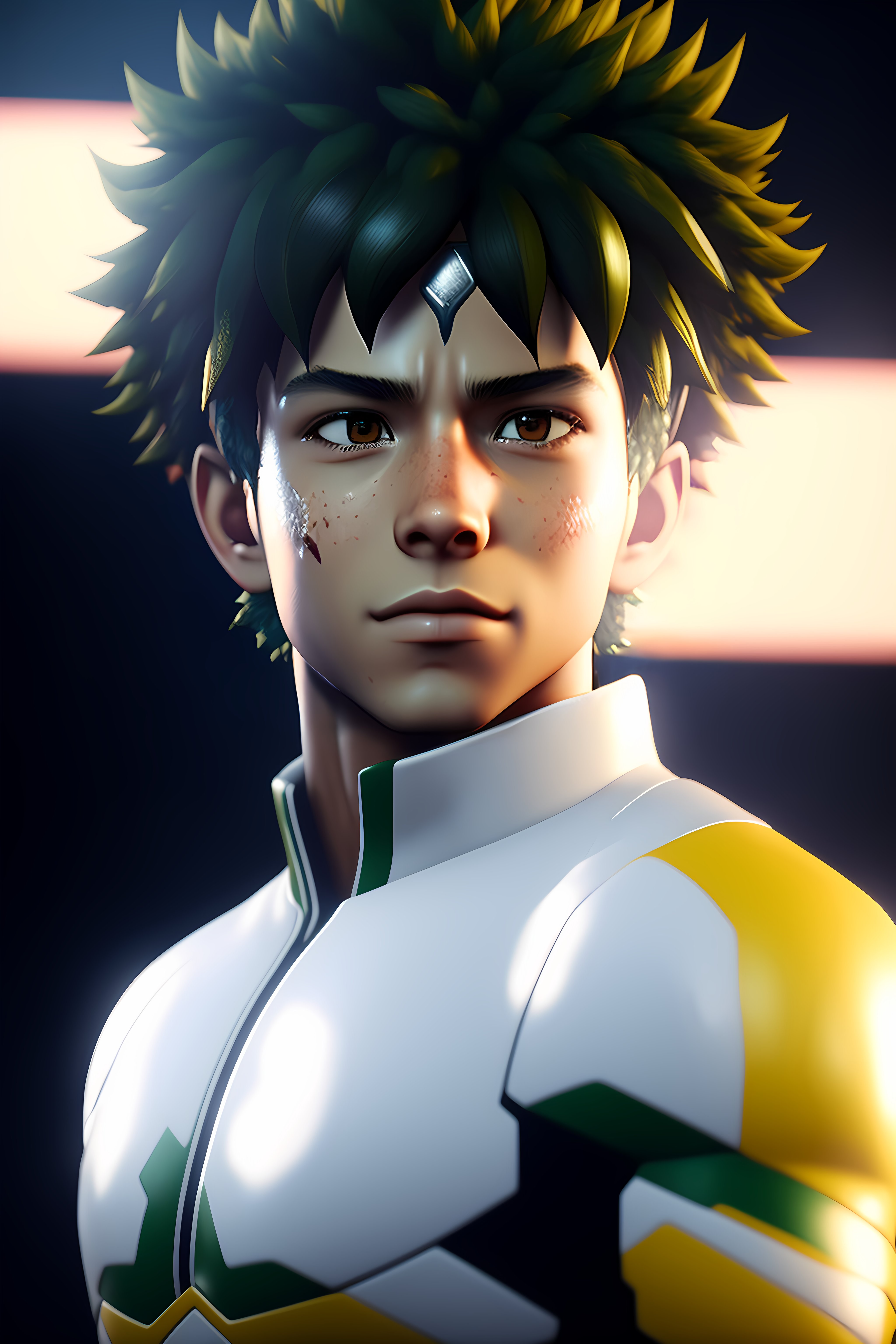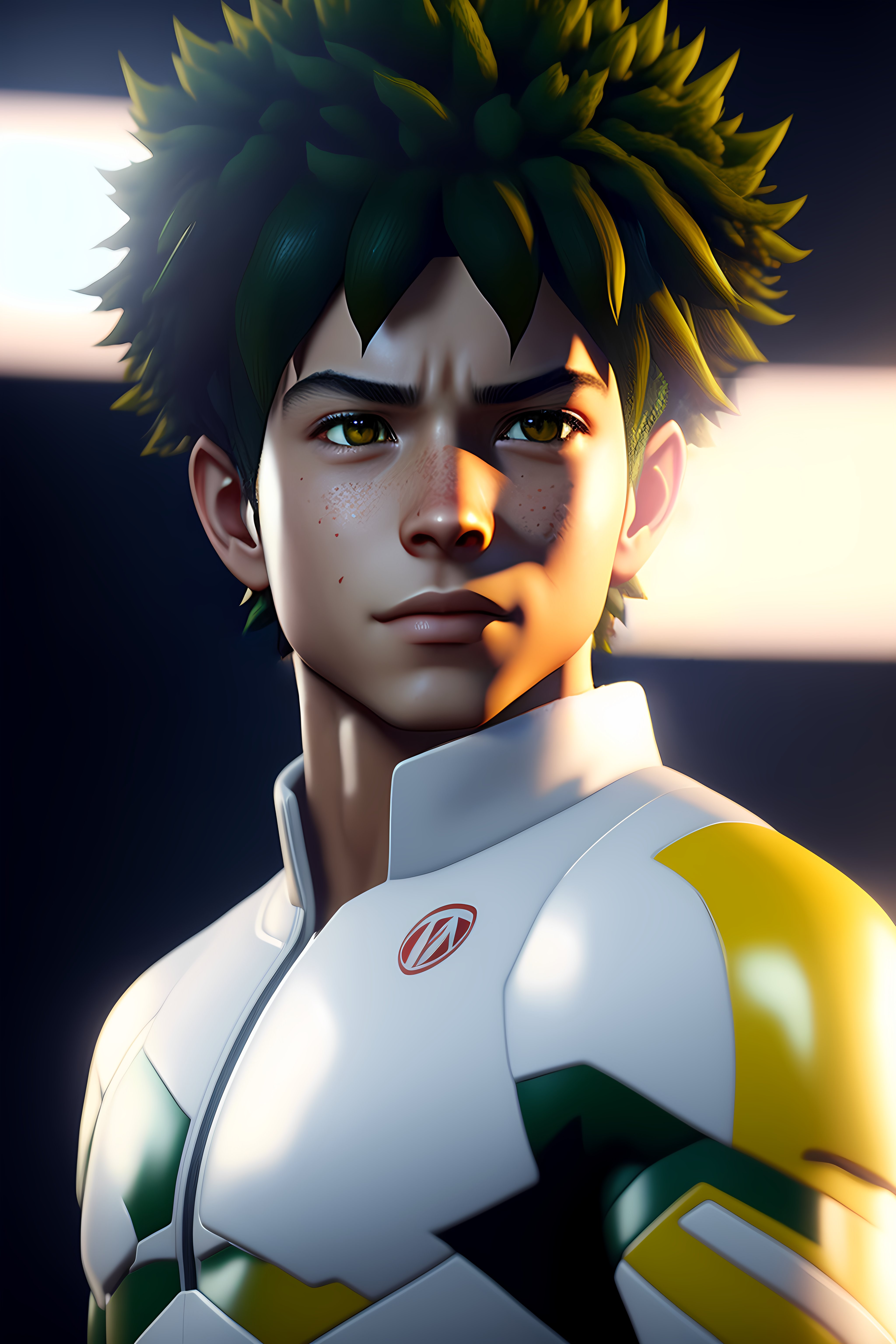 White izuku midoriya from my hero academia, hyper realistic, octane rendering, unreal engine 5, illumination, 4k rendered, highly detailed