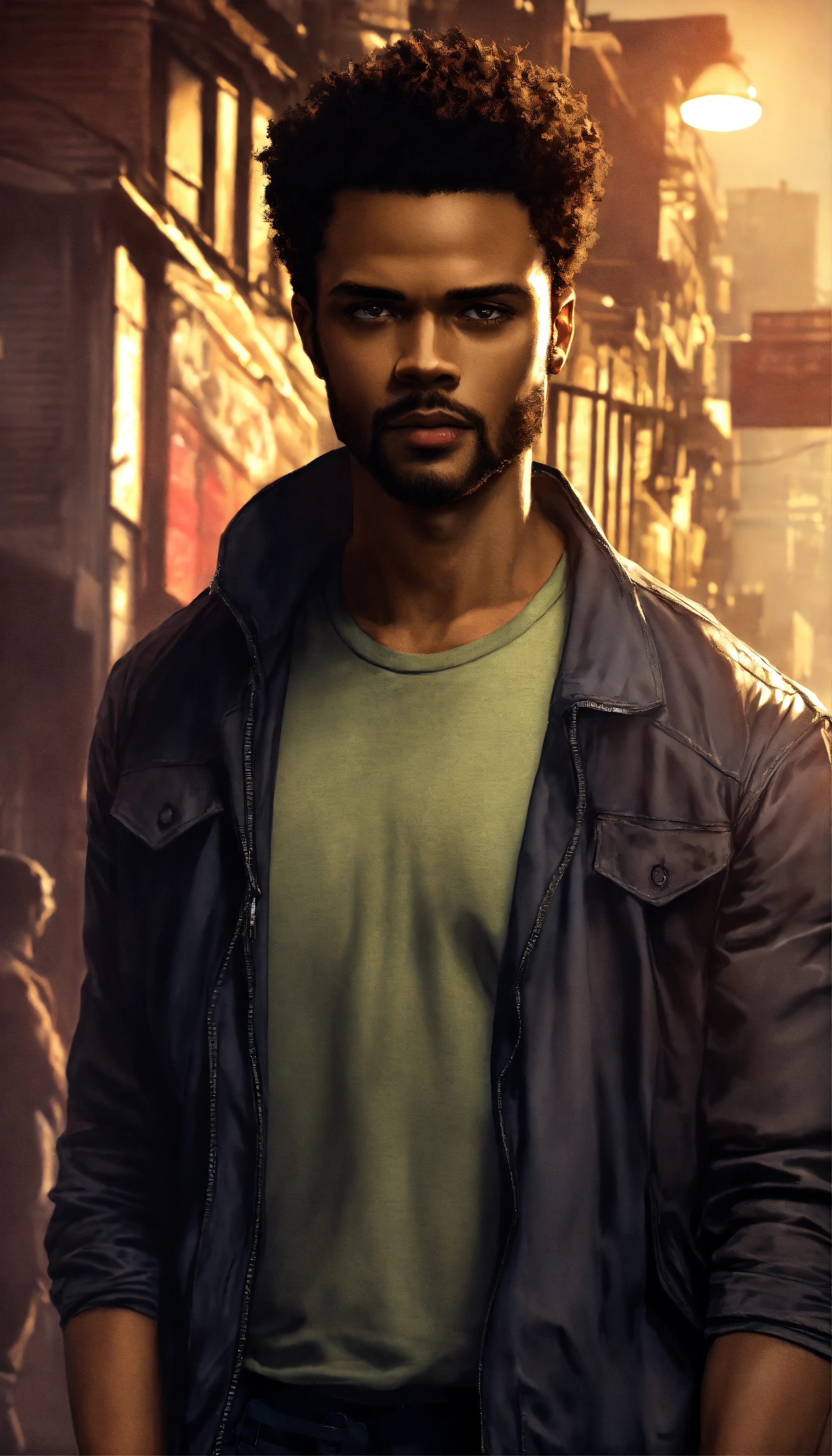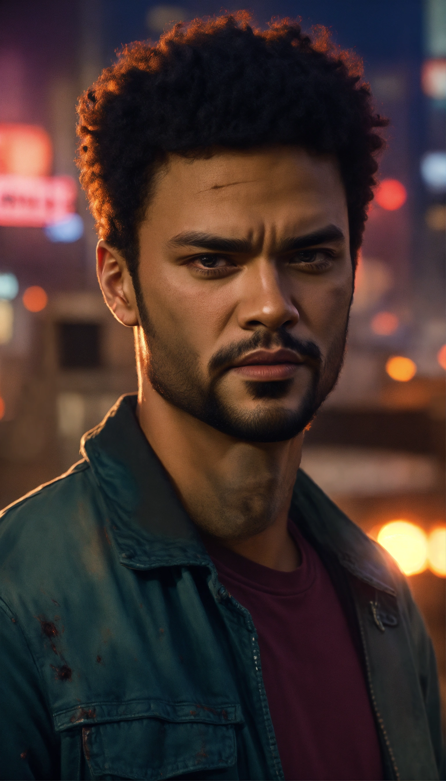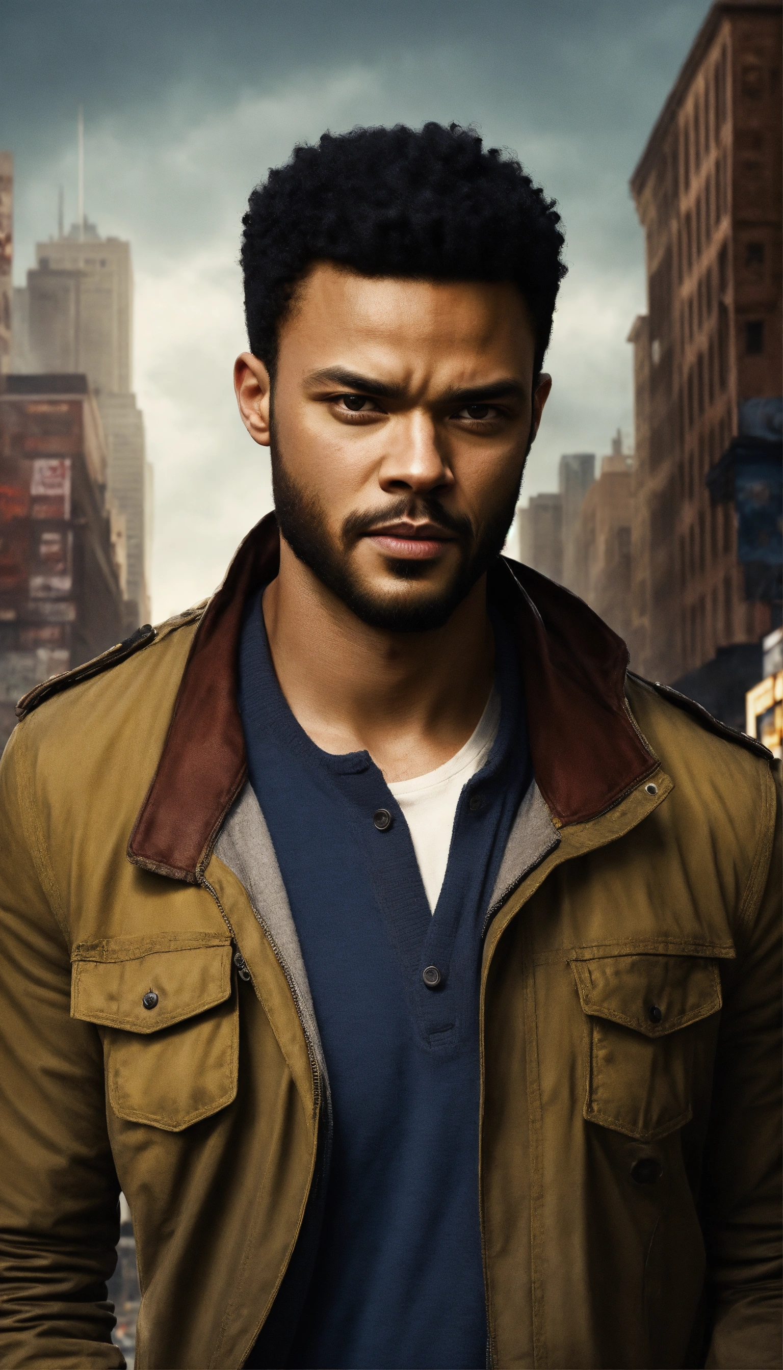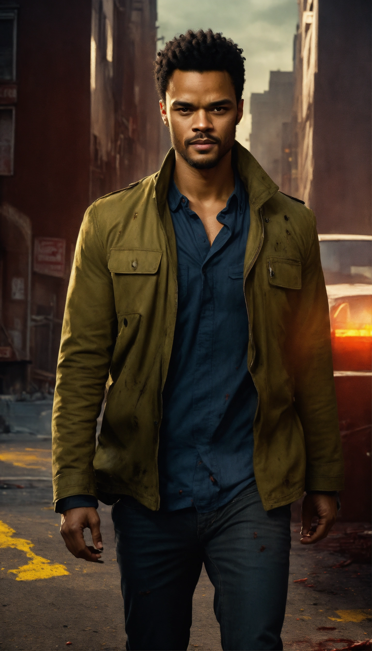 Handsome nice eka darville, zombie-infested city, dark, cinematic, jessica jones style, short hair, short temples, soft smile