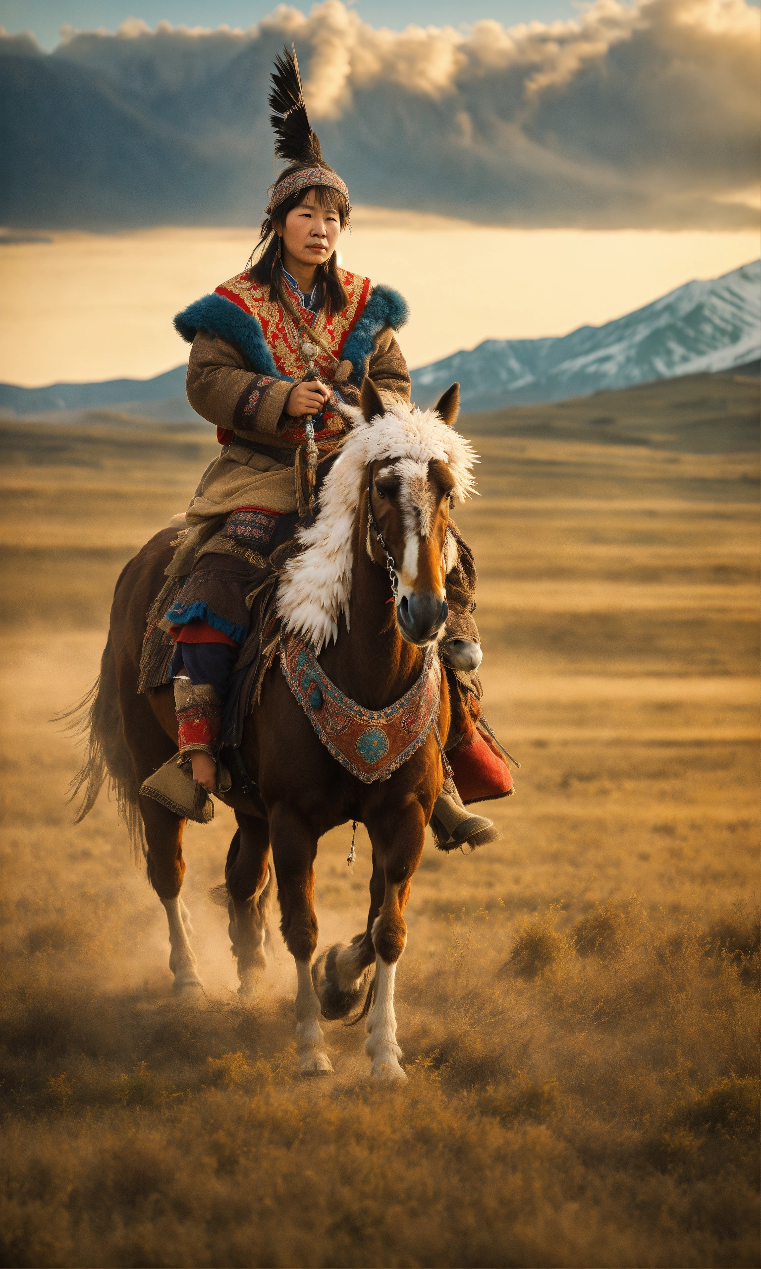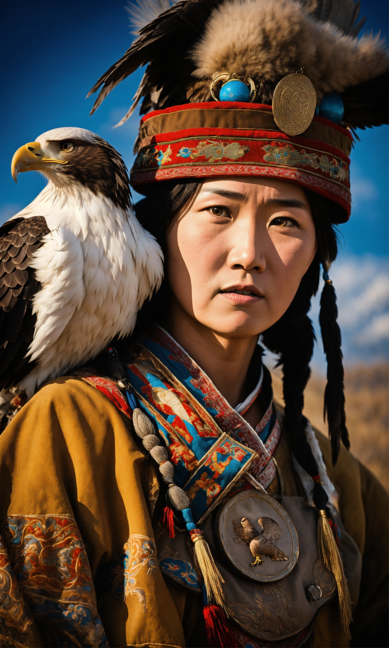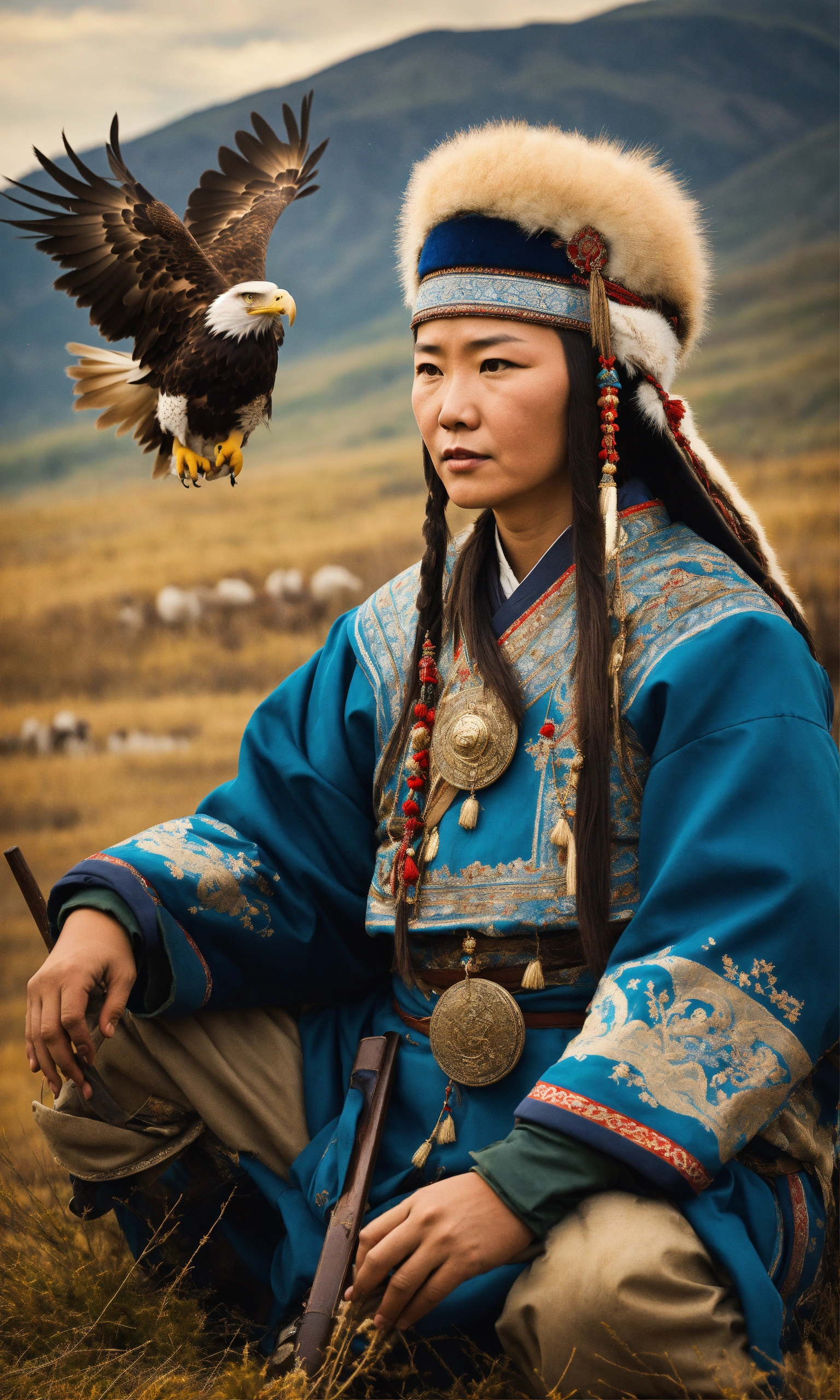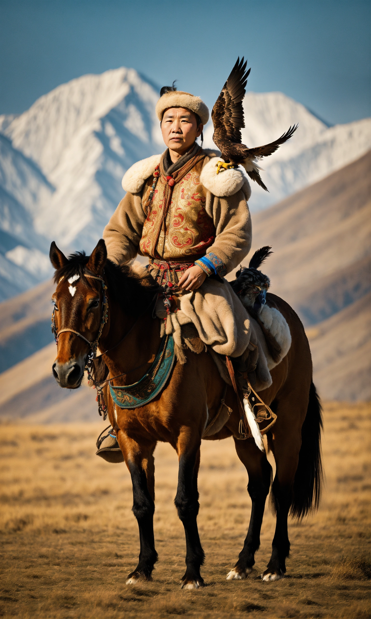 Ultra realistic 12k photo, variant adult and family in kazakh culture, tradition and family are very important in kazakh culture. in the north-west of mongolia, the kazakhs perpetuate the centuries-old tradition of eagle hunting and maintain a nomadic existence, a cinematic atmosphere.