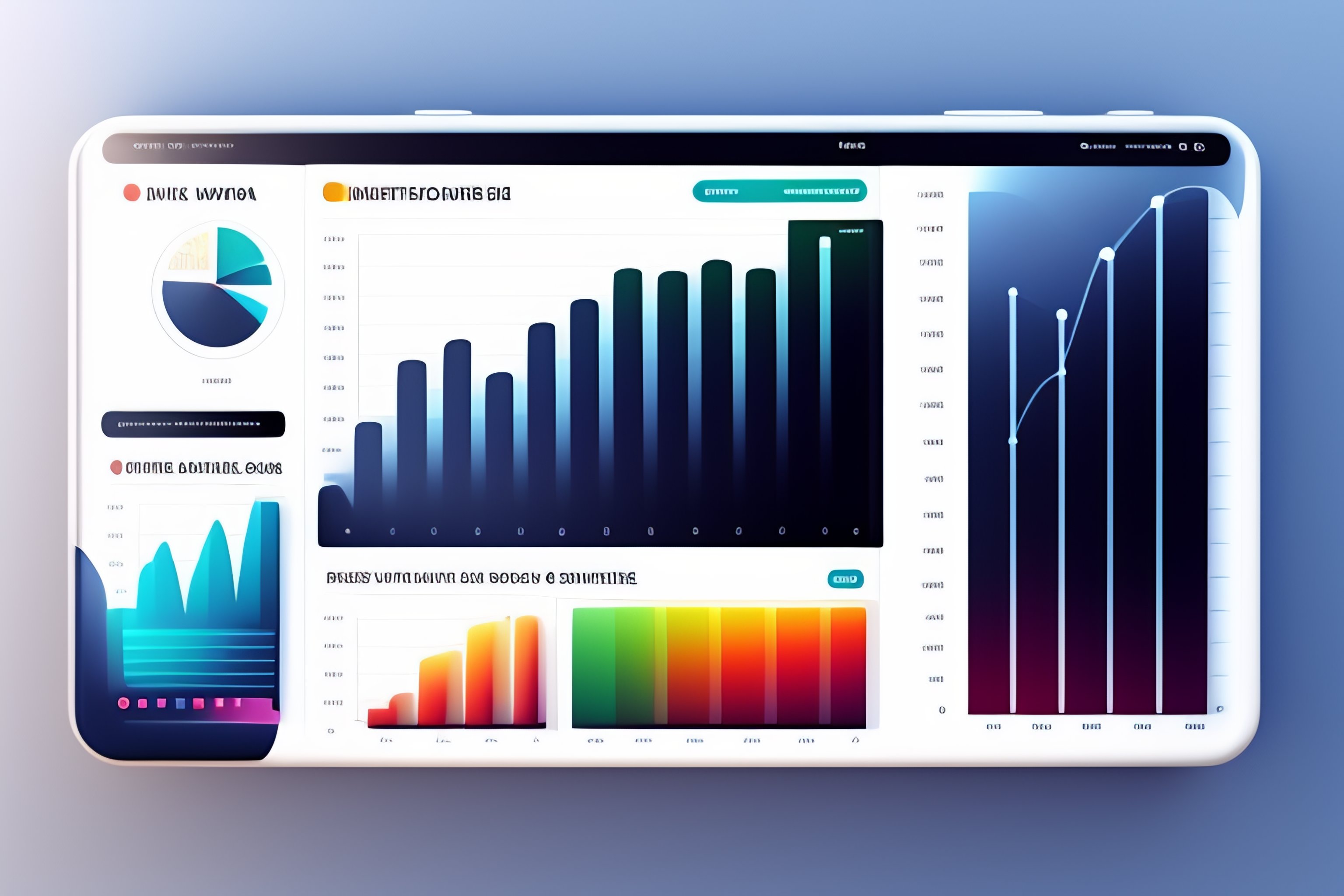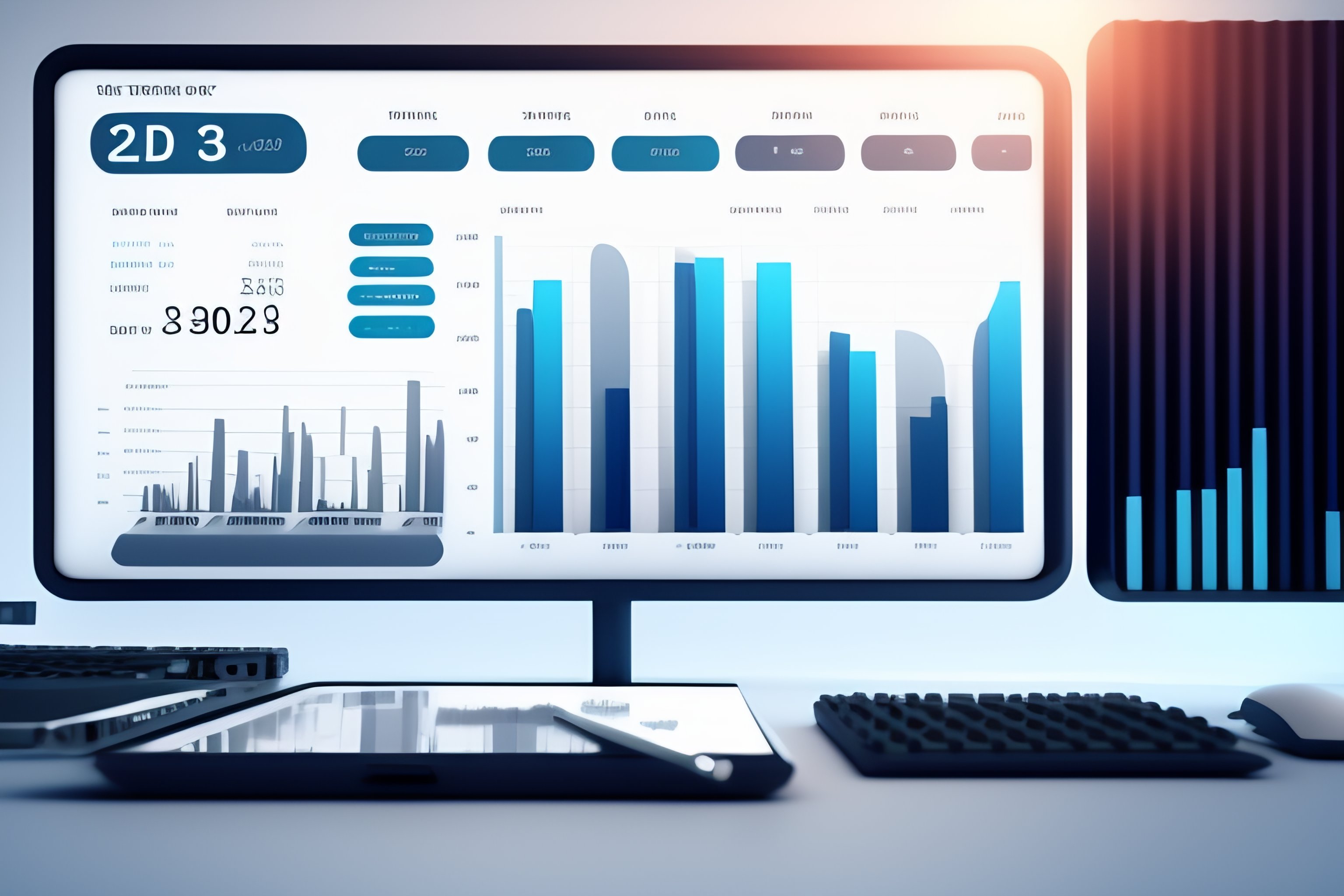 A data dashboard with multiple meters, graphs and charts in a bright white room, 3d illustration in the style of blender