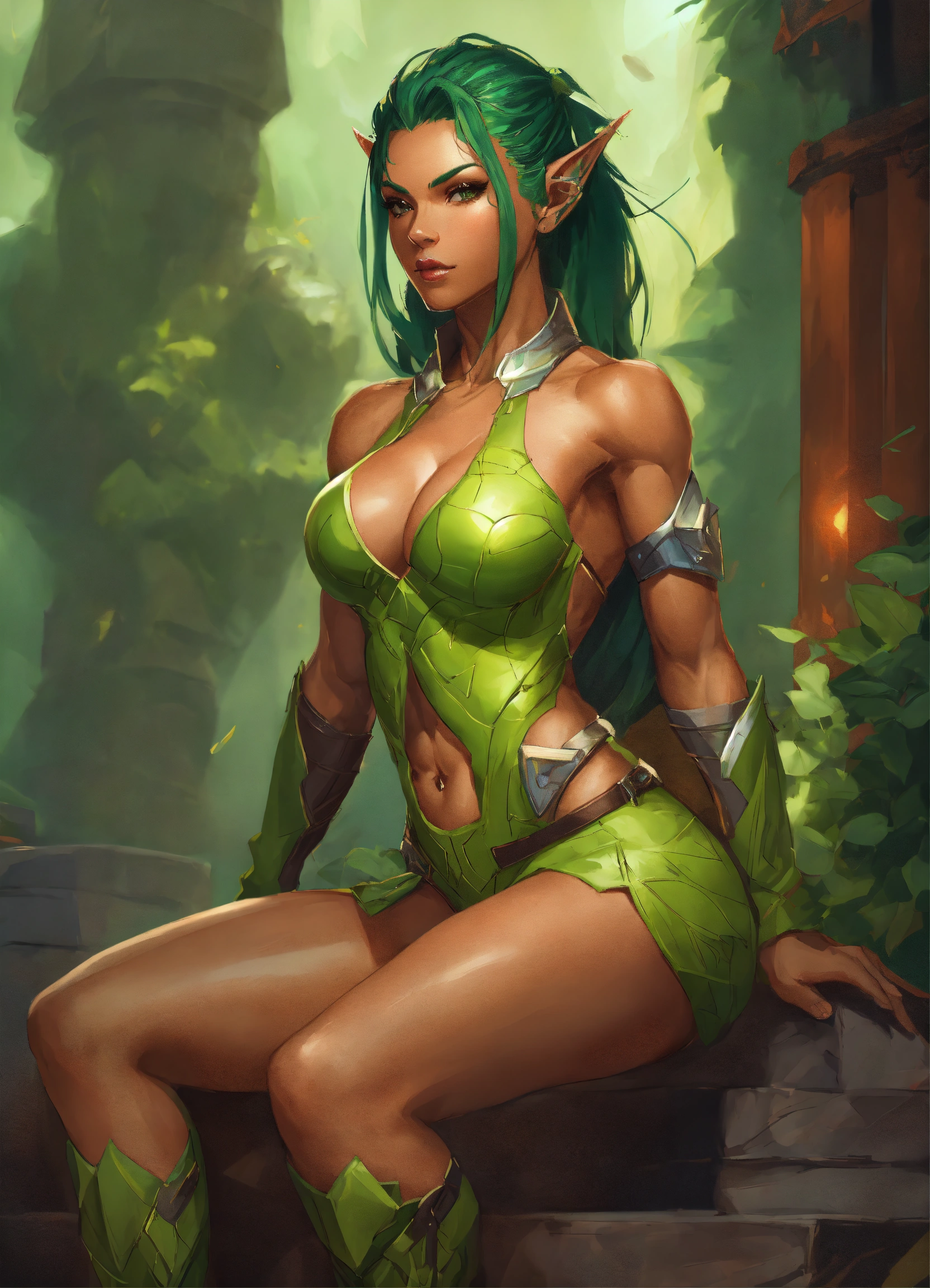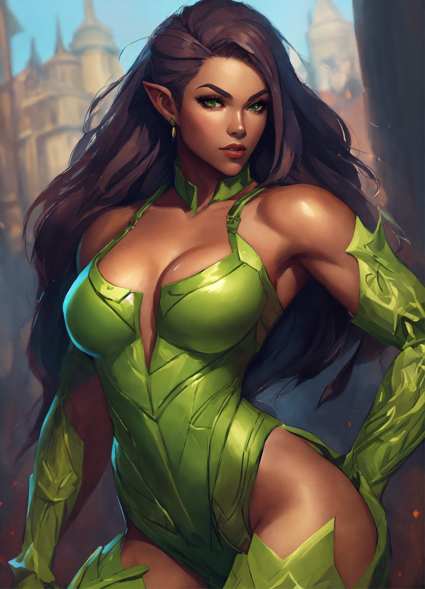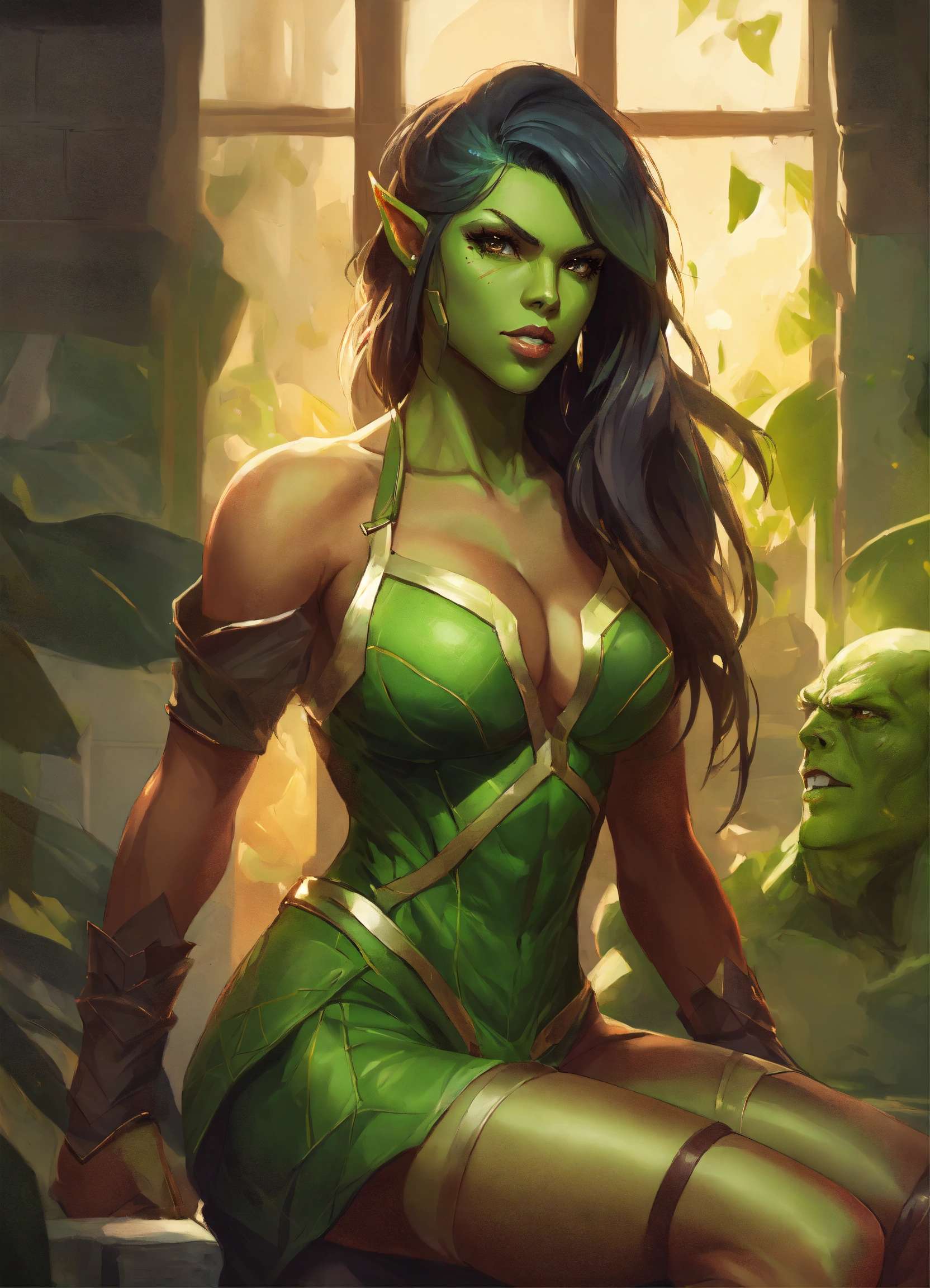 Portrait of a female half orc, dress, legs, green skin, muscles, stunning beautiful artwork, toned body, 8k, maximalist, by artgerm, 8k anime artwork, 8k photo, trending on art station