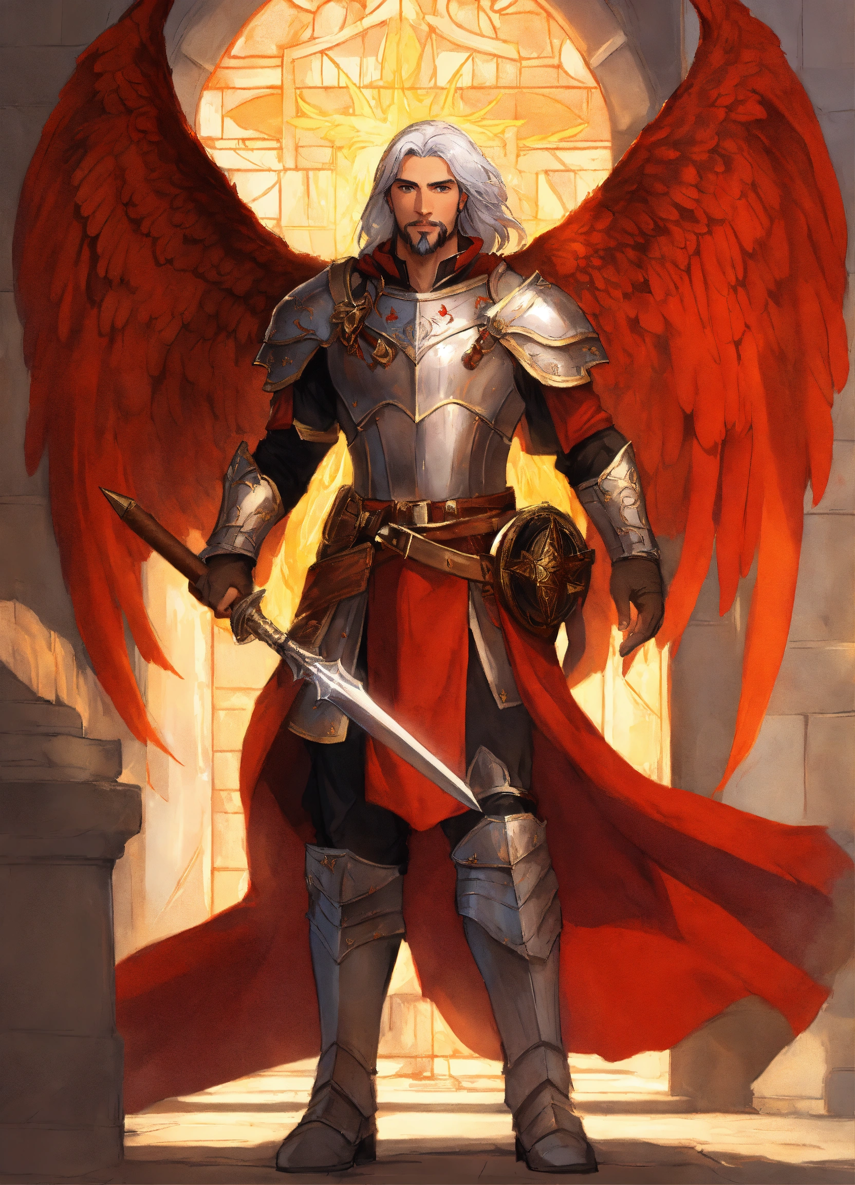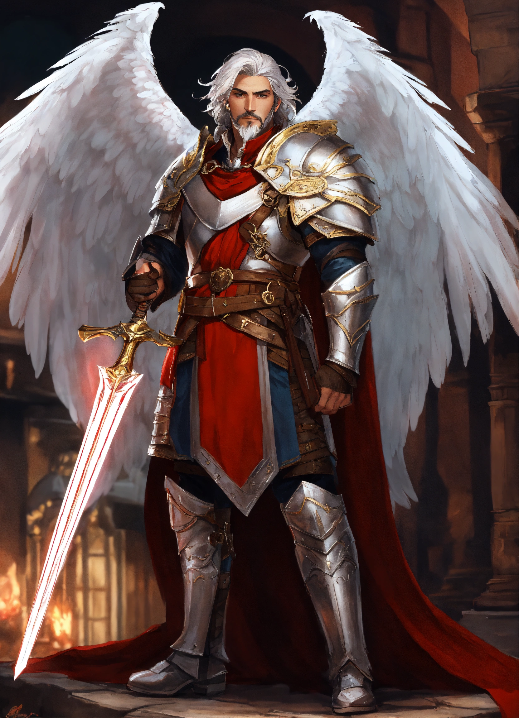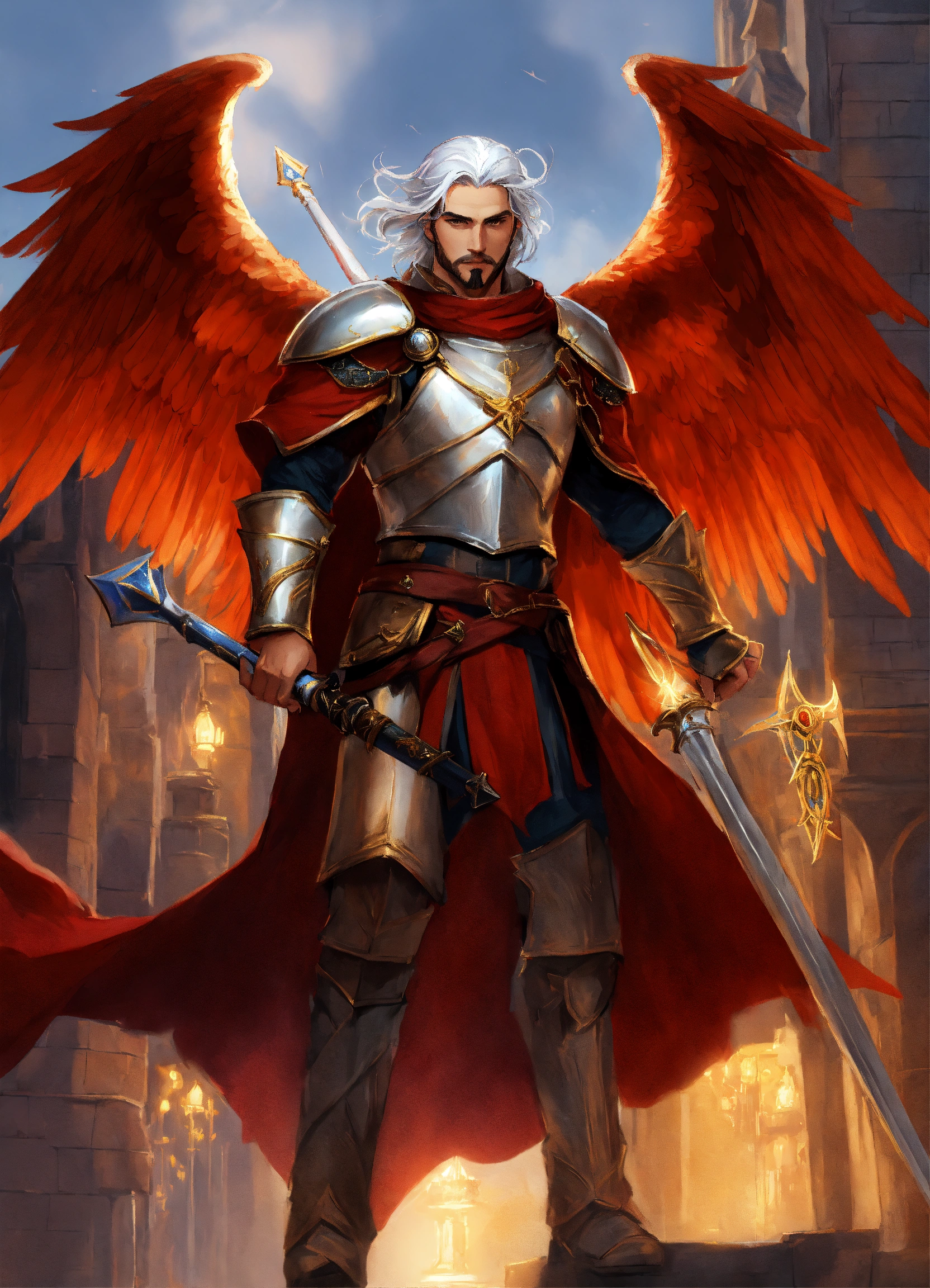 Corvant alvaro from dungeons and dragons, he is an aasimar from dungeons and dragons, has large angel wings, is captain of the guard, in the city of paravar, wielding mystical war staff, wearing the armor of a guard, wearing a red ascot m, had a goatee, has silver hair, has rings on his fingers