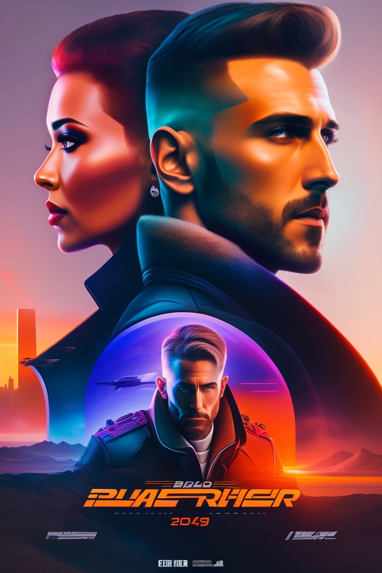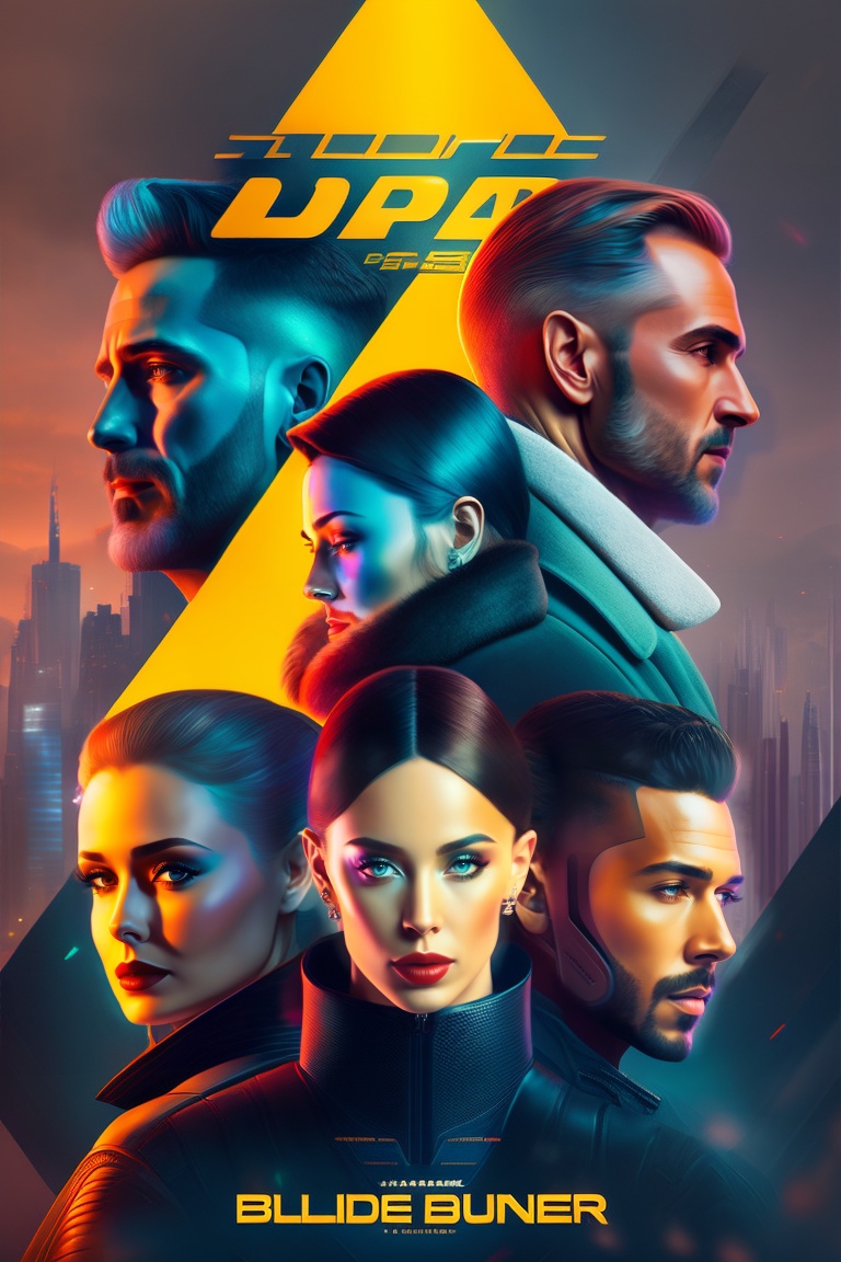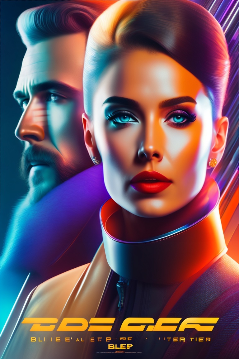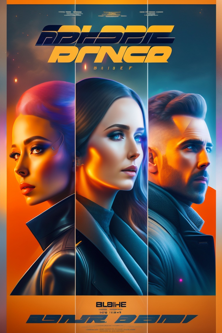 Blade runner 2049 poster design of the film.joi, oficer k, nindar wallec.poster should be added as big text the name of the movie.the characters in the poster are realistic and the same people in the movie, let there be 4 people in the poster