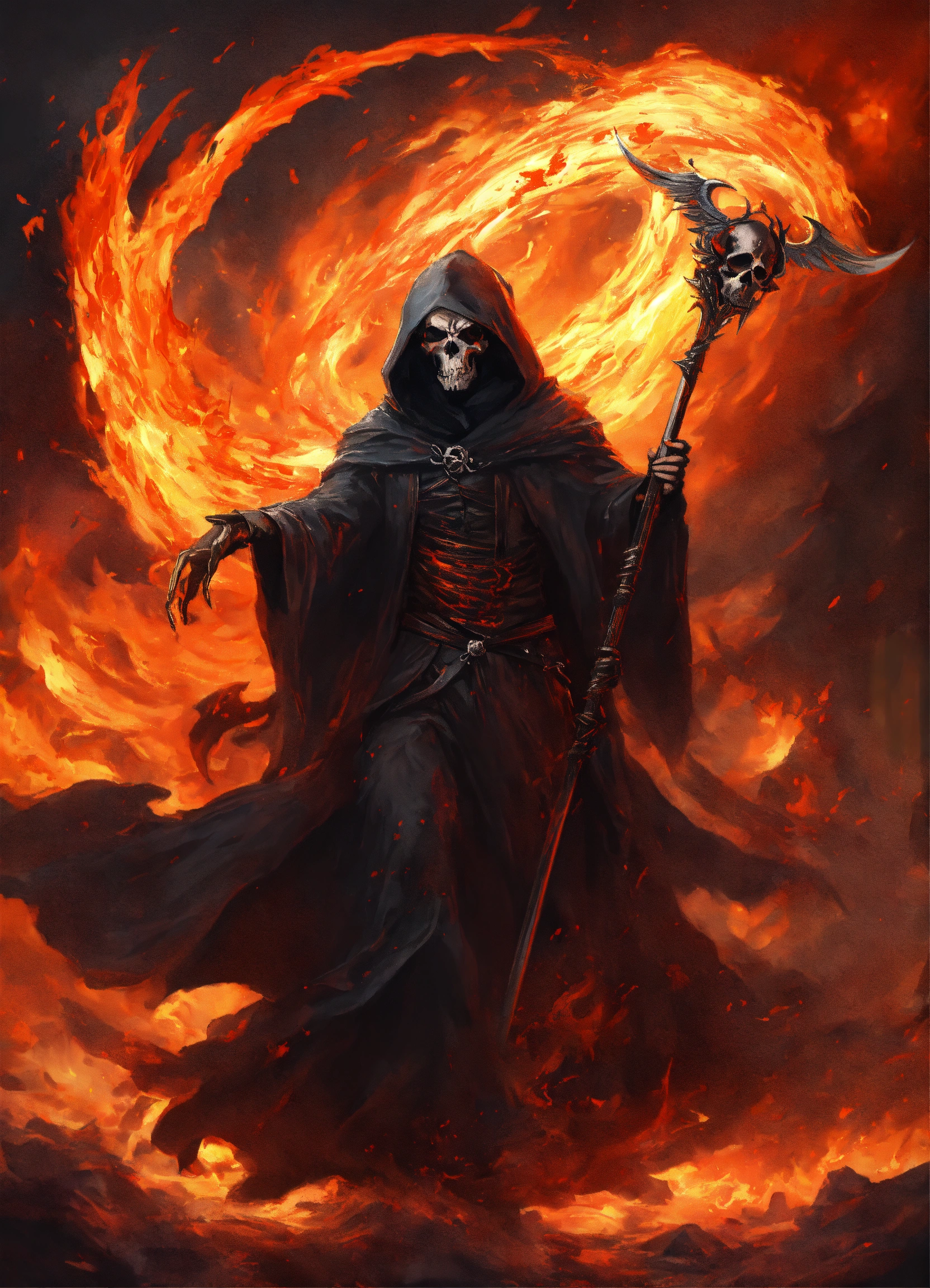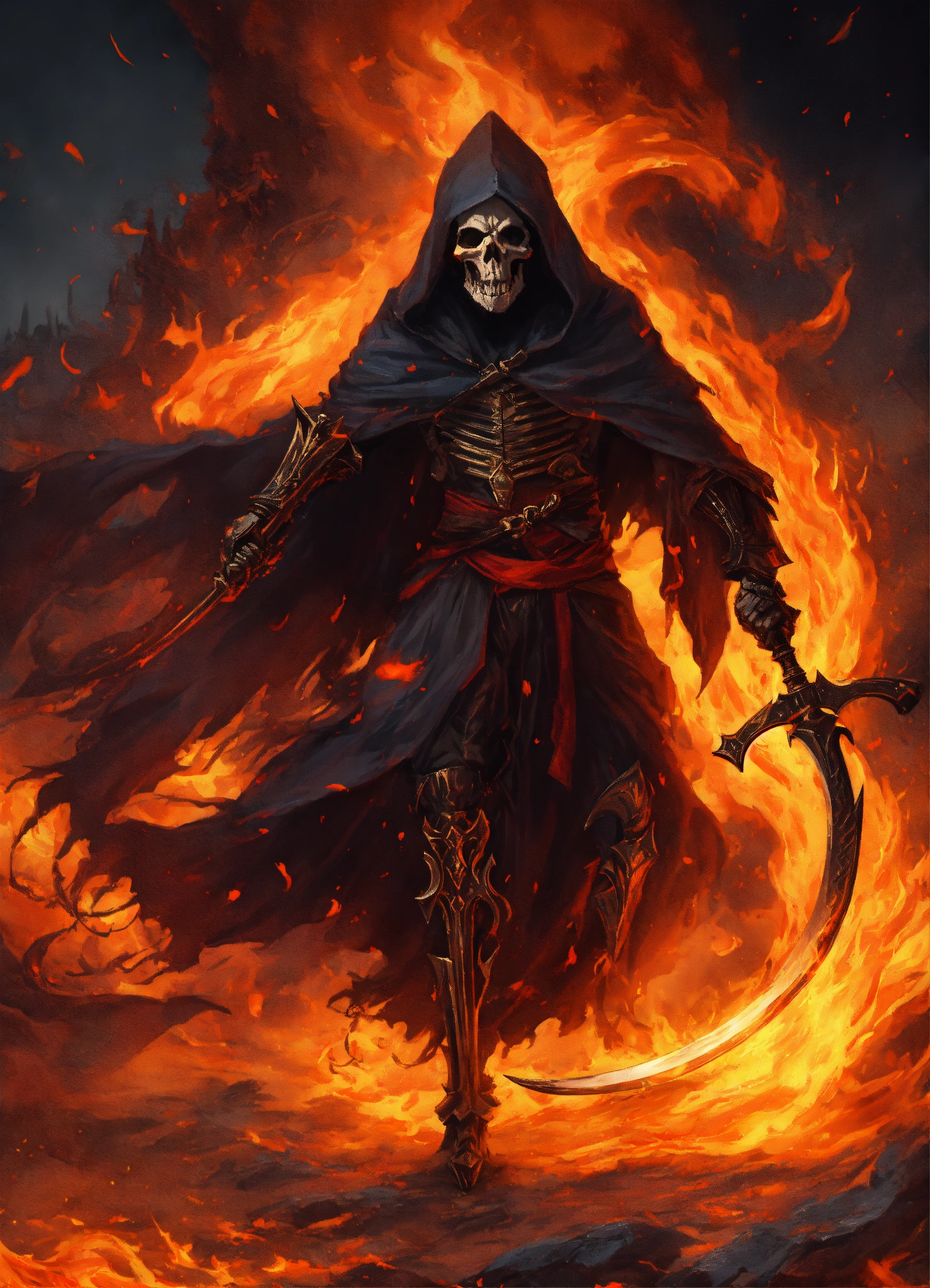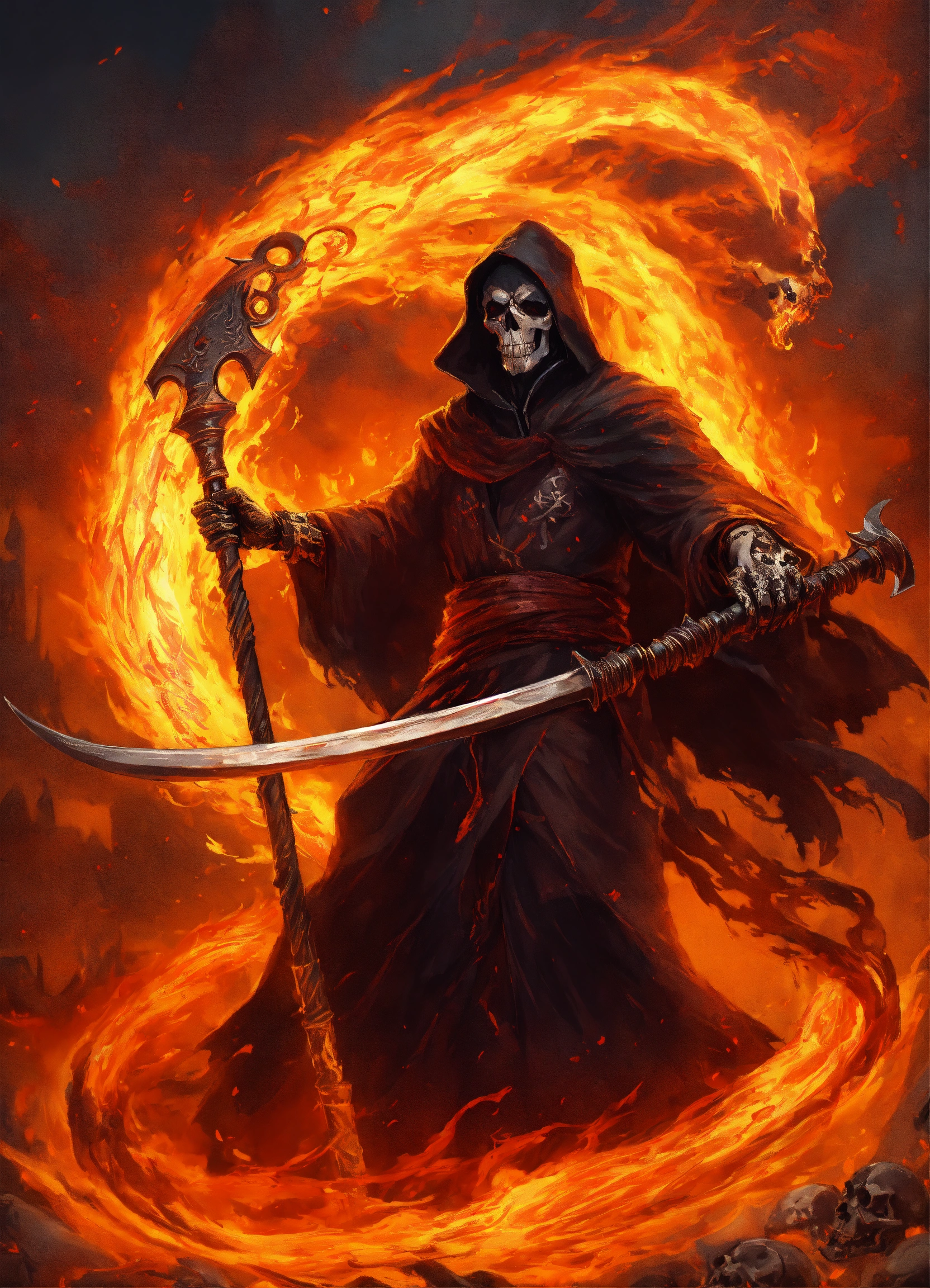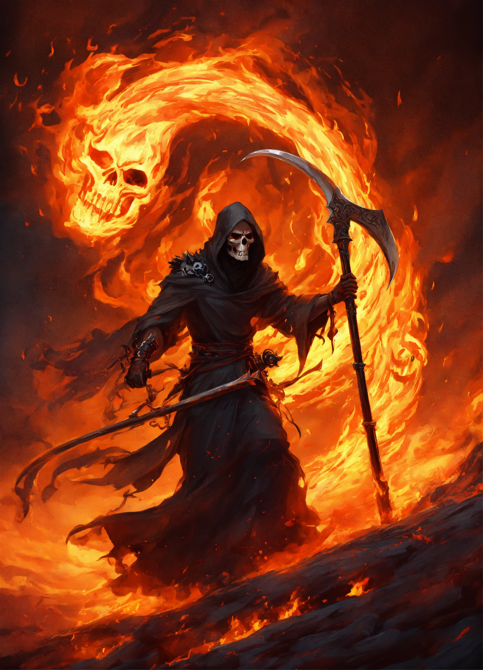 Attacking grim reaper with flaming scythe, tattered flowing robes of fire, surrounded by swirling fire, skulls, 8k, in the style of ashcan school