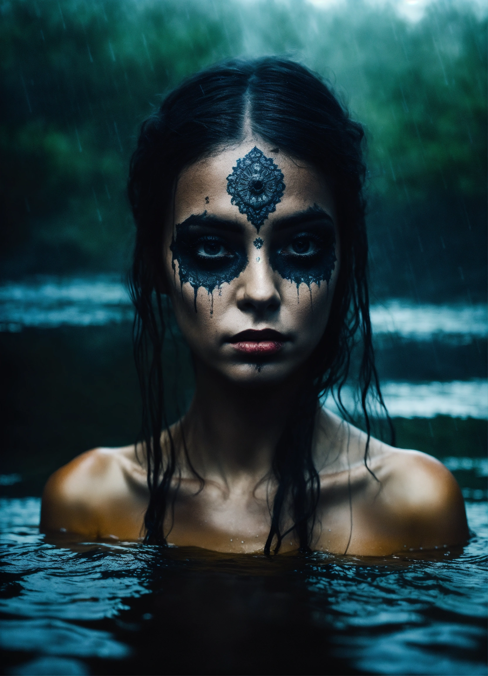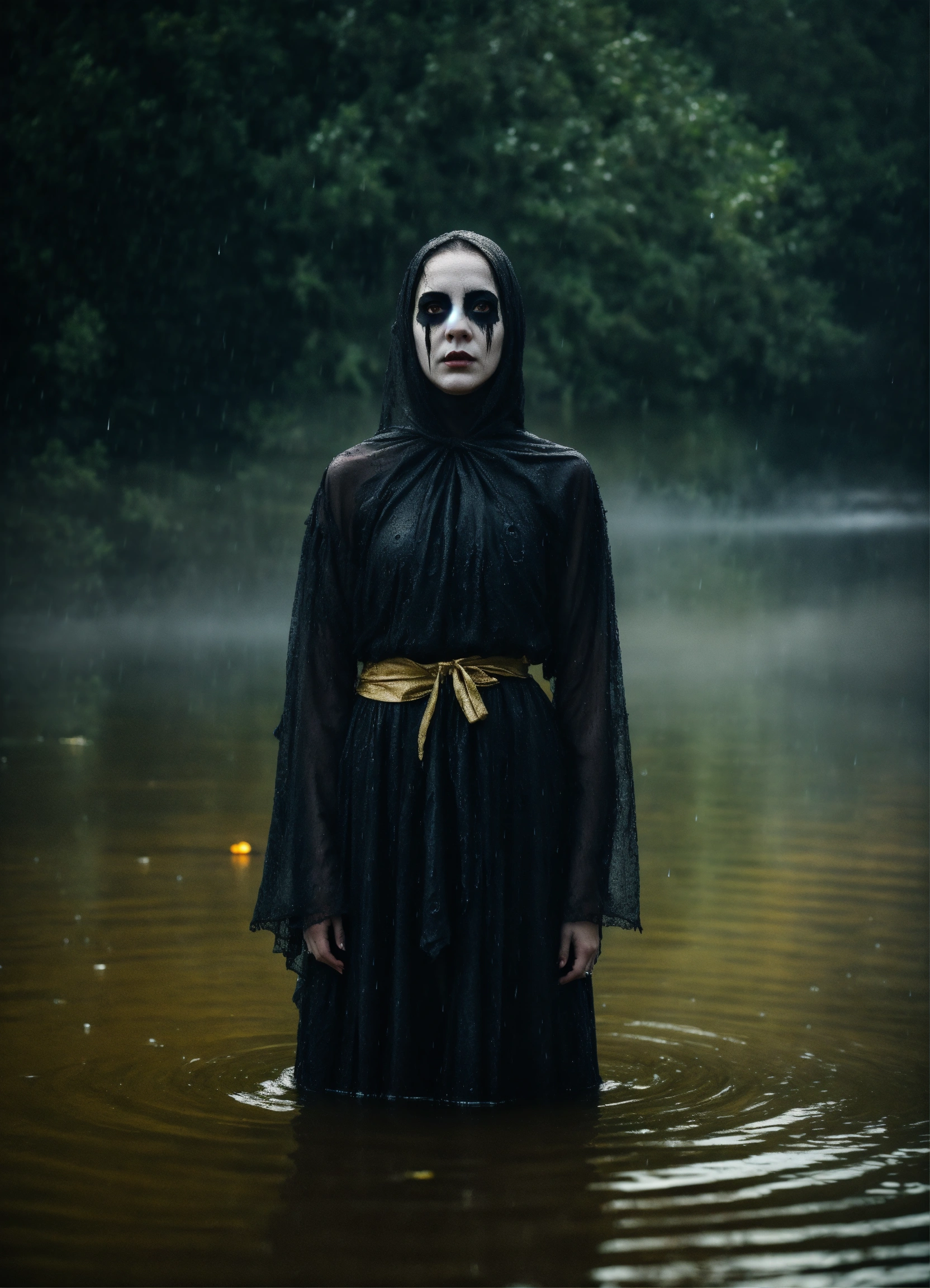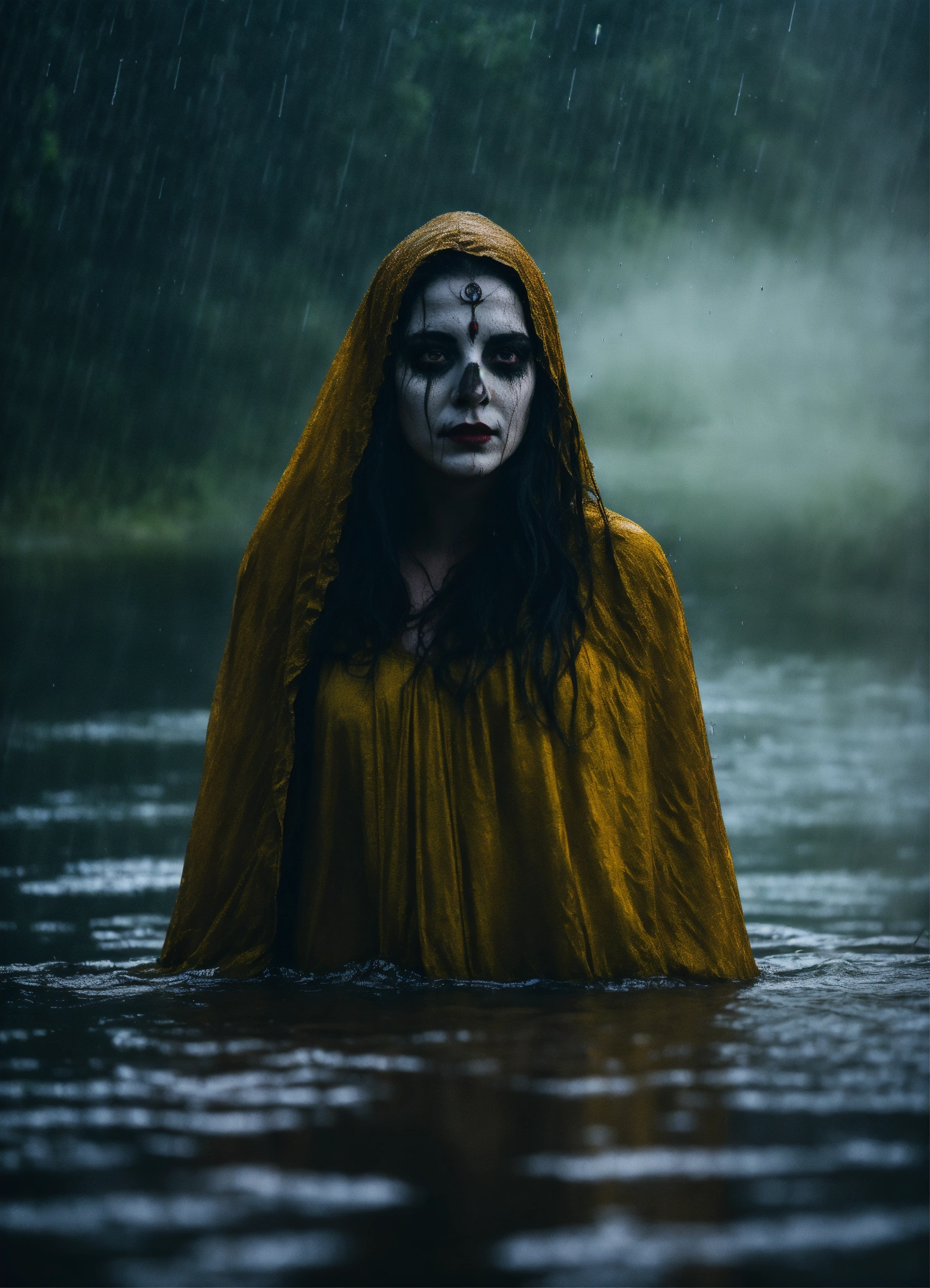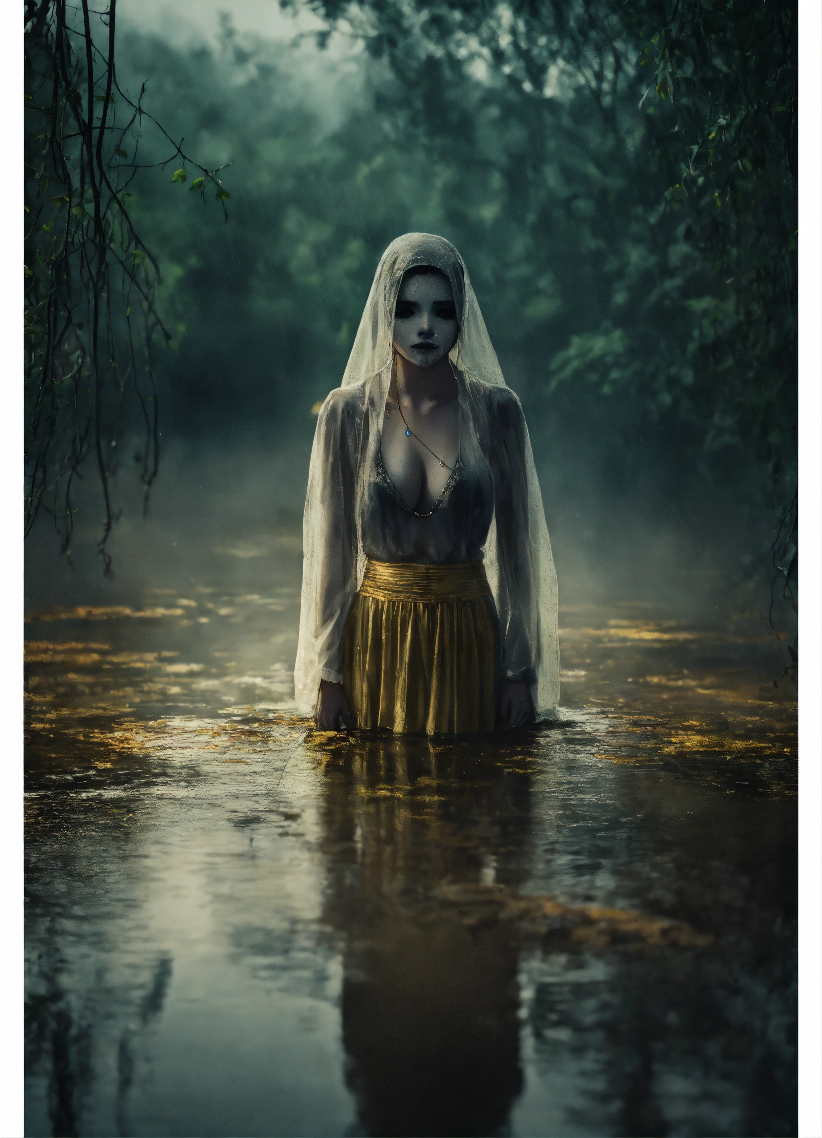 The frightening la yorona with black eyes on her shoulder stands in a dark lake