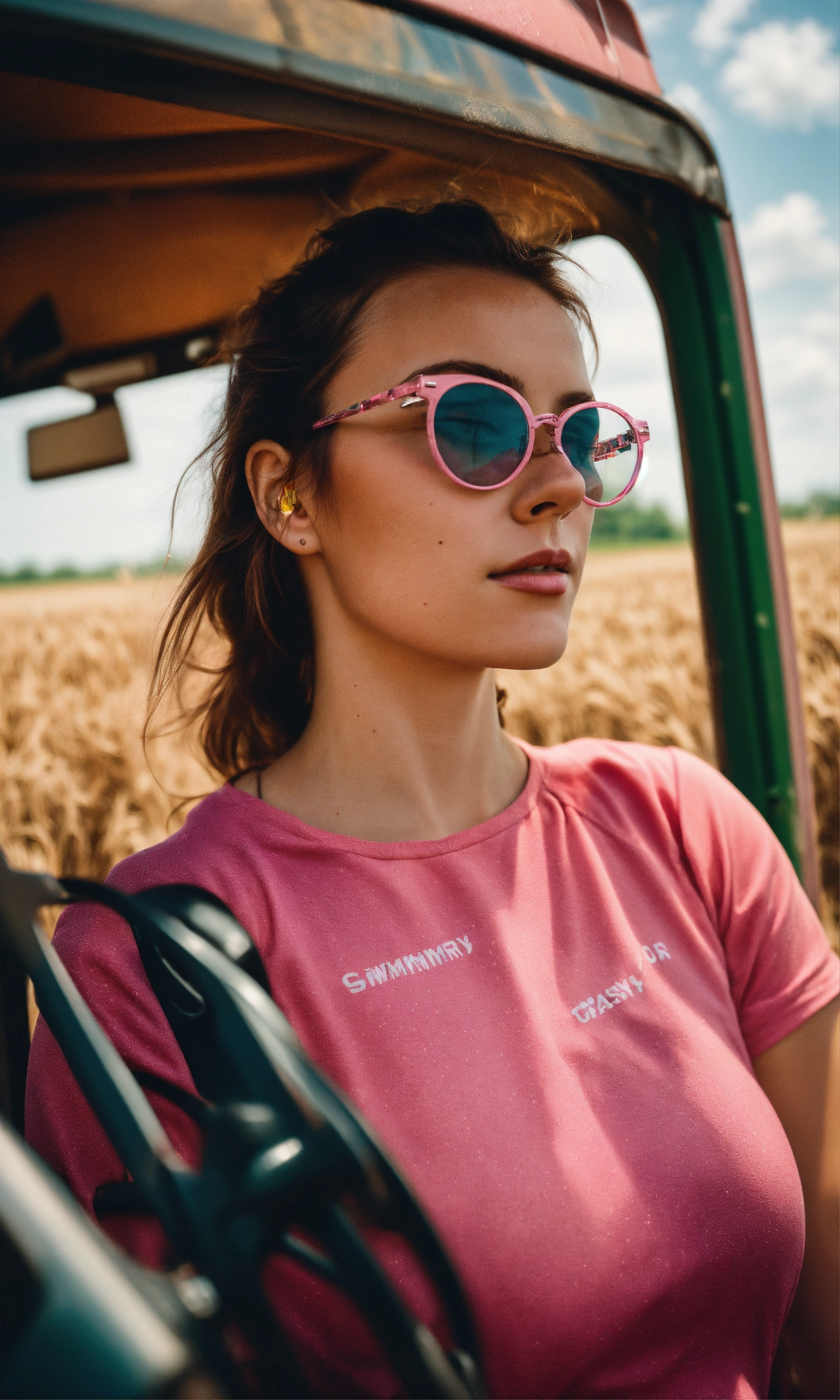 25 years old lady in a pink swimming suit and round glasses driving a truck full of grain from the field to grain store over dusty ukranian roads