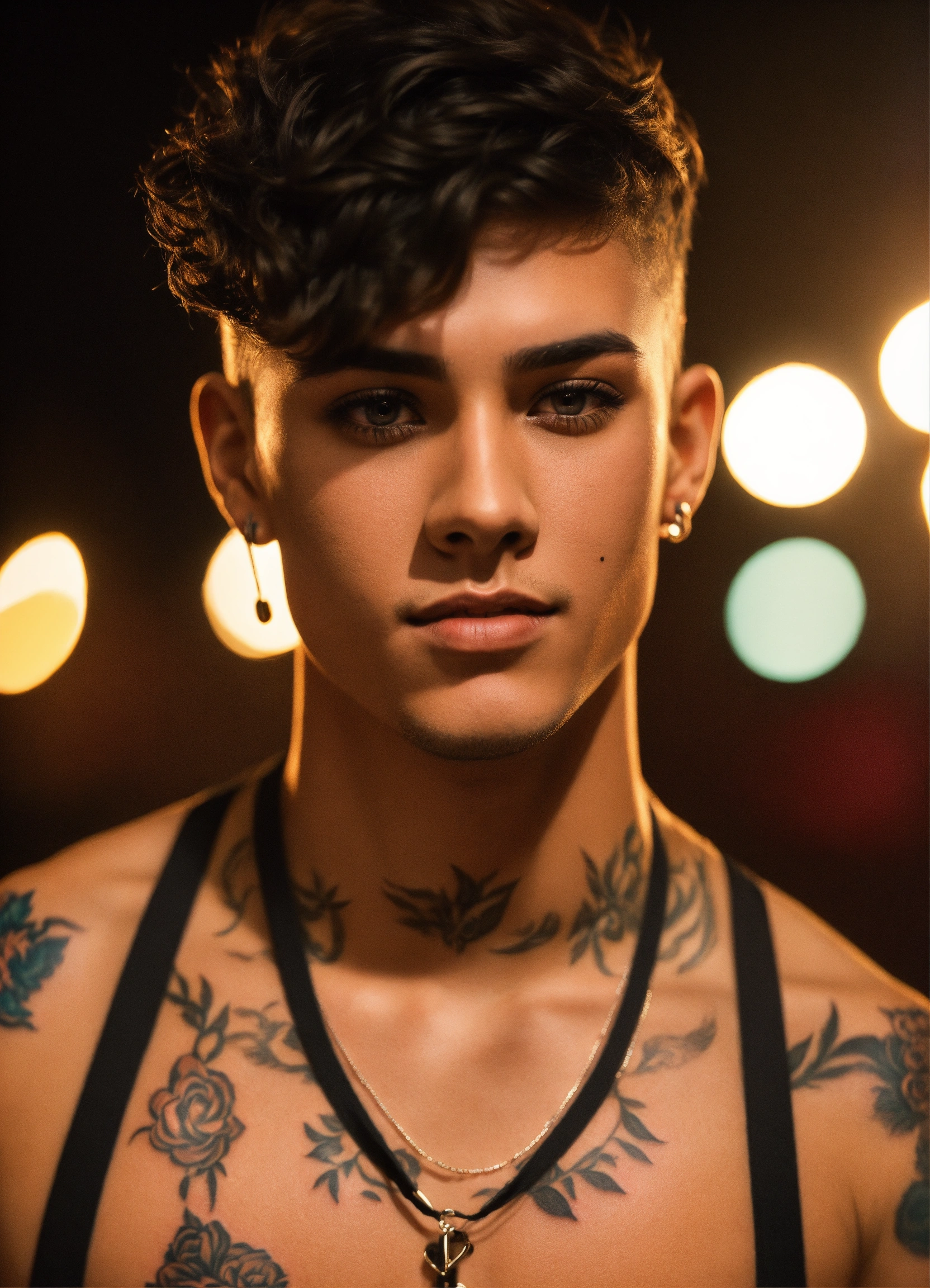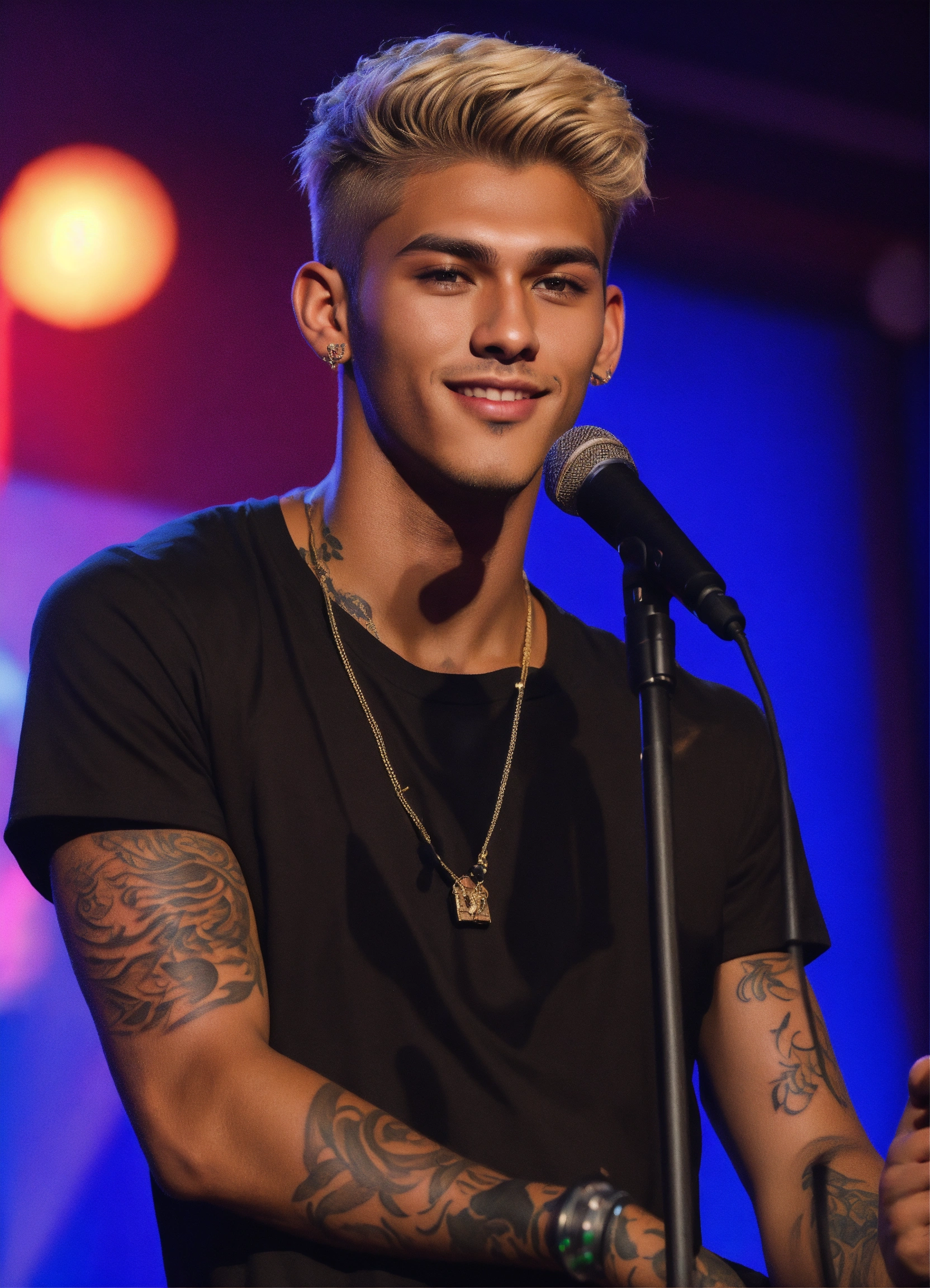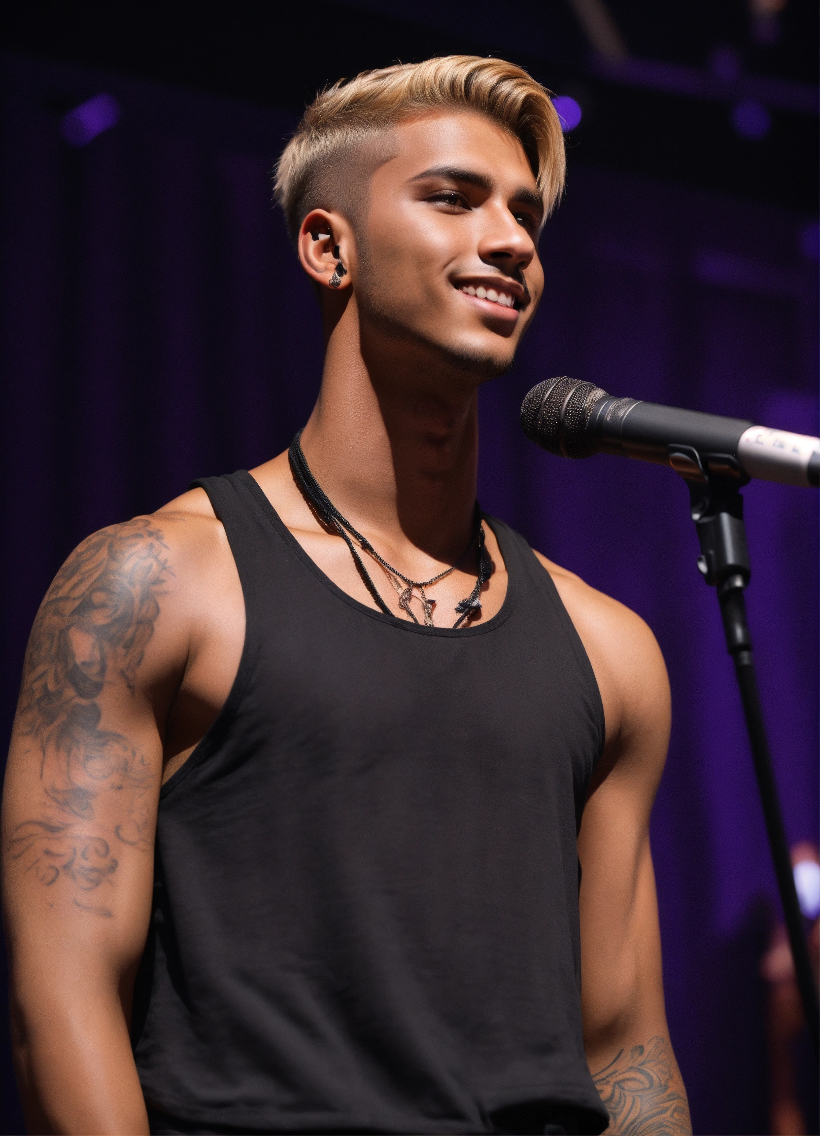Young 24 year old man, lightly tanned skin, brown eyes, black makeup on eyes, very short blond hair, tattoos, black crop top, smirking, microphone in hand, onstage, long nose, thin lips, realistic
