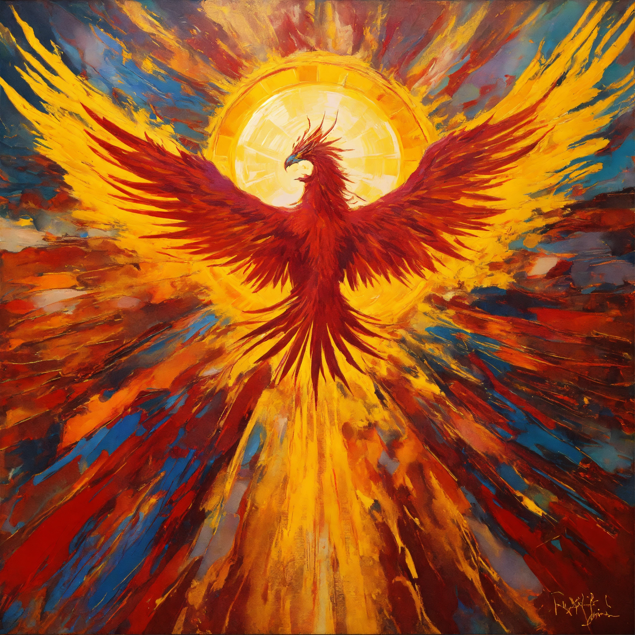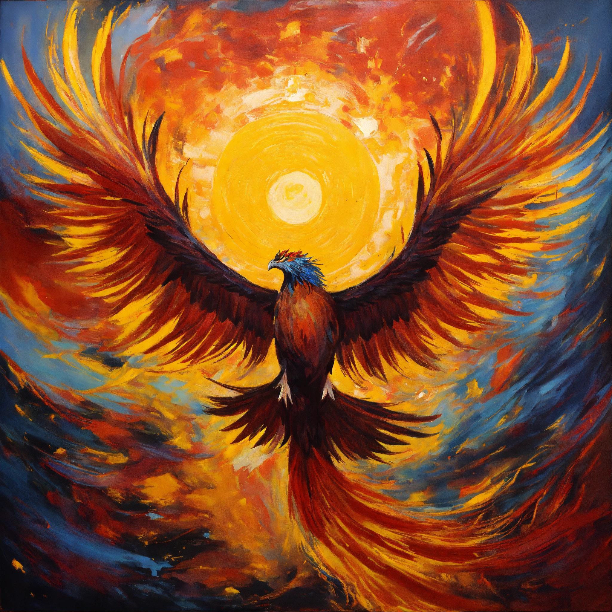A neo expressionist painting ofa phoenix rising from the ashes, its wings wrapped around the sun. • meaning symbolizing the intense transformation and rebirth of one’s identity through the challenging aspect of pluto square sun.