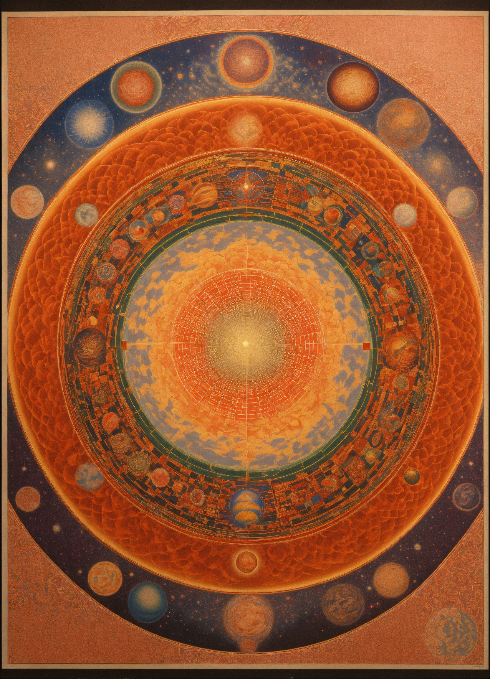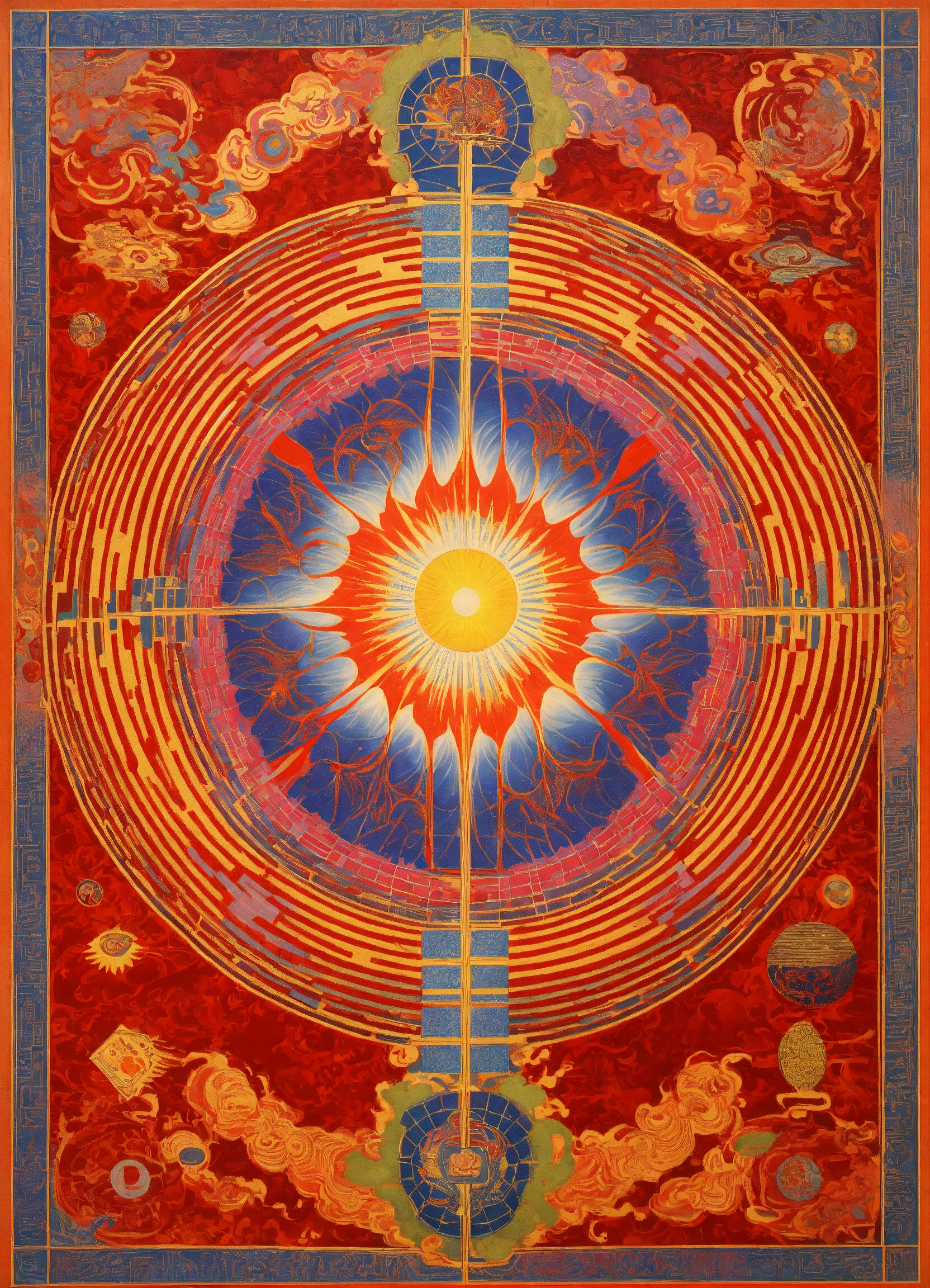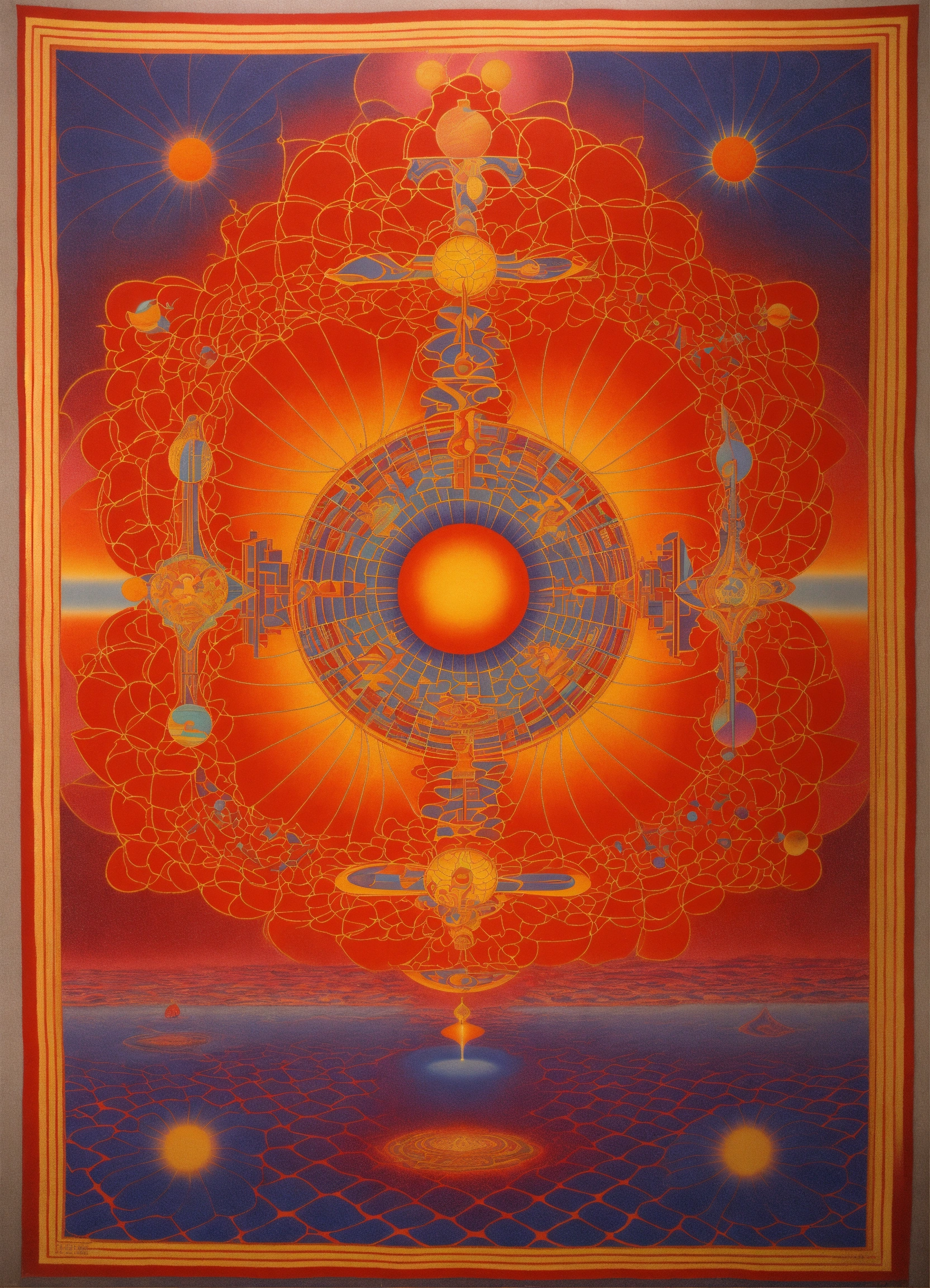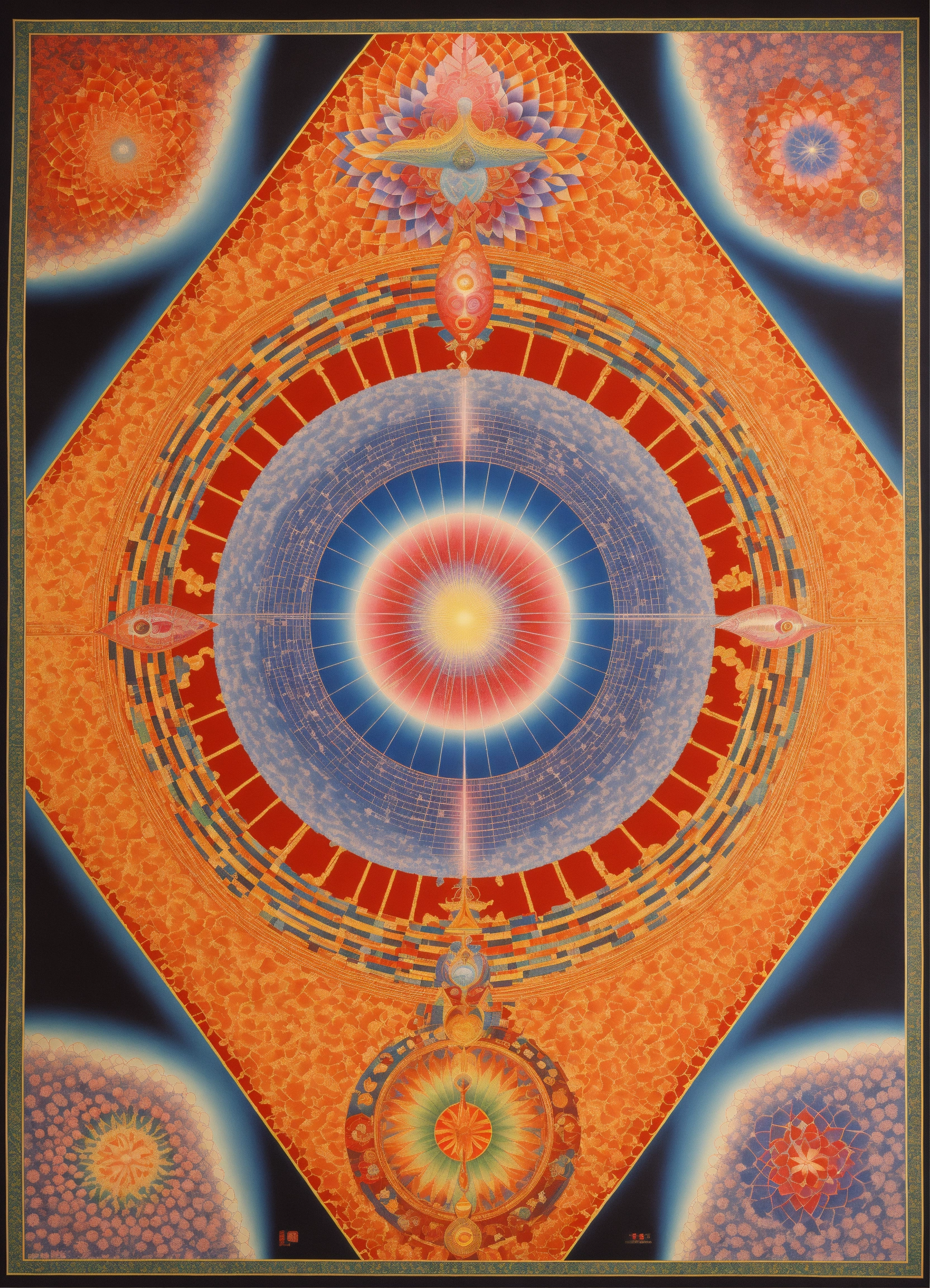 Japanese vintage poster, oriental, psychedeli, the four corners of the cosmos, checkerboard patterns, by alex grey