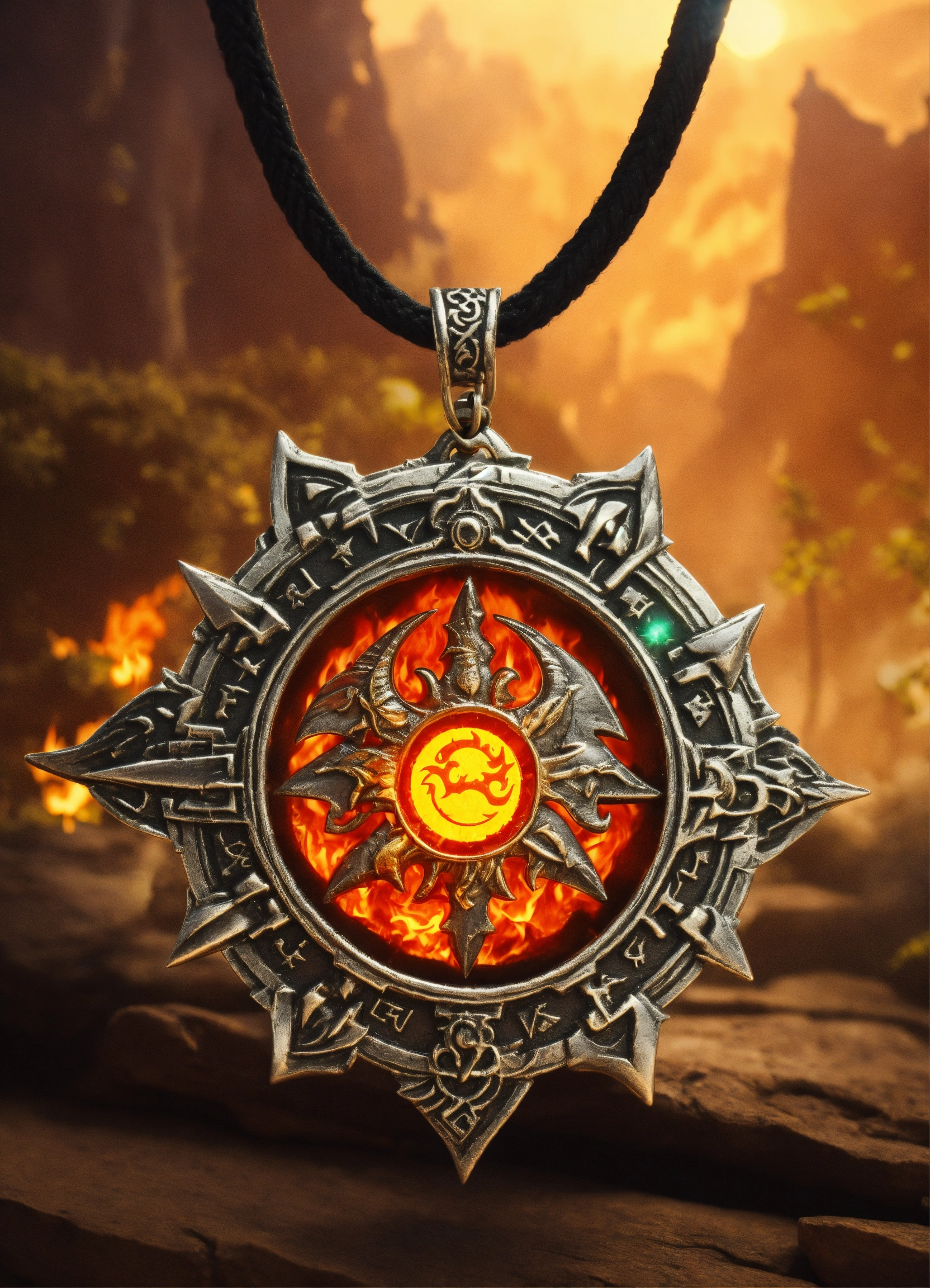 World of warcraft deathwing dragon on an amulet with a sun on it, medallion, high quality, runic, fire, sun, medallion