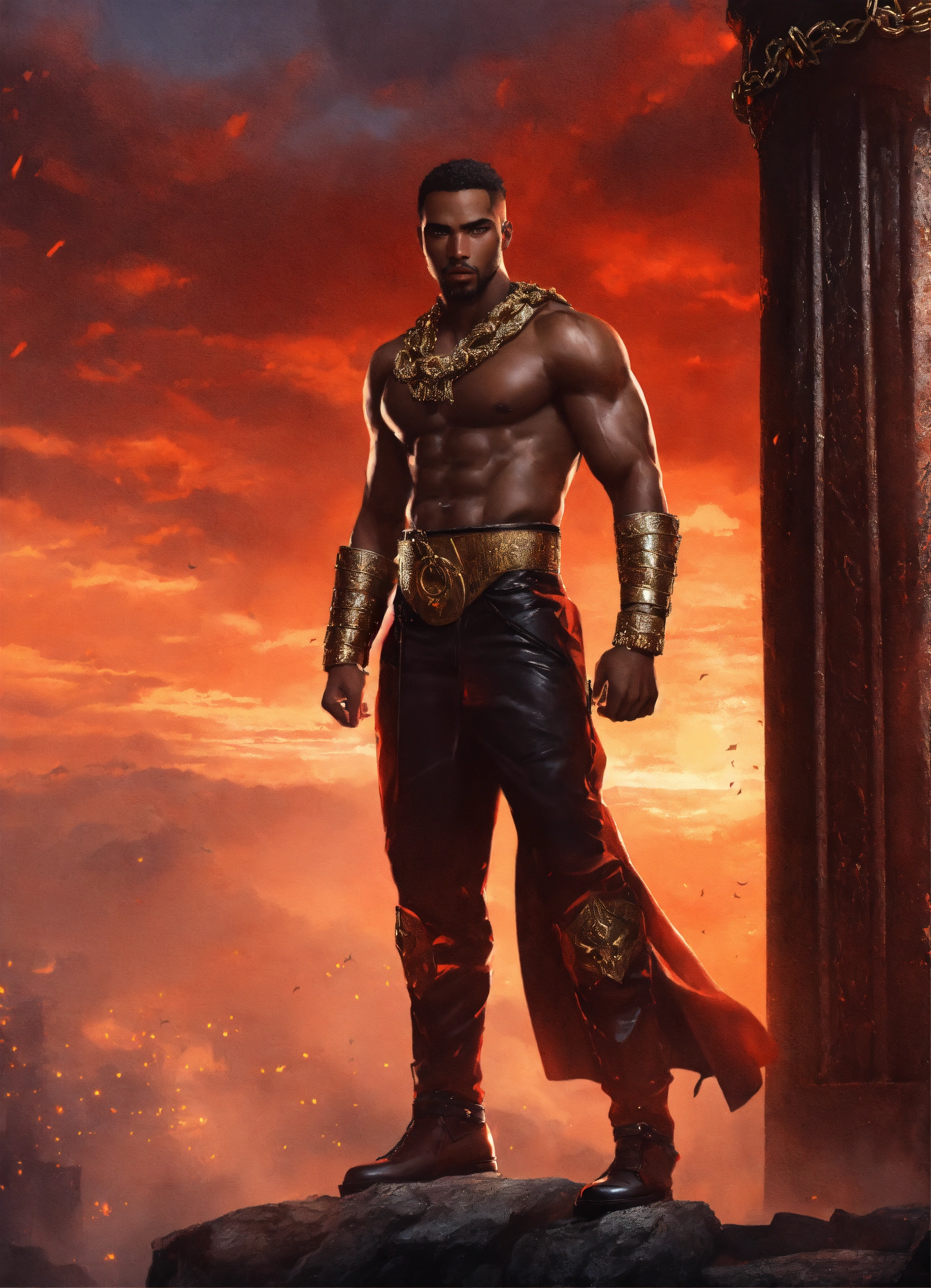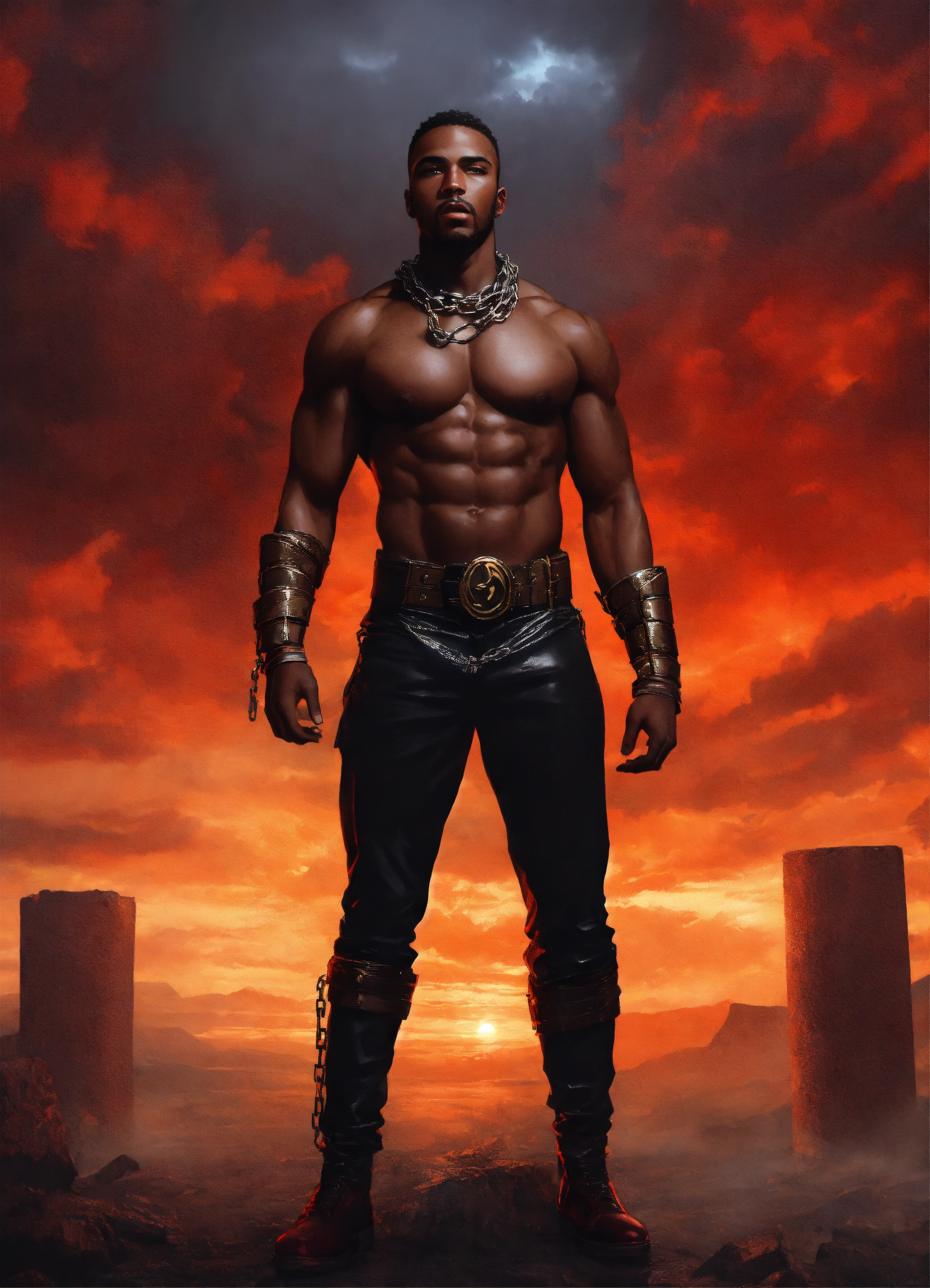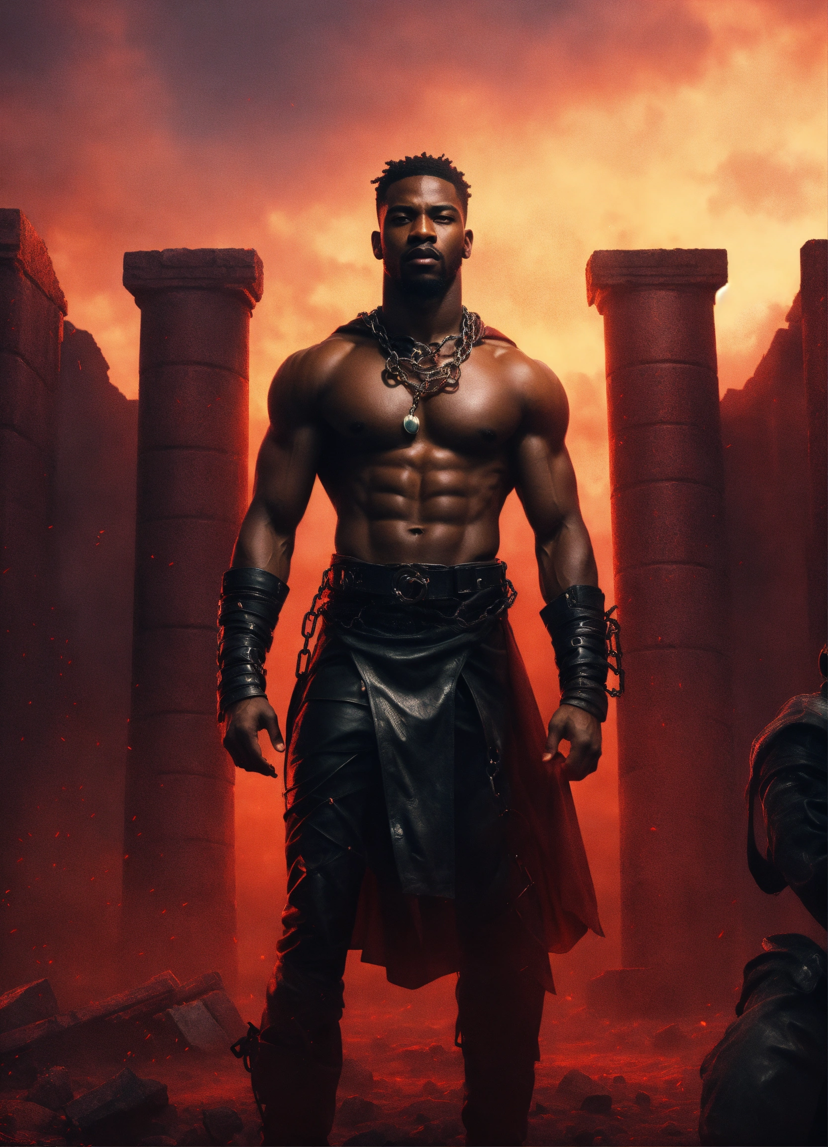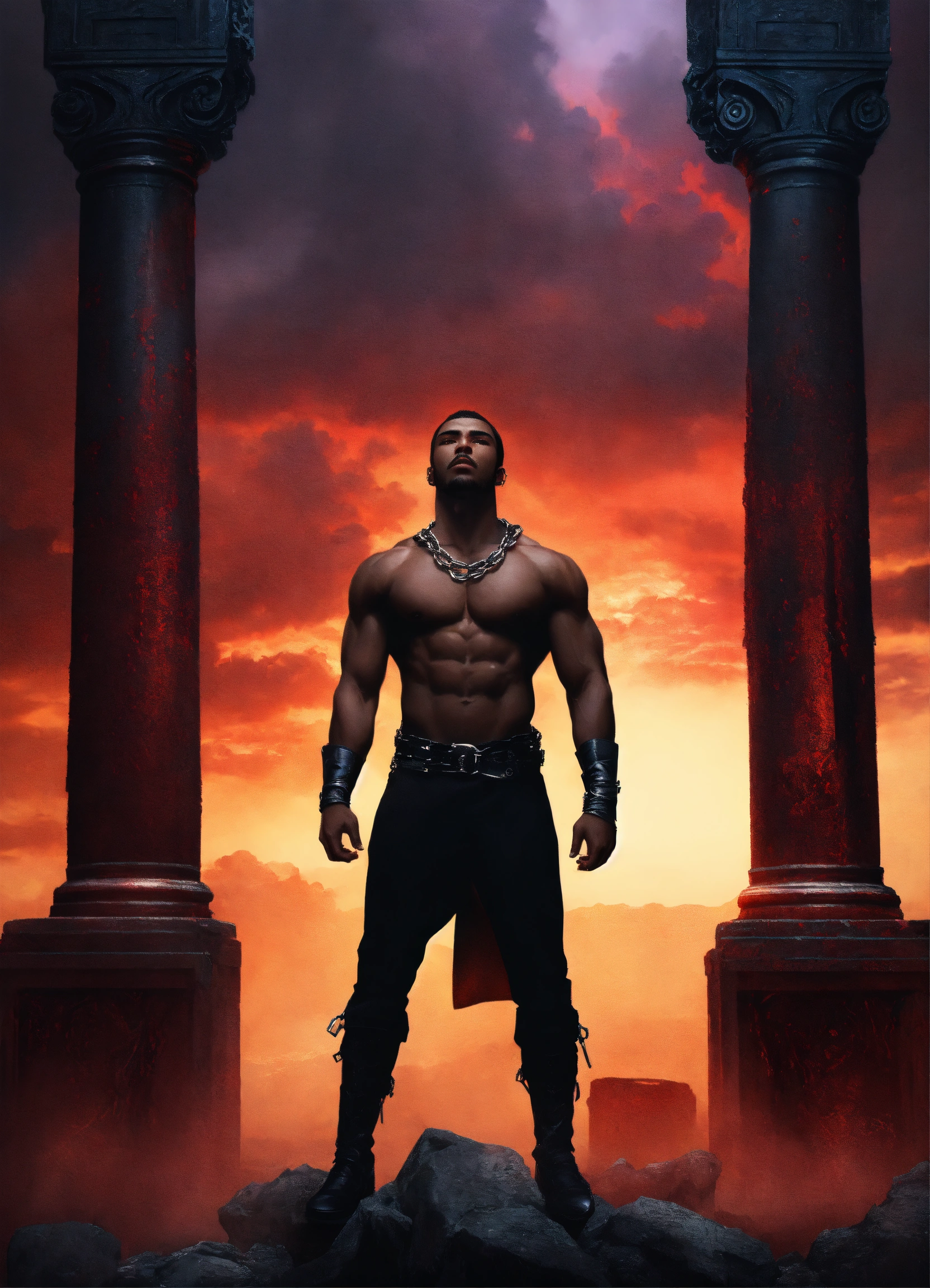 Young strong handsome african god prisoner, captive bound god, front facing strong handsome god short hair wearing a black leather super hero suit, muscular dark skinned black male god prisoner, arms chained, long short hair handsome male god chained to the pillars arms outstretched, front facing, with ruins and a violent red sky behind him and monster guards in the mist watching him, fantasy, high detail, realistic photo, high detail, digital painting, cinematic, stunning, hyper-realistic, sharp focus, high resolution 8k, insanely detailed