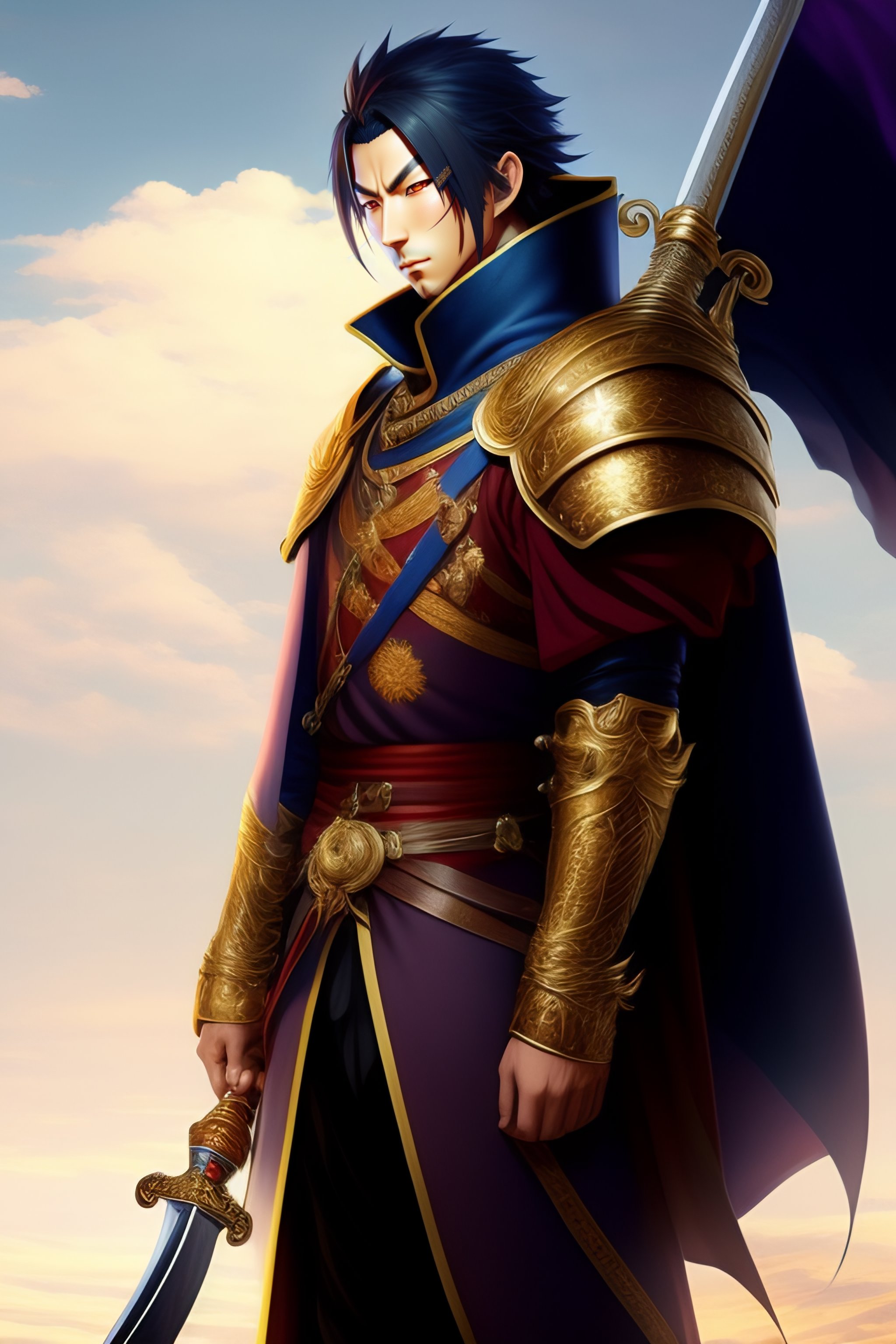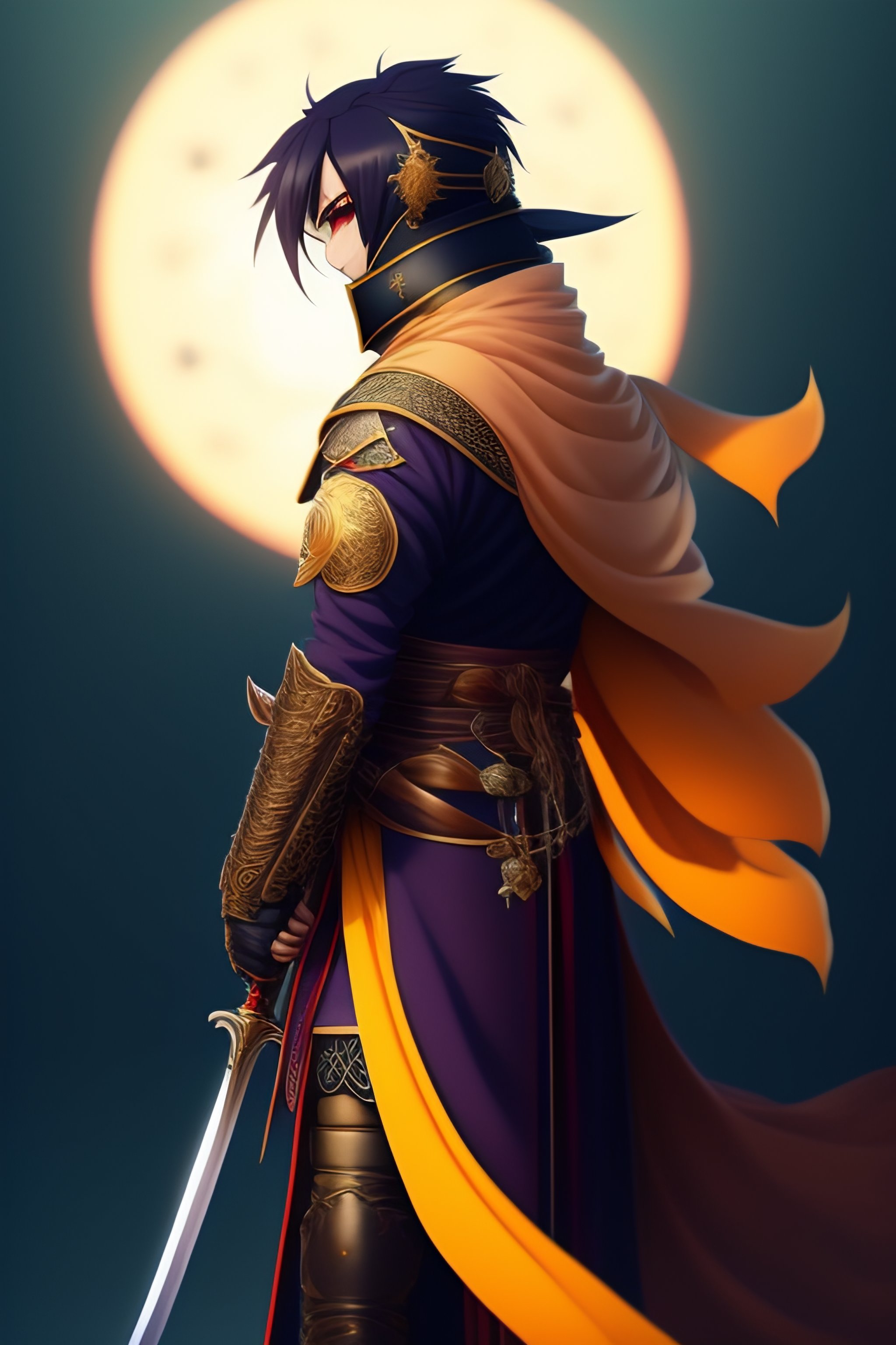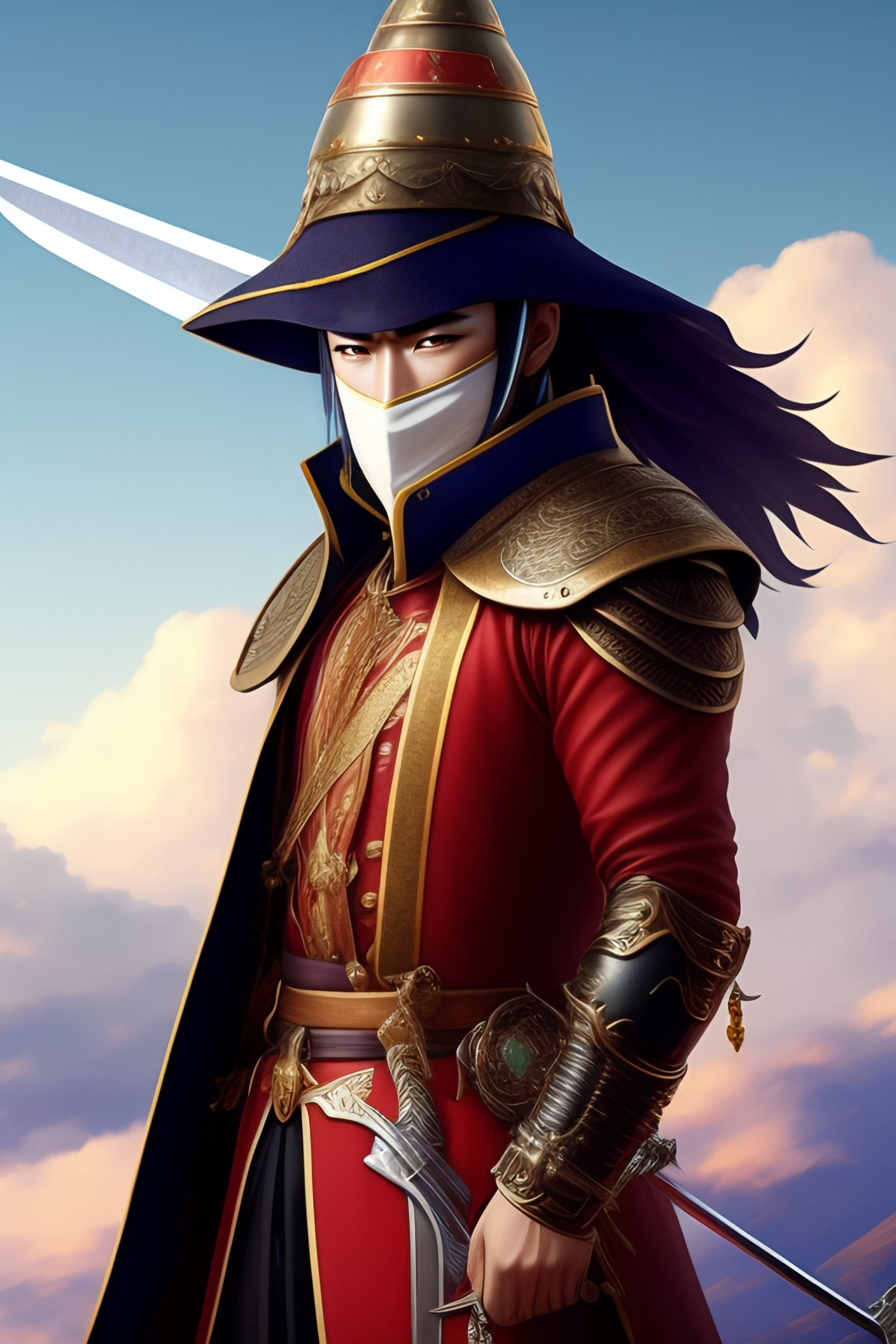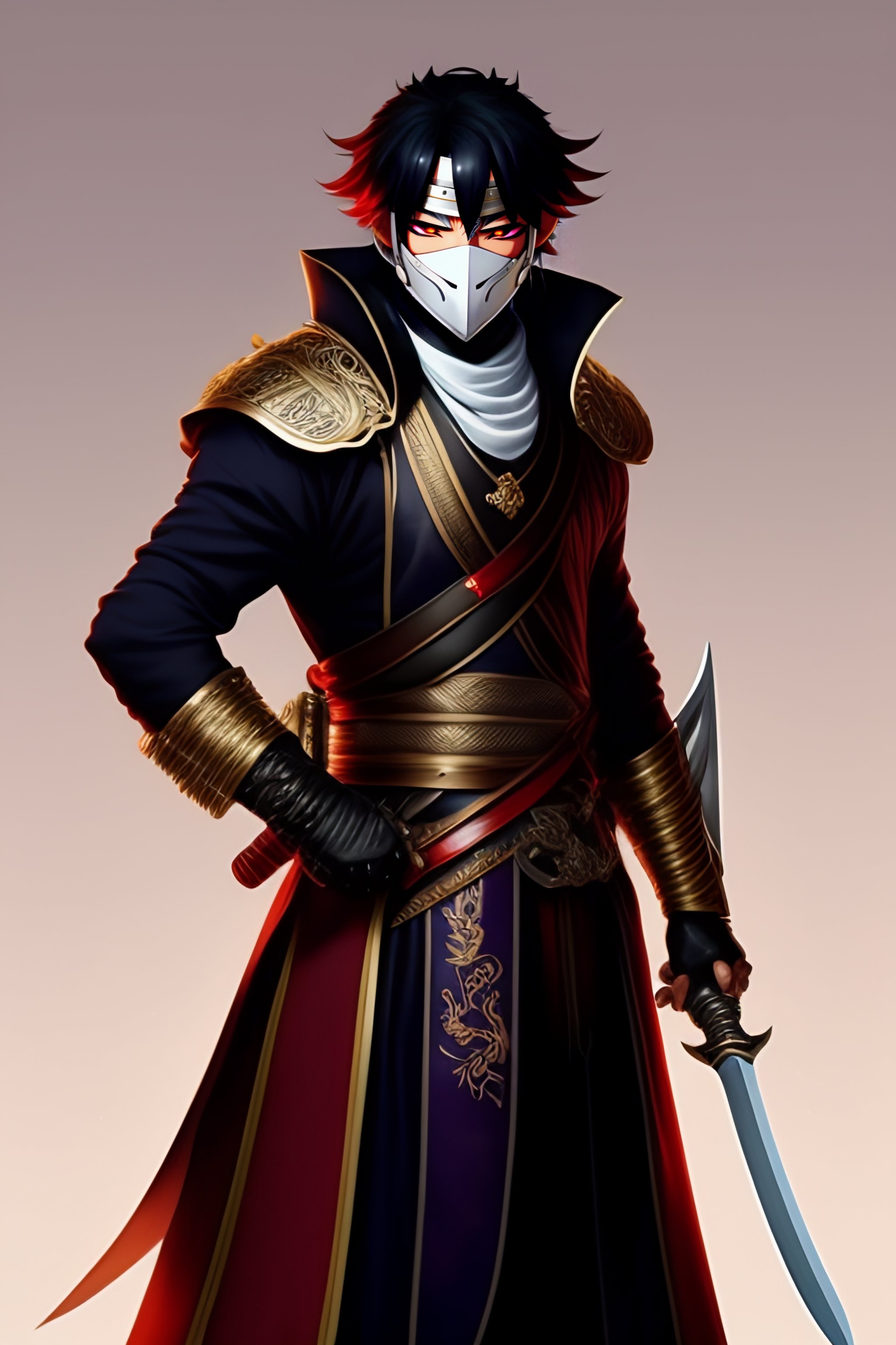 An anime character wearing peasant clothes with a futuristic sword in the scabbard on his back, he has a mask covering half his face and wearing a futuristic monocle