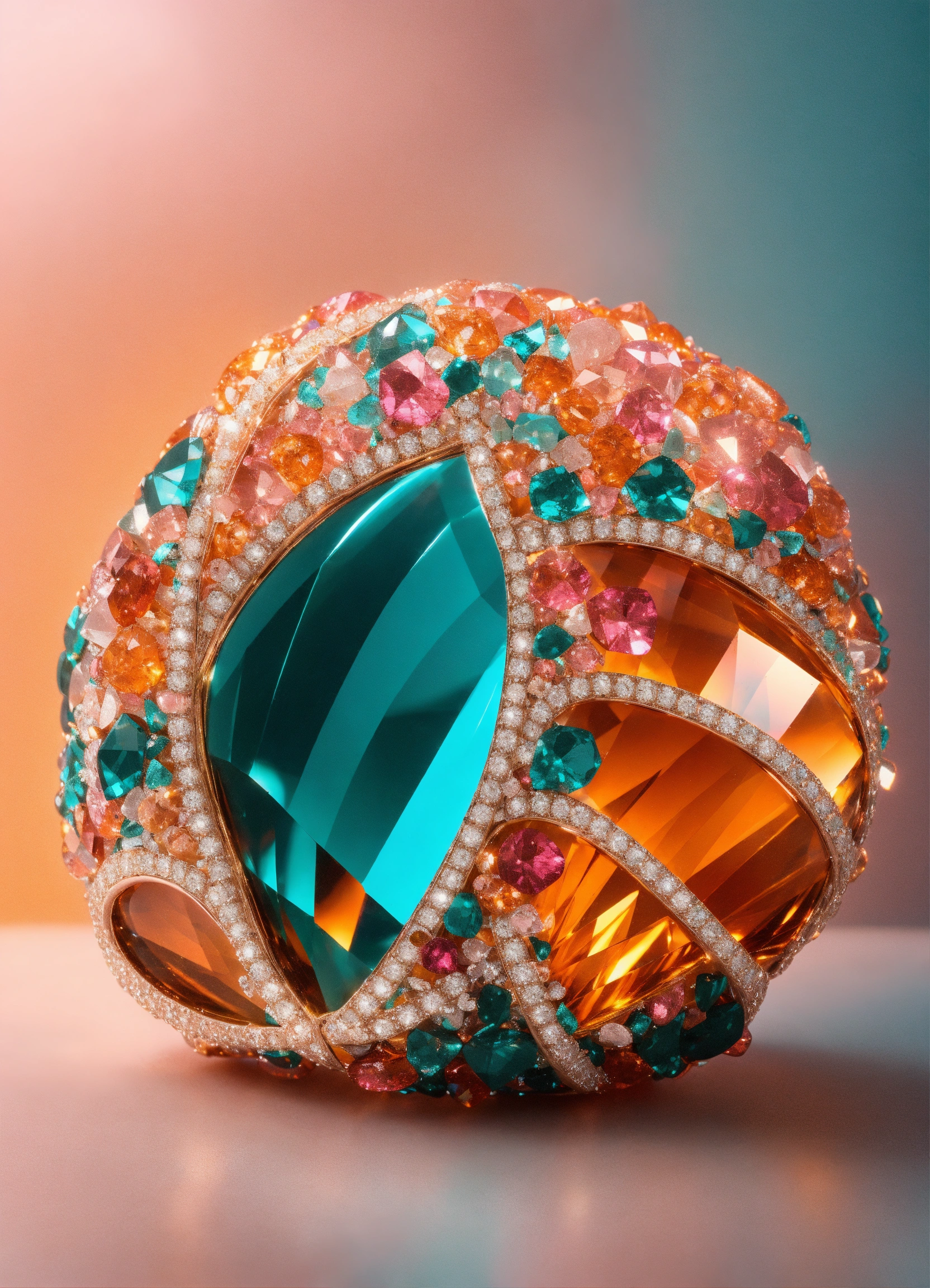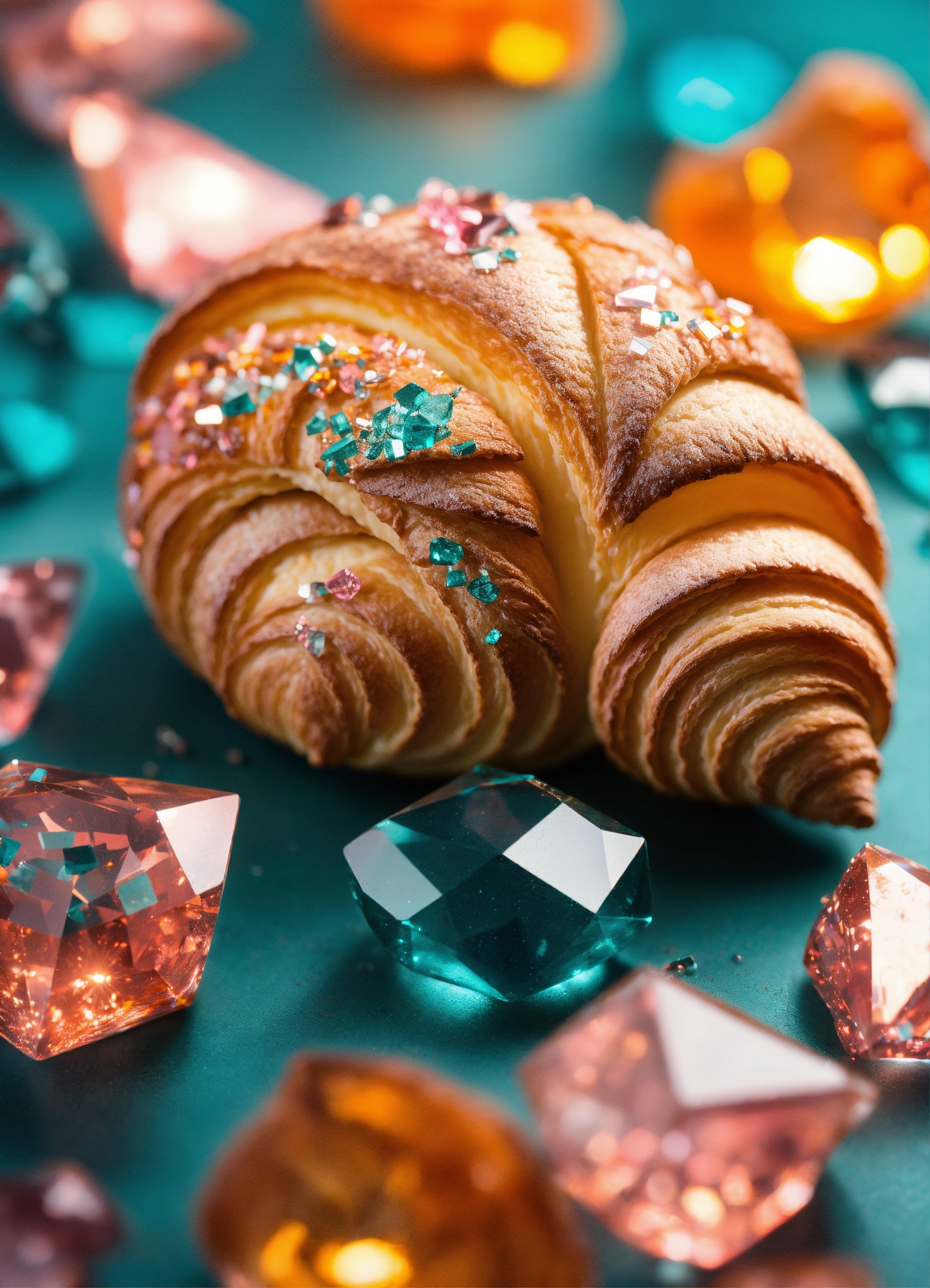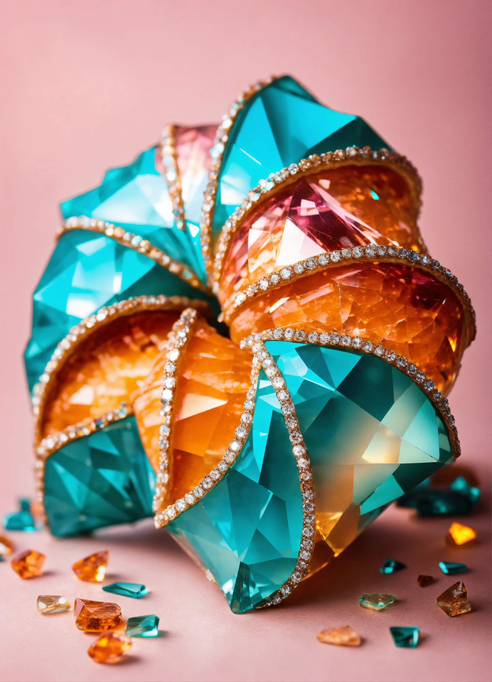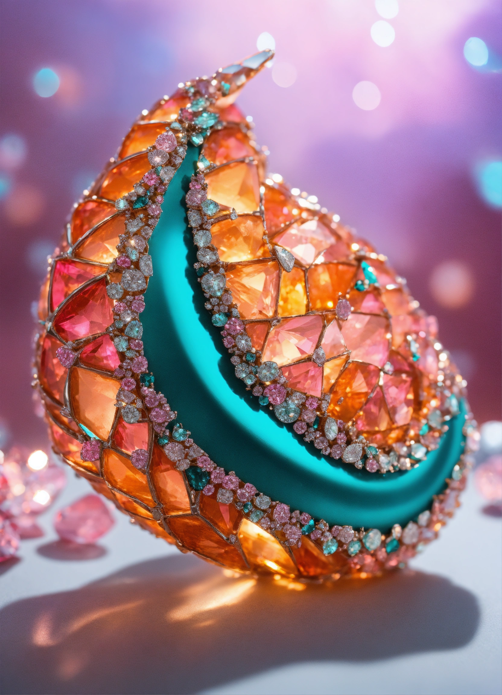 Croissant made of sparkling diamond glass fragments in deep turquoise, orange and pink shades. shiny, elegant. light background