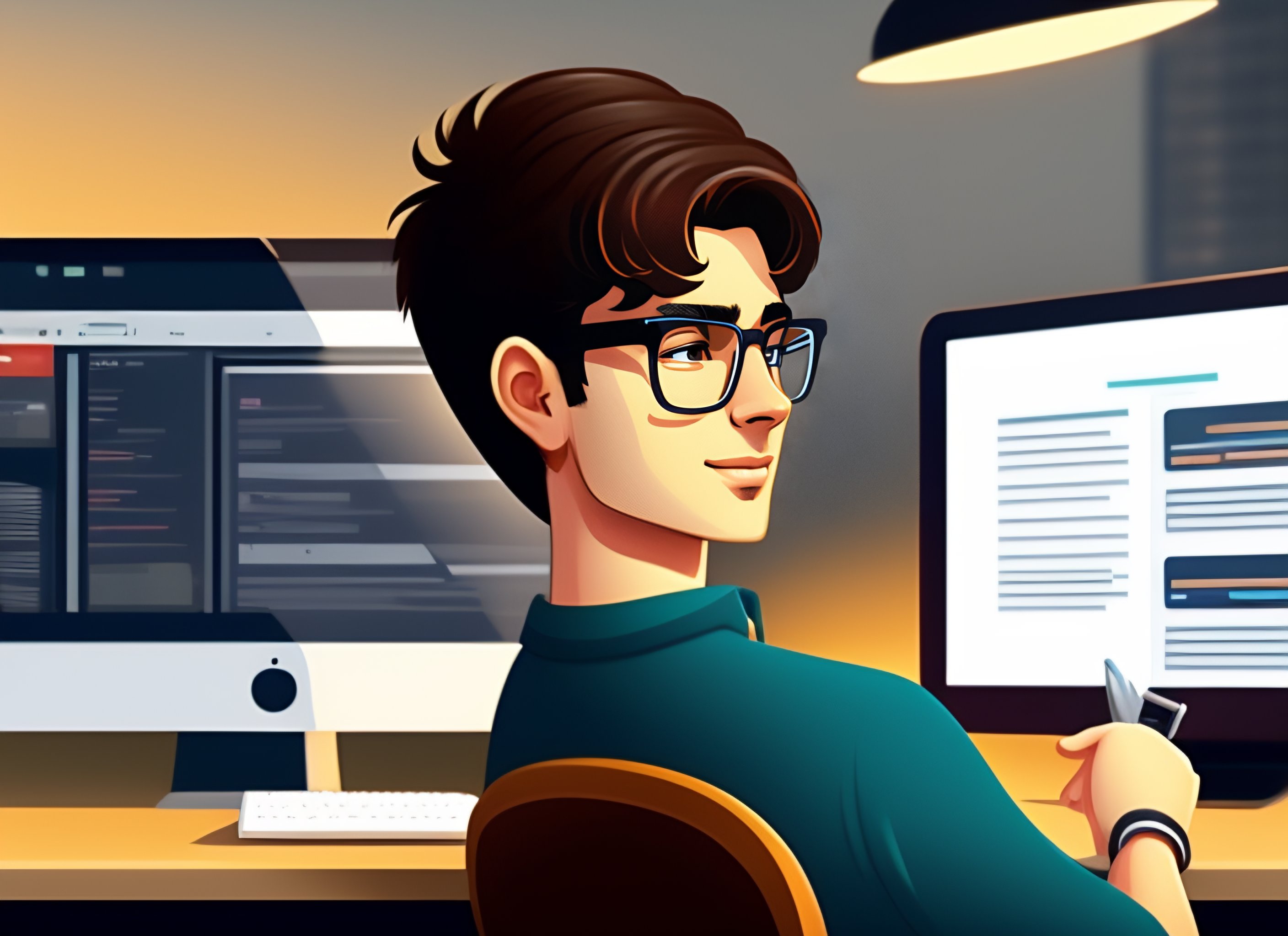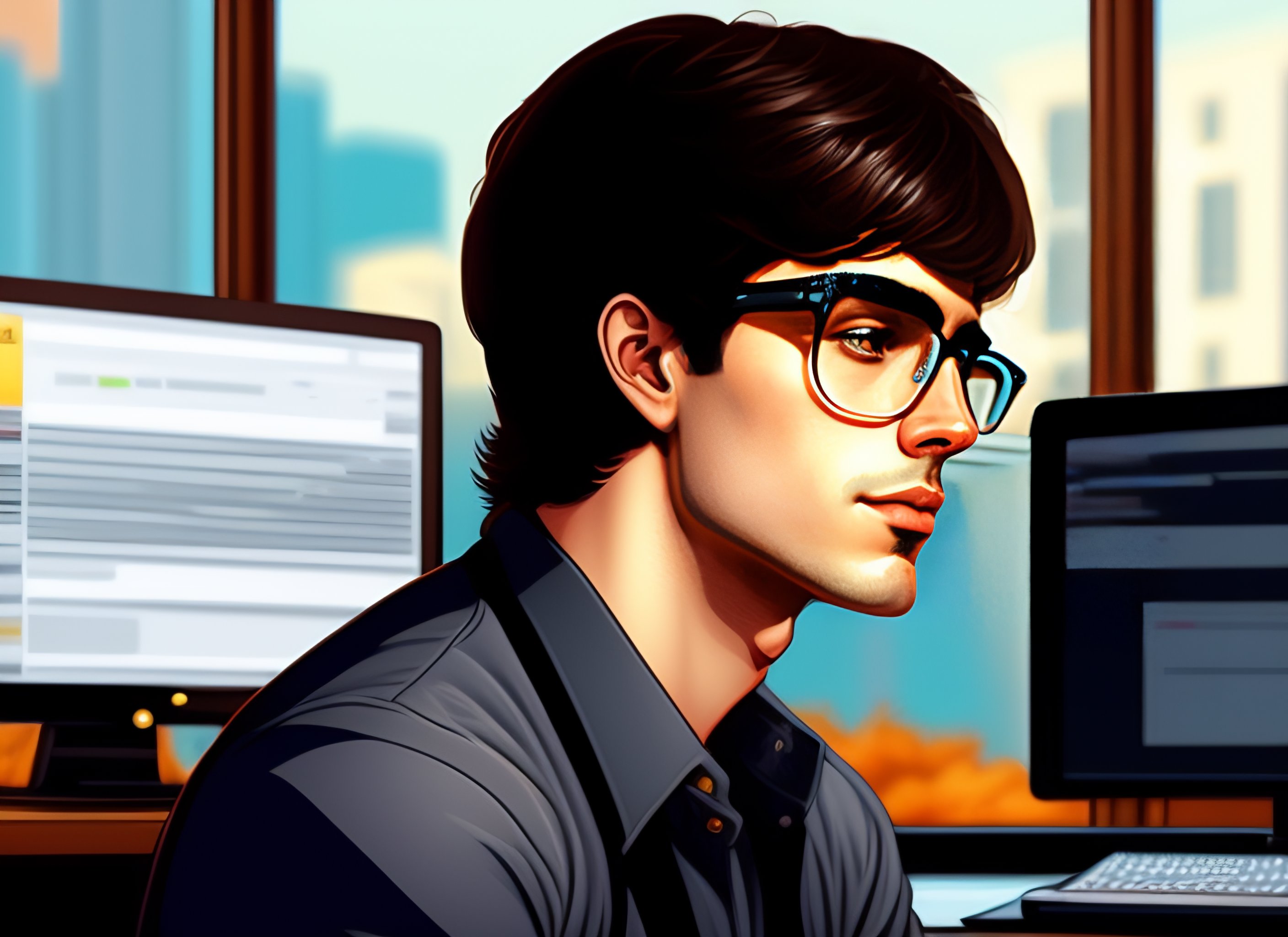 A web developer with brown hair down to his shoulders and black glasses at his computer in comic book art style