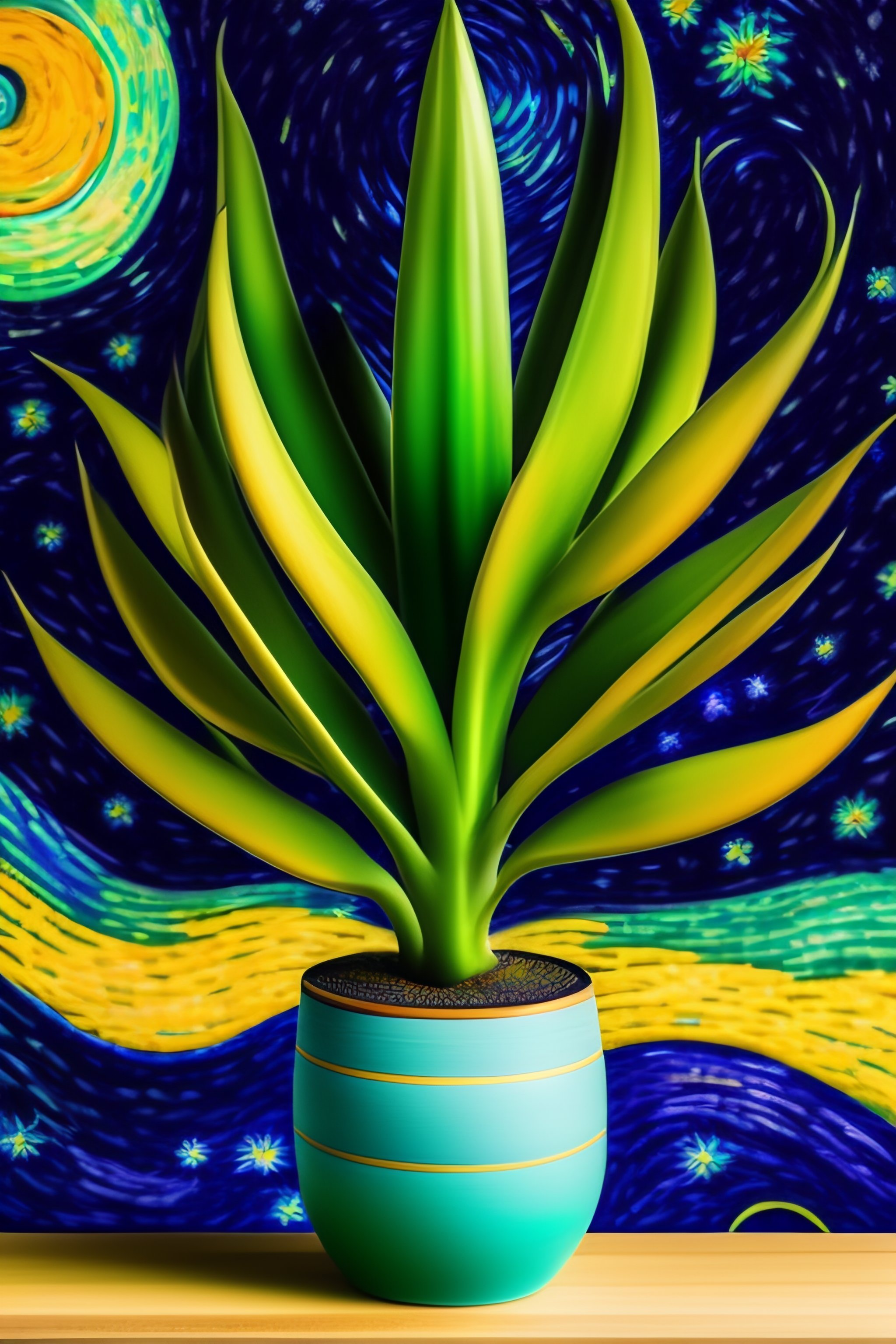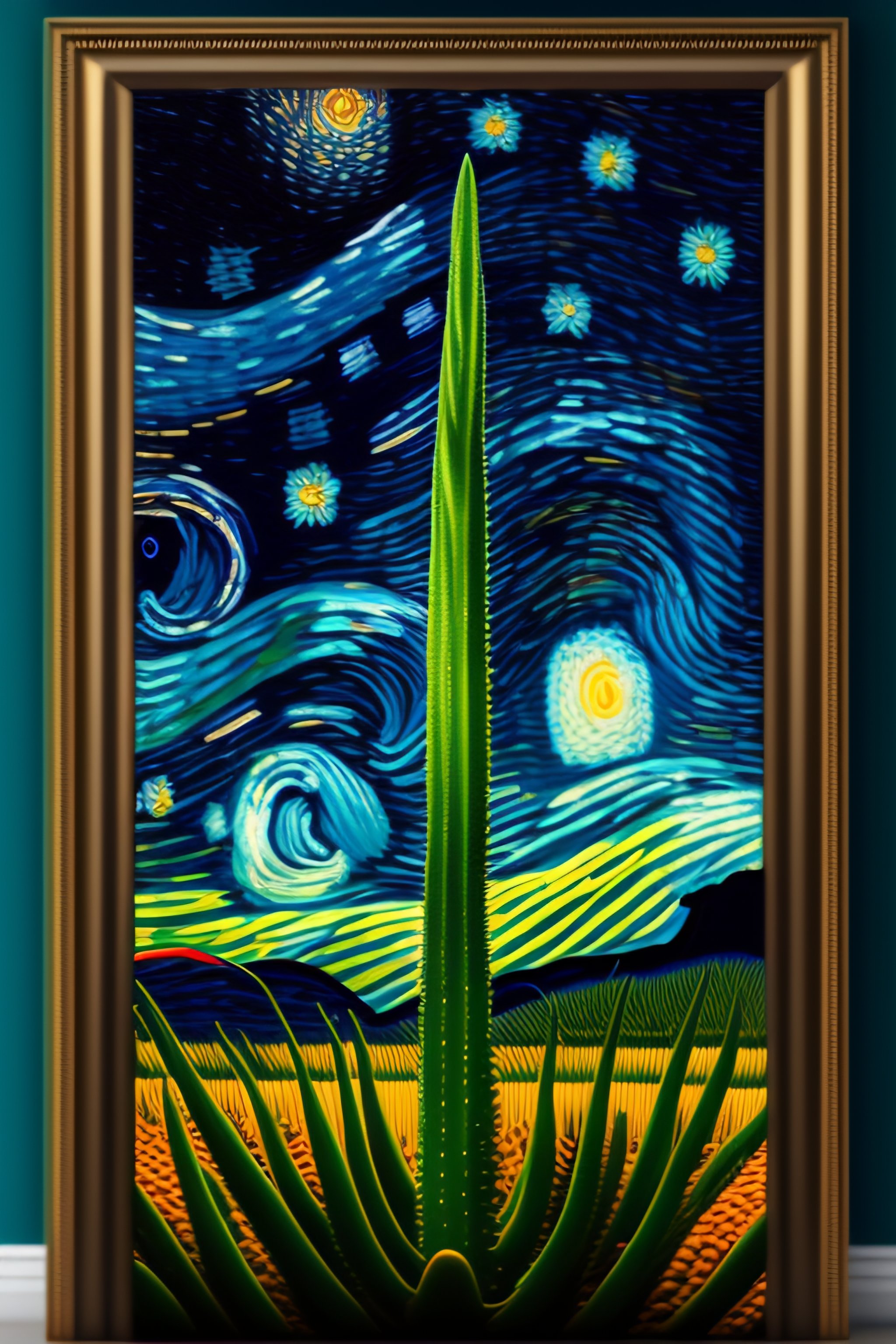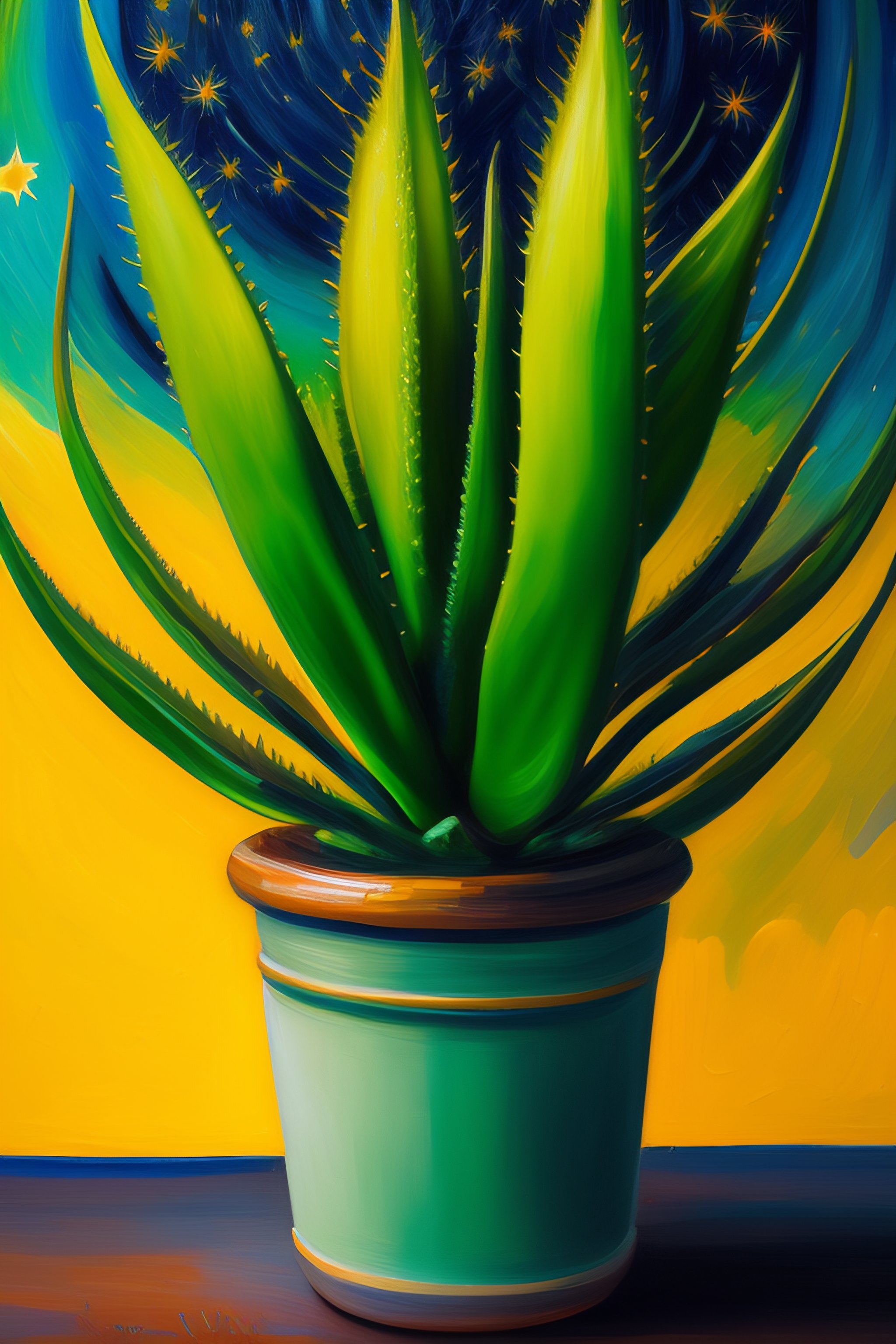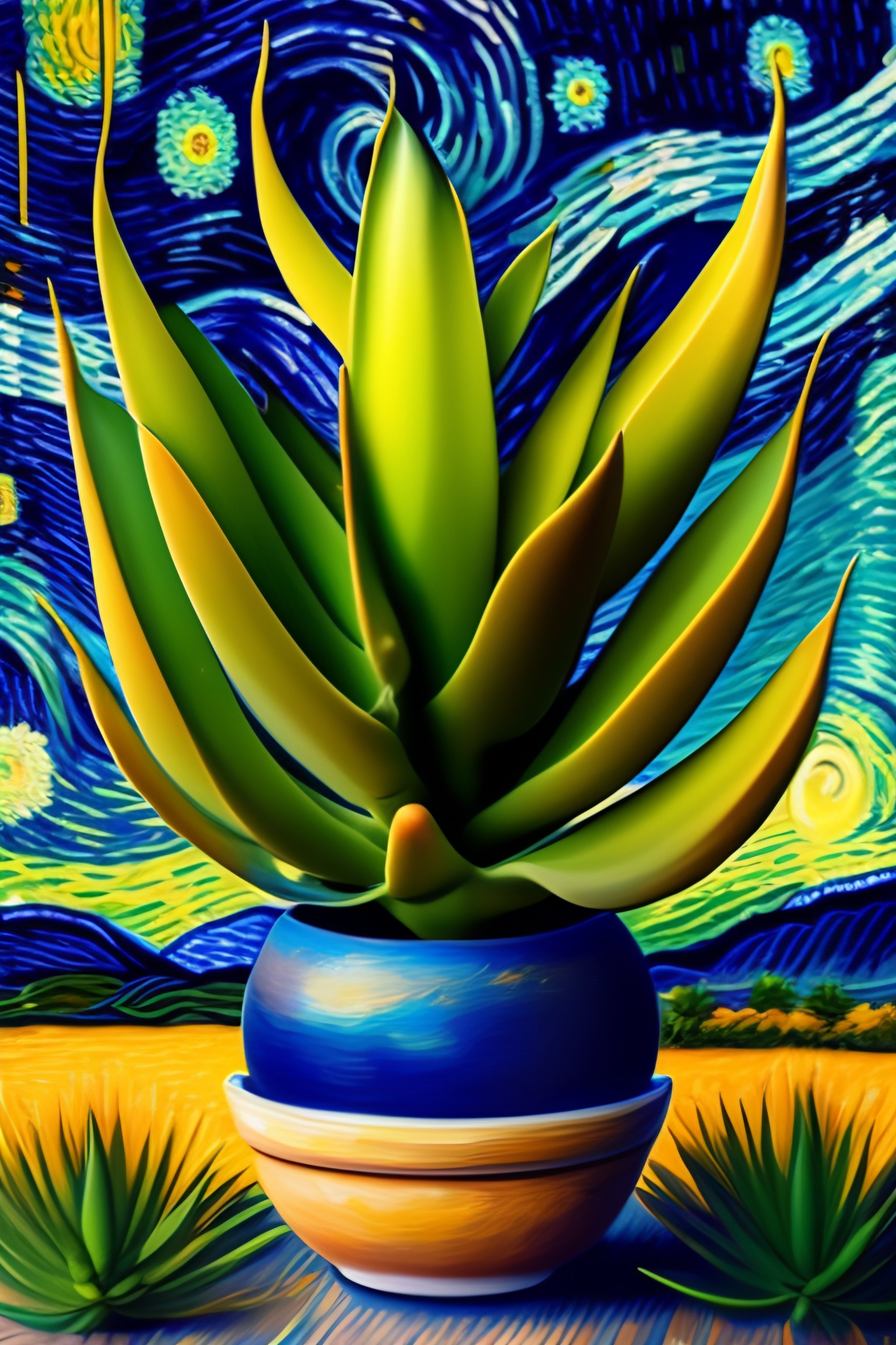 A medium shot portrait uhd image of an aloe vera plant painted in van gogh "the starry night" style and color palette