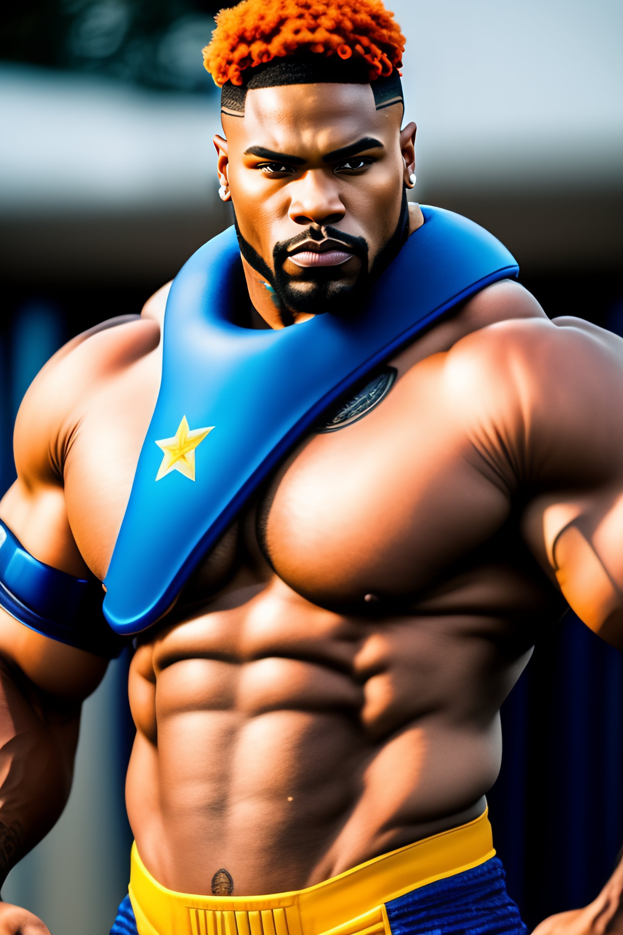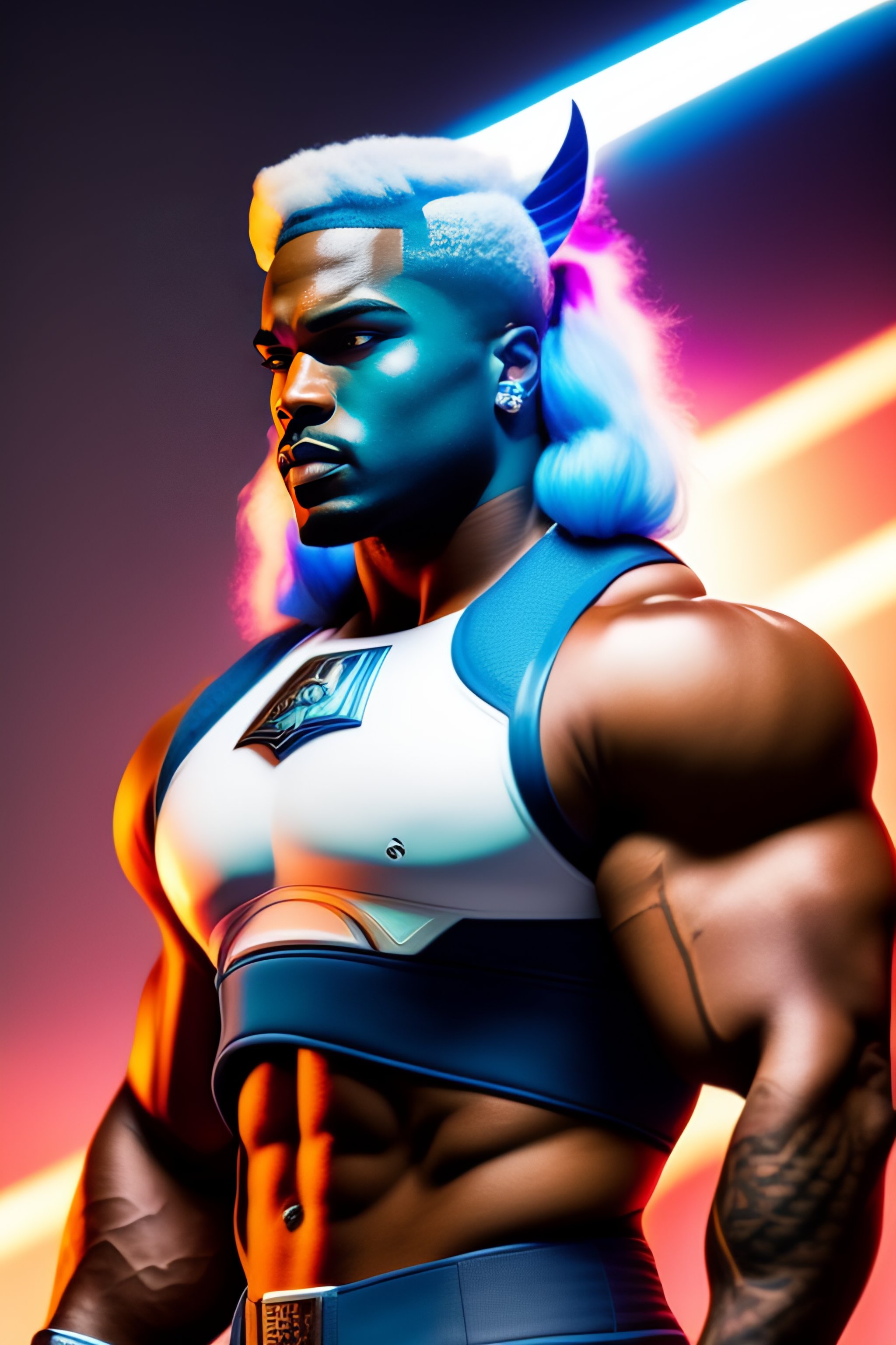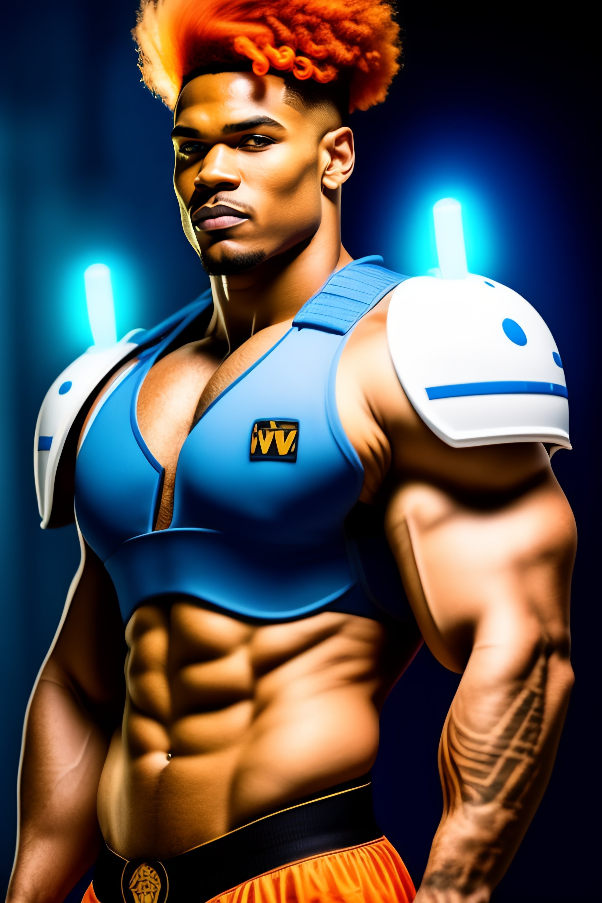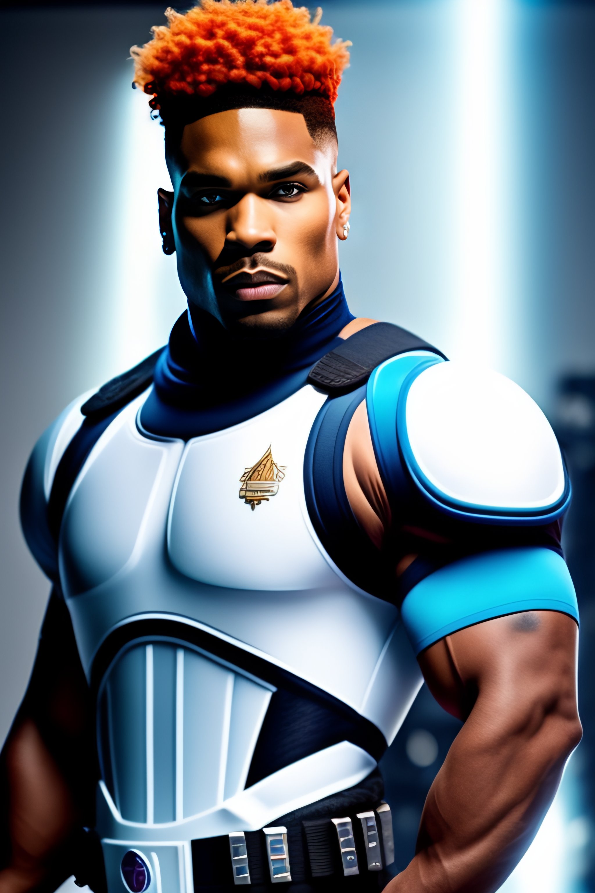 A cartoon buff man with light skin blue fiery hair wearing stormtrooper body armour