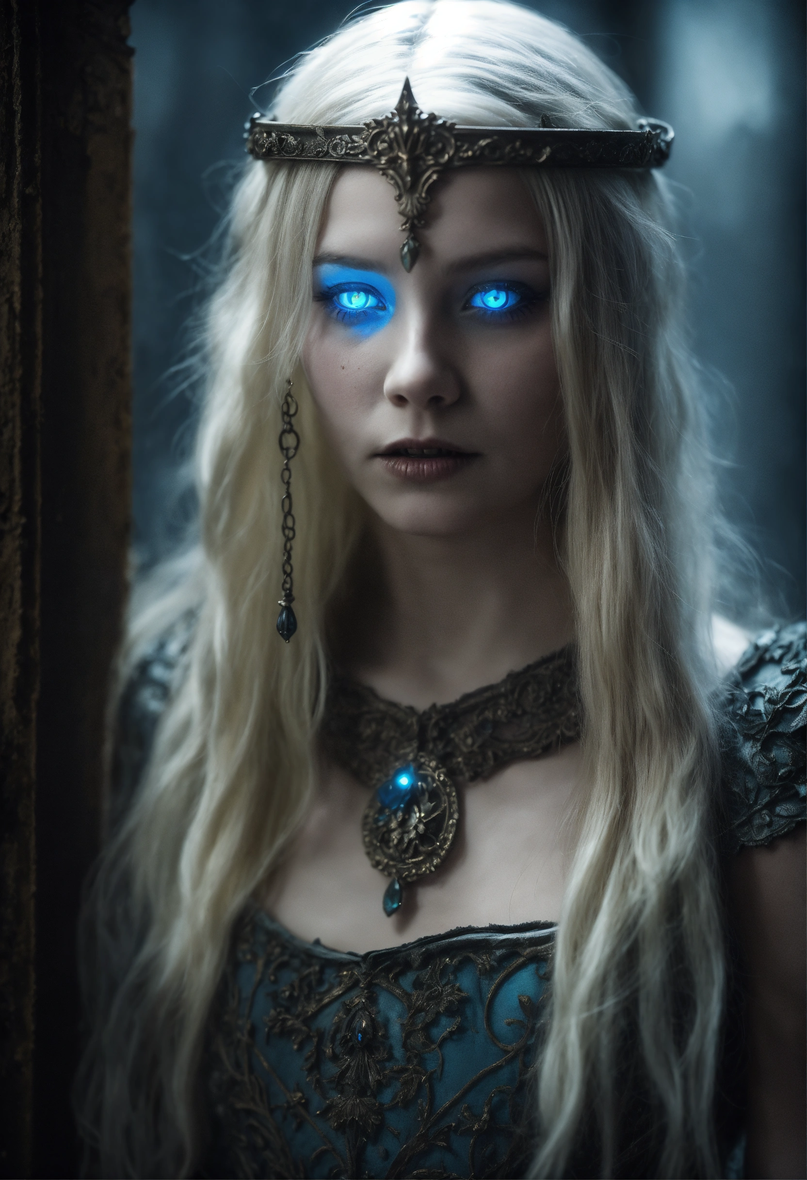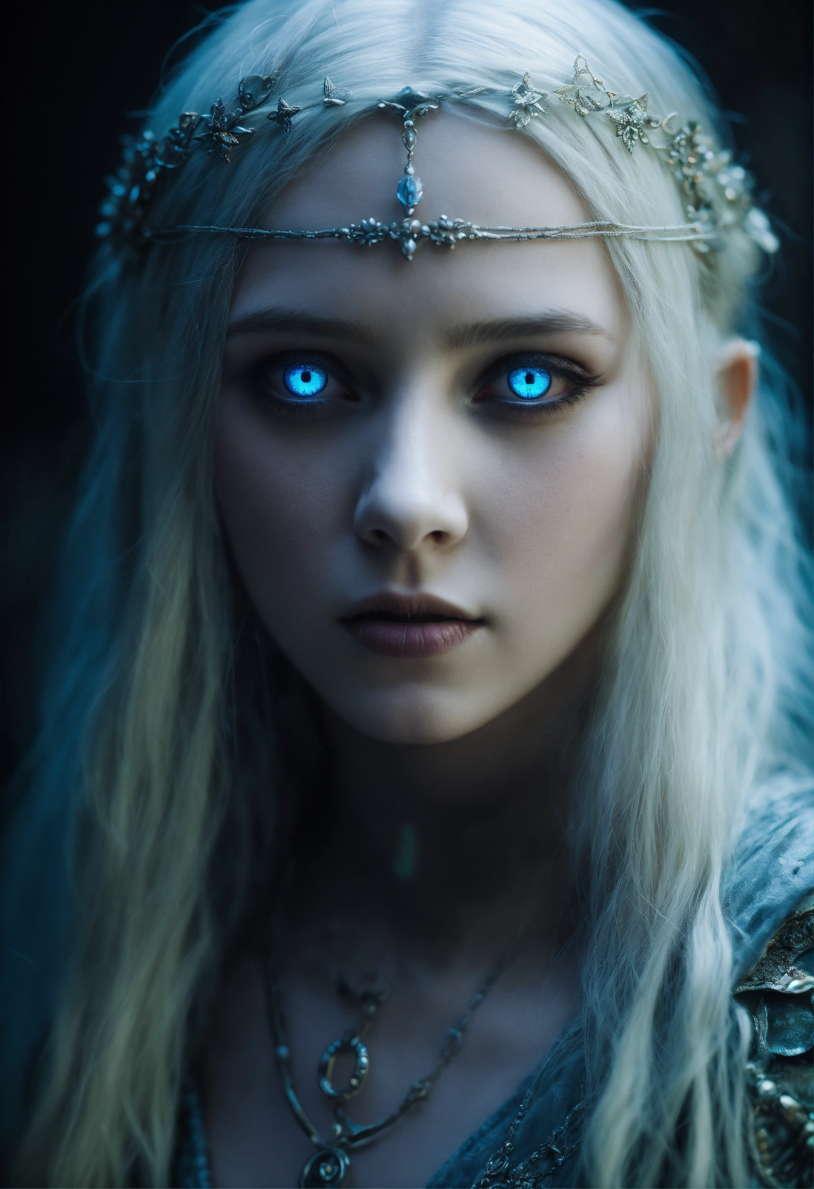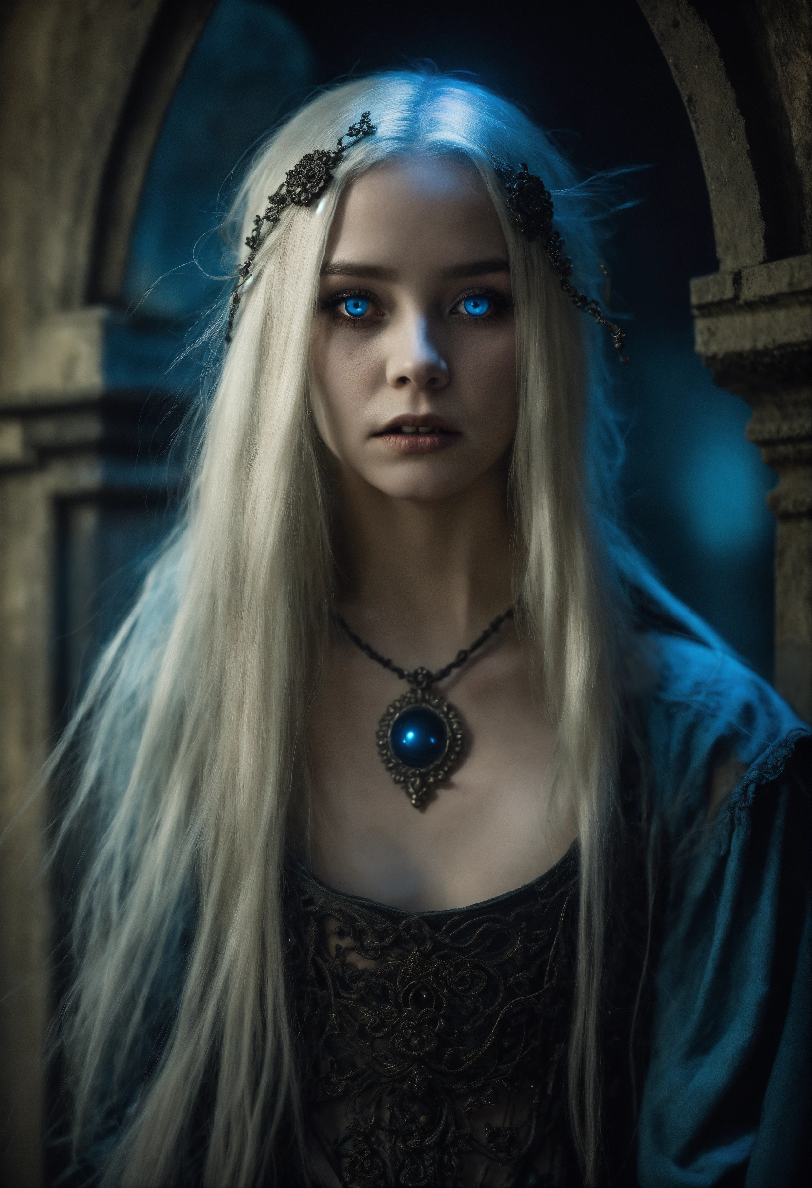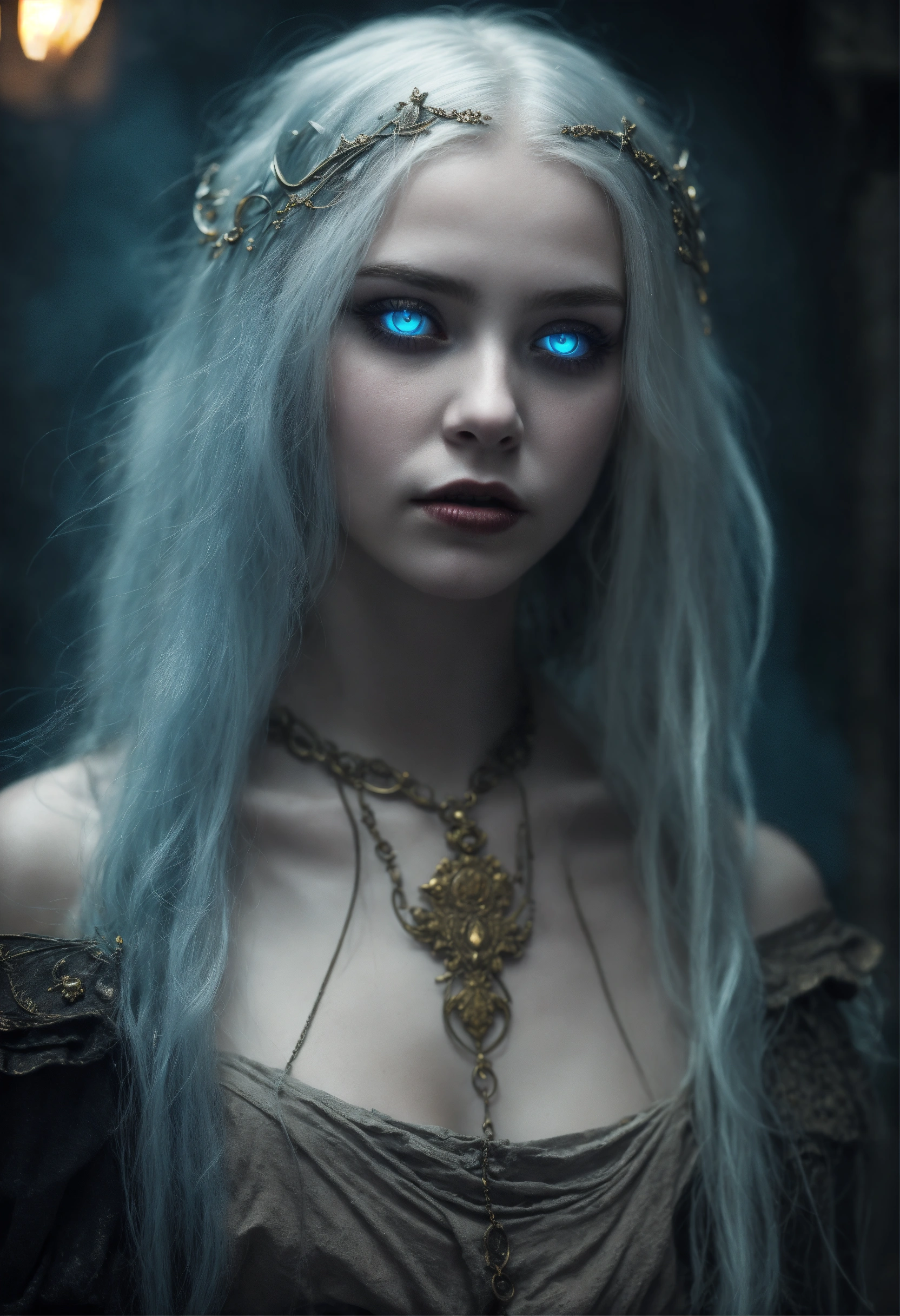 Body portrait, 12 years old very skinny goth girl necromancer with long silverwhite hair and alabaster skin pale as a corpse and glowing blue eyes is overcome by darkness in a gloomy crypt, lightly clad, graceful, wispy, glowing blue eyes, ghostly, rotting flesh, dead, evil, demonic, undead, darkness, grotesque, mysterious, dark, cold ambient lighting, focus on face, extremely detailed, fantasy, medieval setting