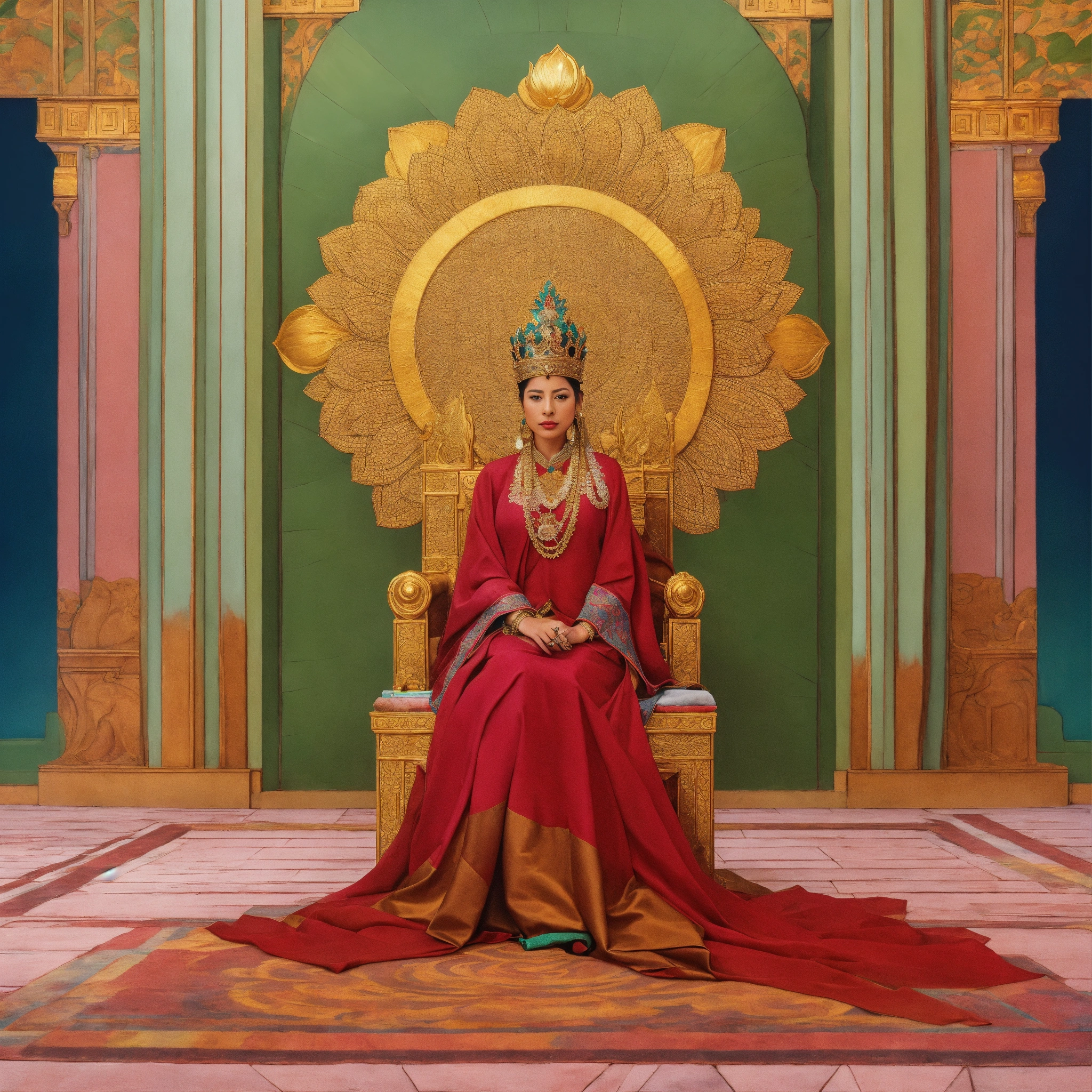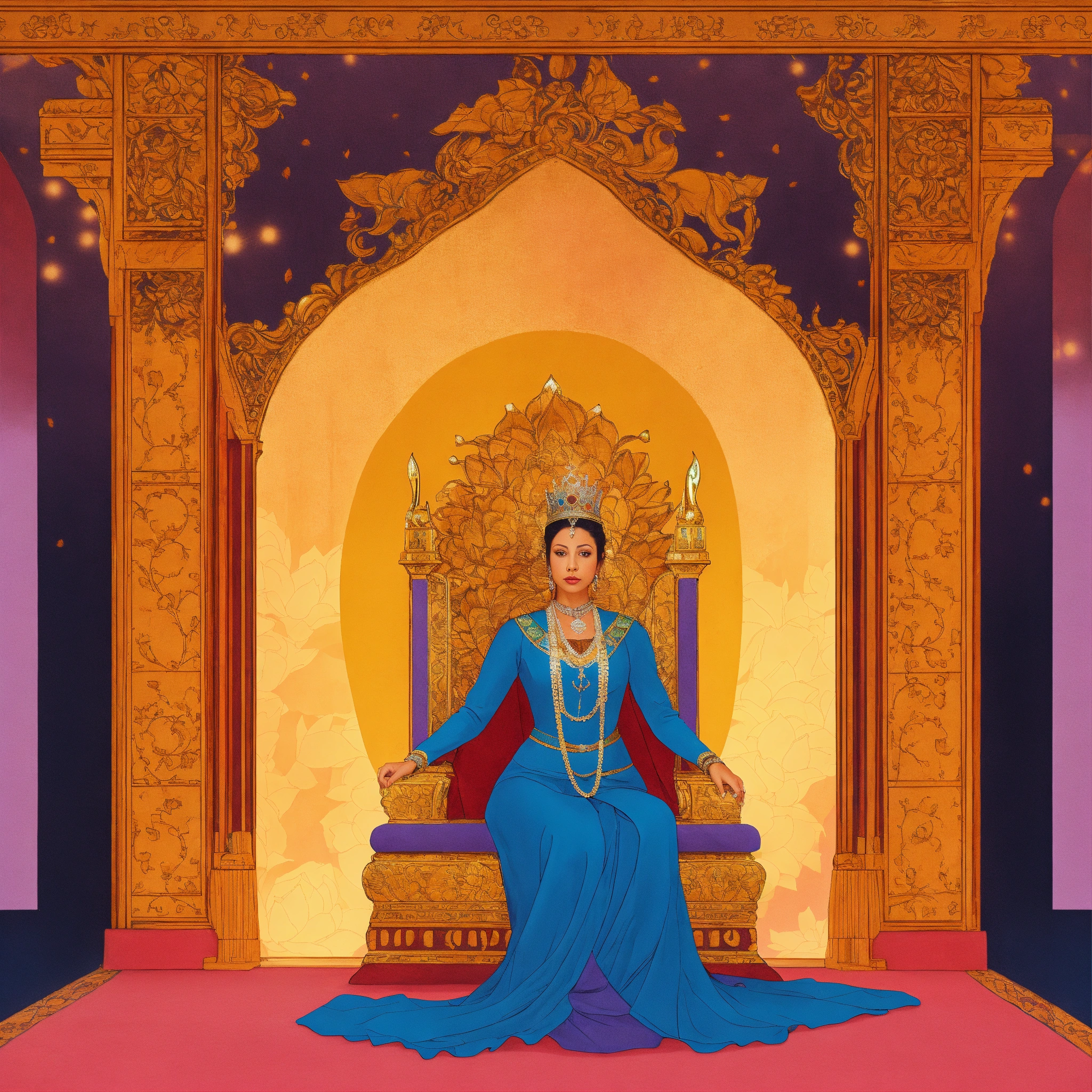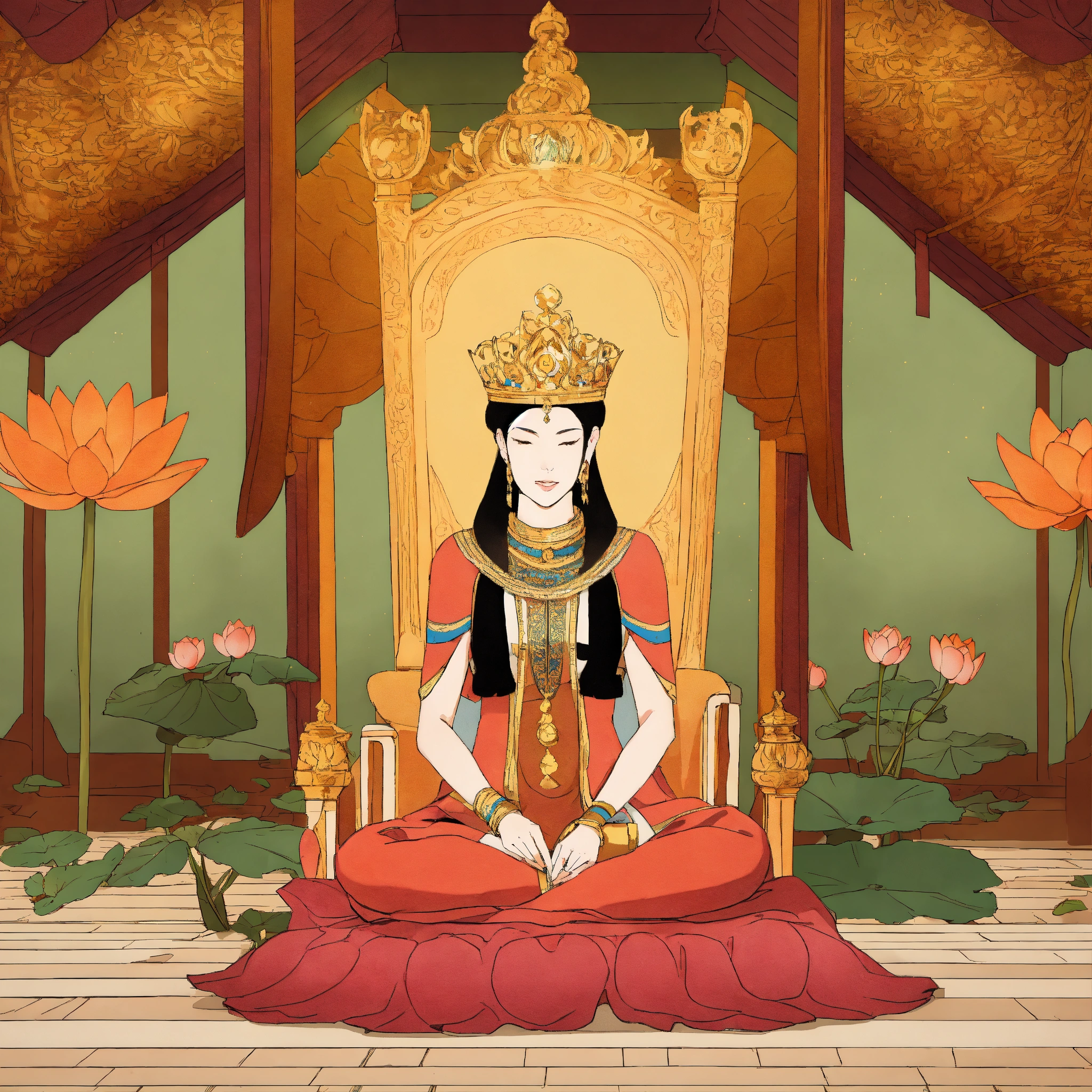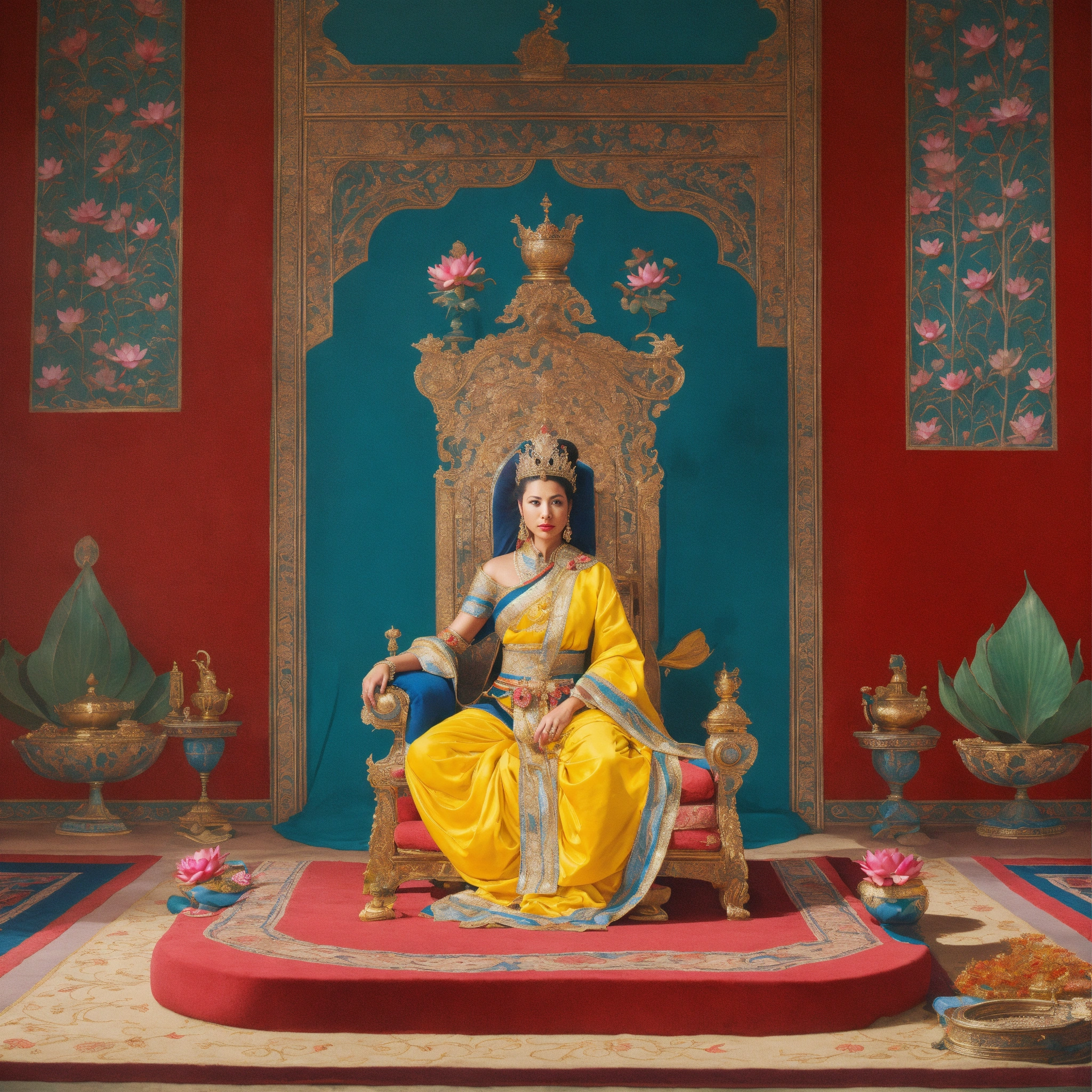 Queen sitting on her throne in an open room with a large lotus flower in the background