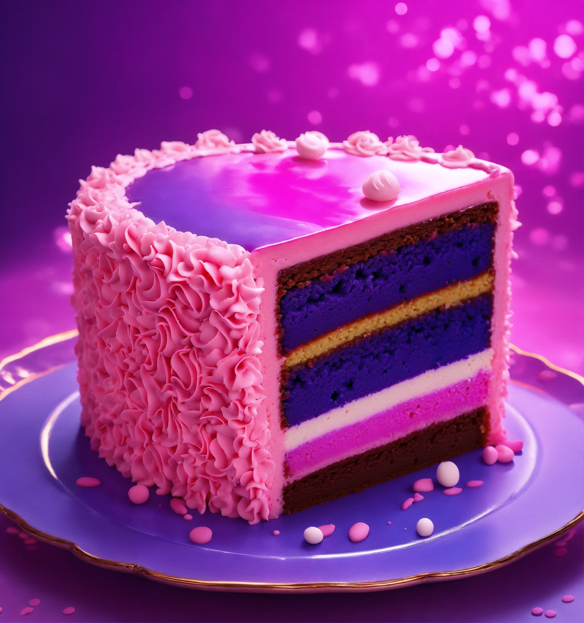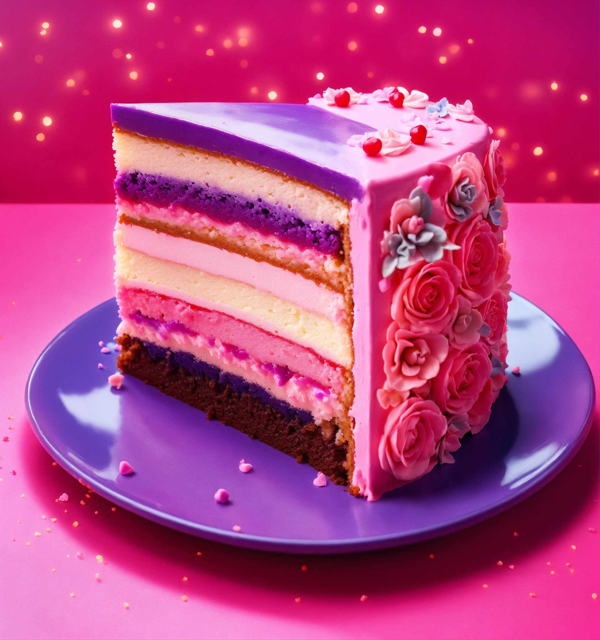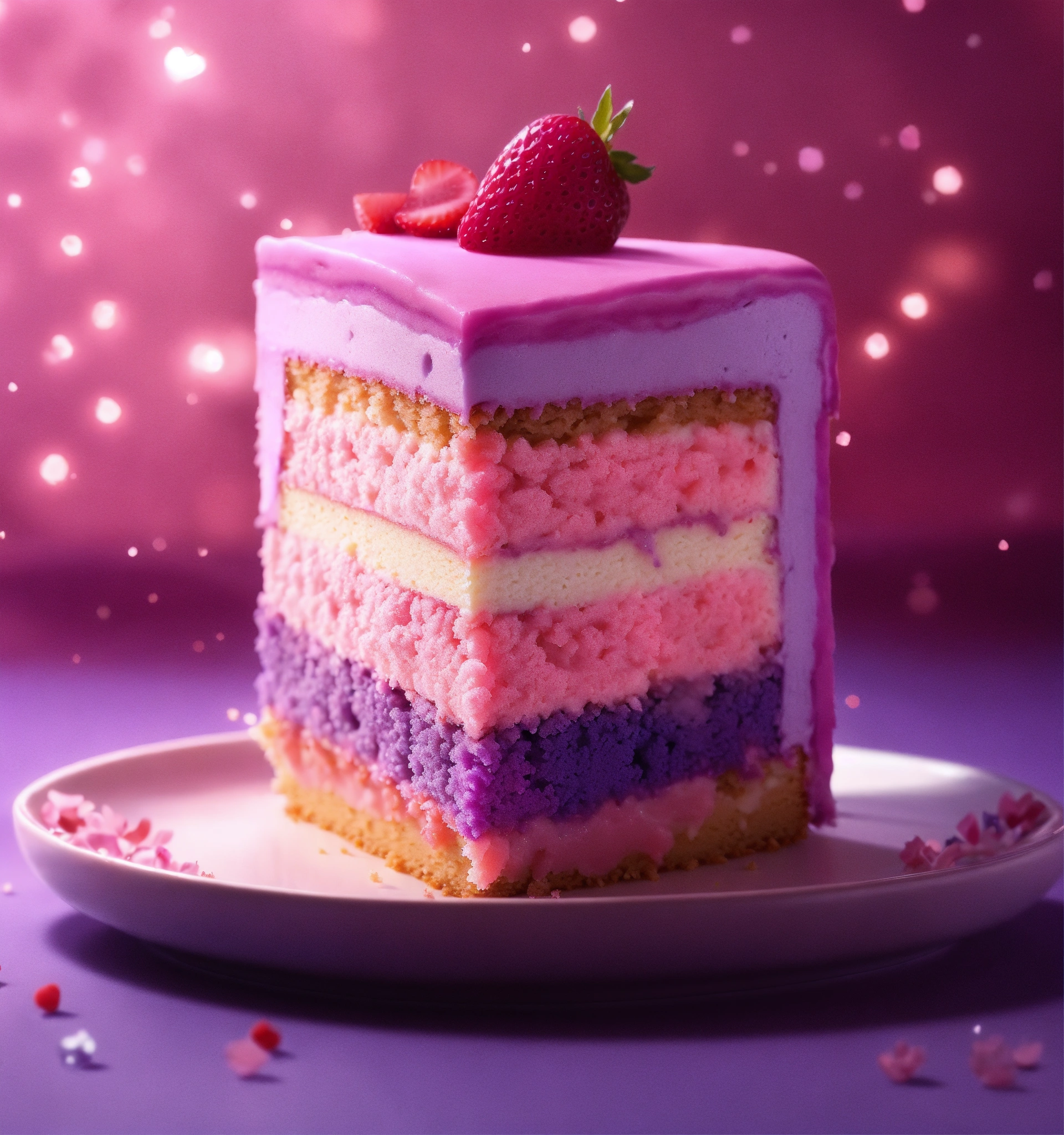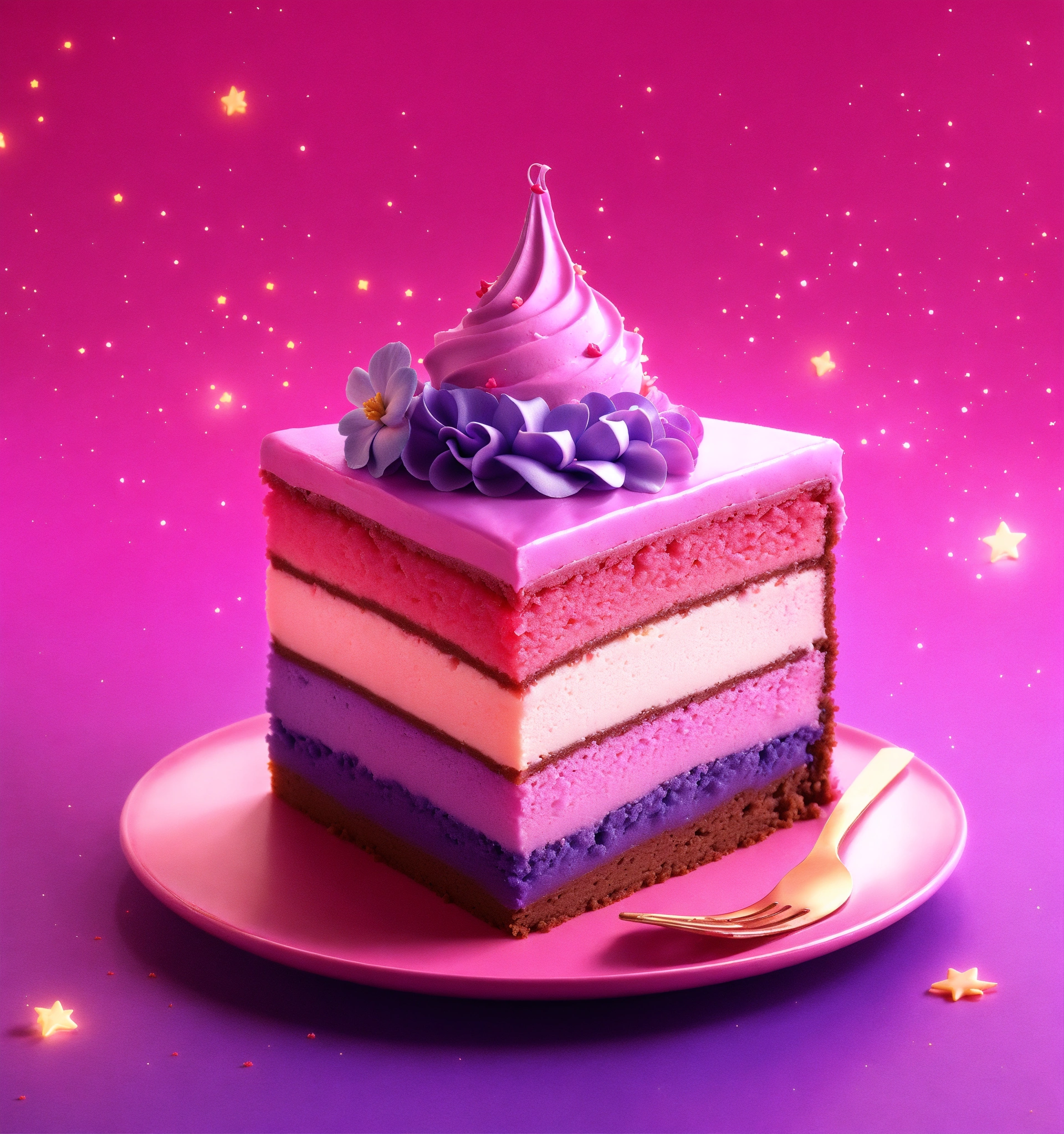 Pink and purple slice of cake, or slice, in the style of kawaii aesthetic, the design creates an atmosphere of mystery, fantasy, and magic, 8k resolution, hyper realistic