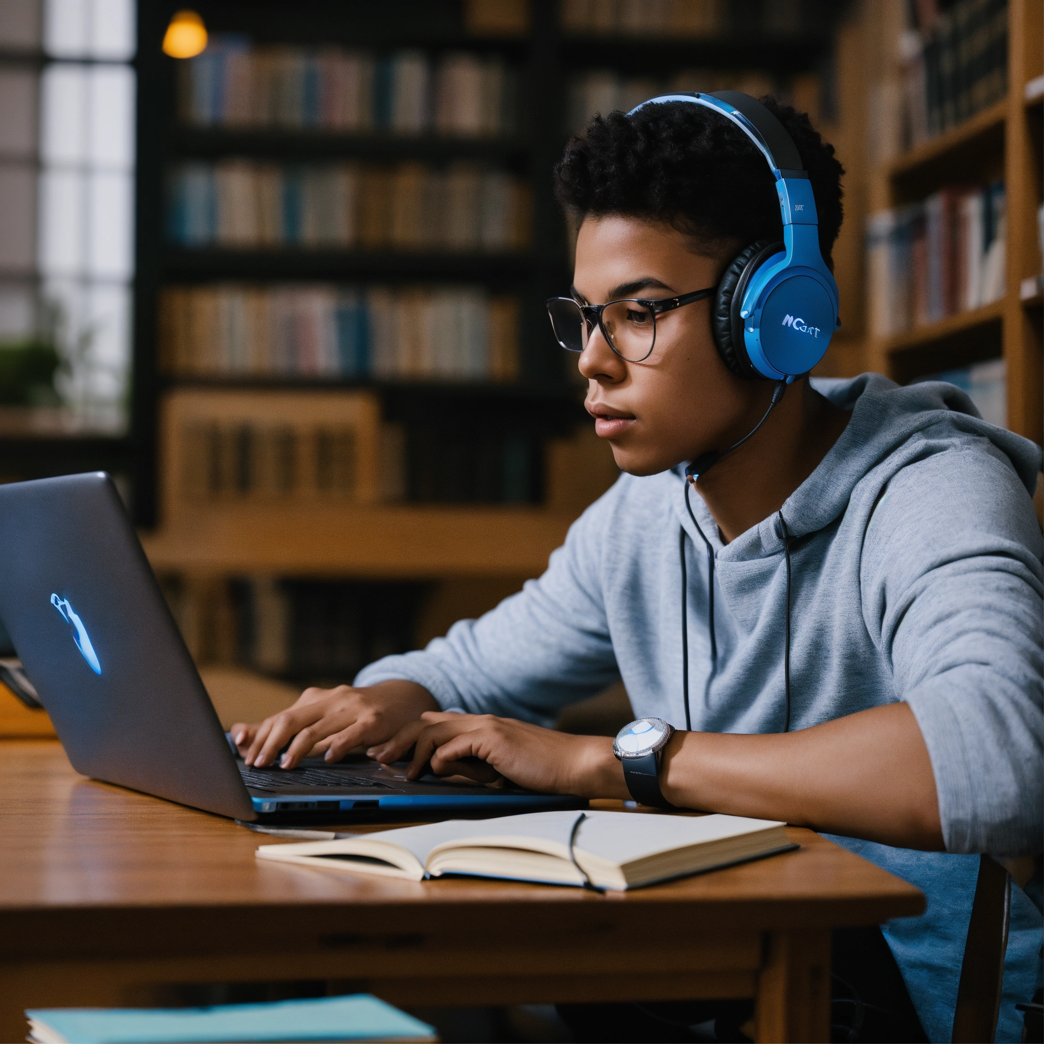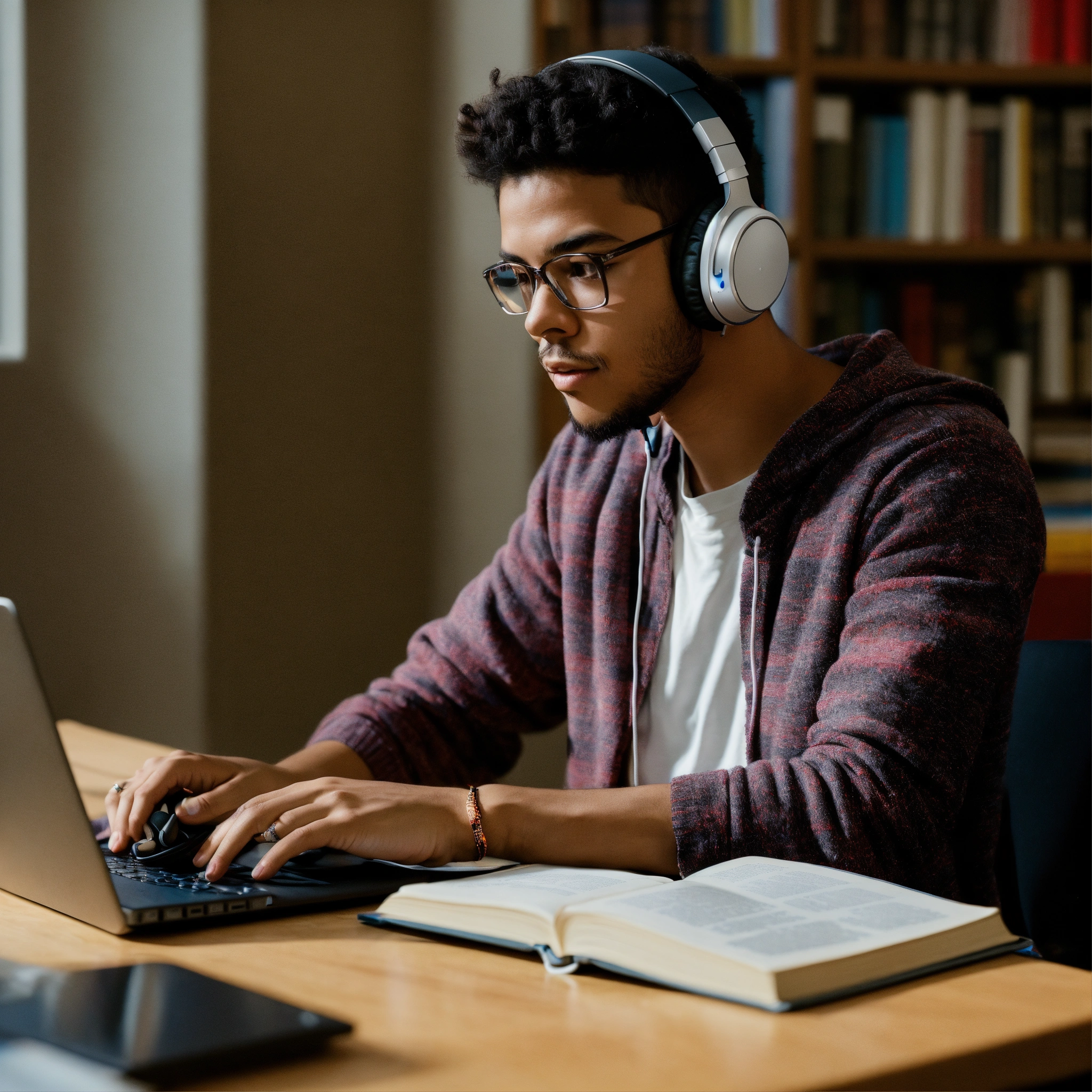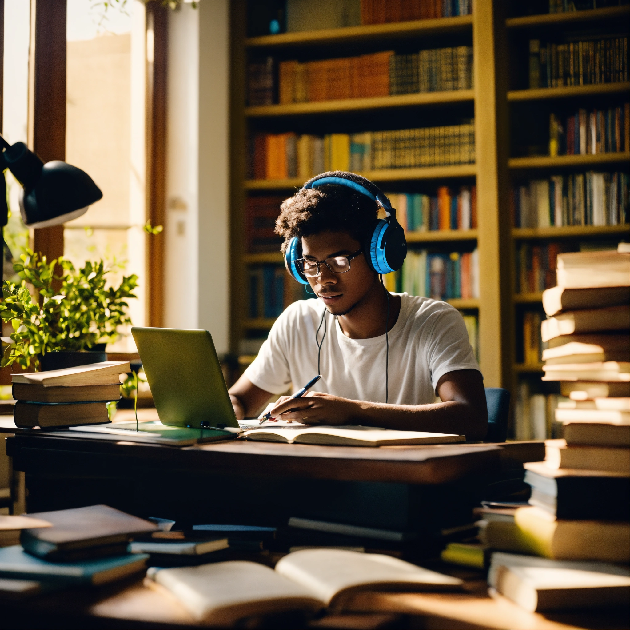 A photo of a person studying for the mcat, the person is sitting at a desk with a stack of books and a laptop, the person is wearing headphones and is focused on the book