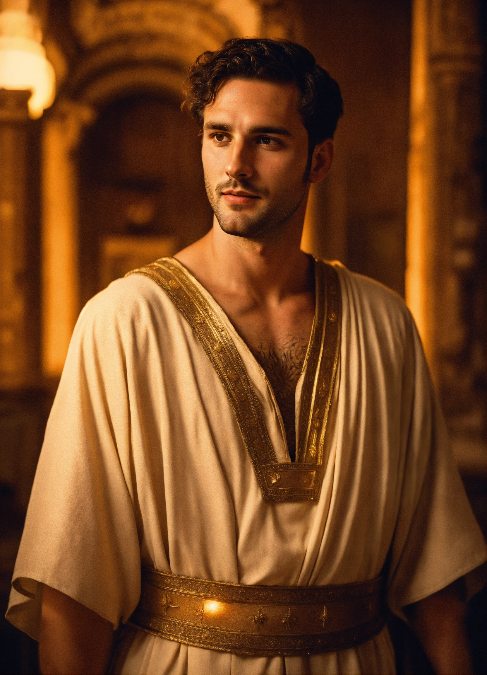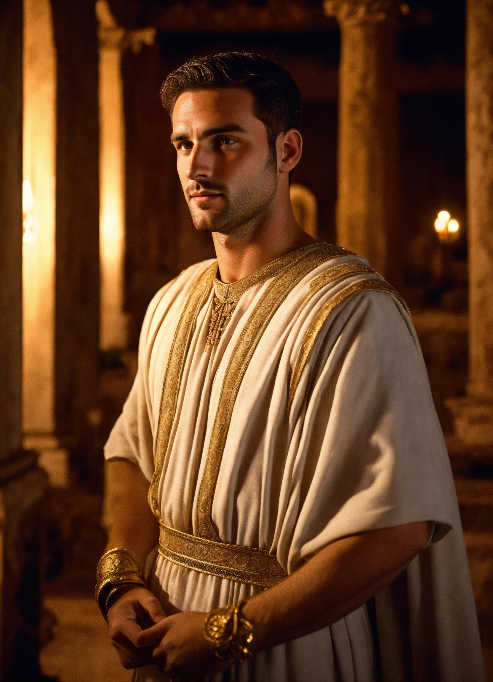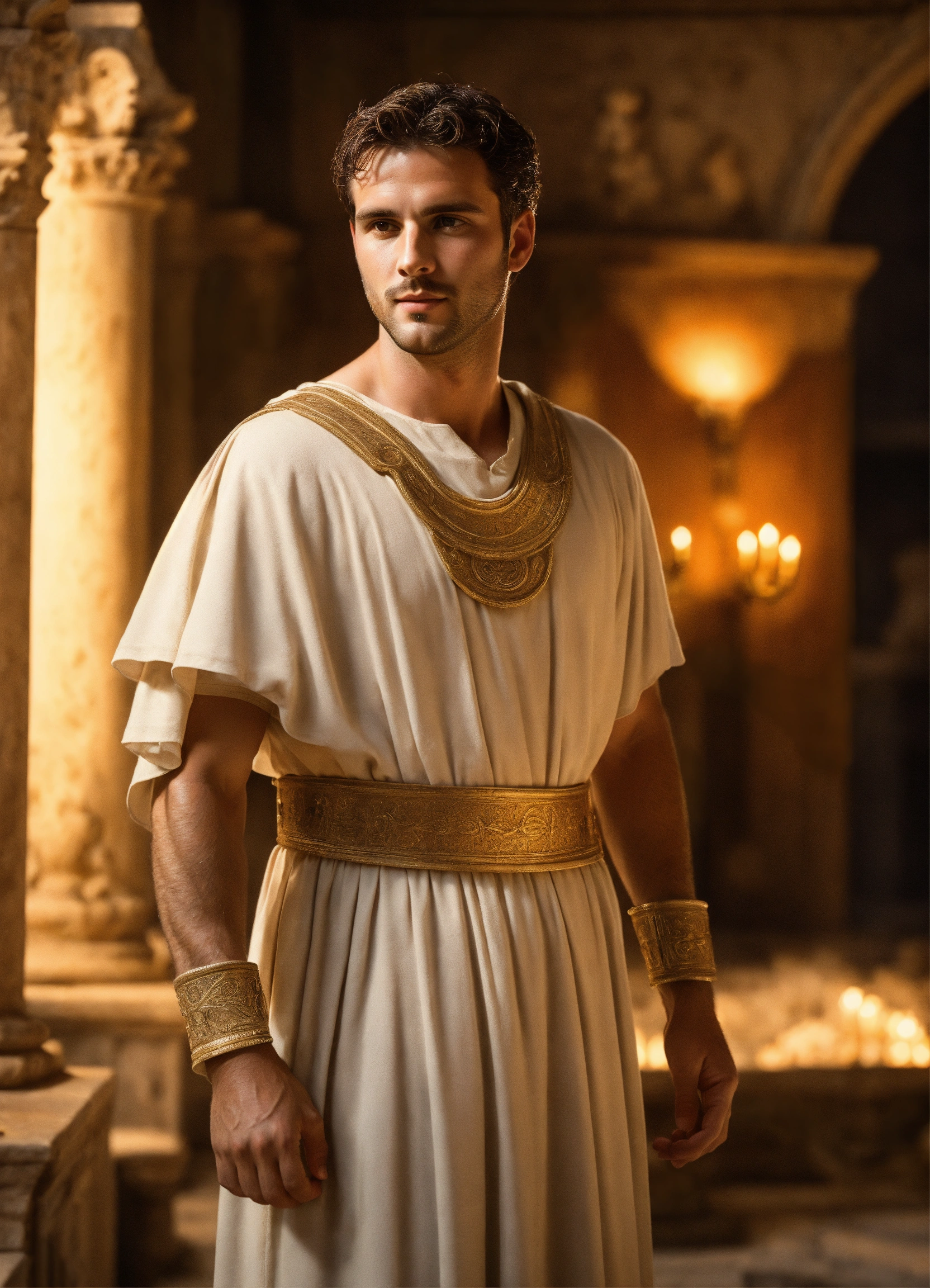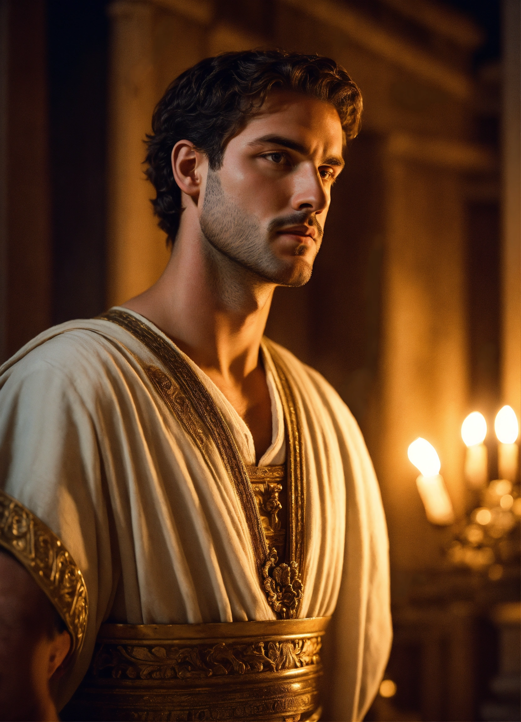 A young rich noble handsome roman man wearing a light-colored tunic, smart, solemn, amused, 30 years old, charismatic, ancient rome, in his luxurious pompeian villa, detailed decor, photorealistic, hyperdetailed, 8k, clean-shaved face, at night, glamorous lights