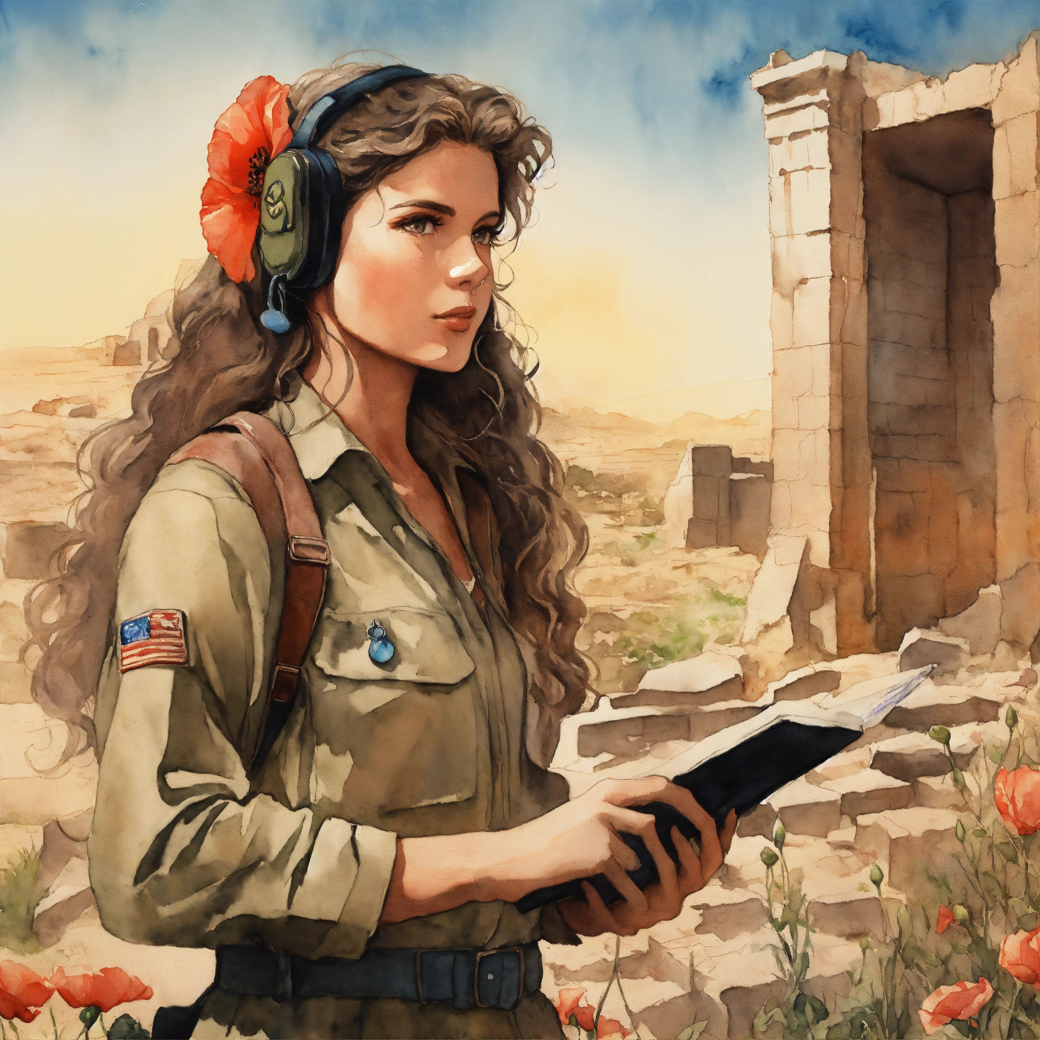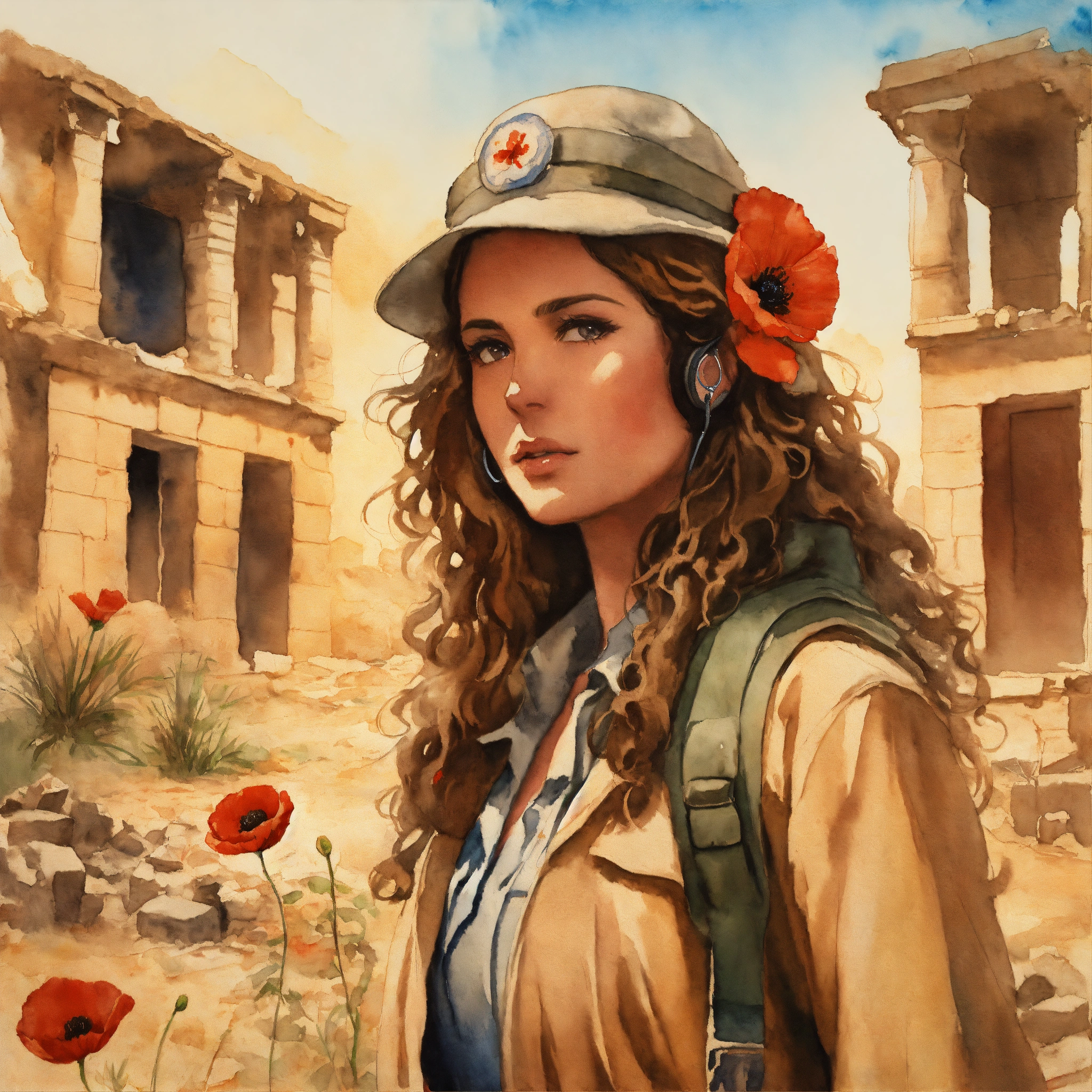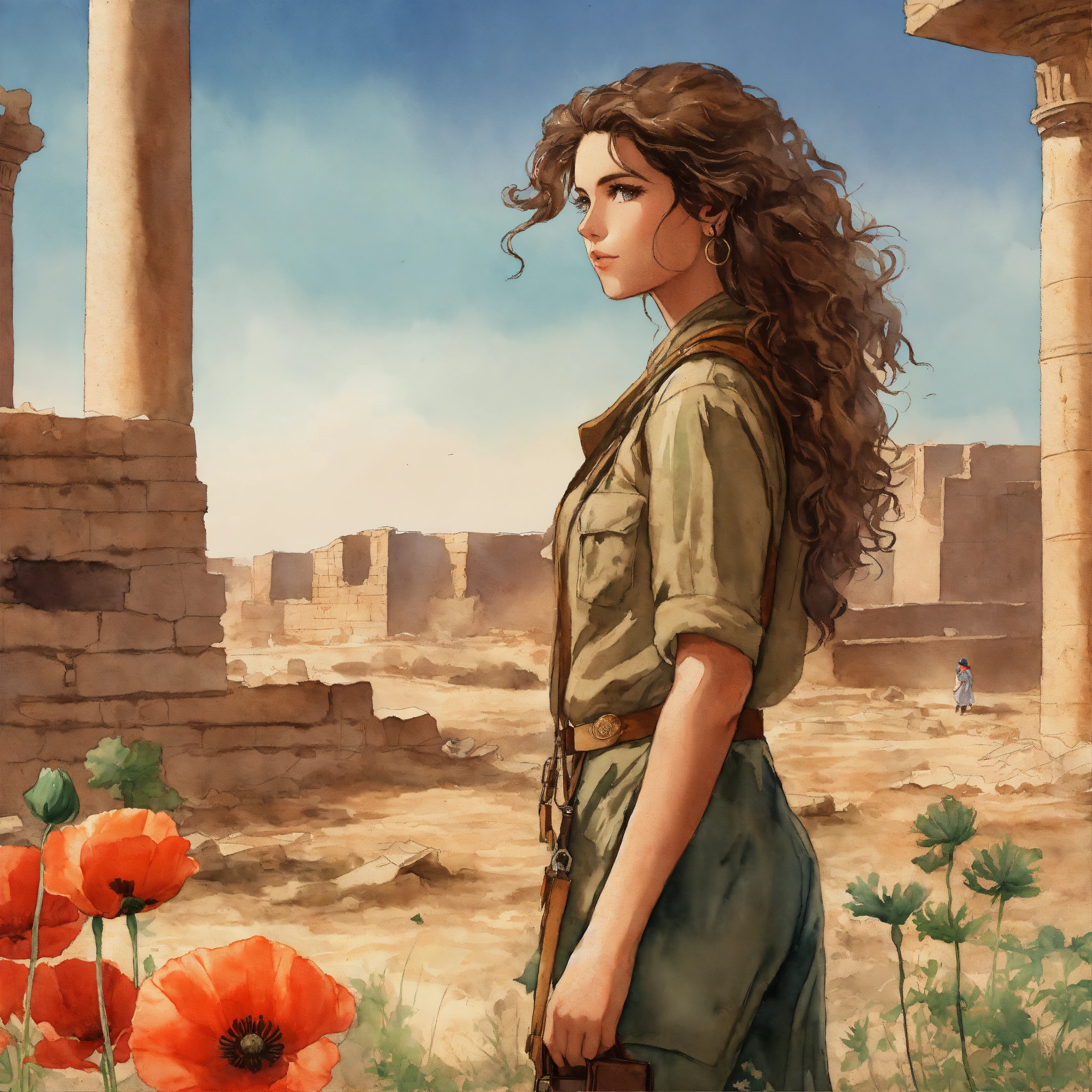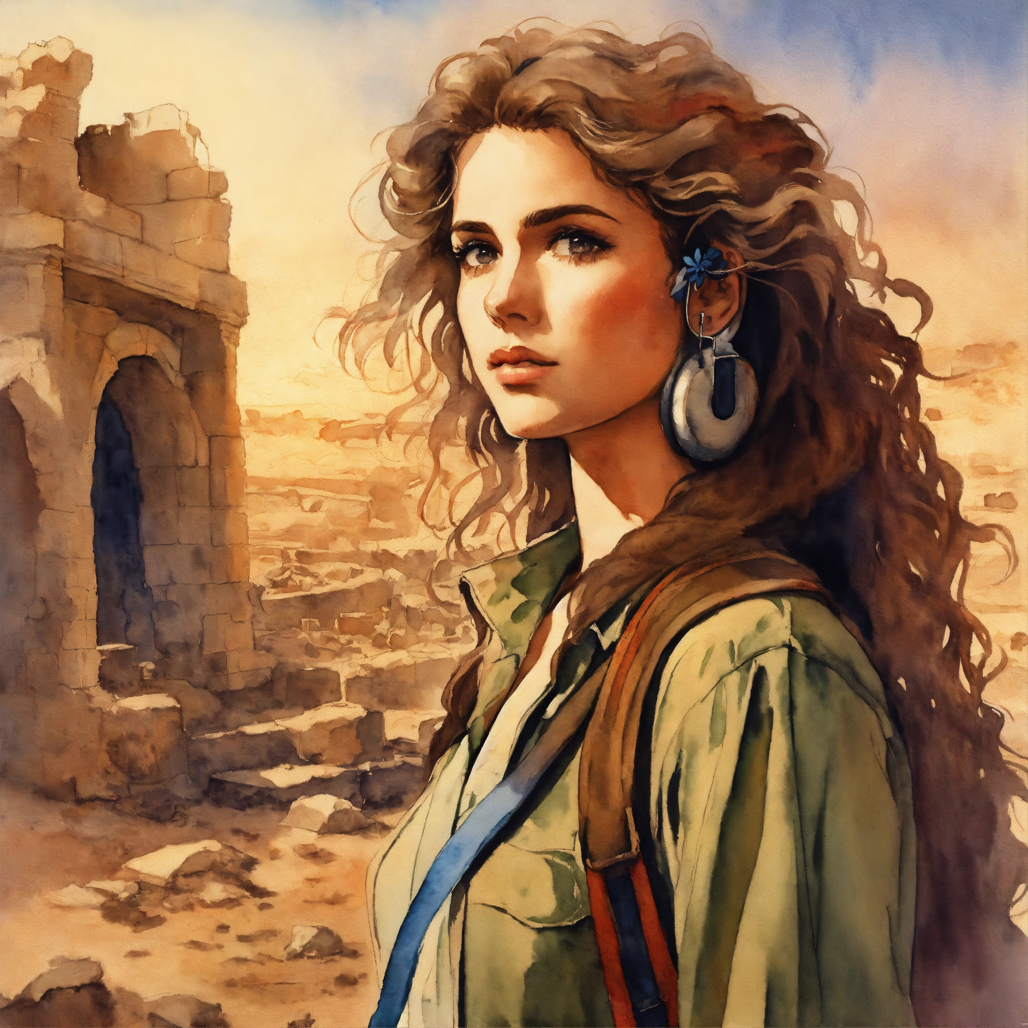 Textless 80s artwork poster of a caucasian female archeologist investigating ruins of irak, watercolor painting style. long curly hair, a flower of poppy behind her ear. no hats, picture from 30 meters away, free hair, looking behind the camera a bit sideways, looking at the camera
