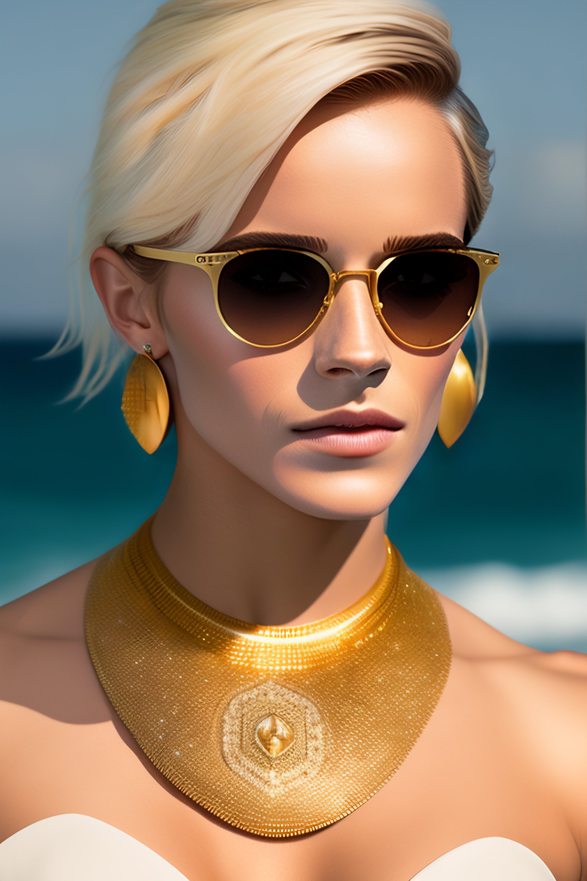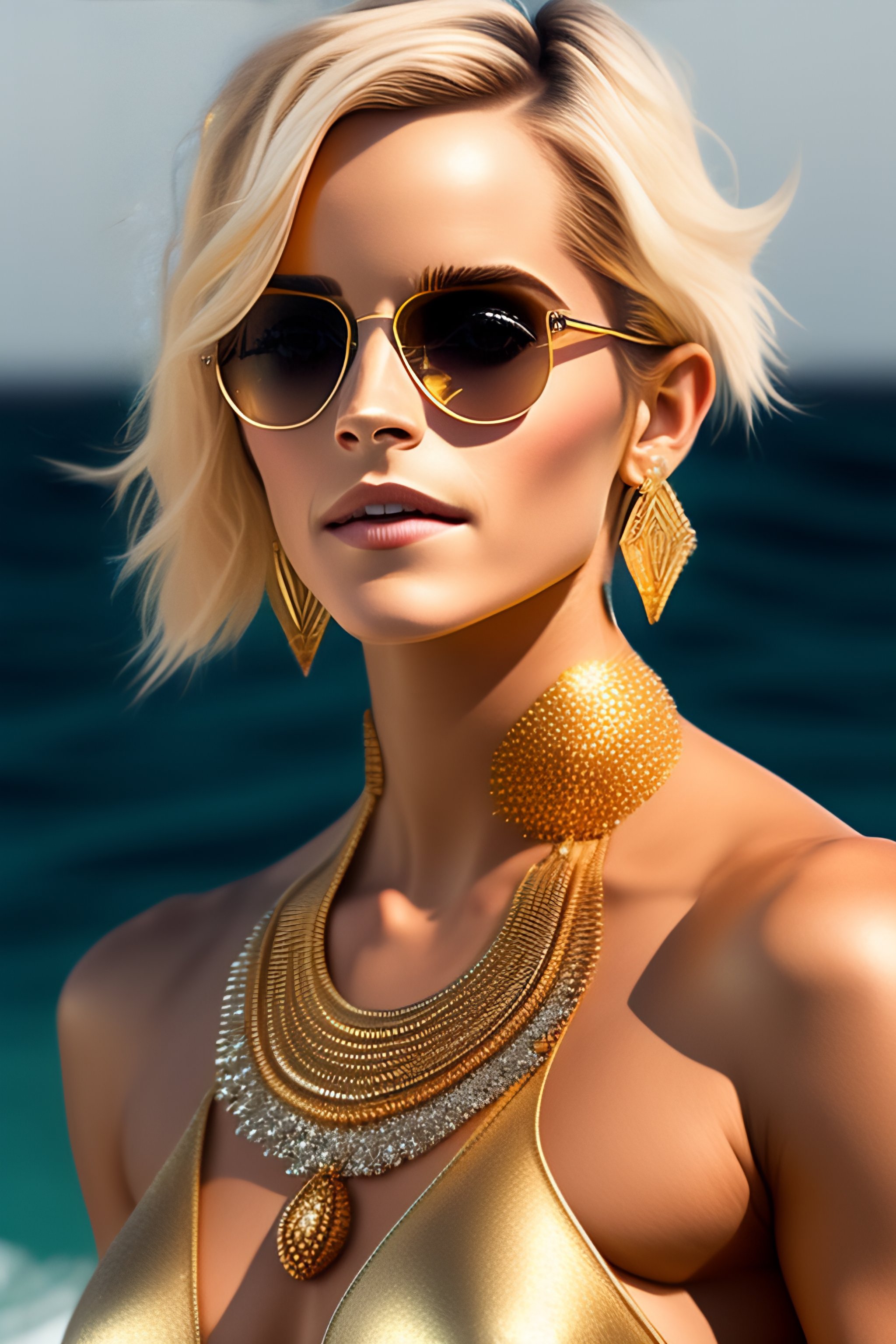 Emma watson with platinum blond, windswept hair. wearing sunglasses, ((long shot)), both arms up over her head, detailed underarms, detailed underarm stubble, ((((chest and arm tattoos covering)))), ((((intricate gold rhinestone chain mail swimming tiny outfit))), ((heavily tanned, wearing a ton of suntan lotion)), navel ring, intricate jewelry, earrings, necklaces, bracelets