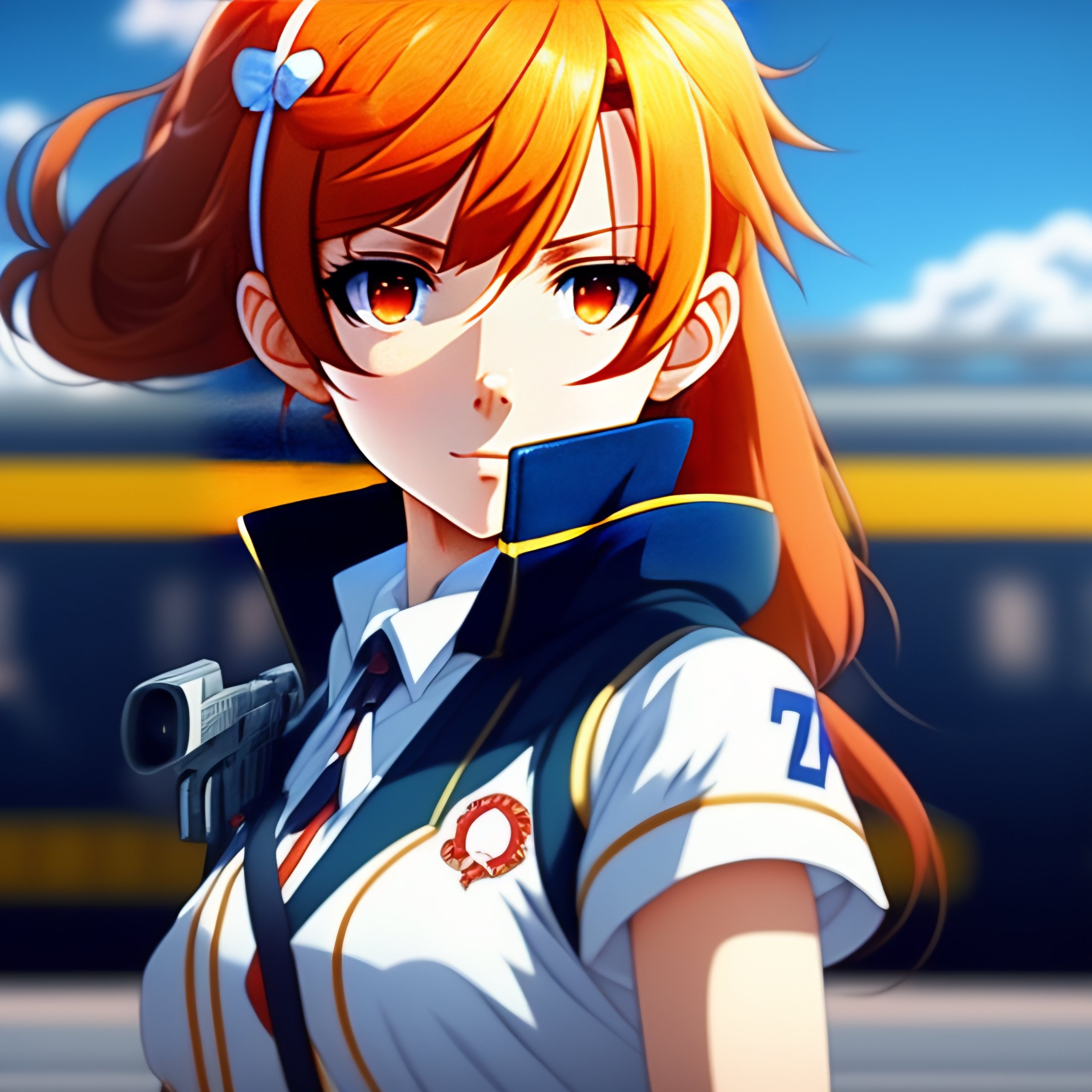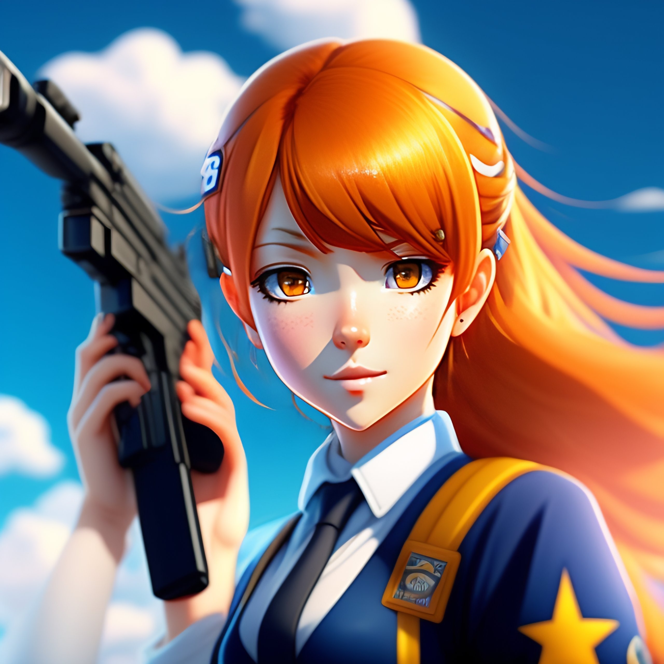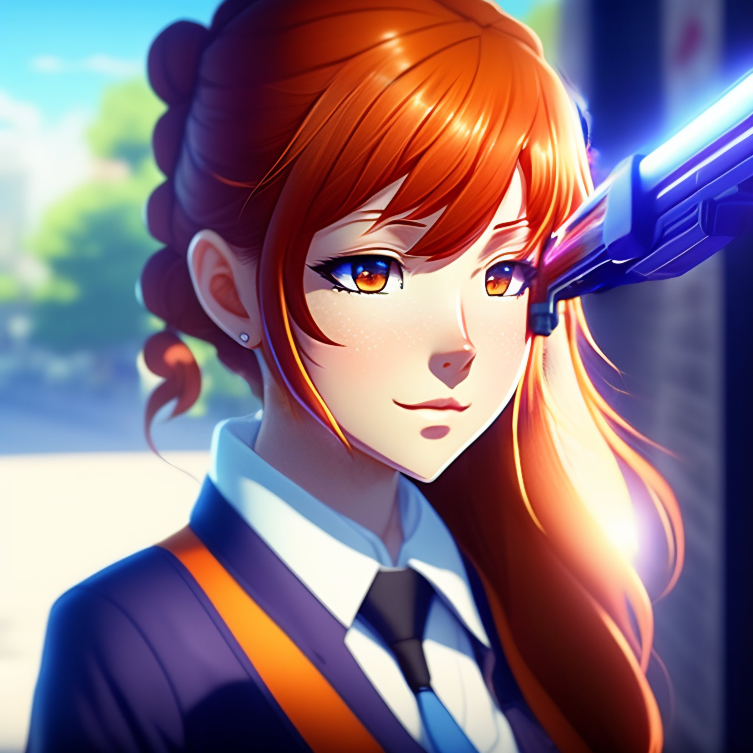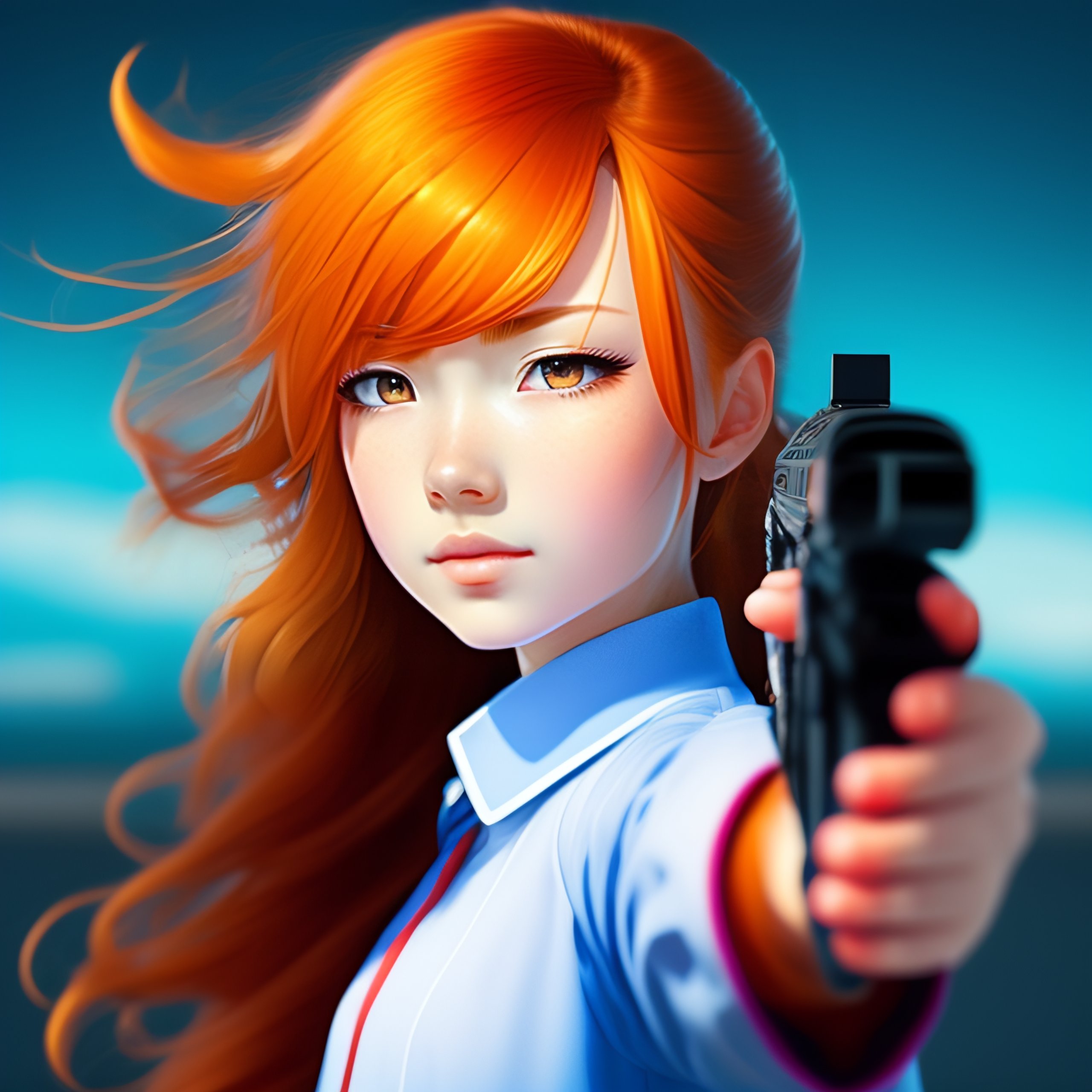 Anime style girl with ginger hair - in a ponytail and in a blue school uniform is pointing a gun at you