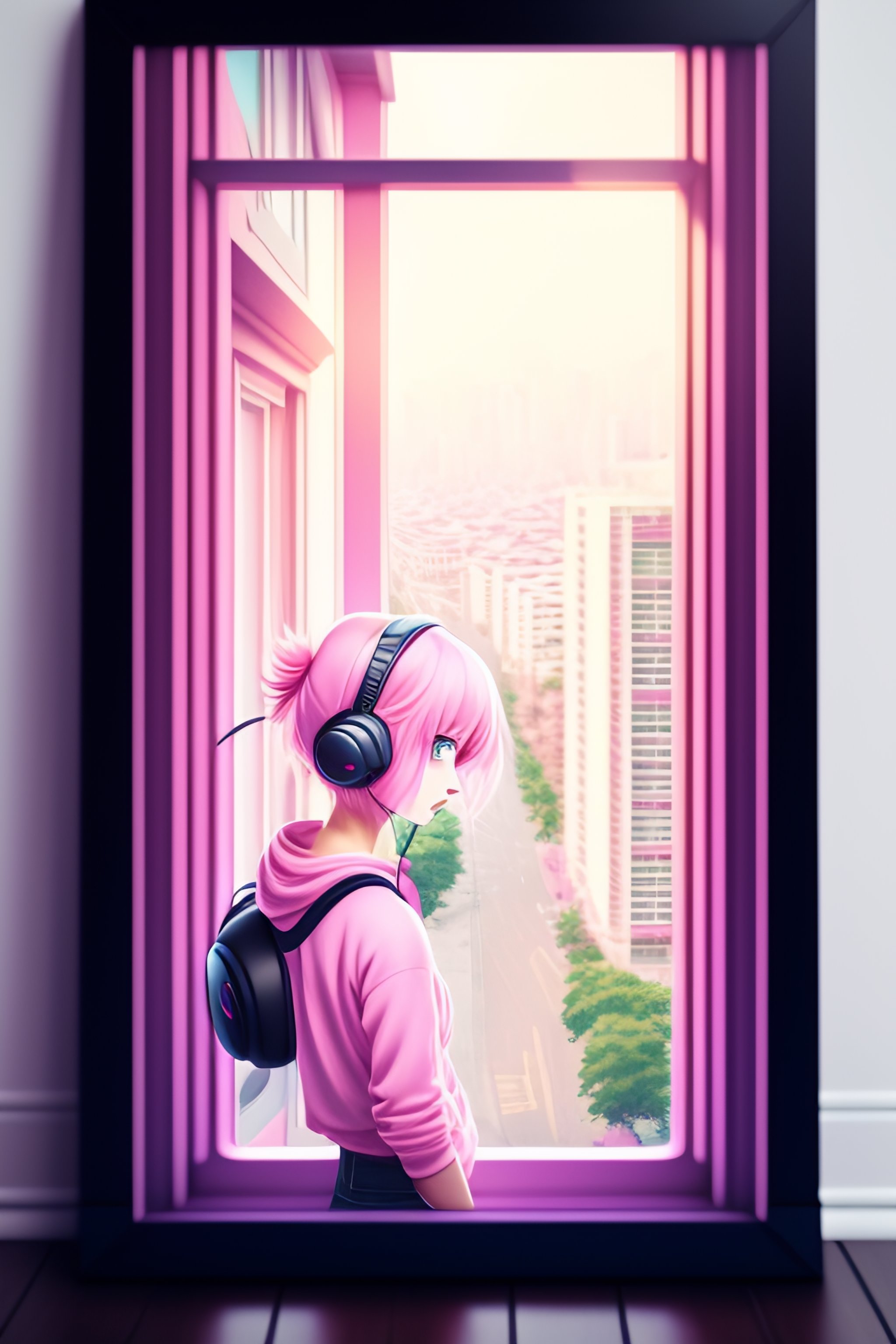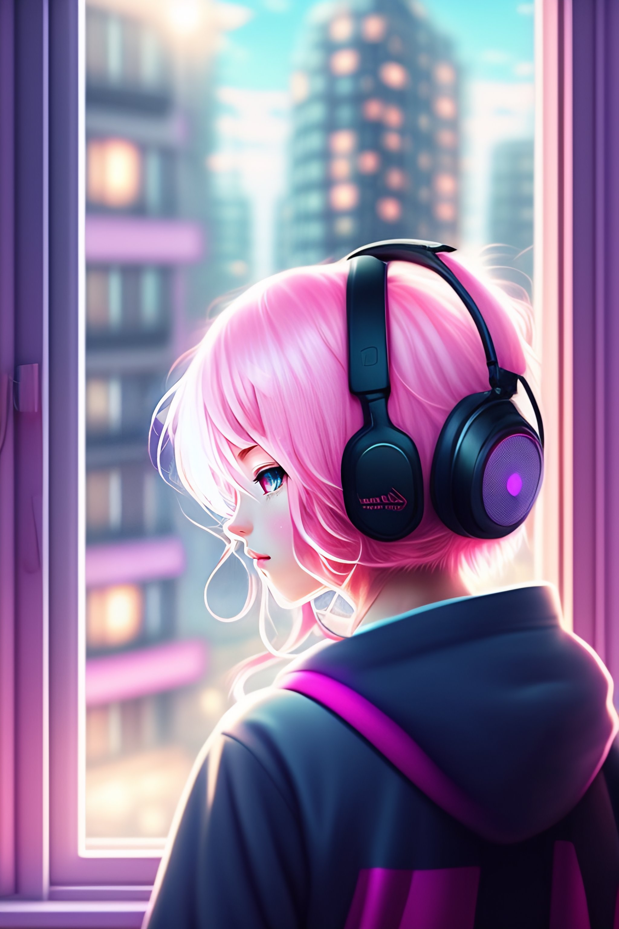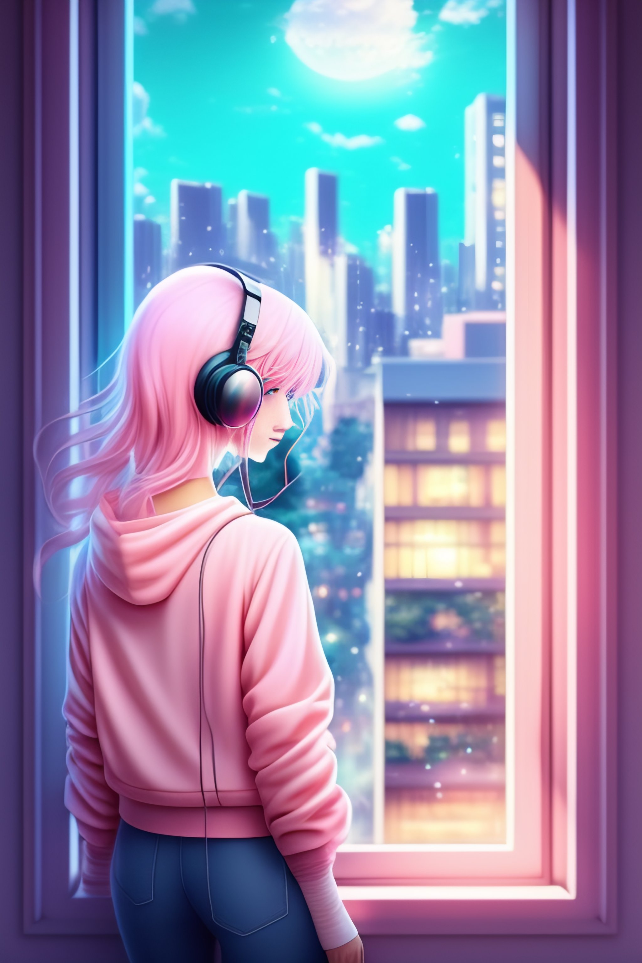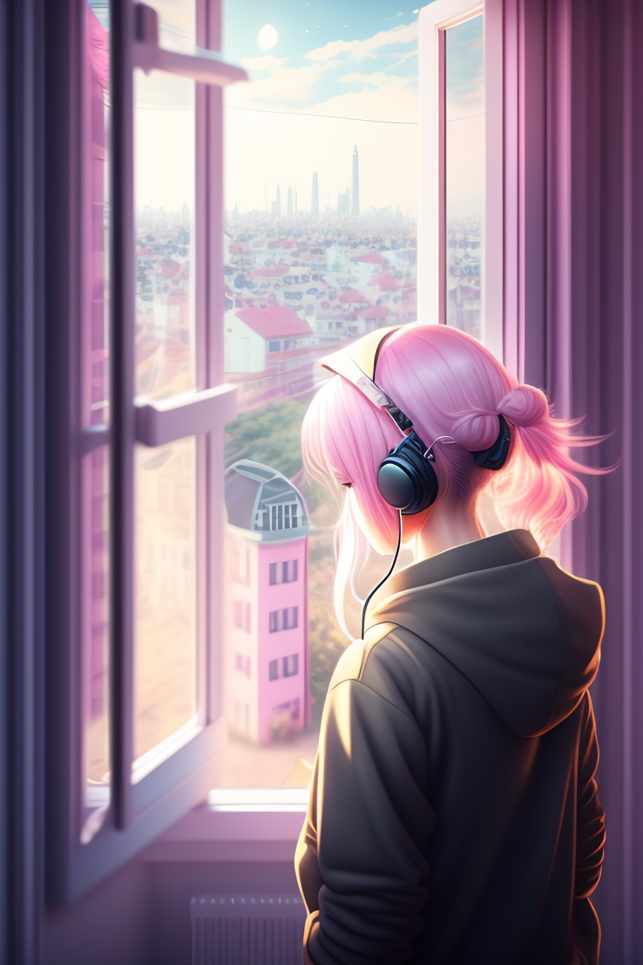 Light pink haired girl listening music with her headphones in her room, anime style, posters, window with a town view