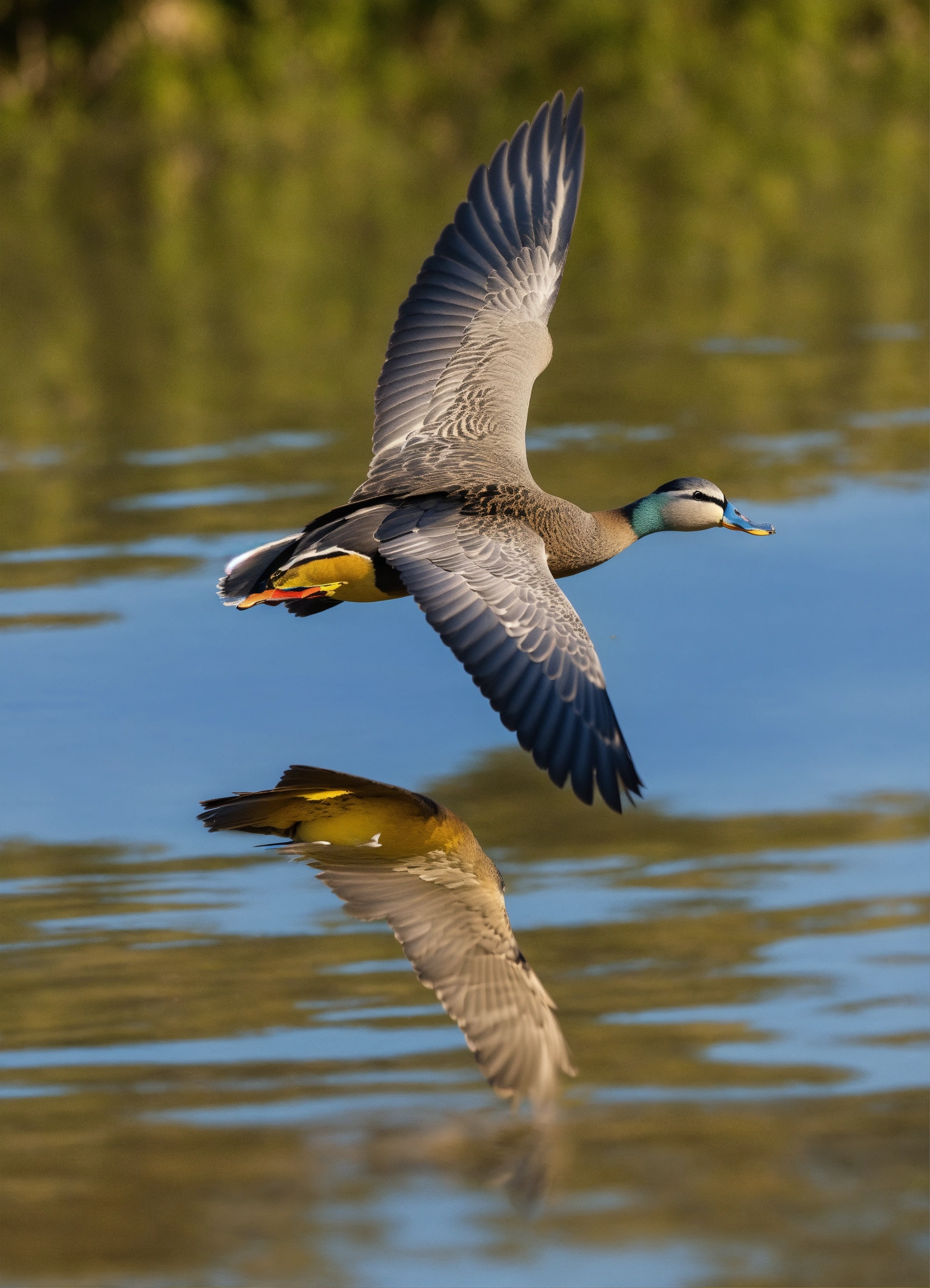 Underside closeup of blue duck nz bird flying photo symmetrical sky