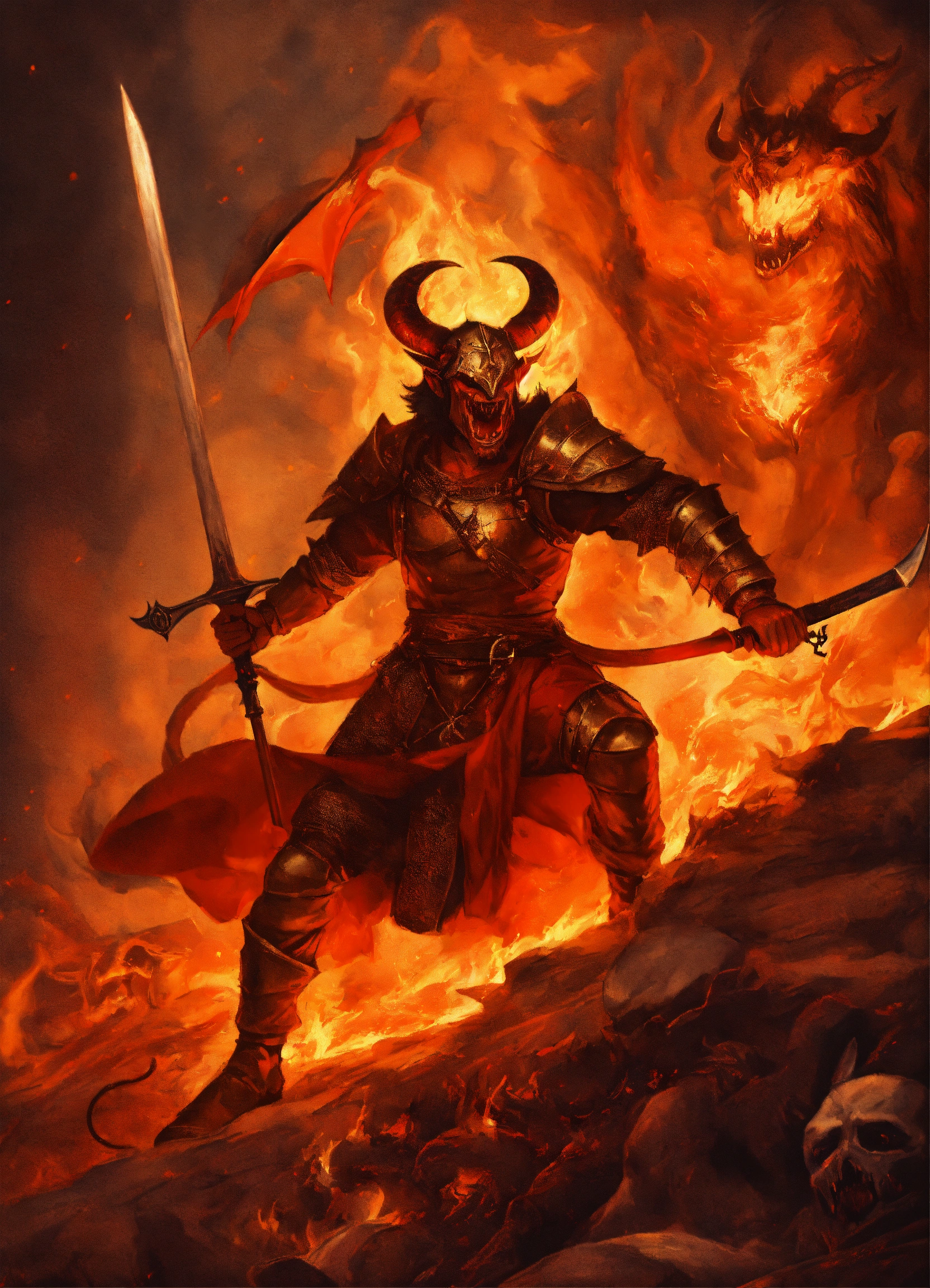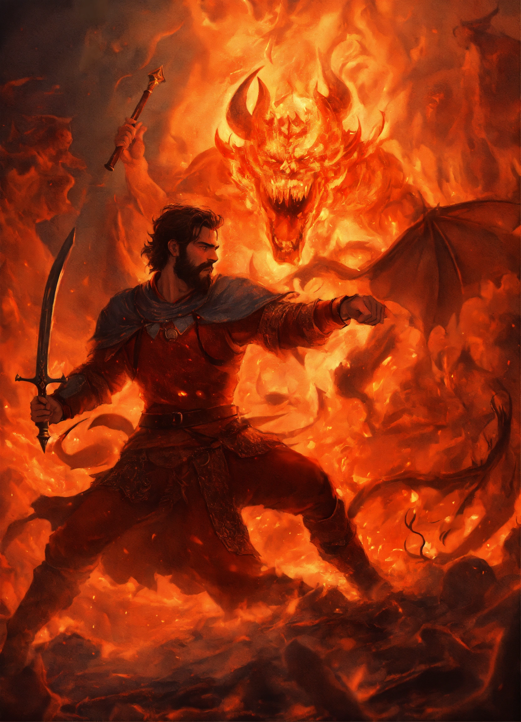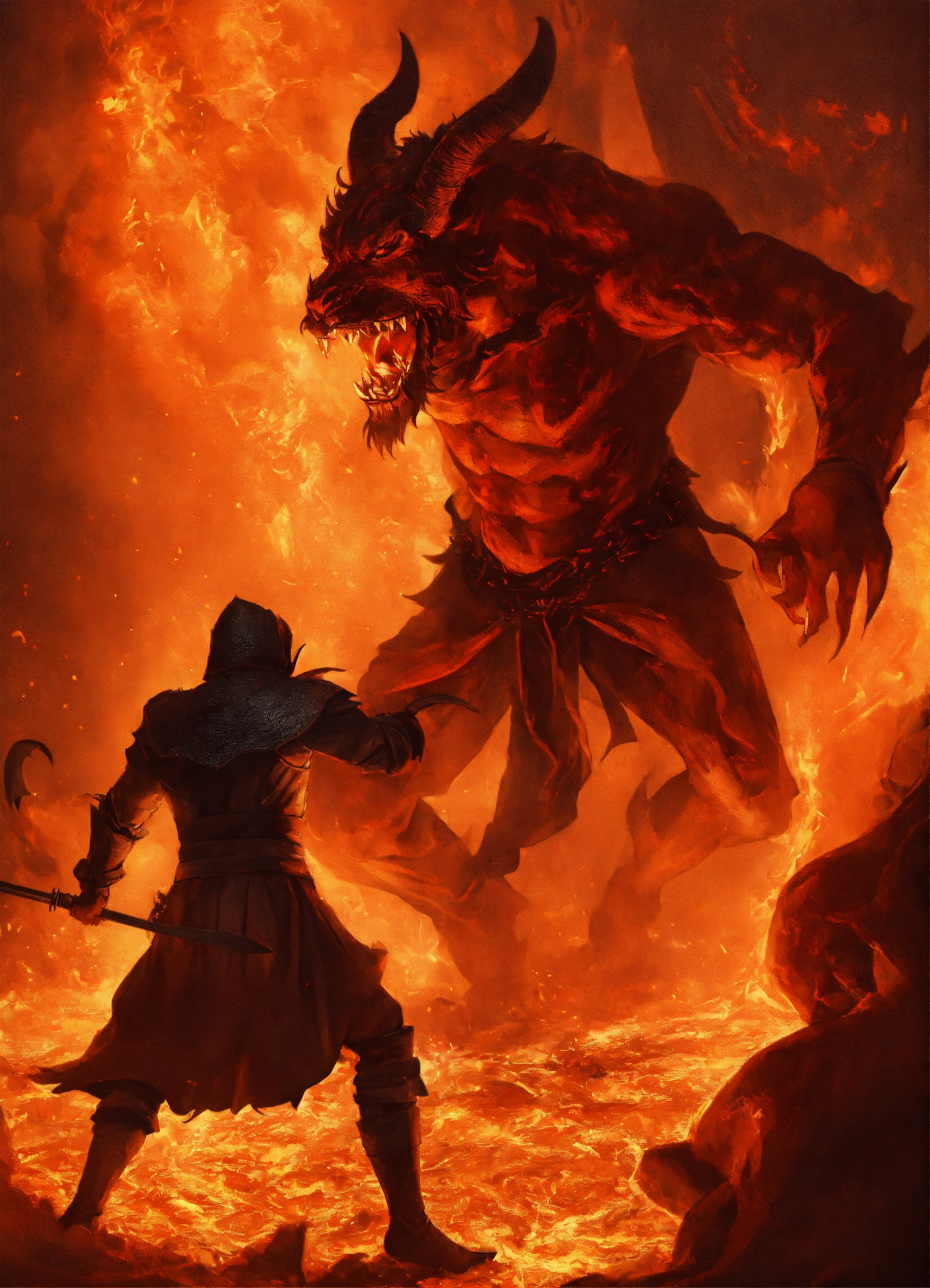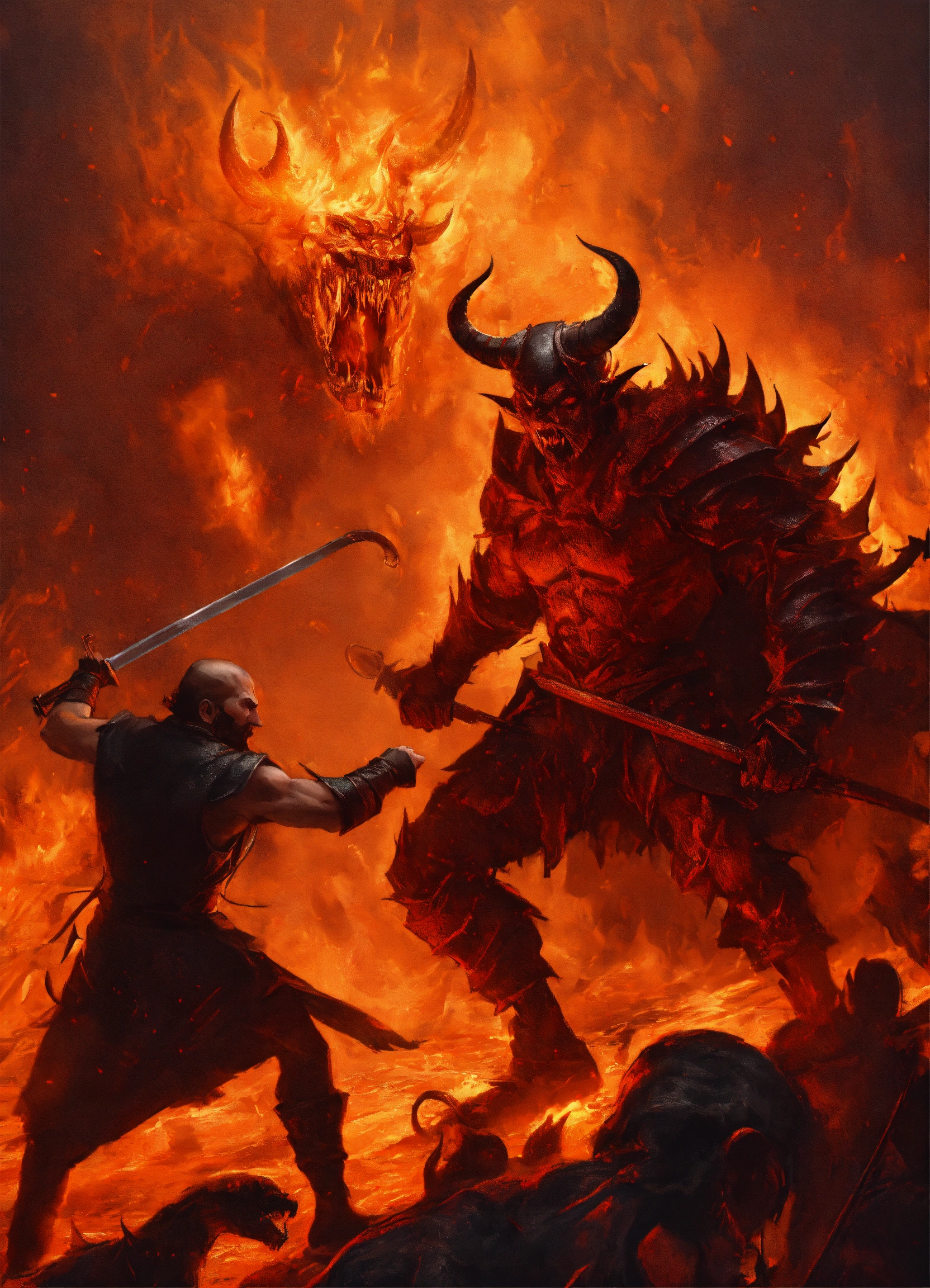 One medieval man fighting the demon in hell