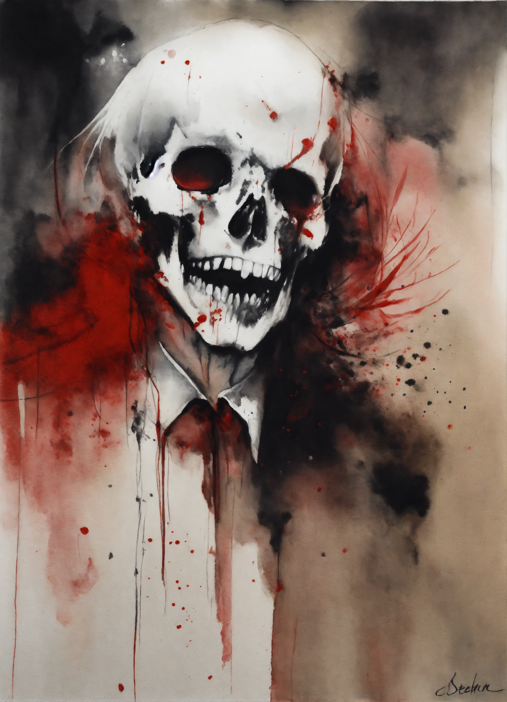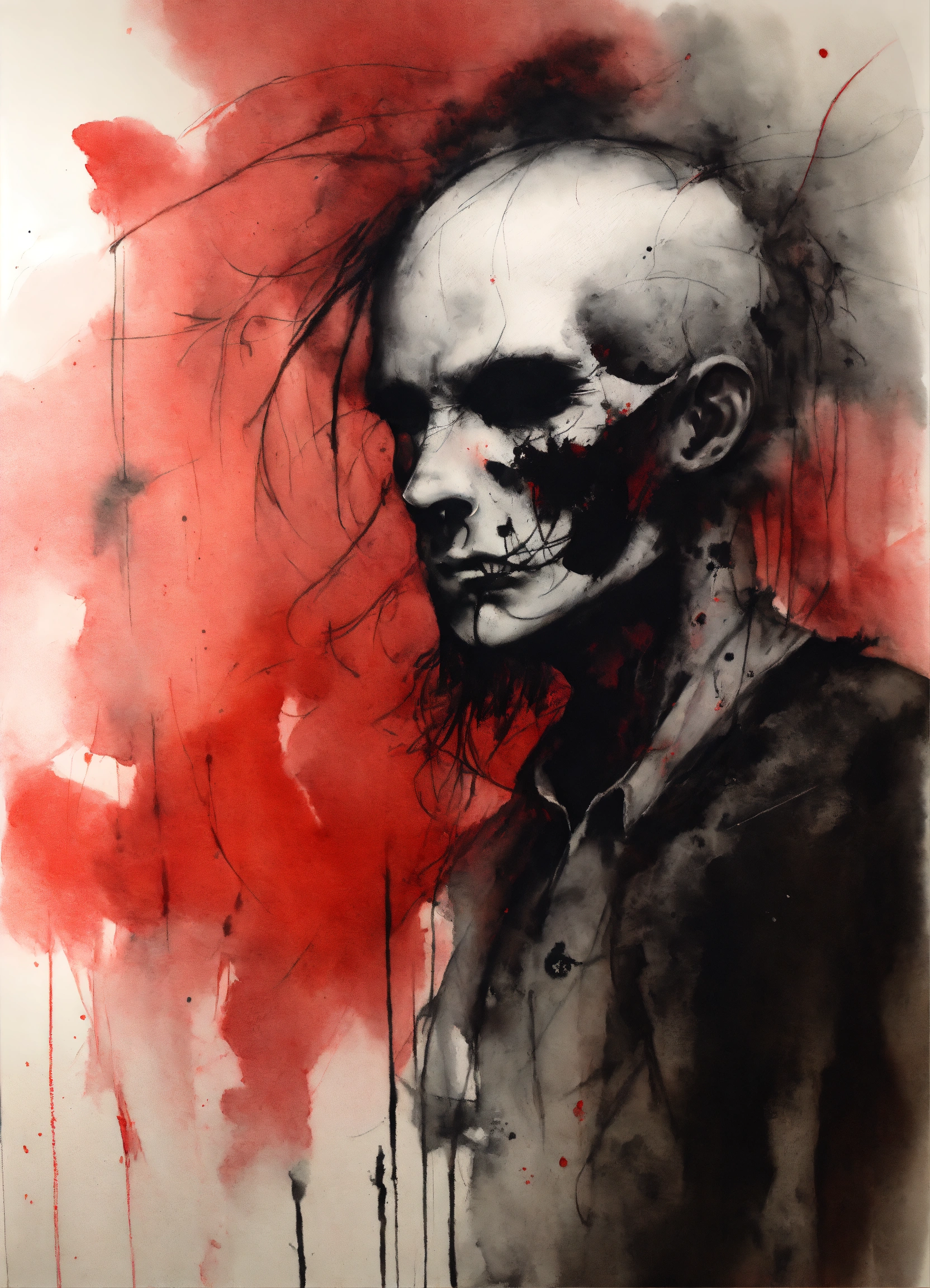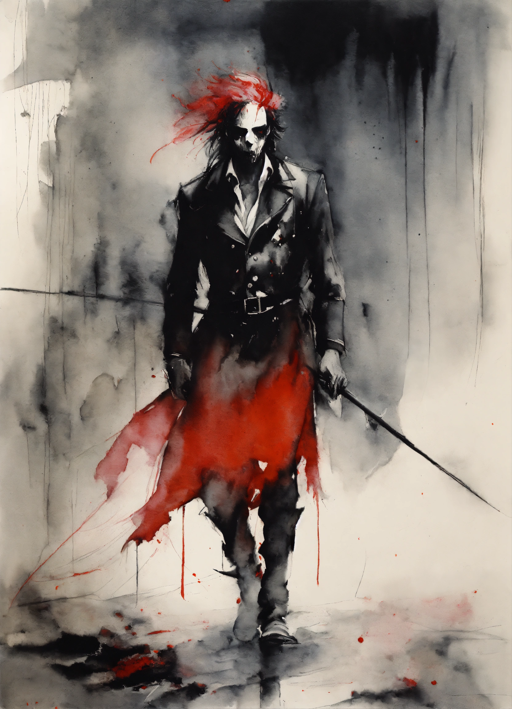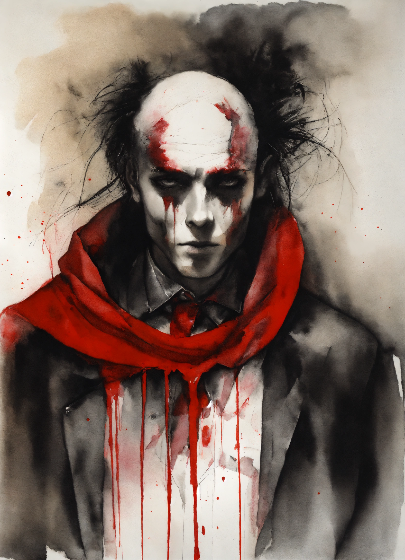 Stephen gammell style, dessin, aquarelle, aquarelles, noir et blanc et rouge, de marais, de sombres créatures, dégoulinant, bel homme en costard