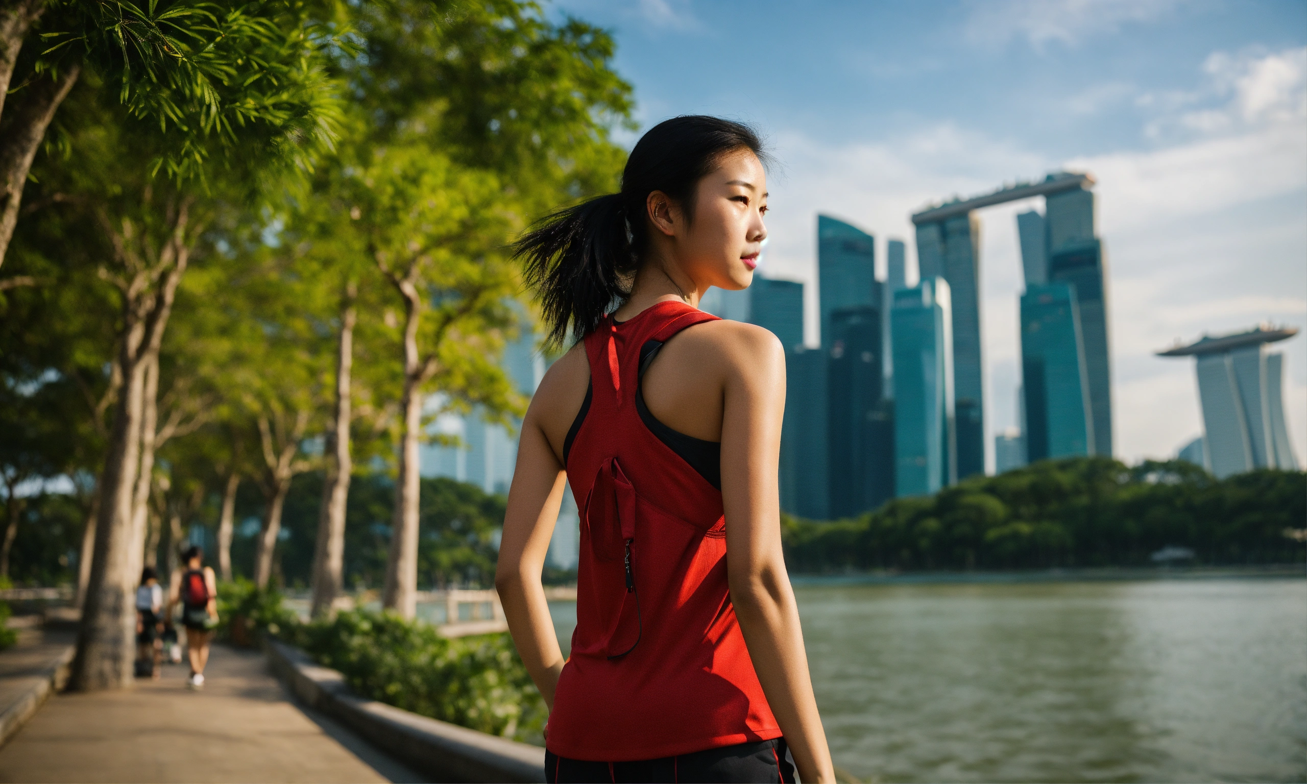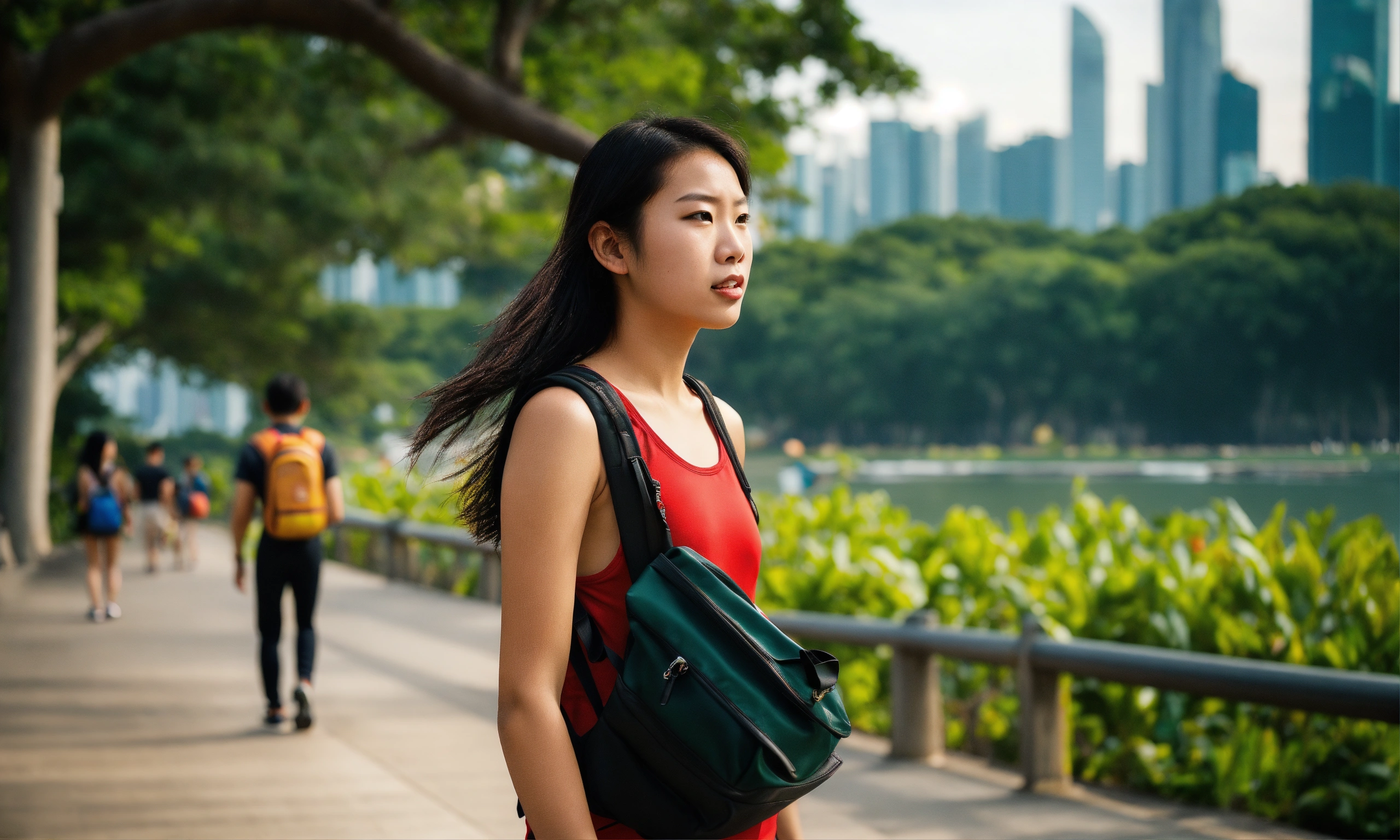 Medium shot of an athletic 18-year-old asian girl walking in singapore's east coast park, head tilts back, a sleeveless plain red singlet, determined and slightly annoyed expression, looking into the water, black backpack, towering trees, backdrop is the iconic singapore cityscape rises with modern skyscrapers and marina barrage, and vibrant attire symbolize the energy of this unique urban park, a leica summicron 35mm f2.0 lens to enhance the colors, shooting with kodak portra 400 film to add cinematic richness.