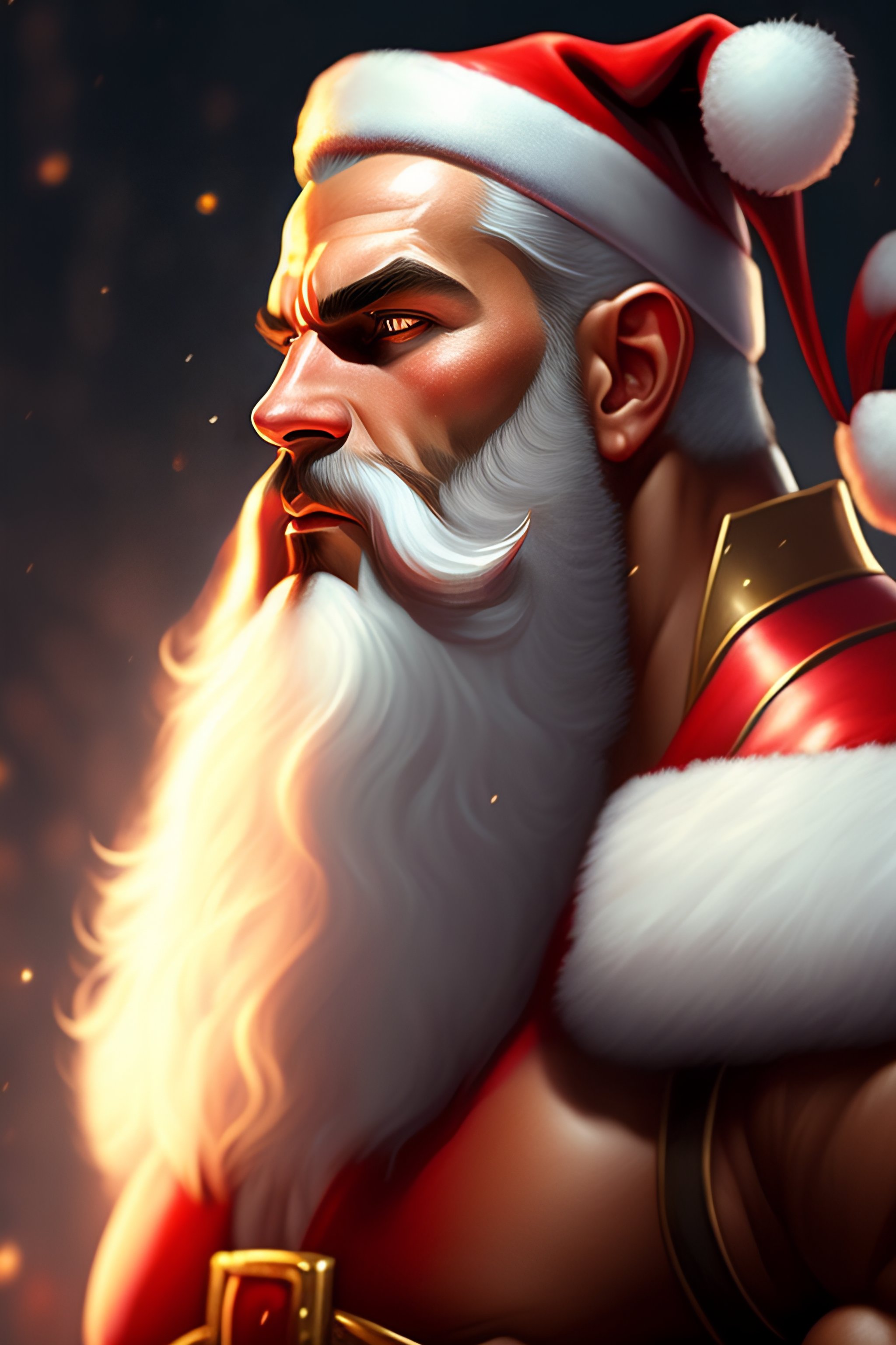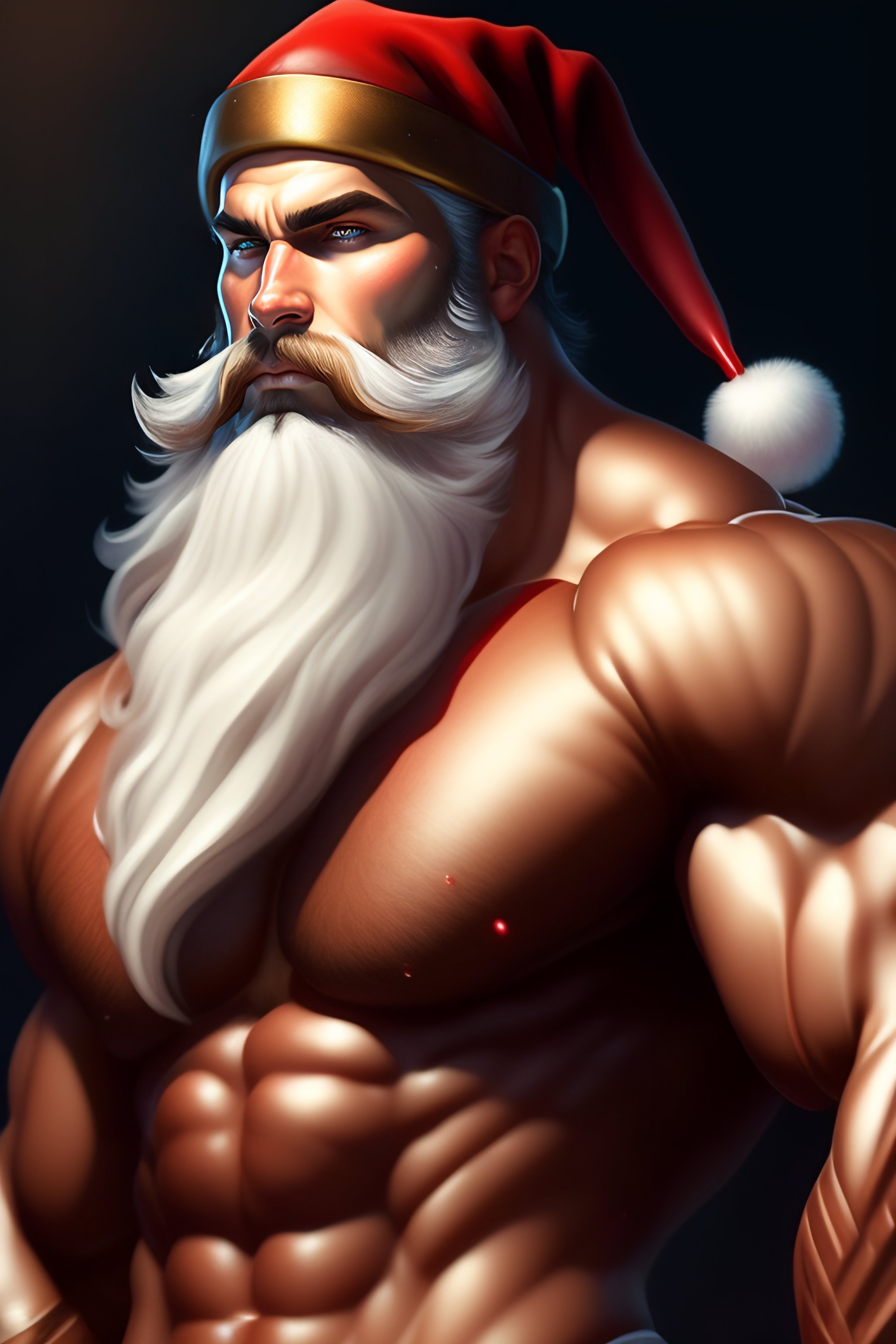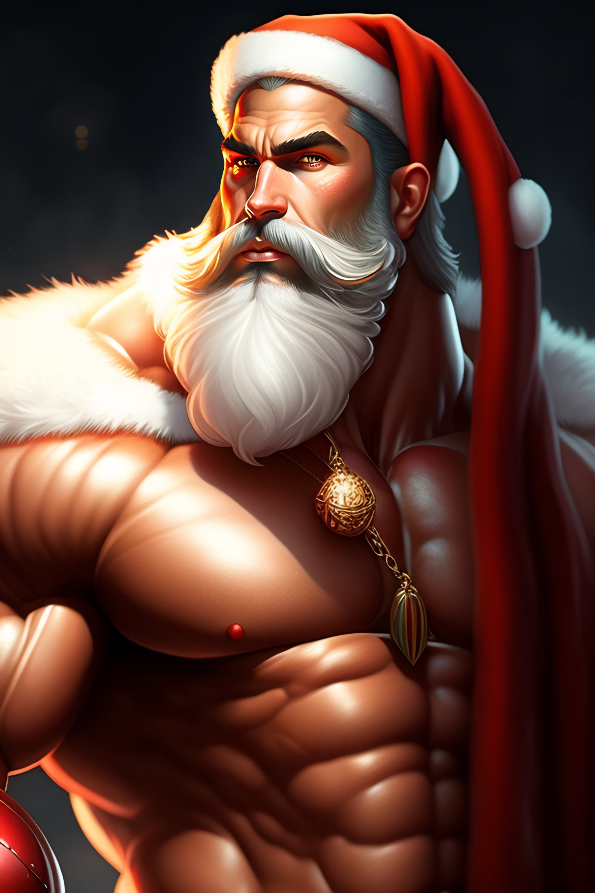 Portrait of a santa claus, muscular, upper body, hairy torso, d&d, fantasy, intricate, elegant, highly detailed, digital painting, artstation, concept art, smooth, sharp focus, illustration, art by artgerm