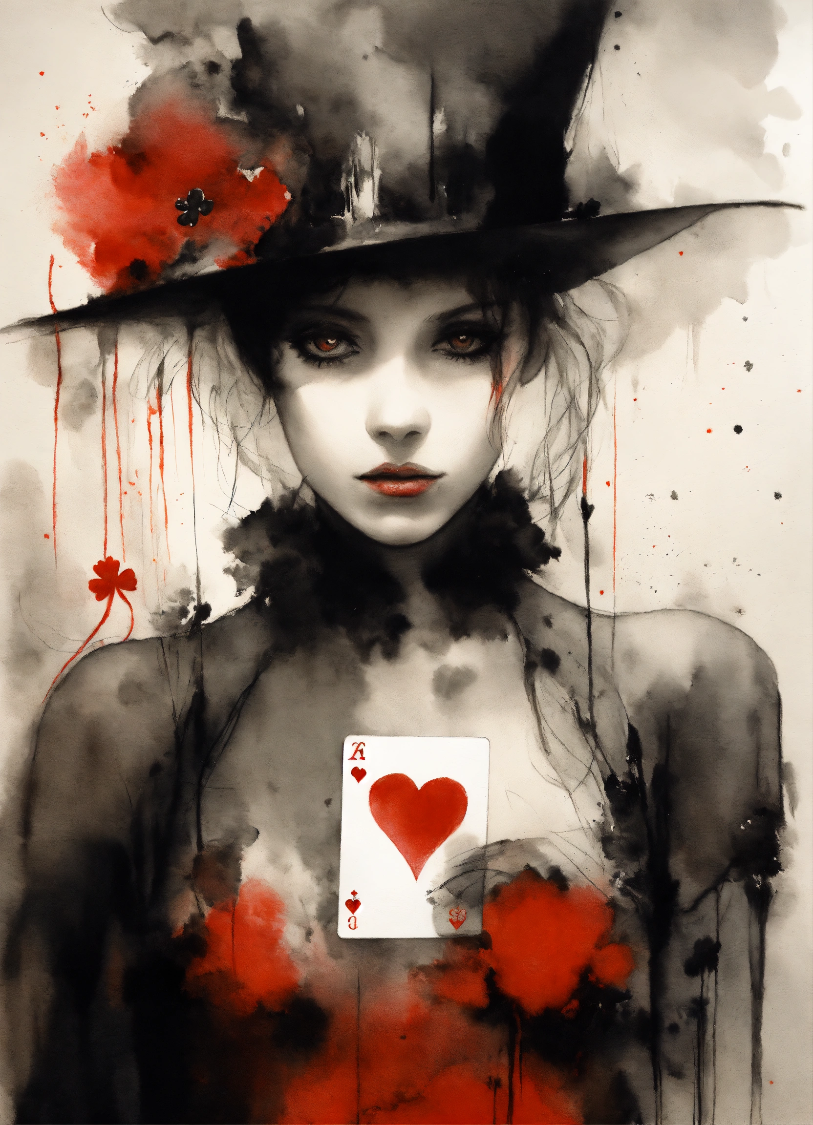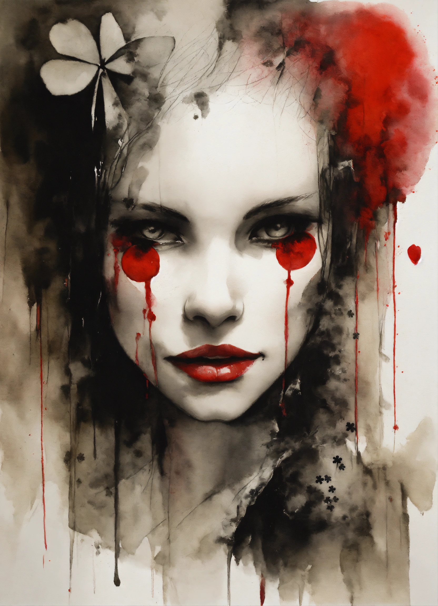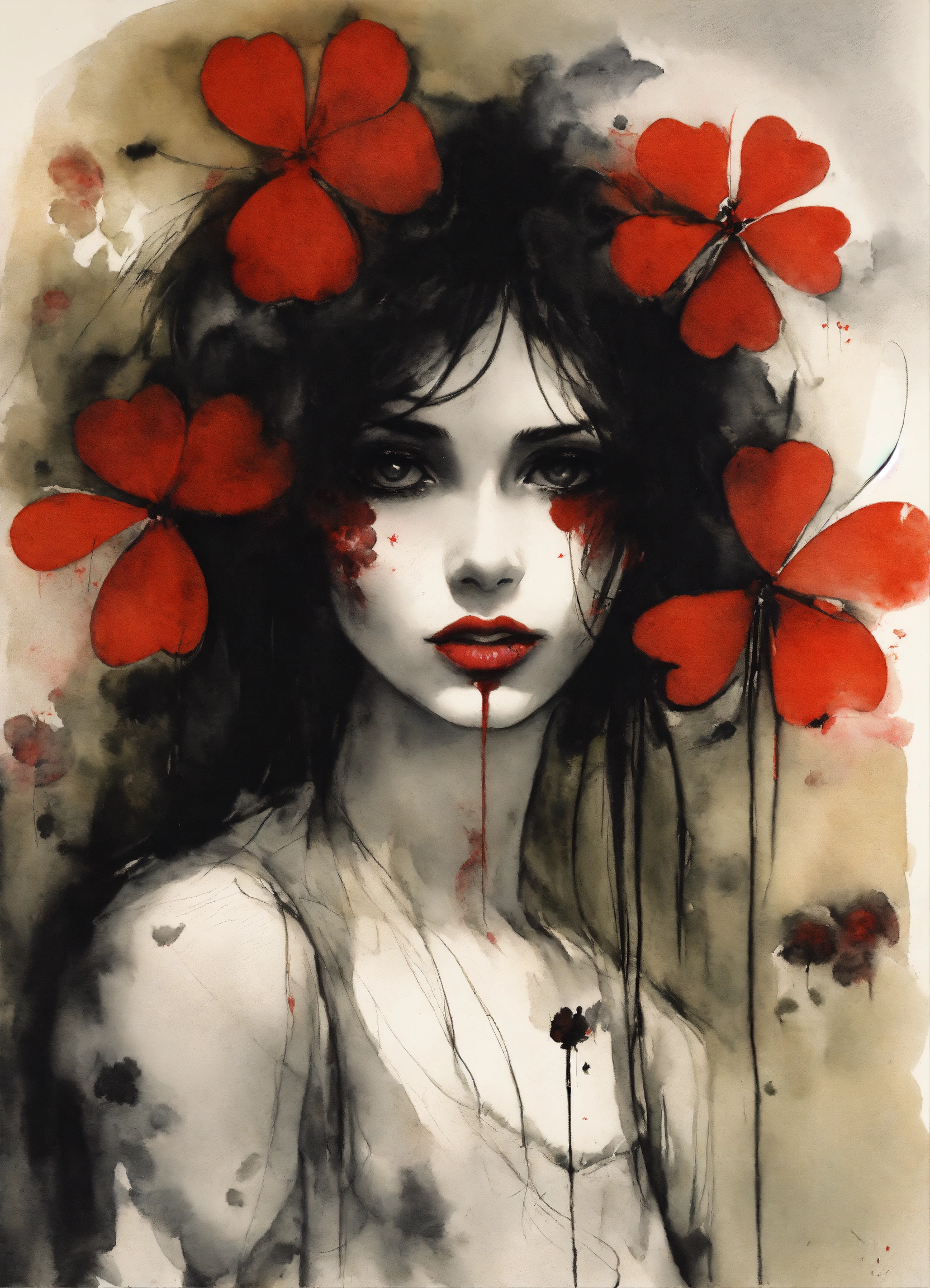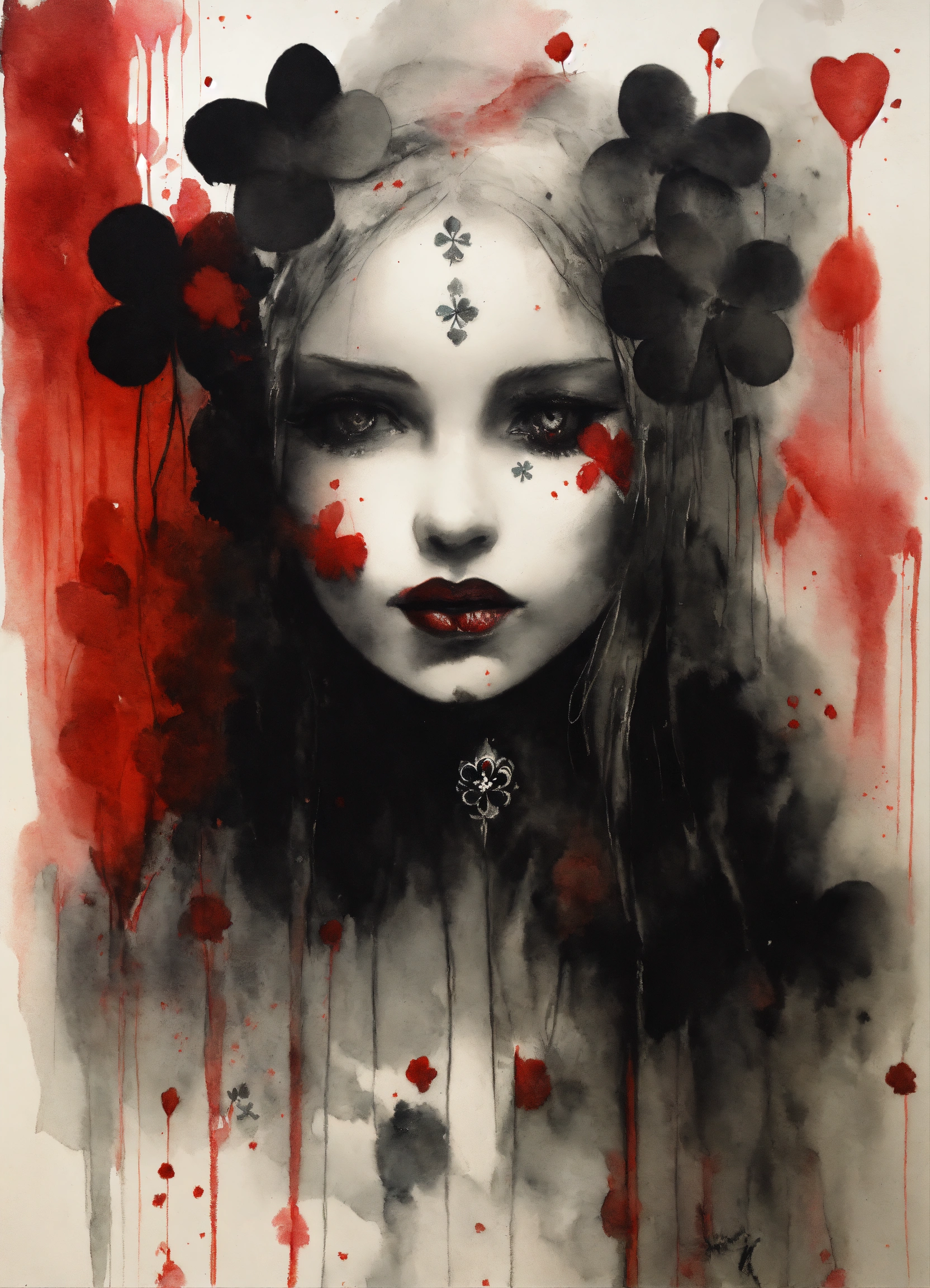 Stephen gammell style, dessin, aquarelle, aquarelles, noir et blanc et rouge, de marais, de sombres créatures, dégoulinant, woman with a clover on her cheek, queen of clubs card game style